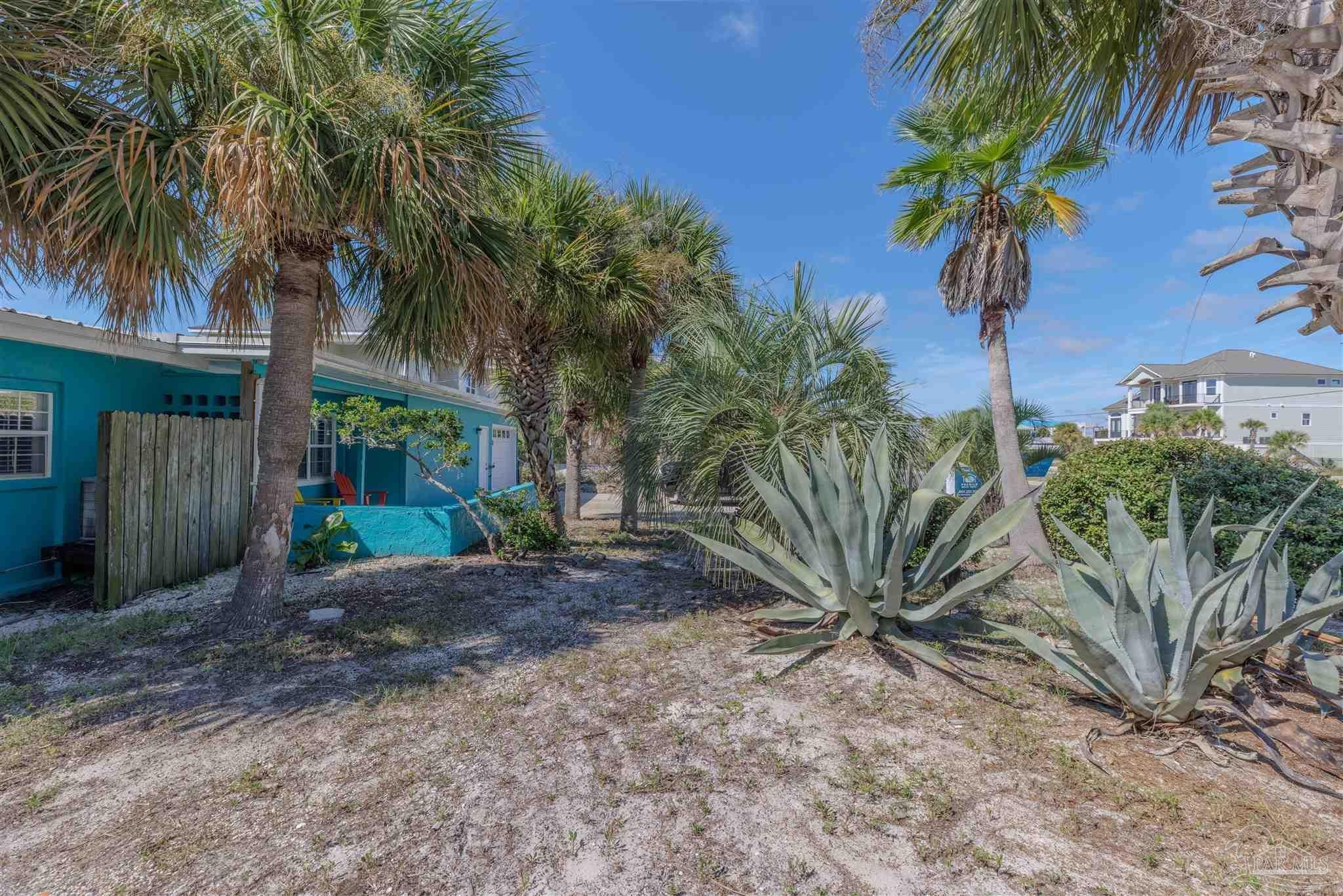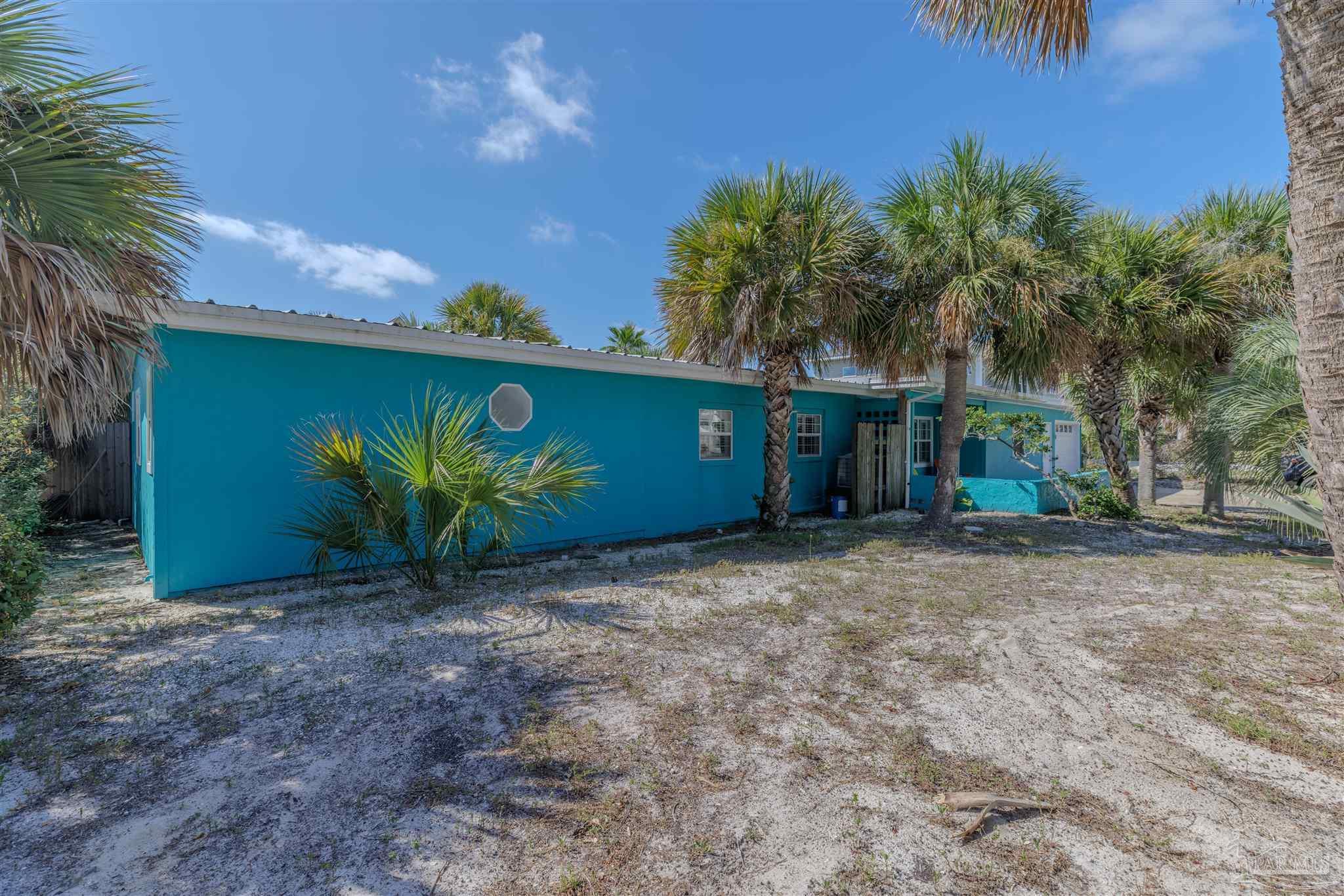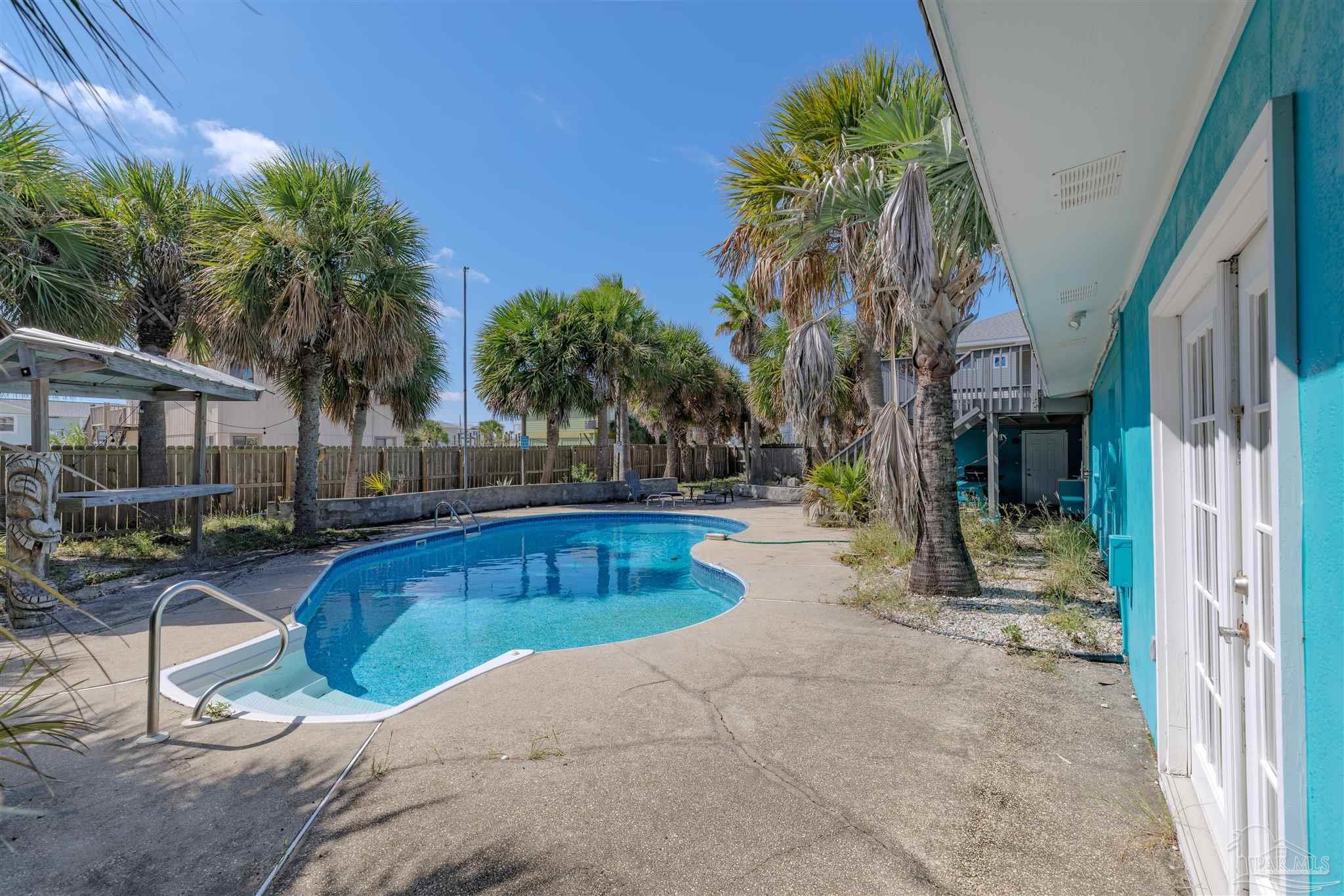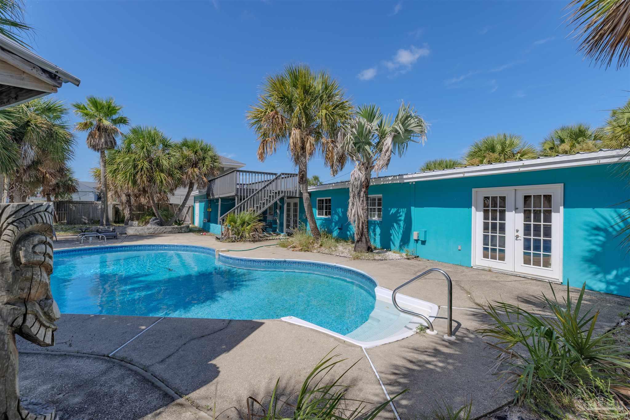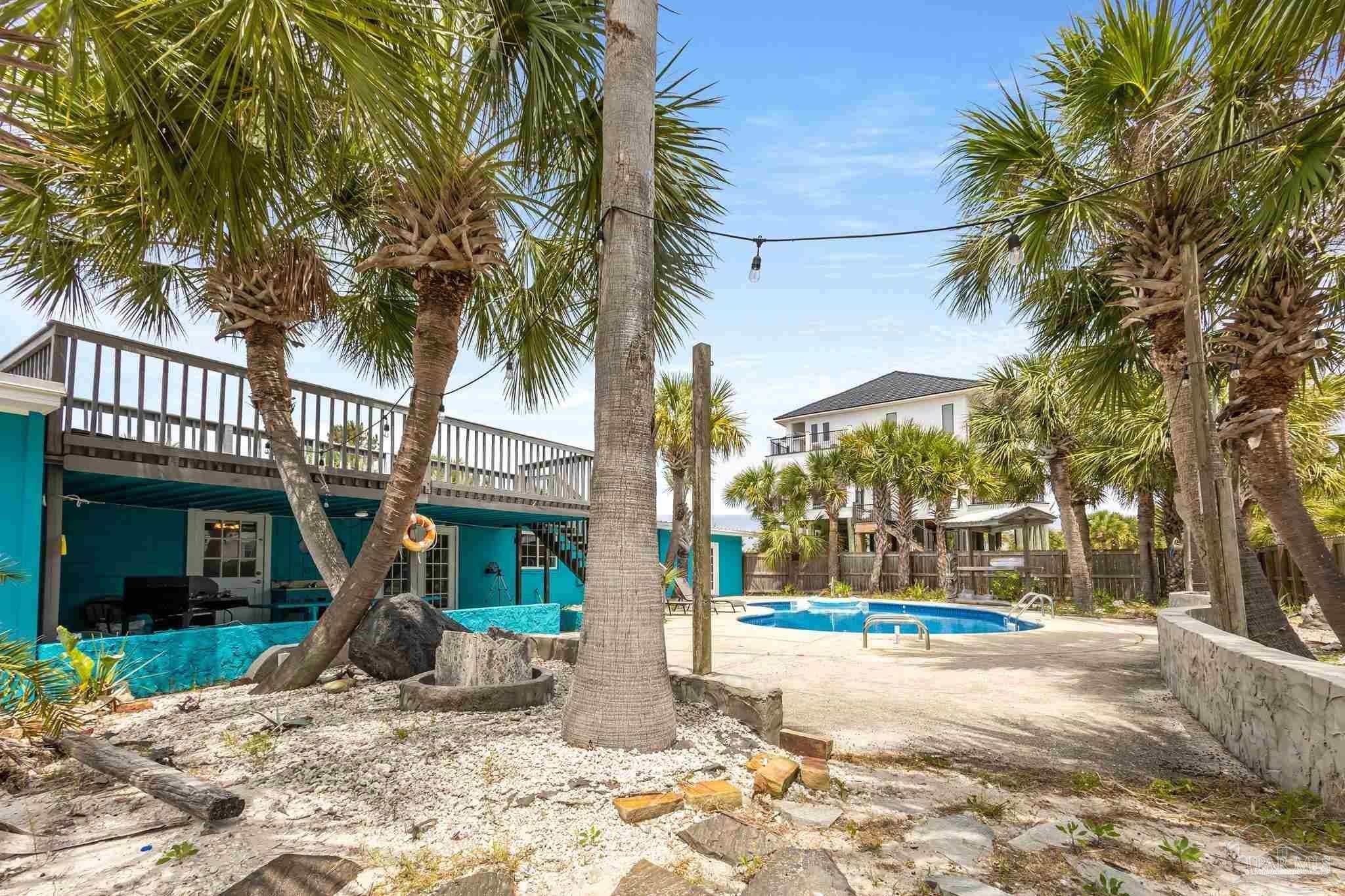 Rare find! This coastal cottage style beach home features 3 bedrooms, 3 full baths with primary bedroom & main living areas opening to a tropical paradise with a sparkling pool, white sand, palm trees and tiki carvings! Climb the outdoor stairs to a private rooftop deck to view the Gulf or take a short walk to enjoy the sugar white sands & blue-green, crystal clear waters of the Gulf! The gourmet kitchen has been completely updated with stainless steel appliances, newer cabinets, granite countertops, with a window overlooking your private pool! Kitchen opens to dining area, large gathering room. Additional living area perfect for media room. Large primary bedroom with ensuite consisting of tiled shower & whirlpool style tub. Room for a king-sized bed with sitting area & french doors opening to backyard. Second bedroom features room for queen-sized bed with shower/tub. 3rd bedroom perfect for twin beds. 3rd bathroom includes washer/dryer/shower and doubles as a pool bath! Oversized one-car garage with attached storage room also accessible from backyard with plenty of room for bikes, small watercraft! The Gulf access walkway is adjacent to property. Trolley Stop for easy ride to beach restaurants, bars, and shops. This home is definitely a charmer! Look no further for your Pensacola Beach home! This is it!