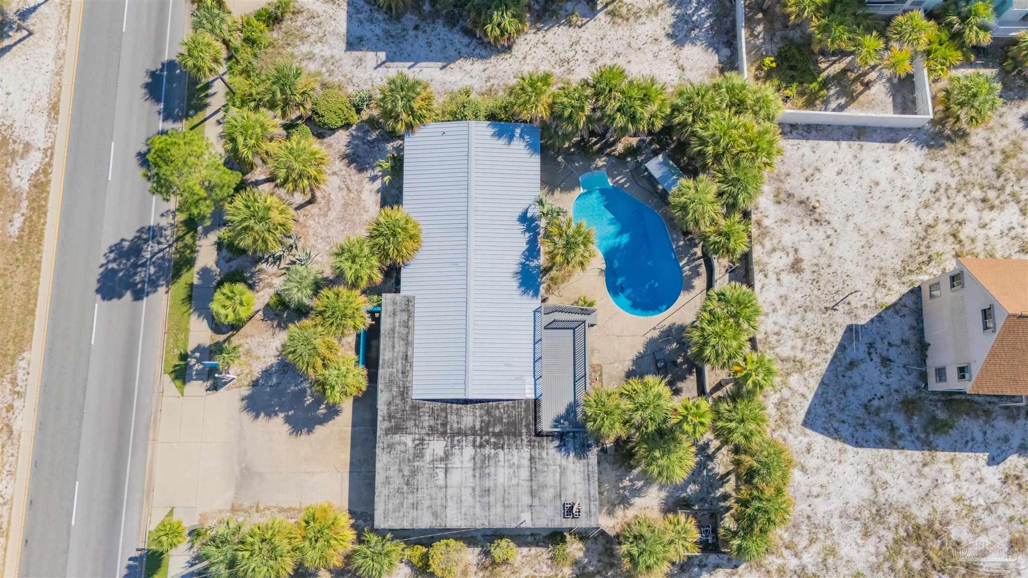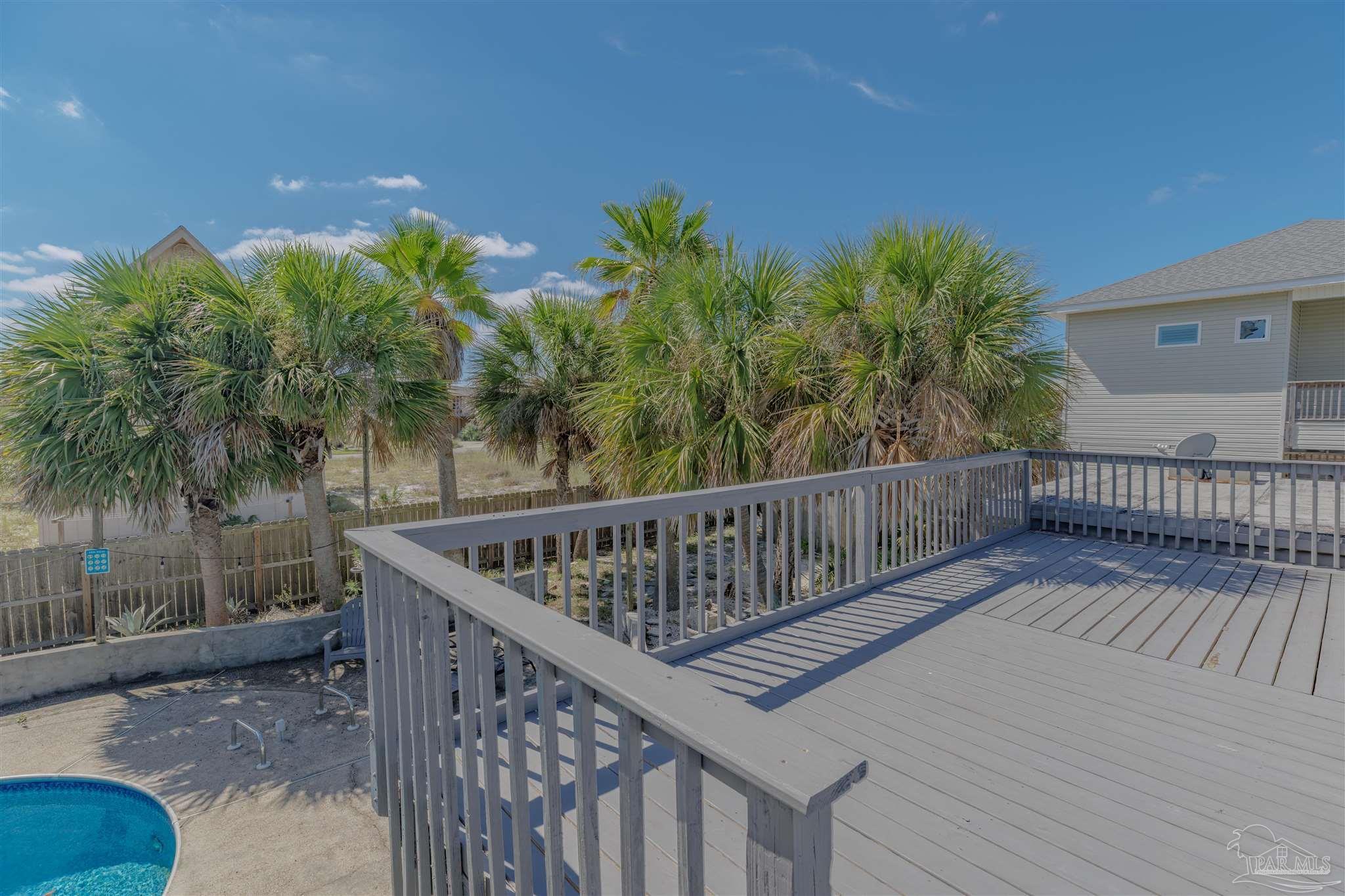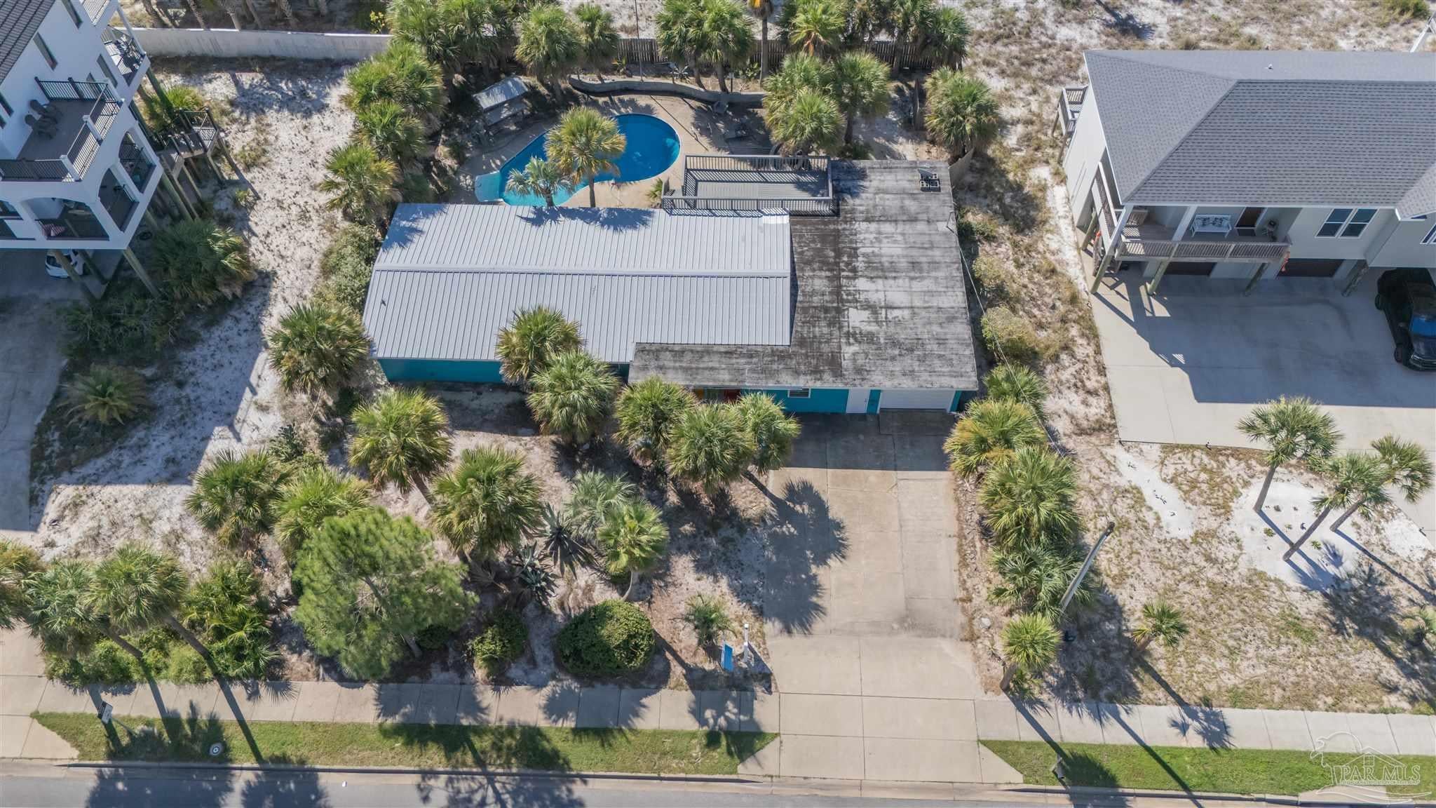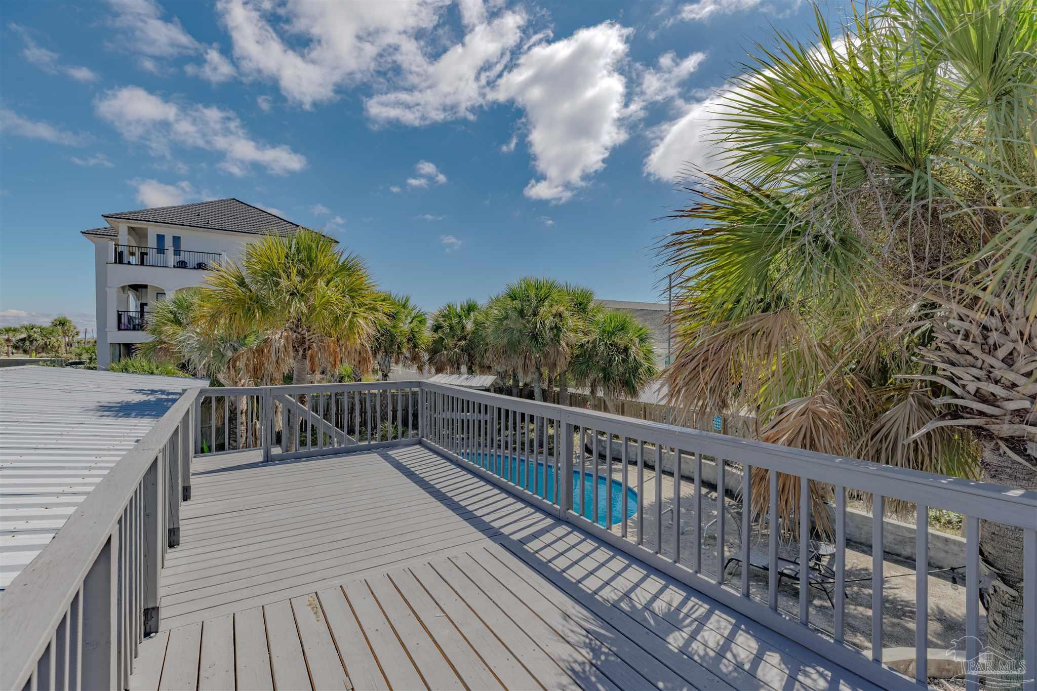 Rare find! This coastal cottage style beach home features 3 bedrooms, 3 full baths with primary bedroom & main living areas opening to a tropical paradise with a sparkling pool, white sand, palm trees and tiki carvings! Climb the outdoor stairs to a private rooftop deck to view the Gulf or take a short walk to enjoy the sugar white sands & blue-green, crystal clear waters of the Gulf! The gourmet kitchen has been completely updated with stainless steel appliances, newer cabinets, granite countertops, with a window overlooking your private pool! Kitchen opens to dining area, large gathering room. Additional living area perfect for media room. Large primary bedroom with ensuite consisting of tiled shower & whirlpool style tub. Room for a king-sized bed with sitting area & french doors opening to backyard. Second bedroom features room for queen-sized bed with shower/tub. 3rd bedroom perfect for twin beds. 3rd bathroom includes washer/dryer/shower and doubles as a pool bath! Oversized one-car garage with attached storage room also accessible from backyard with plenty of room for bikes, small watercraft! The Gulf access walkway is adjacent to property. Trolley Stop for easy ride to beach restaurants, bars, and shops. This home is definitely a charmer! Look no further for your Pensacola Beach home! This is it!
