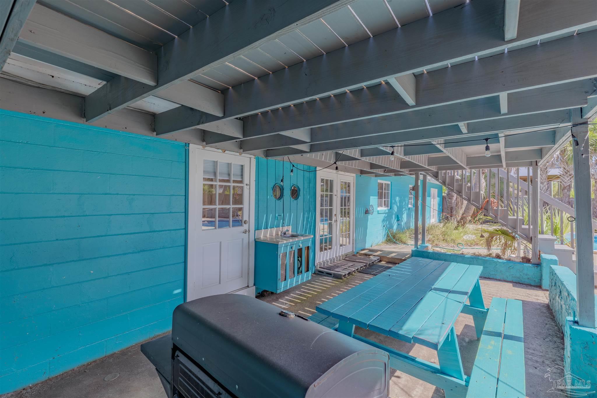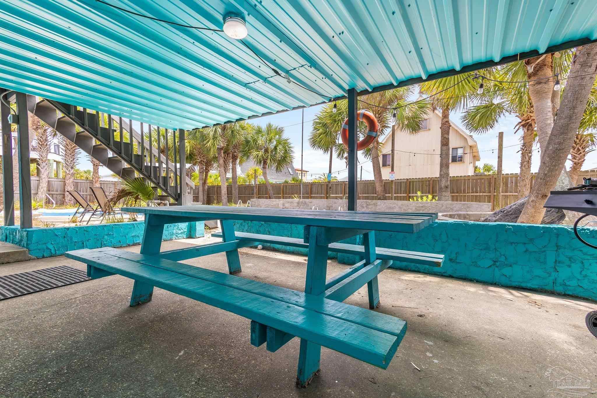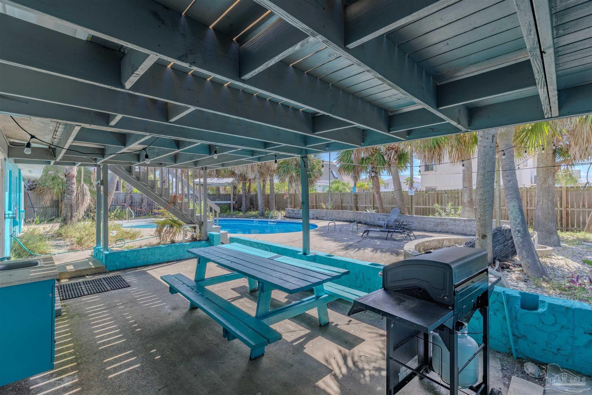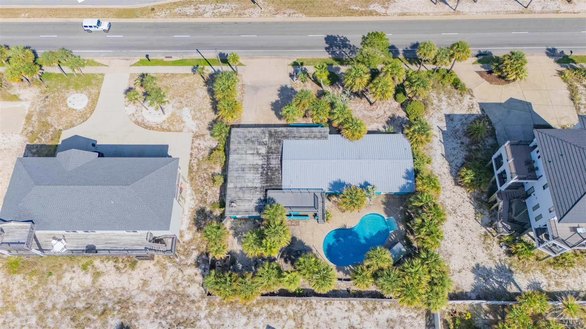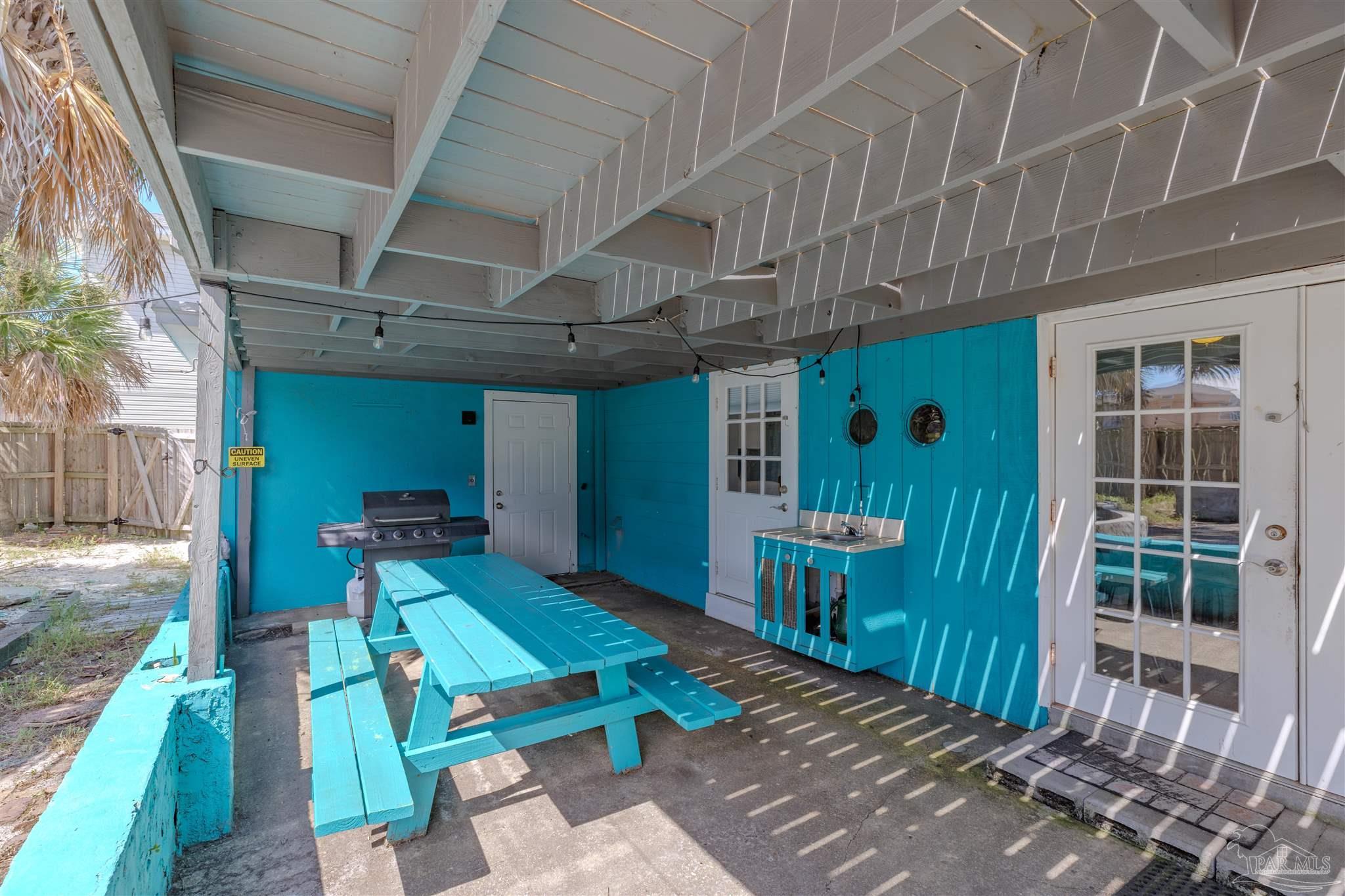 Rare find! This coastal cottage style beach home features 3 bedrooms, 3 full baths with primary bedroom & main living areas opening to a tropical paradise with a sparkling pool, white sand, palm trees and tiki carvings! Climb the outdoor stairs to a private rooftop deck to view the Gulf or take a short walk to enjoy the sugar white sands & blue-green, crystal clear waters of the Gulf! The gourmet kitchen has been completely updated with stainless steel appliances, newer cabinets, granite countertops, with a window overlooking your private pool! Kitchen opens to dining area, large gathering room. Additional living area perfect for media room. Large primary bedroom with ensuite consisting of tiled shower & whirlpool style tub. Room for a king-sized bed with sitting area & french doors opening to backyard. Second bedroom features room for queen-sized bed with shower/tub. 3rd bedroom perfect for twin beds. 3rd bathroom includes washer/dryer/shower and doubles as a pool bath! Oversized one-car garage with attached storage room also accessible from backyard with plenty of room for bikes, small watercraft! The Gulf access walkway is adjacent to property. Trolley Stop for easy ride to beach restaurants, bars, and shops. This home is definitely a charmer! Look no further for your Pensacola Beach home! This is it!