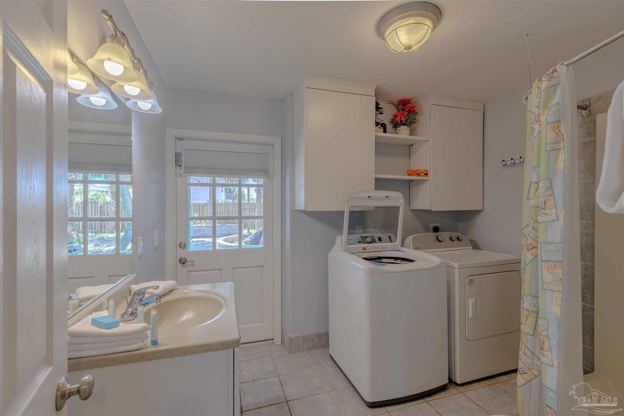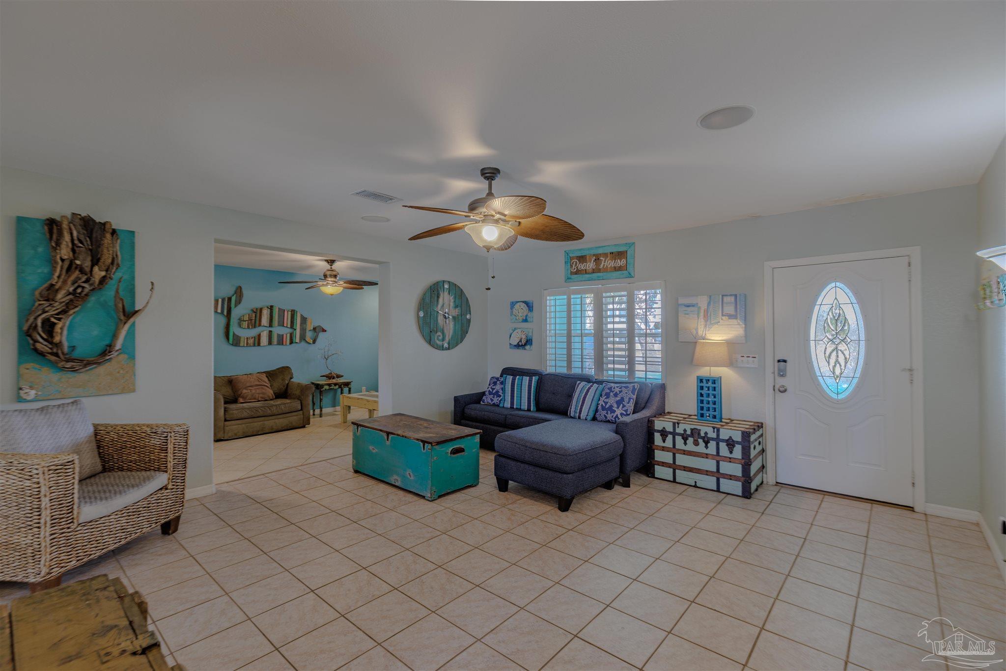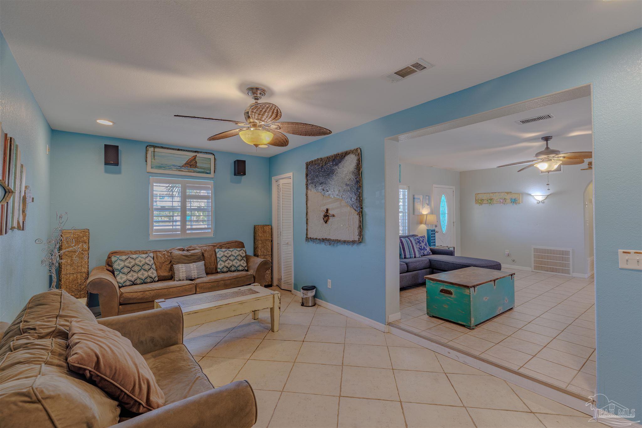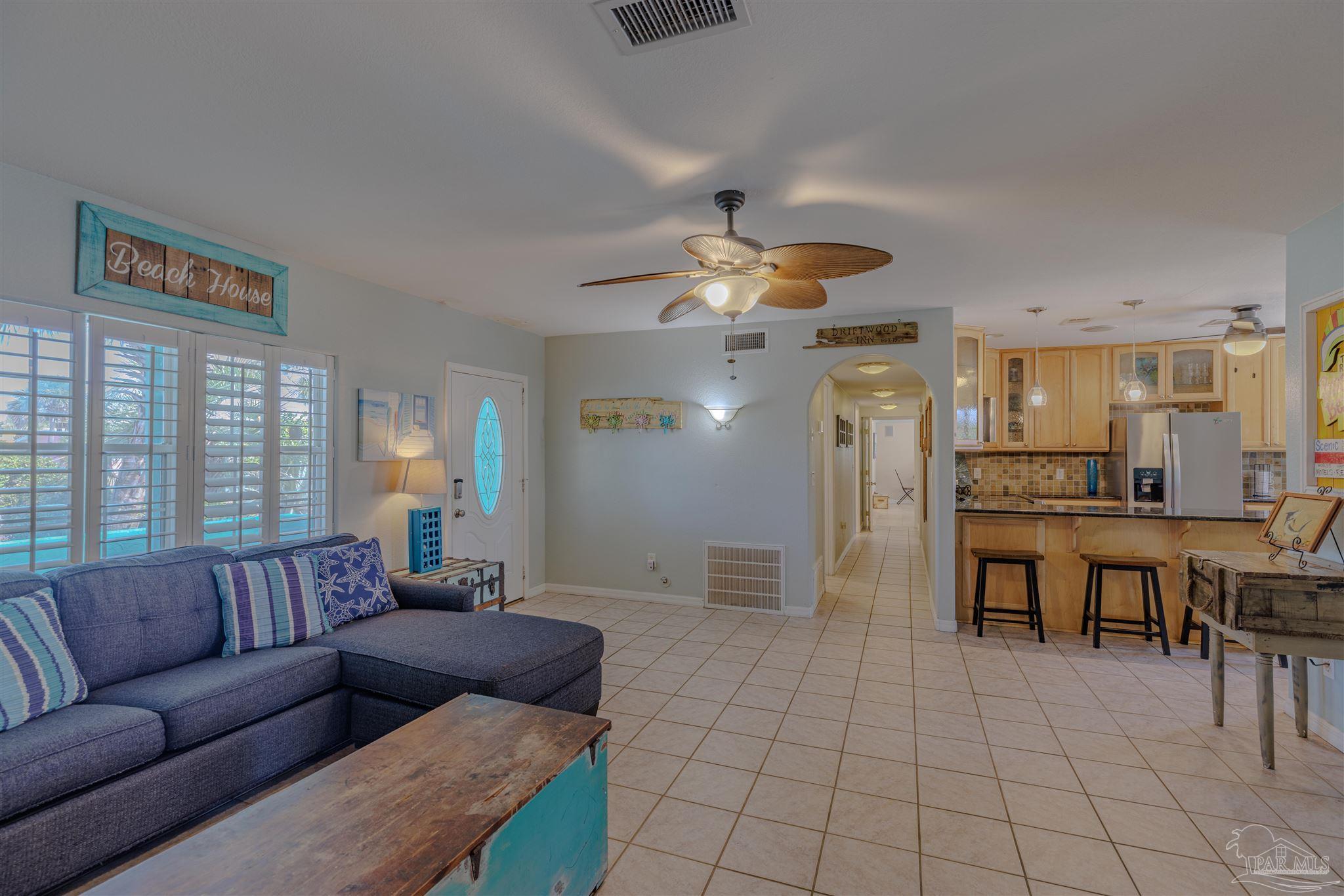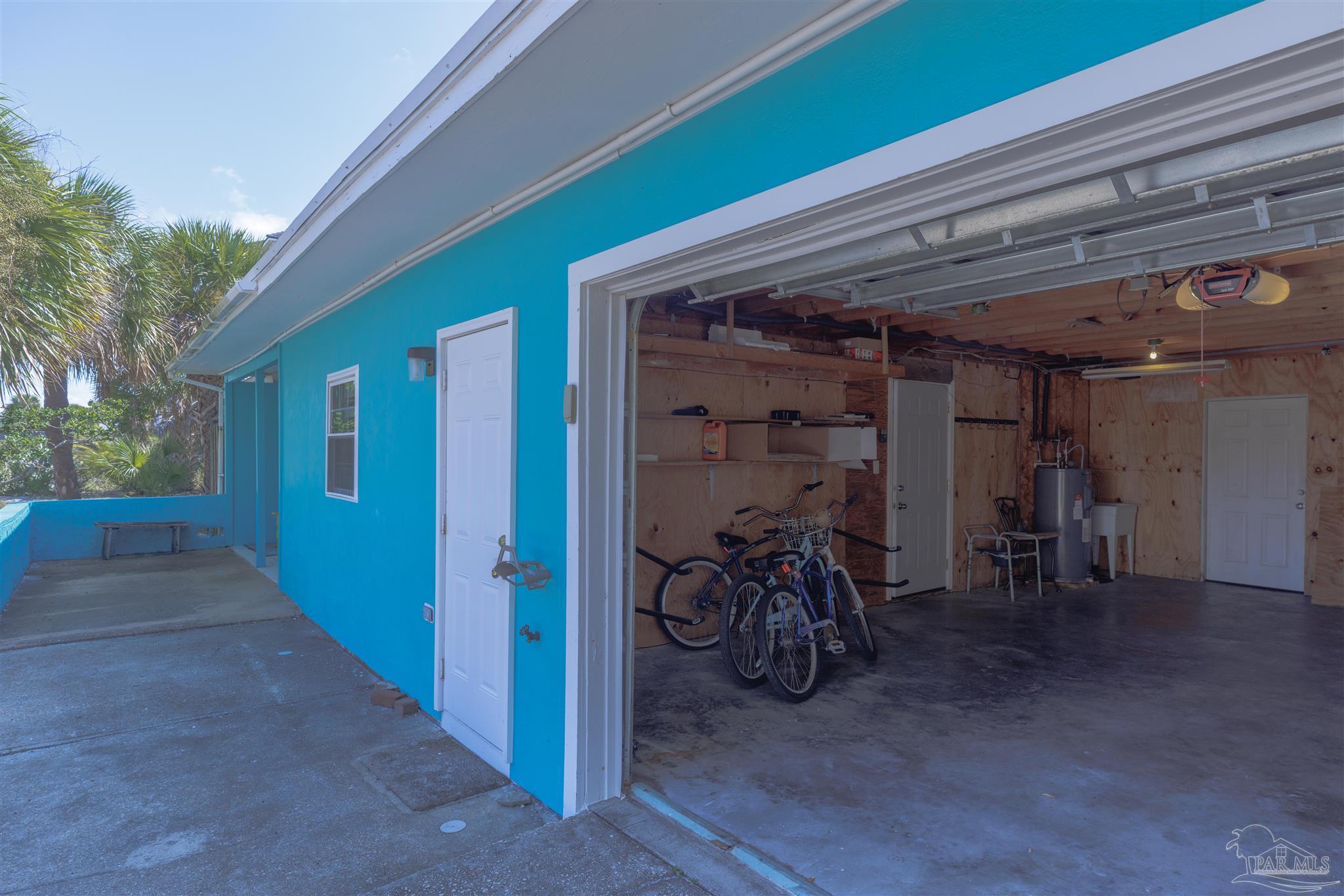 Rare find! This coastal cottage style beach home features 3 bedrooms, 3 full baths with primary bedroom & main living areas opening to a tropical paradise with a sparkling pool, white sand, palm trees and tiki carvings! Climb the outdoor stairs to a private rooftop deck to view the Gulf or take a short walk to enjoy the sugar white sands & blue-green, crystal clear waters of the Gulf! The gourmet kitchen has been completely updated with stainless steel appliances, newer cabinets, granite countertops, with a window overlooking your private pool! Kitchen opens to dining area, large gathering room. Additional living area perfect for media room. Large primary bedroom with ensuite consisting of tiled shower & whirlpool style tub. Room for a king-sized bed with sitting area & french doors opening to backyard. Second bedroom features room for queen-sized bed with shower/tub. 3rd bedroom perfect for twin beds. 3rd bathroom includes washer/dryer/shower and doubles as a pool bath! Oversized one-car garage with attached storage room also accessible from backyard with plenty of room for bikes, small watercraft! The Gulf access walkway is adjacent to property. Trolley Stop for easy ride to beach restaurants, bars, and shops. This home is definitely a charmer! Look no further for your Pensacola Beach home! This is it!