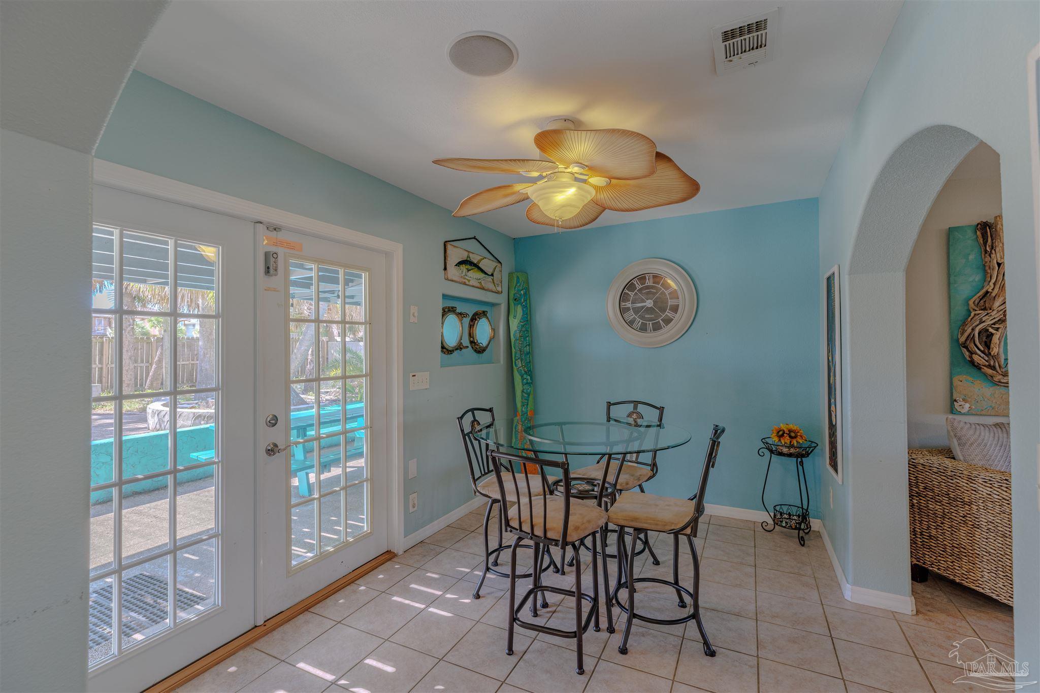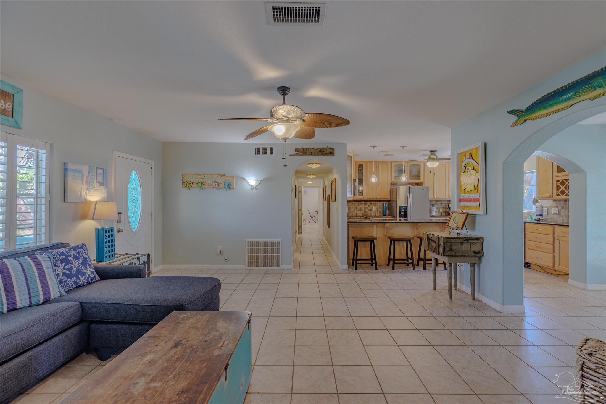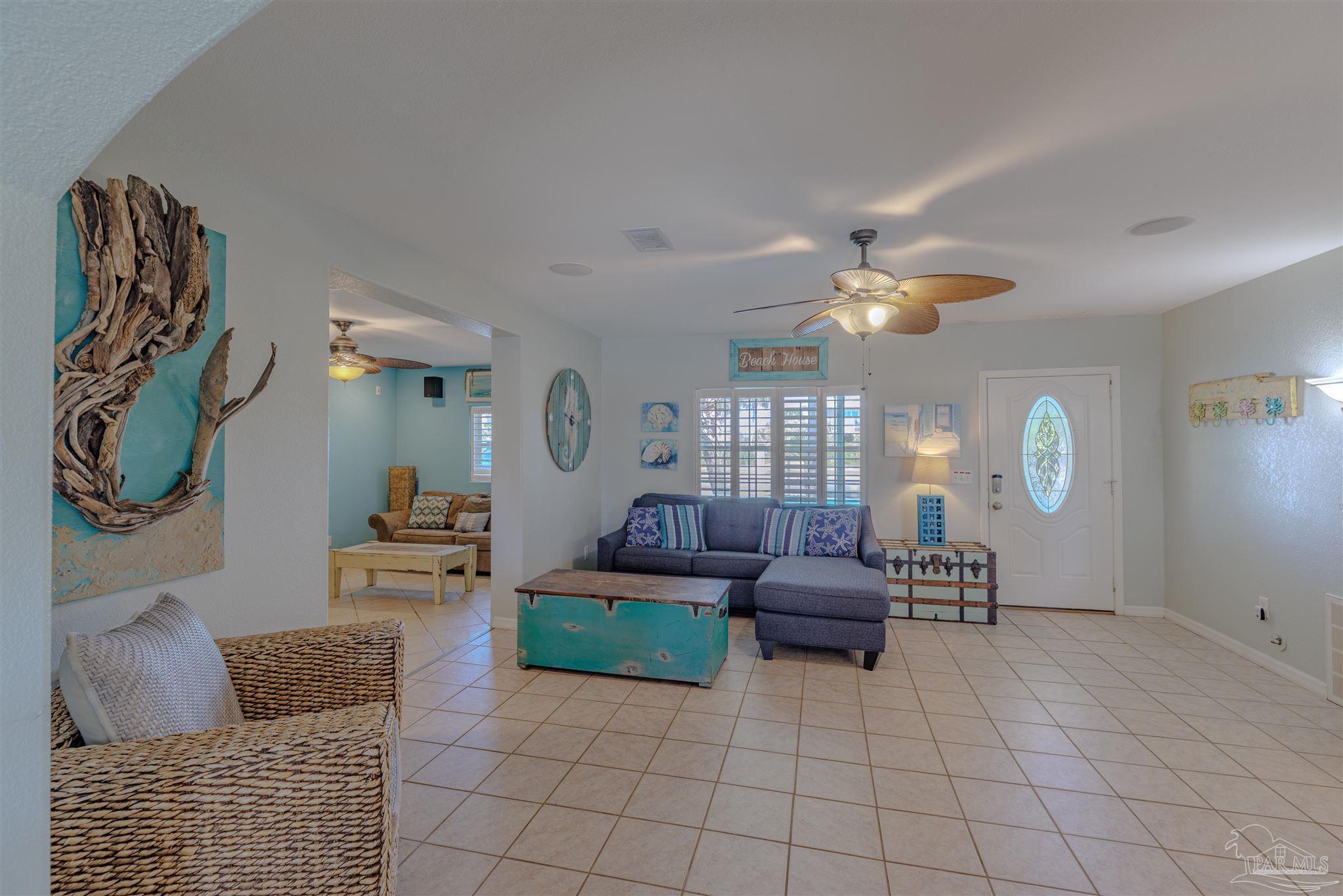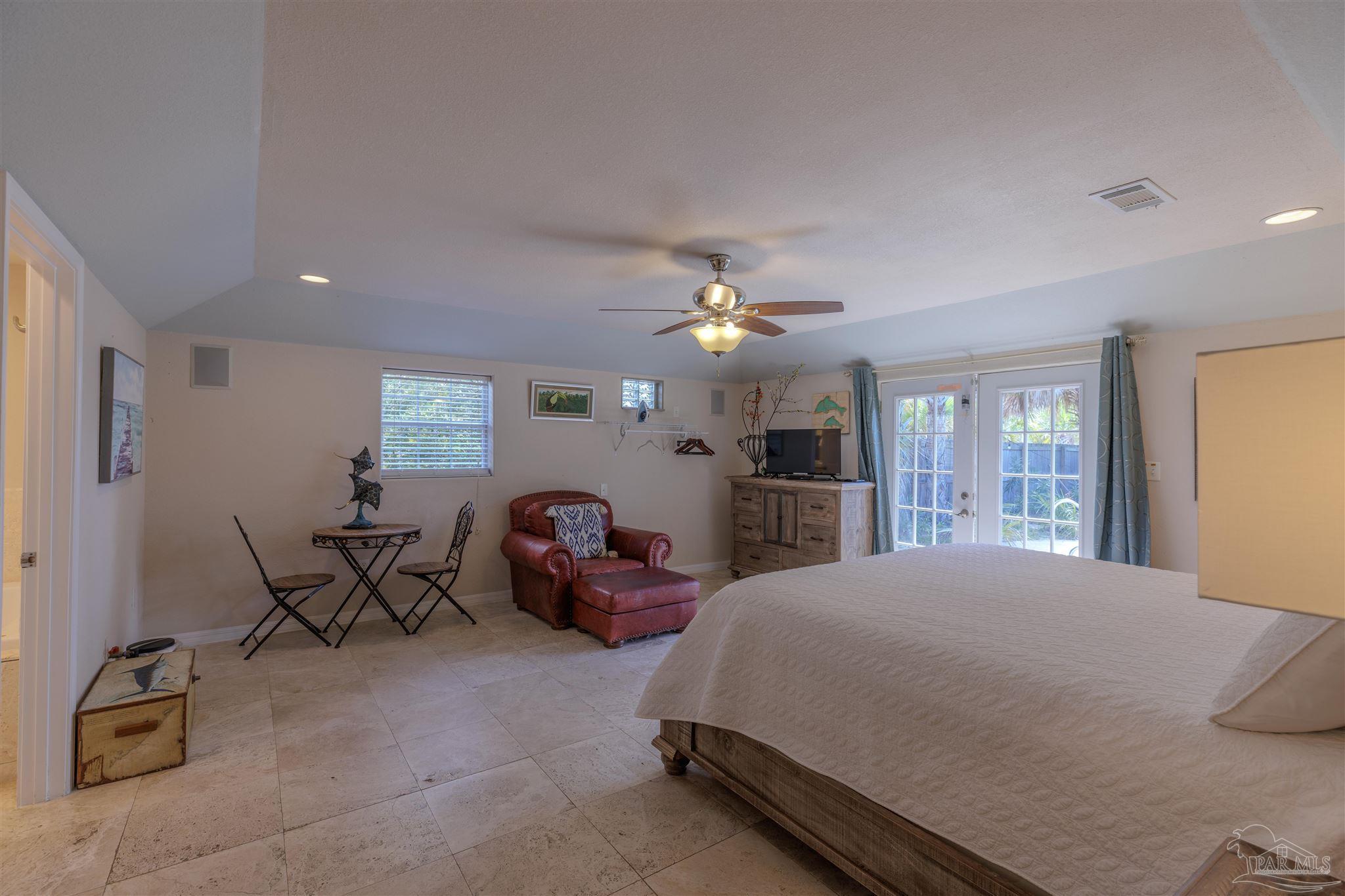 Rare find! This coastal cottage style beach home features 3 bedrooms, 3 full baths with primary bedroom & main living areas opening to a tropical paradise with a sparkling pool, white sand, palm trees and tiki carvings! Climb the outdoor stairs to a private rooftop deck to view the Gulf or take a short walk to enjoy the sugar white sands & blue-green, crystal clear waters of the Gulf! The gourmet kitchen has been completely updated with stainless steel appliances, newer cabinets, granite countertops, with a window overlooking your private pool! Kitchen opens to dining area, large gathering room. Additional living area perfect for media room. Large primary bedroom with ensuite consisting of tiled shower & whirlpool style tub. Room for a king-sized bed with sitting area & french doors opening to backyard. Second bedroom features room for queen-sized bed with shower/tub. 3rd bedroom perfect for twin beds. 3rd bathroom includes washer/dryer/shower and doubles as a pool bath! Oversized one-car garage with attached storage room also accessible from backyard with plenty of room for bikes, small watercraft! The Gulf access walkway is adjacent to property. Trolley Stop for easy ride to beach restaurants, bars, and shops. This home is definitely a charmer! Look no further for your Pensacola Beach home! This is it!