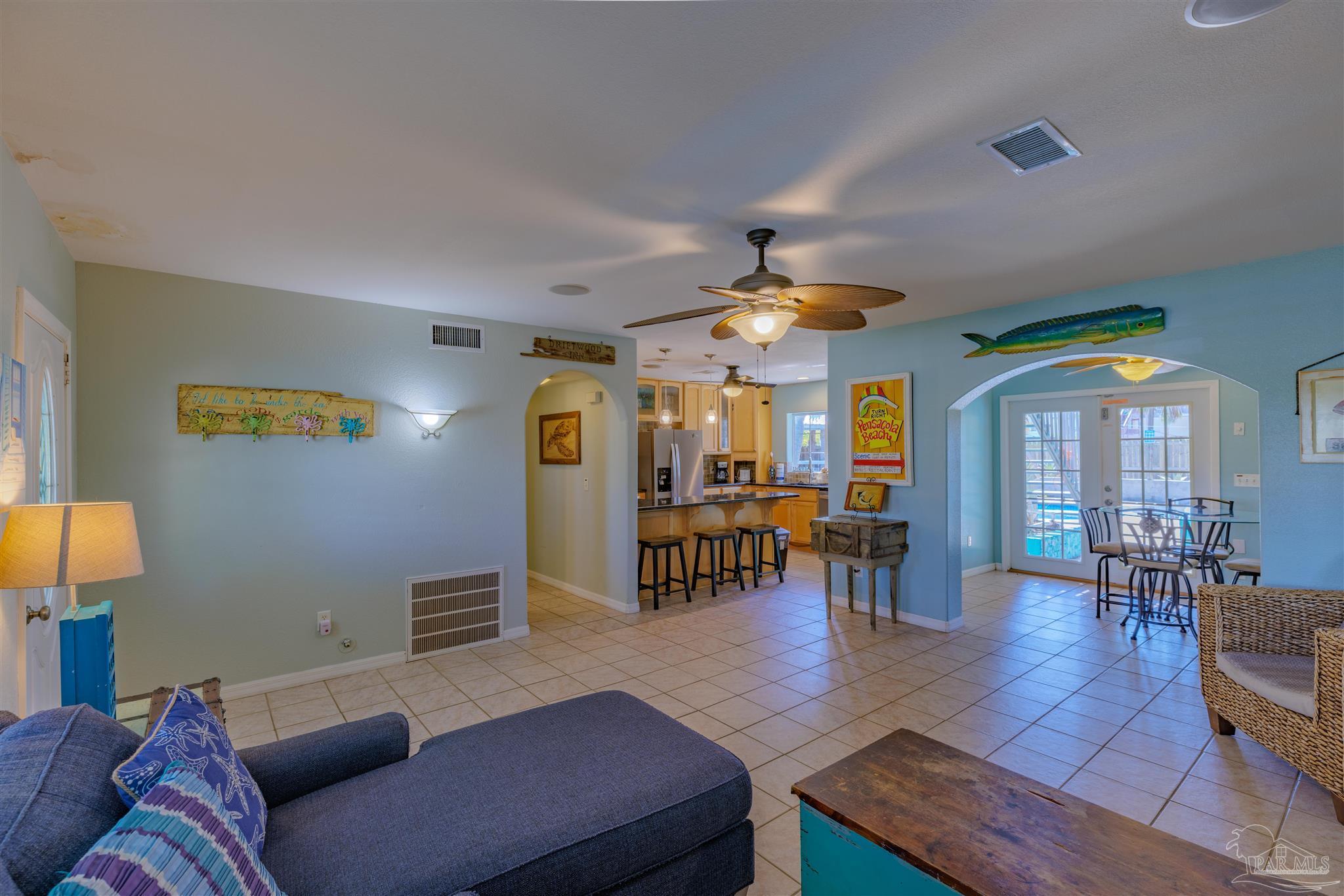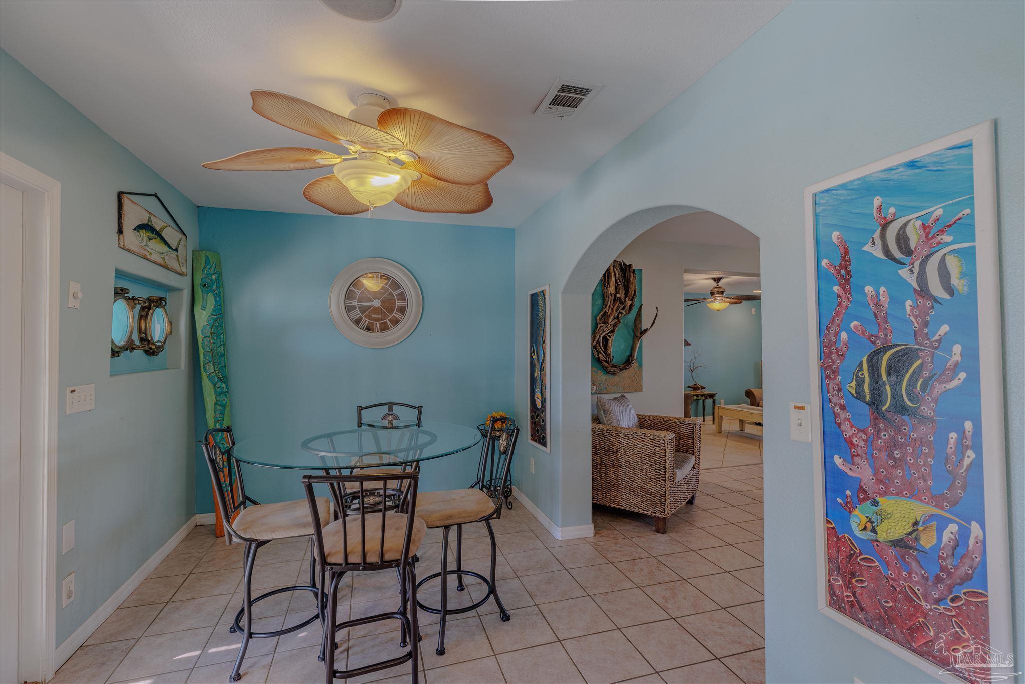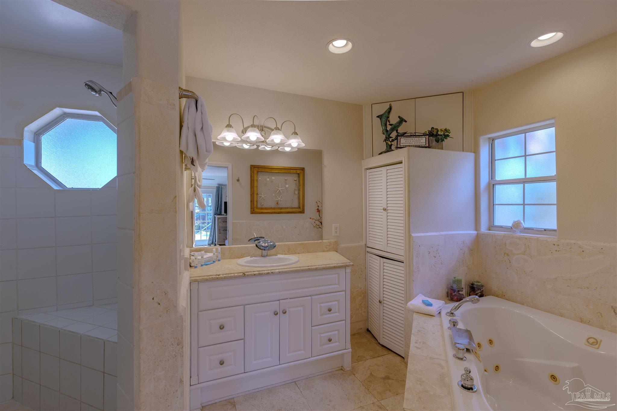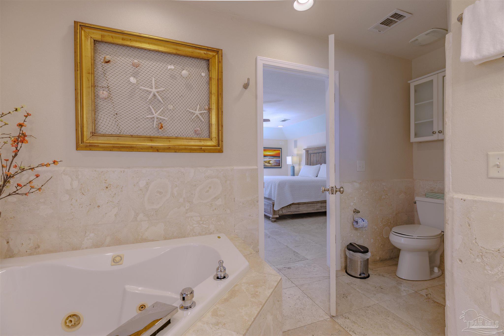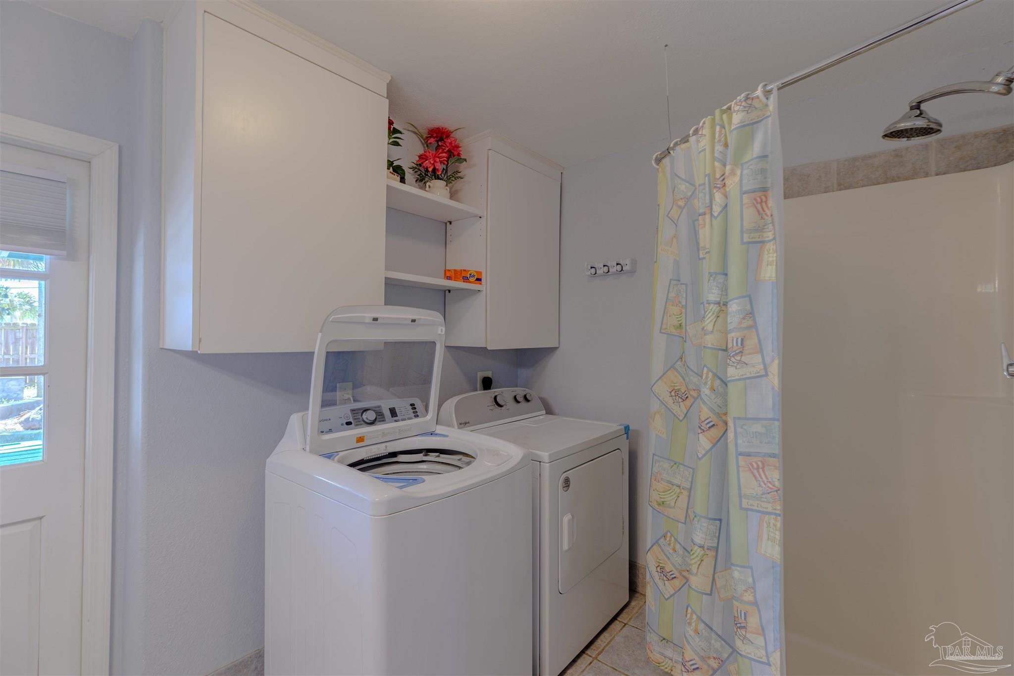 Rare find! This coastal cottage style beach home features 3 bedrooms, 3 full baths with primary bedroom & main living areas opening to a tropical paradise with a sparkling pool, white sand, palm trees and tiki carvings! Climb the outdoor stairs to a private rooftop deck to view the Gulf or take a short walk to enjoy the sugar white sands & blue-green, crystal clear waters of the Gulf! The gourmet kitchen has been completely updated with stainless steel appliances, newer cabinets, granite countertops, with a window overlooking your private pool! Kitchen opens to dining area, large gathering room. Additional living area perfect for media room. Large primary bedroom with ensuite consisting of tiled shower & whirlpool style tub. Room for a king-sized bed with sitting area & french doors opening to backyard. Second bedroom features room for queen-sized bed with shower/tub. 3rd bedroom perfect for twin beds. 3rd bathroom includes washer/dryer/shower and doubles as a pool bath! Oversized one-car garage with attached storage room also accessible from backyard with plenty of room for bikes, small watercraft! The Gulf access walkway is adjacent to property. Trolley Stop for easy ride to beach restaurants, bars, and shops. This home is definitely a charmer! Look no further for your Pensacola Beach home! This is it!