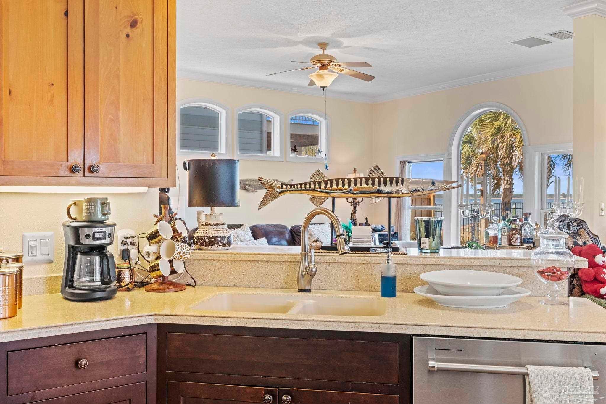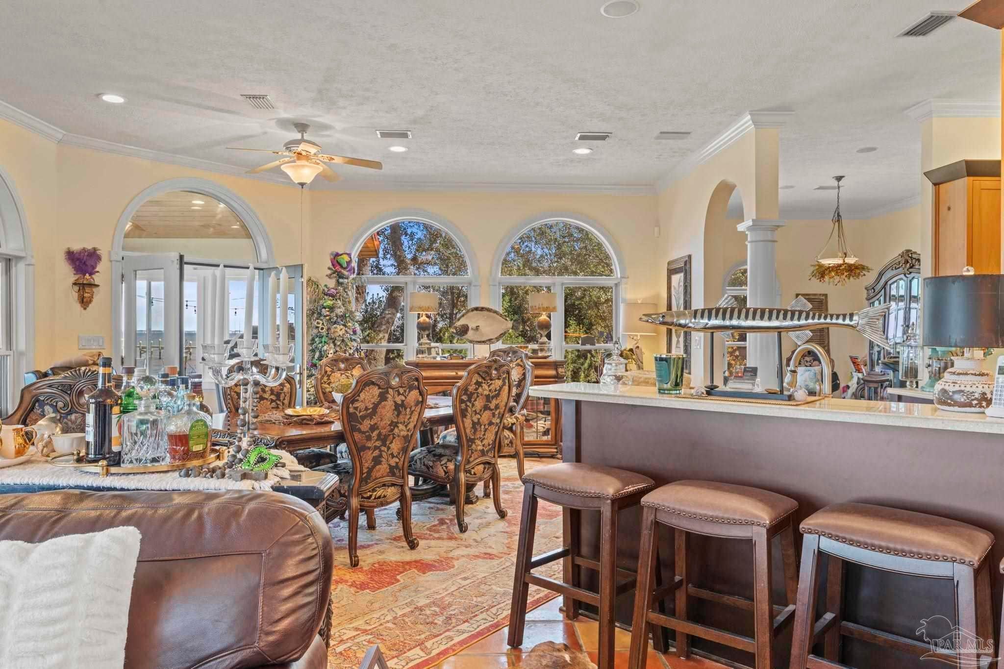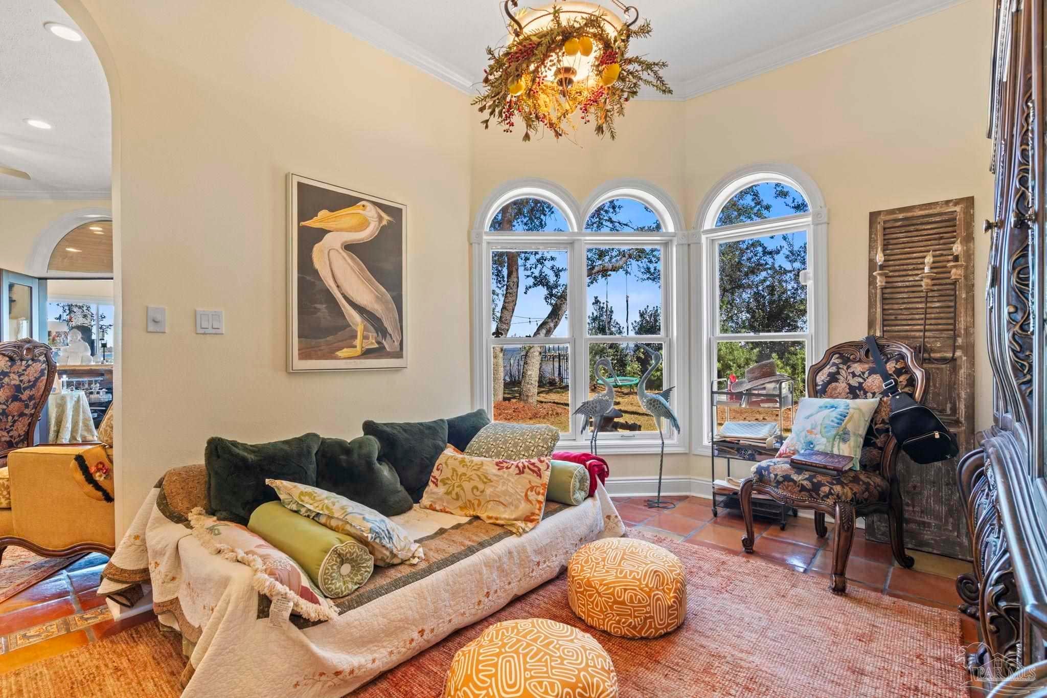 Waterfront Wonderland on Perdido Bay – with Dolphins, Fishing & Crabbing! Wake up to sparkling sunrises over Perdido Bay and let the soothing sounds of the water set the tone for your day. This gorgeous Mediterranean-inspired home isn’t just a house—it’s a front-row seat to paradise, complete with daily dolphin sightings and endless fun right from your backyard! Step inside and fall in love with the warm, inviting vibe. The first floor is decked out with authentic Mexican Saltillo tile that adds a splash of charm, while an open-concept layout keeps the kitchen, dining, and living spaces flowing effortlessly together. Picture cozy evenings by the fireplace, mornings with coffee in the sunroom, and every meal served with a side of breathtaking bay views.Head upstairs to your dreamy master retreat, where a fireplace, spa-worthy bath with Jacuzzi tub, and panoramic water views make every day feel like a vacation. And when it’s time to play. Step outside to the newly built Catwalk dock—perfect for fishing, crabbing, or simply watching the dolphins put on a show as the sunsets.This home also comes packed with perks: a whole-home generator (hello, peace of mind!), an artist’s studio that can double as an office or 5th bedroom, a cedar closet, laundry chute, tankless water heater, and more. All this, wrapped up with modern amenities, timeless design, and a $10,000 flex-credit to make it your own. Don’t just live by the bay—live the bay life with dolphins, fishing, crabbing, and pure coastal bliss. Buyer to verify all information during due diligence.