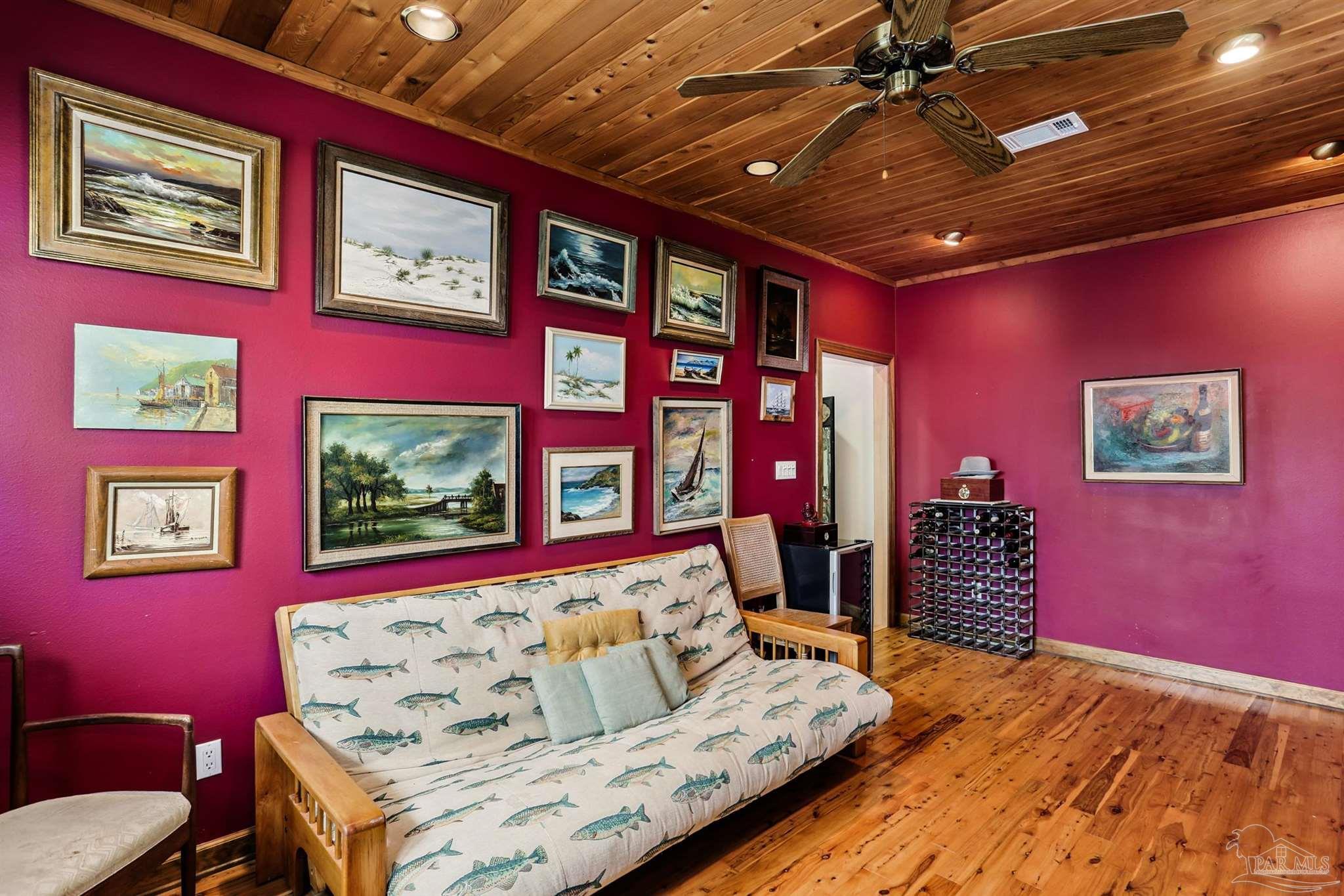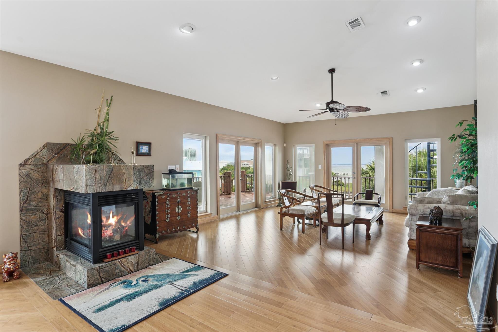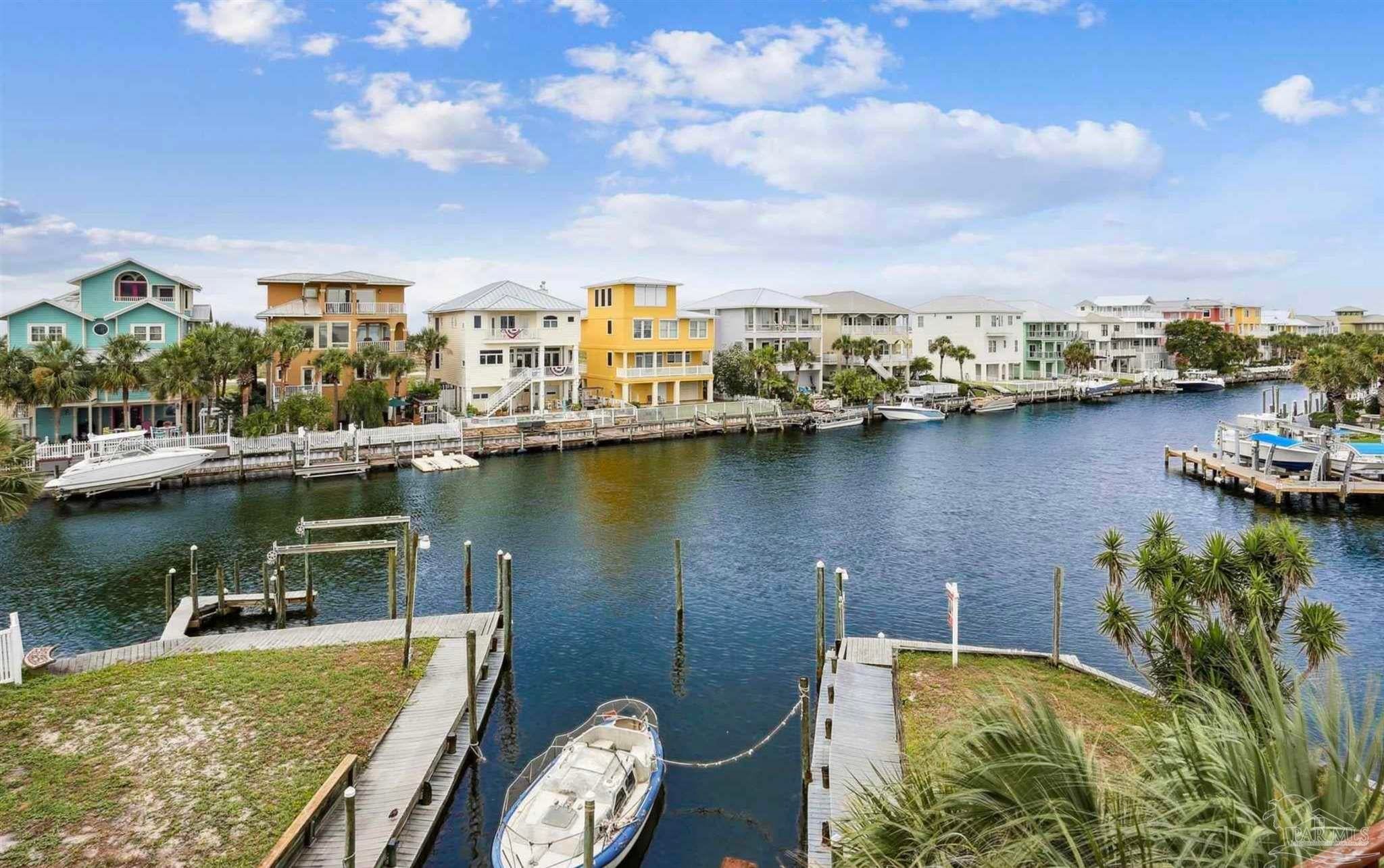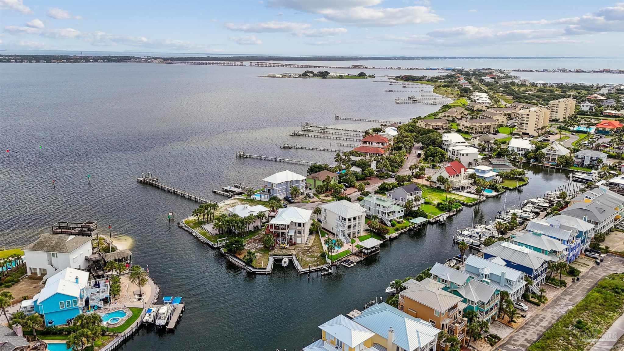 Boat Lovers' Luxury living with 2 boat slips and boat lift. Elevator services all 3 living area levels into the 3rd floor chef's kitchen-dining-living area- Great Room. Bonus office/wine rom and 1/2 bath overlooks boat docks. Gorgeous wood stairways with double handrails lead through each floor. The millwork trim throughout accents the craftsmanship and details that went into building this beautiful waterfront retreat. There are multiple water views on every level all the way up to the crows nest. 118’ of water front affords one of the truly great, protected assets on Santa Rosa island. Truly a Boater's Dream New metal Weather Shield roof in 2024 cost $100,000. Geothermal AC & Heat; Sprinkler system has separate ECUA meter, so can be used without charge for sewer.