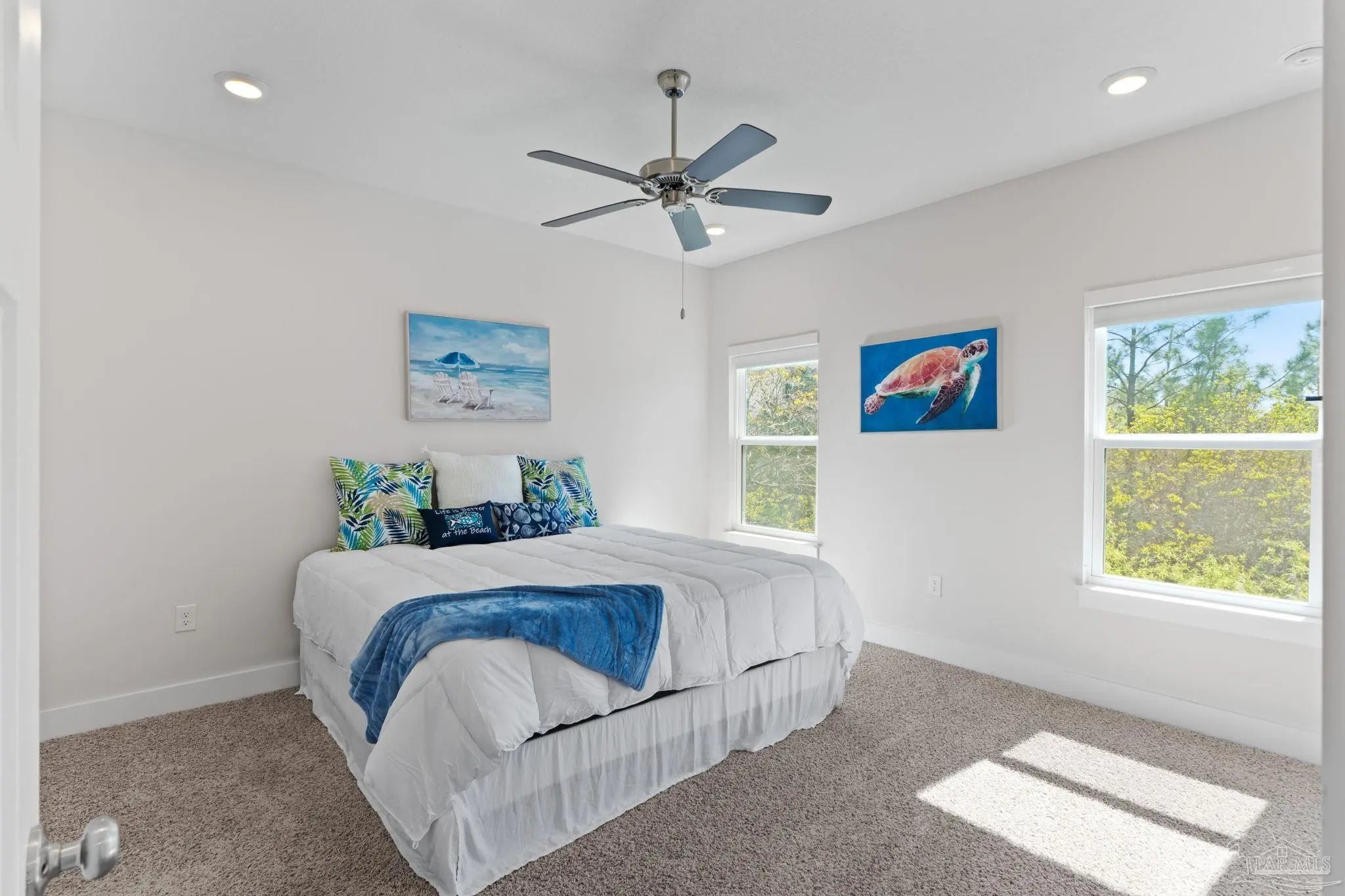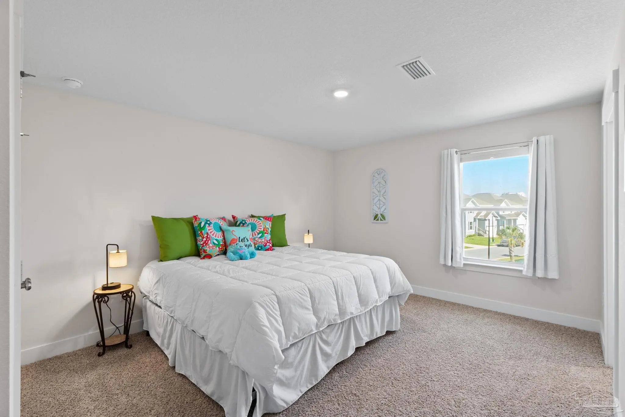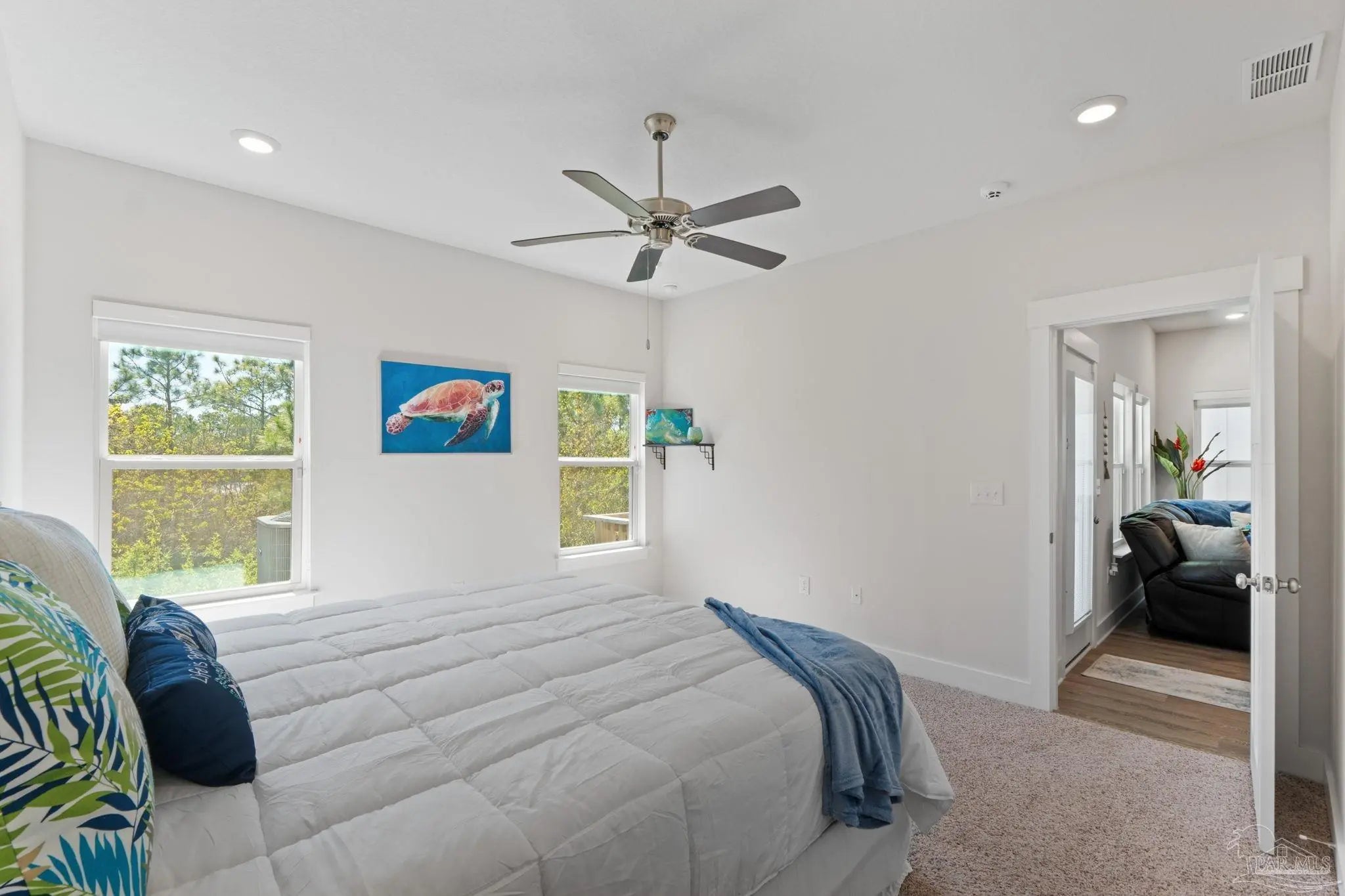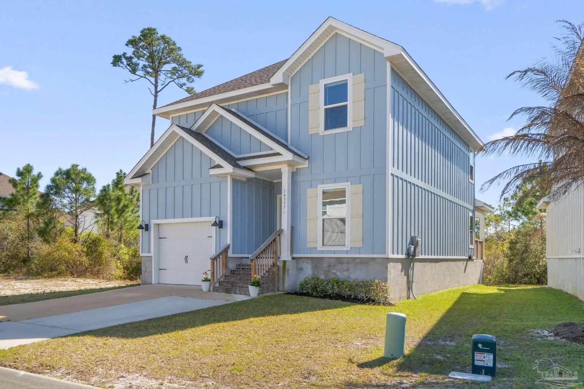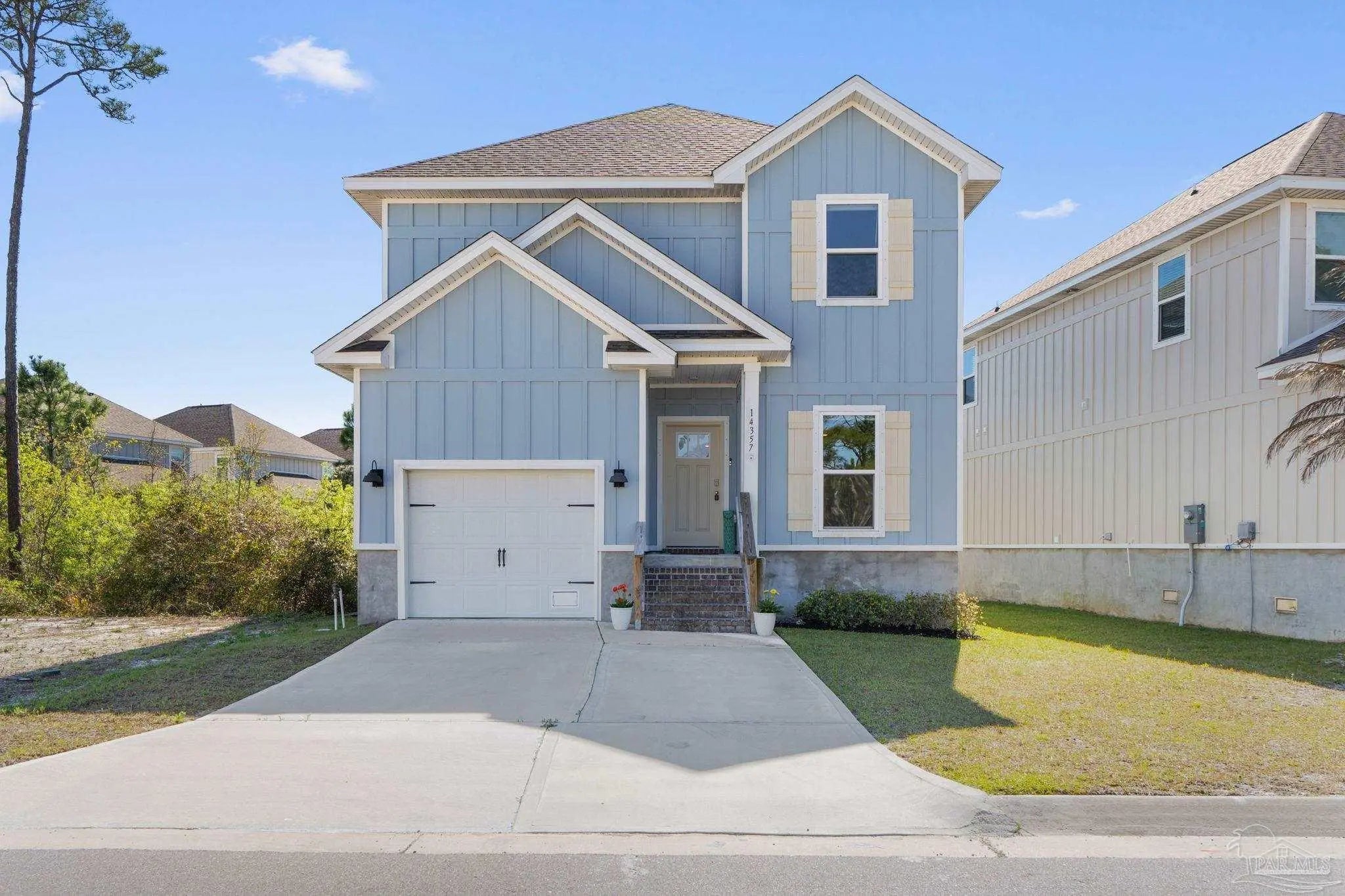 Assumable VA Loan option! No rental restrictions! Discover coastal living at its finest in this 2022-built two-story residence, where thoughtful design meets modern comfort. This is arguably the best lot in the community, as you can watch the most beautiful sunsets as you're relaxing on your back porch. The well-appointed first floor showcases a sophisticated primary bedroom suite, featuring a spa-inspired bathroom with double vanity, granite countertops, and a luxurious walk-in closet. The gourmet kitchen delights with a breakfast bar, granite surfaces, and a generous pantry, flowing seamlessly into an elegant dining room and living area. Upstairs, a dedicated family room and additional bedrooms provide the perfect retreat for relaxation or entertainment. The home's 2,260 square feet of living space is adorned with premium finishes, including luxury vinyl and plush carpet flooring throughout. Practical elegance extends to the covered porch, equipped with remote-controlled blinds for effortless outdoor enjoyment. This coastal gem offers the perfect blend of privacy and accessibility, with a serene dog park and kayak launch just steps away. Beach enthusiasts will appreciate the convenient sidewalk leading to public beach access, a mere three-quarter mile stroll. Additional features include hurricane shutters, Hardieplank siding, and a sprinkler system. The property comes partially furnished, including washer and dryer, making the transition to coastal living seamless. Short term rentals allowed in community.