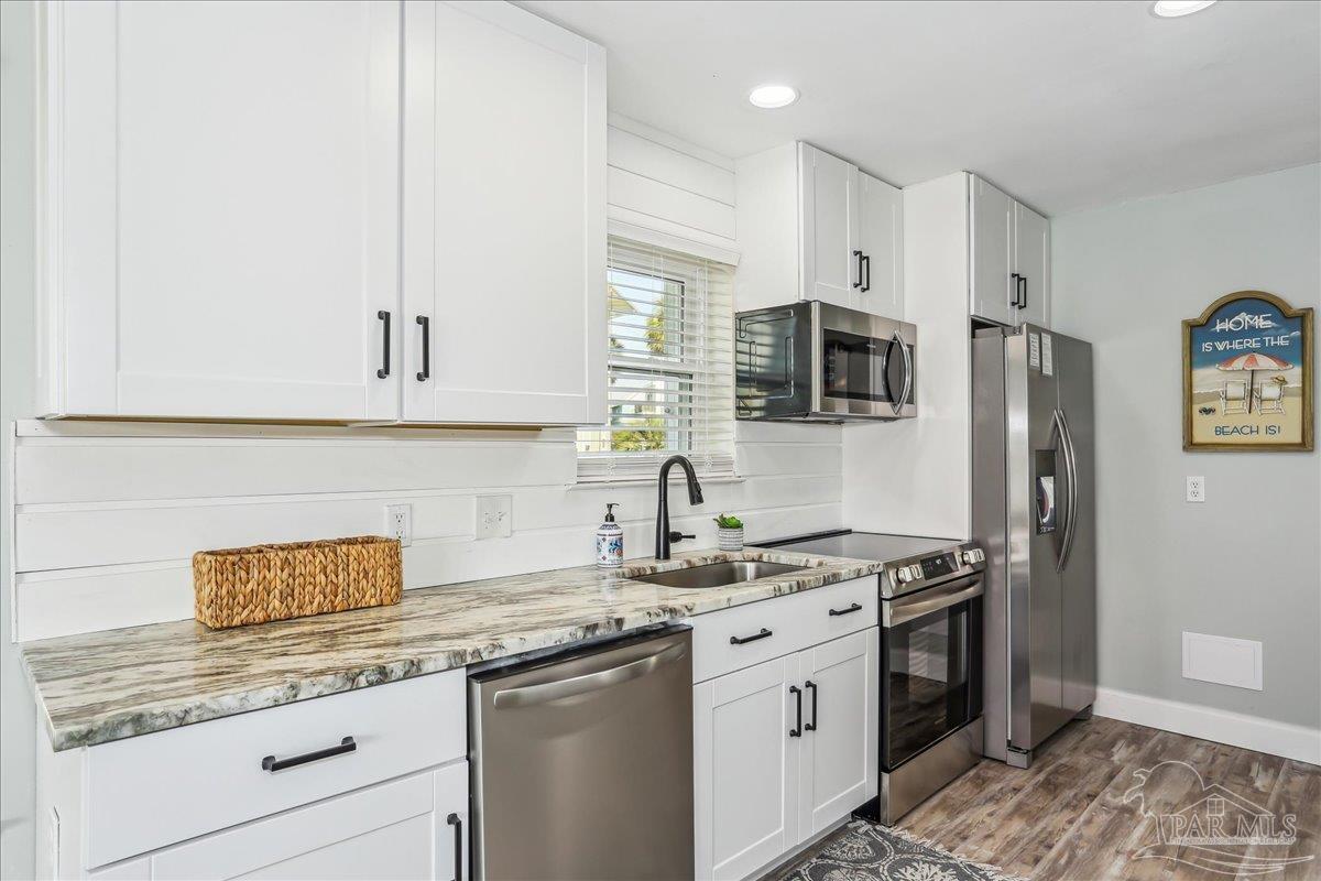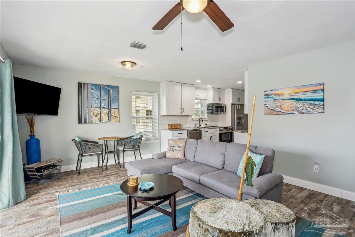 Experience the ease of island life in this completely renovated 2-bedroom, 2-bath, sound front condo—just a 6-minute walk from the white sands of Navarre Beach. With new LVP flooring and fresh paint throughout, this first-floor unit – no stairs! - is turnkey and perfectly blends style, comfort, and functionality. Inside, a bright, open-concept layout welcomes you with coastal charm and effortless flow. The living and dining areas seamlessly connect to the kitchen, making entertaining or relaxing a breeze. Kitchen updates add a fresh, modern flair with white cabinetry, granite countertops, and stainless appliances. The sliding glass doors invite the natural light and lead to a large private balcony—your front-row seat to stunning sunset views over the Santa Rosa Sound. Both bedrooms are spacious with ample closets, offering a serene escape after a day of sun and sand. Both bathrooms have been tastefully updated to reflect a clean, modern coastal aesthetic with new vanities, toilets, and fixtures. Whether you’re lounging by the pool, strolling to the beach, or watching the sun set over the Sound, this Navarre Beach gem is your ticket to low-maintenance luxury in one of the Gulf Coast’s most desirable destinations.