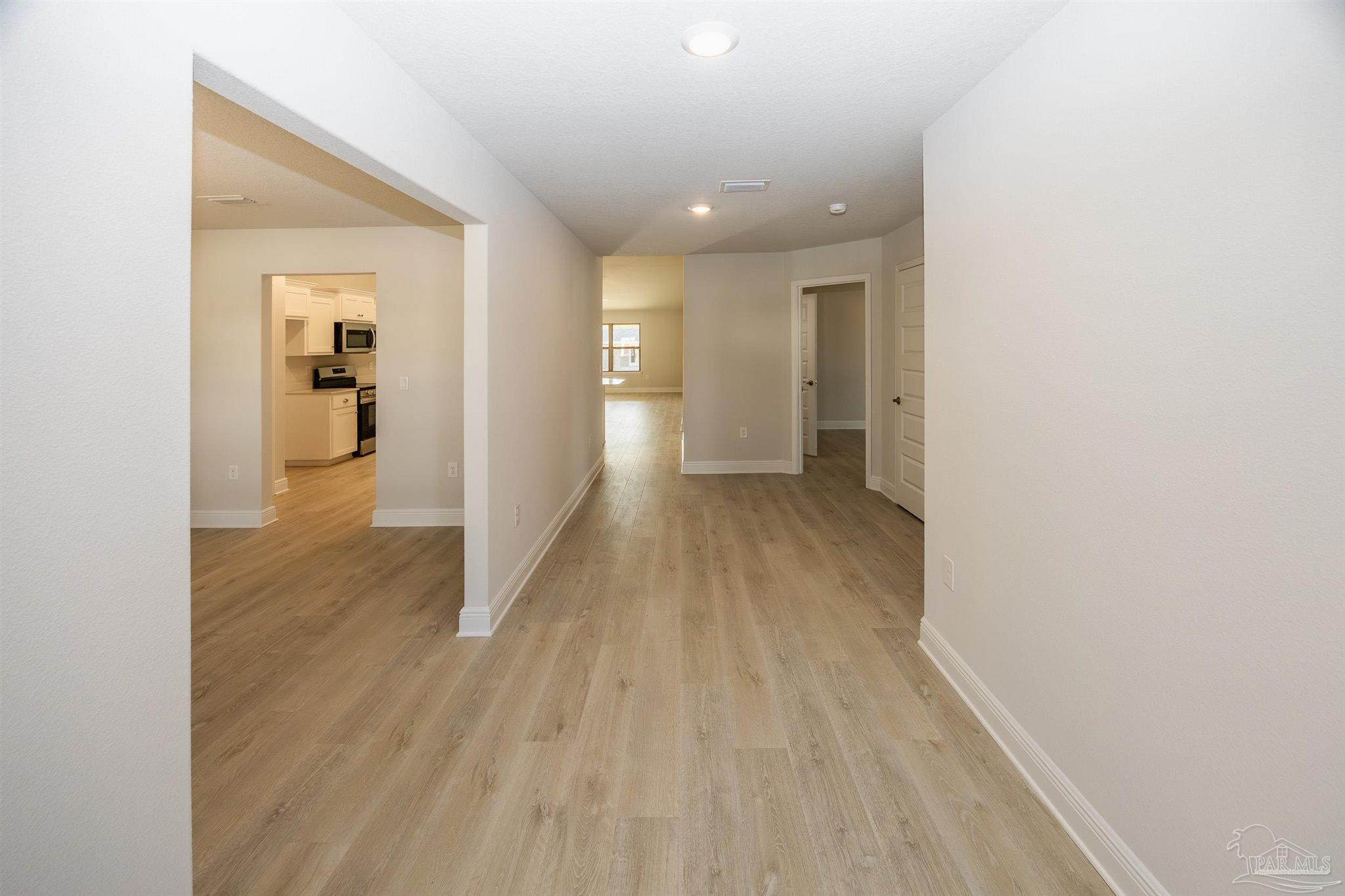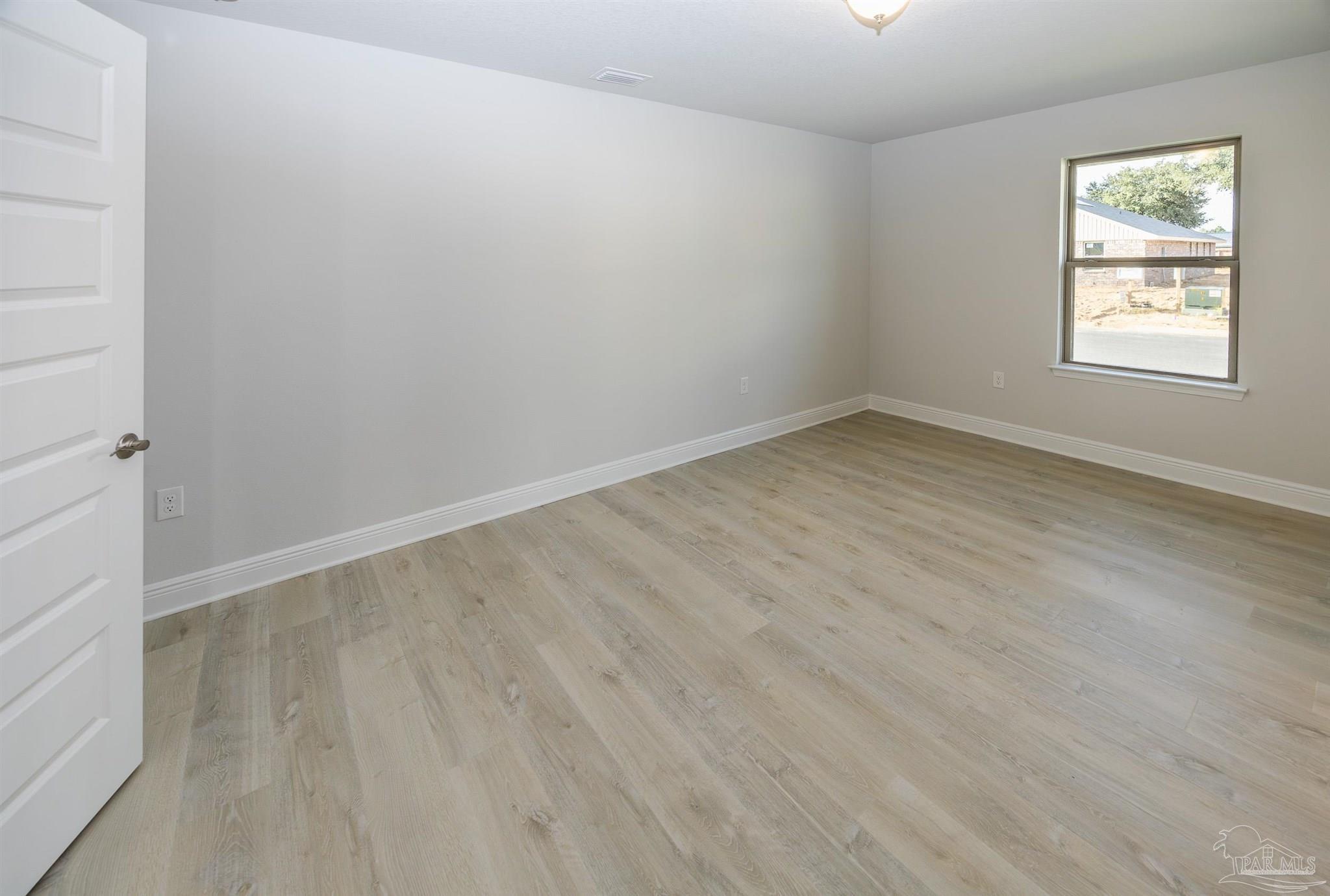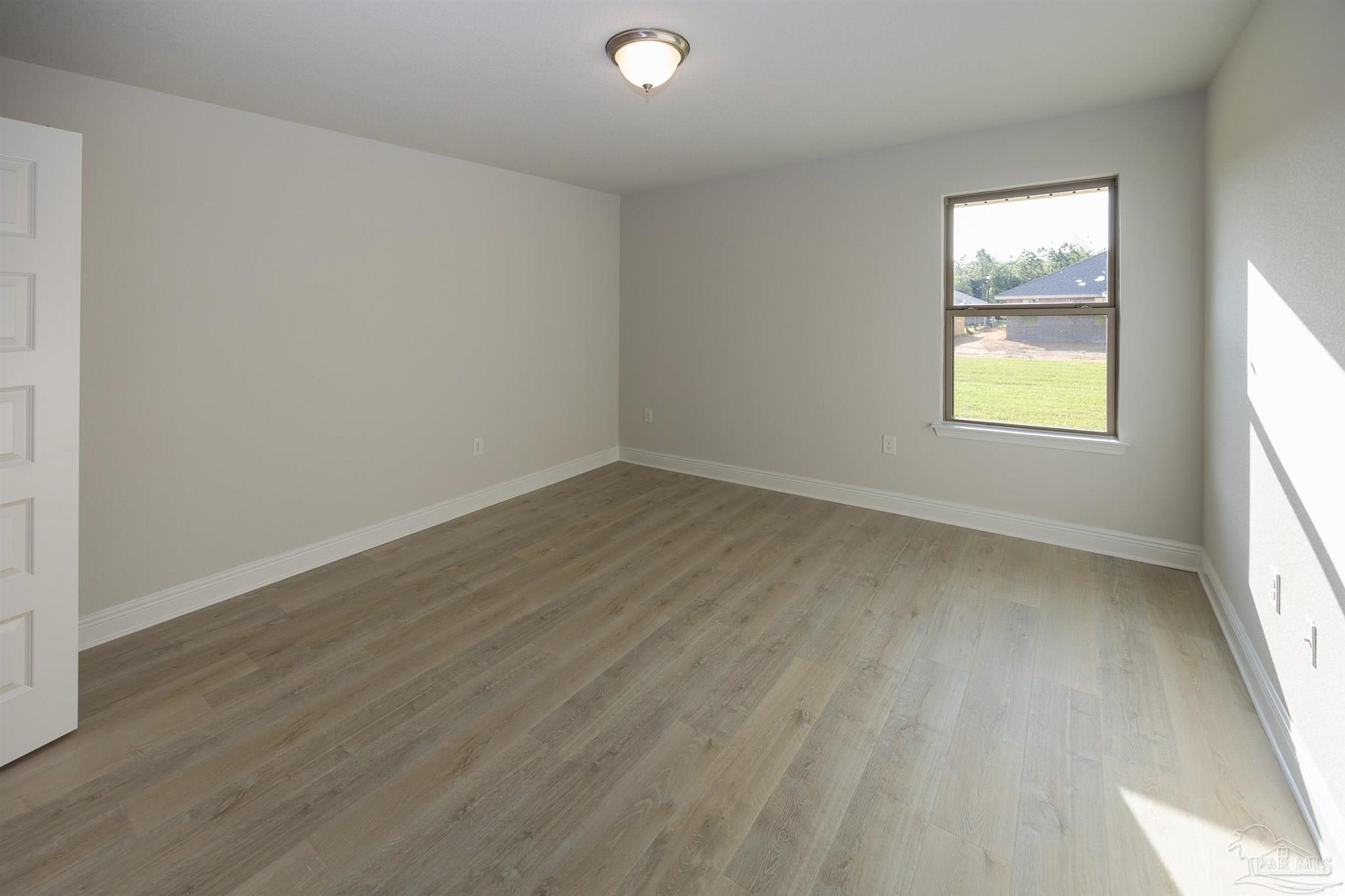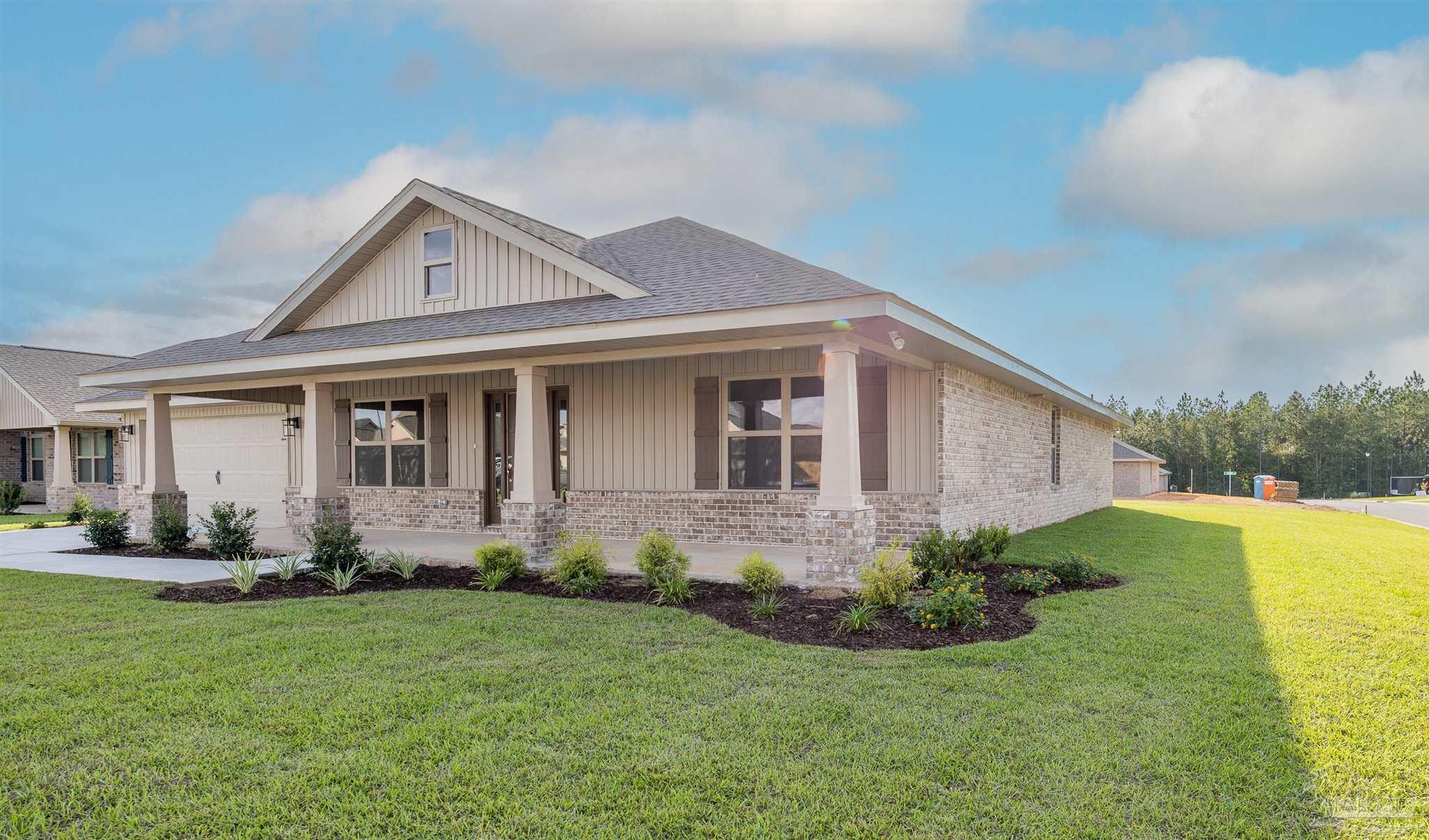 READY NOW! This breathtaking home is a spacious and charming 5-bedroom, 3-bathroom home with an inviting front porch providing a welcoming entrance and on a corner lot. Upon entering the home, you are greeted with an inviting foyer opening into the spacious living area featuring beautiful upgraded LVP flooring for easy care throughout the home. The heart of this home is the open-concept living space, where the kitchen seamlessly connects to the family room with a large island. The kitchen has upgraded beautiful quartz countertops, custom white shaker cabinets with crown molding, and stainless steel appliances. The owner's suite is a true sanctuary, featuring an ensuite bathroom featuring a corner soaking tub, a separate shower, and quartz countertops. The five bedrooms offer ample space for family or guests, with possibilities for various uses such as bedrooms, home offices, or hobby rooms. The backyard offers outdoor living space with room for relaxation and entertainment with an upgraded 14' x 16' covered porch, and floodlights. This beautiful home has a fully sodded homesite with a sprinkler system, a garage door opener, and many other stunning features. Thank you!