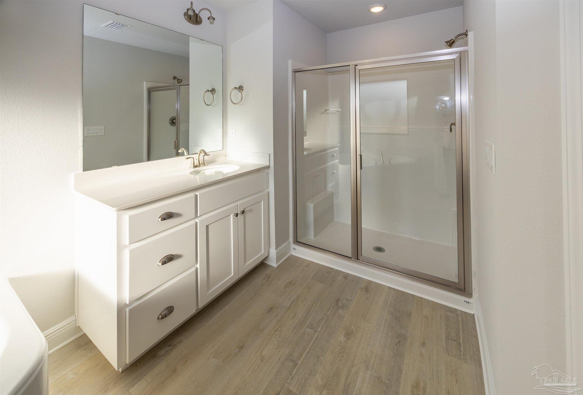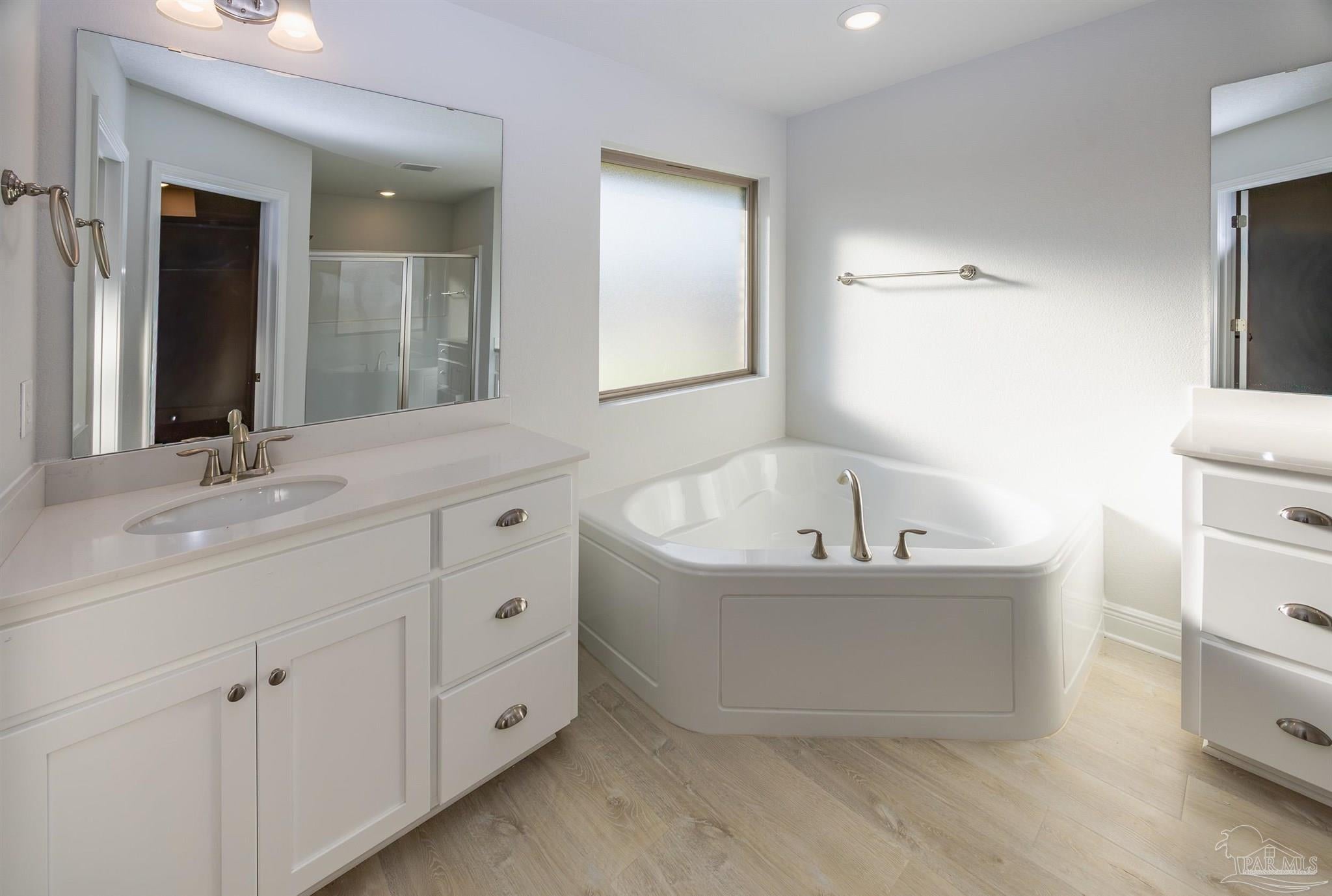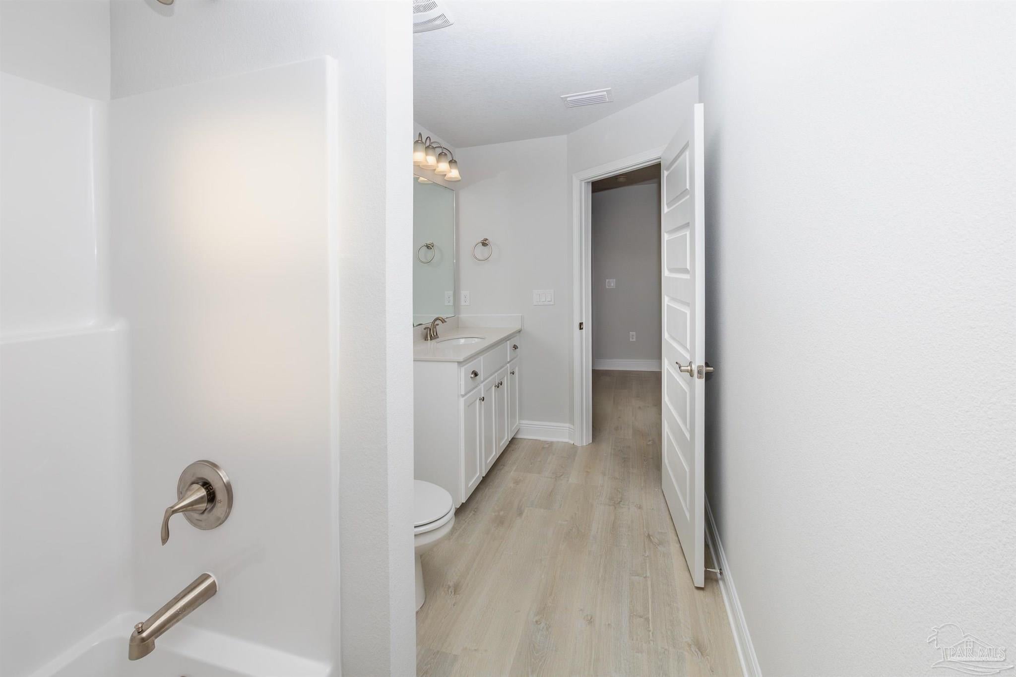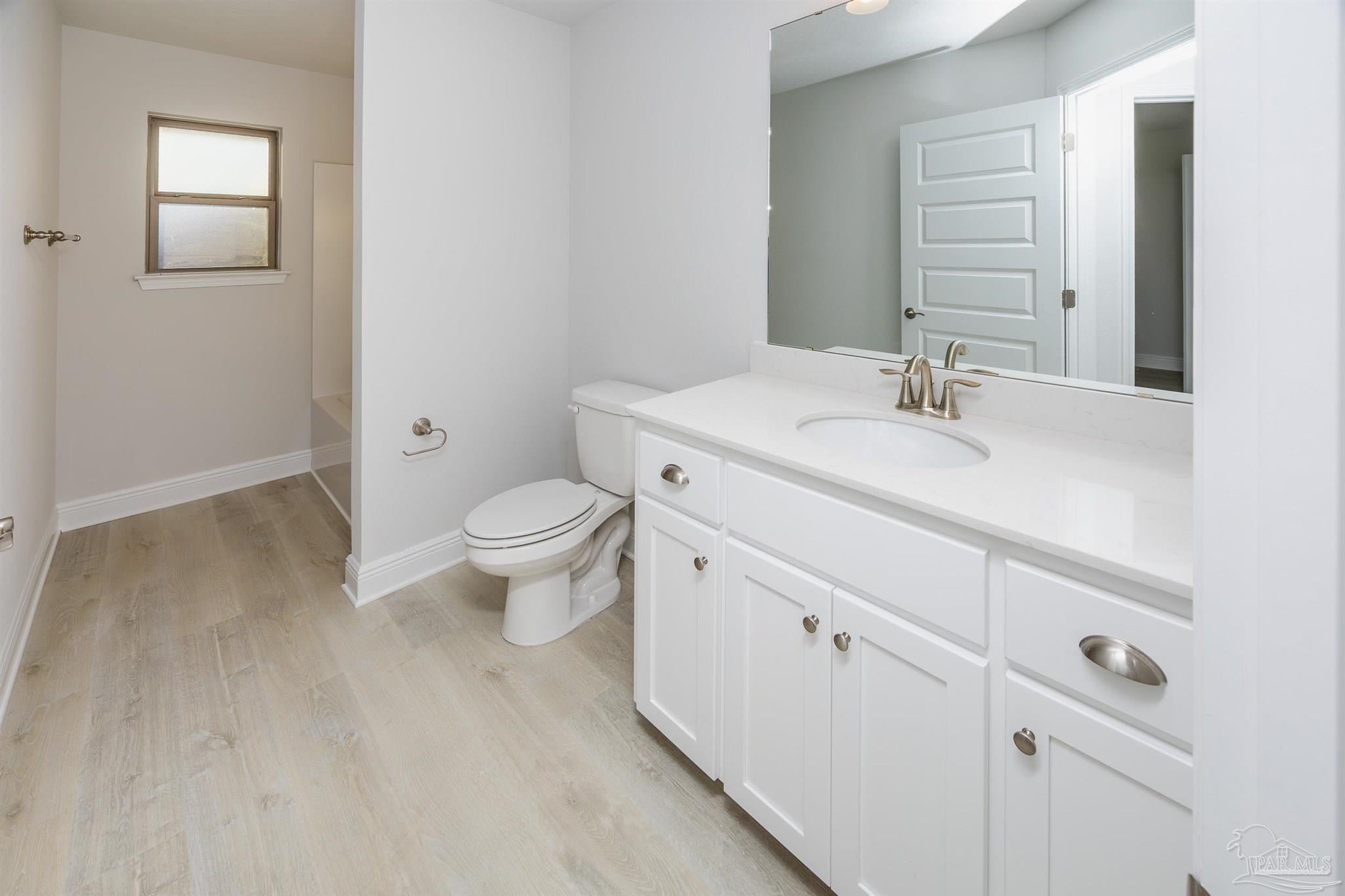 READY NOW! This breathtaking home is a spacious and charming 5-bedroom, 3-bathroom home with an inviting front porch providing a welcoming entrance and on a corner lot. Upon entering the home, you are greeted with an inviting foyer opening into the spacious living area featuring beautiful upgraded LVP flooring for easy care throughout the home. The heart of this home is the open-concept living space, where the kitchen seamlessly connects to the family room with a large island. The kitchen has upgraded beautiful quartz countertops, custom white shaker cabinets with crown molding, and stainless steel appliances. The owner's suite is a true sanctuary, featuring an ensuite bathroom featuring a corner soaking tub, a separate shower, and quartz countertops. The five bedrooms offer ample space for family or guests, with possibilities for various uses such as bedrooms, home offices, or hobby rooms. The backyard offers outdoor living space with room for relaxation and entertainment with an upgraded 14' x 16' covered porch, and floodlights. This beautiful home has a fully sodded homesite with a sprinkler system, a garage door opener, and many other stunning features. Thank you!
