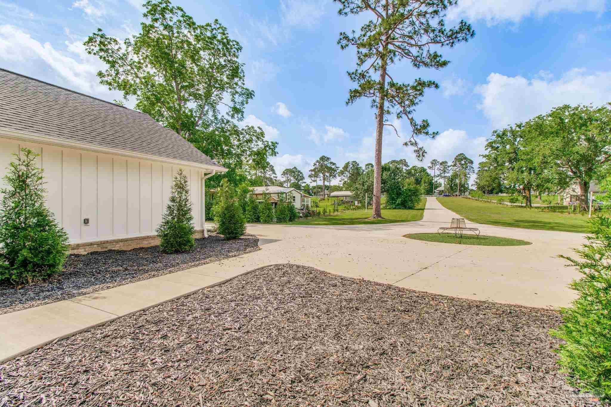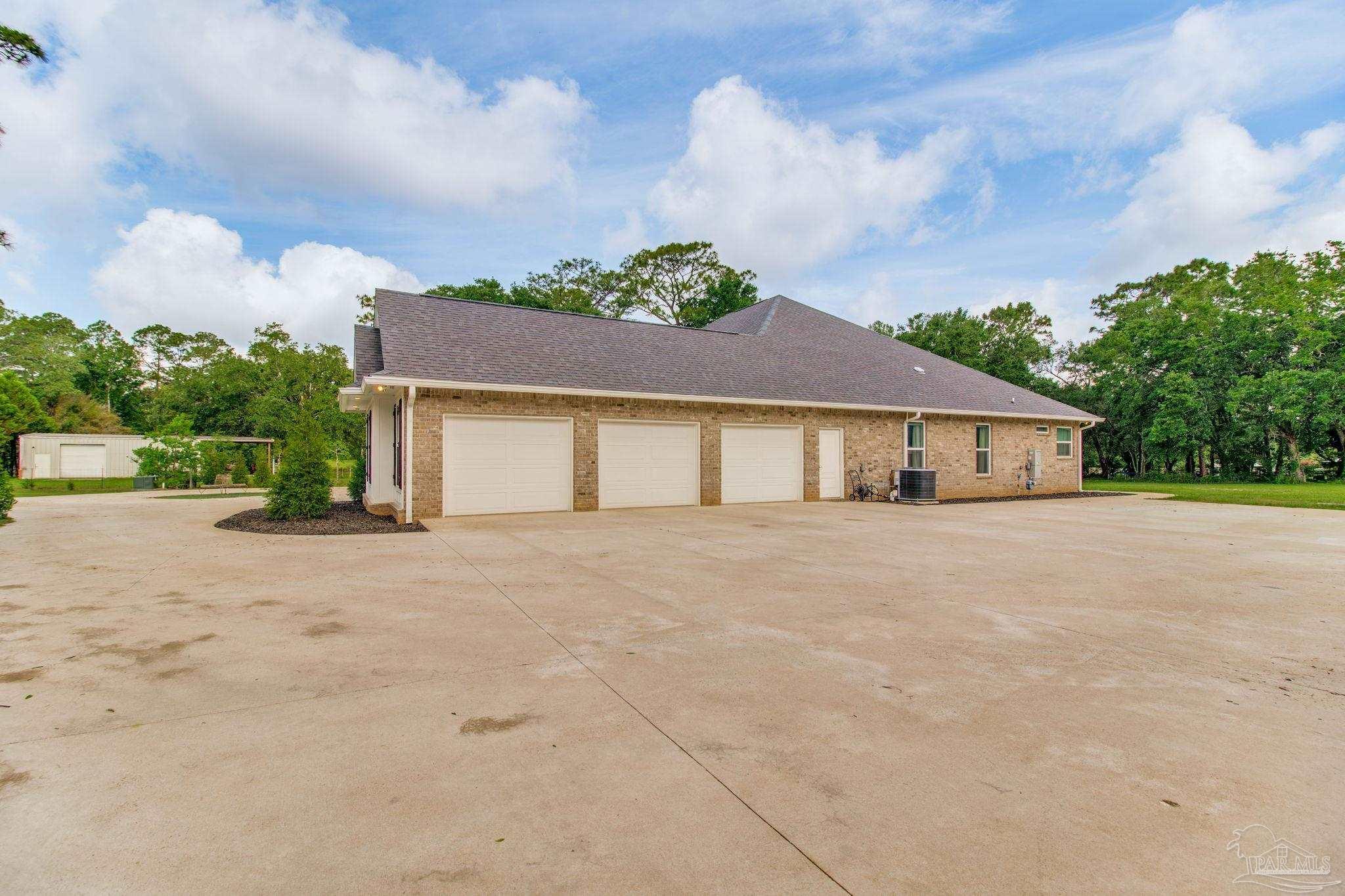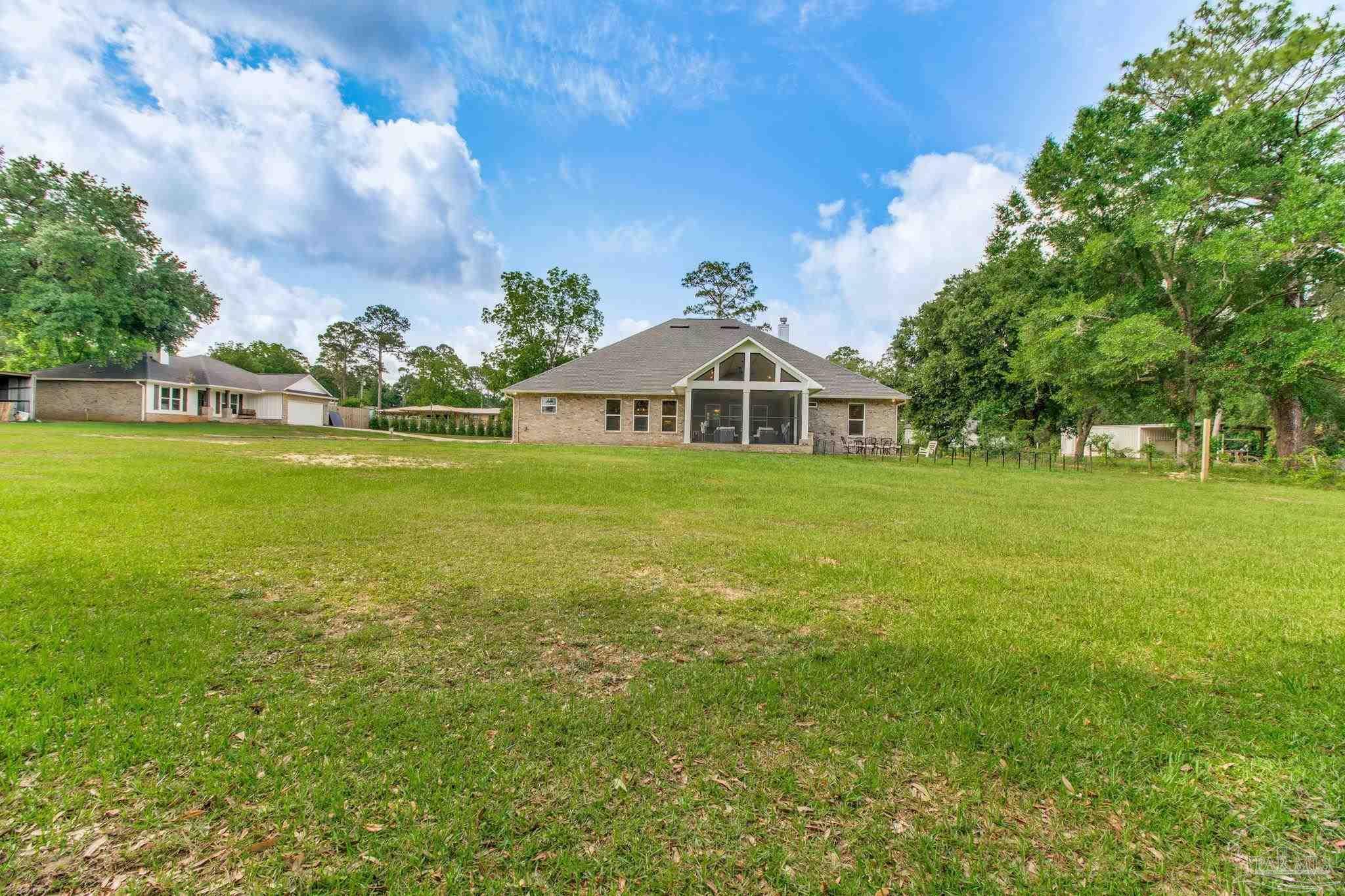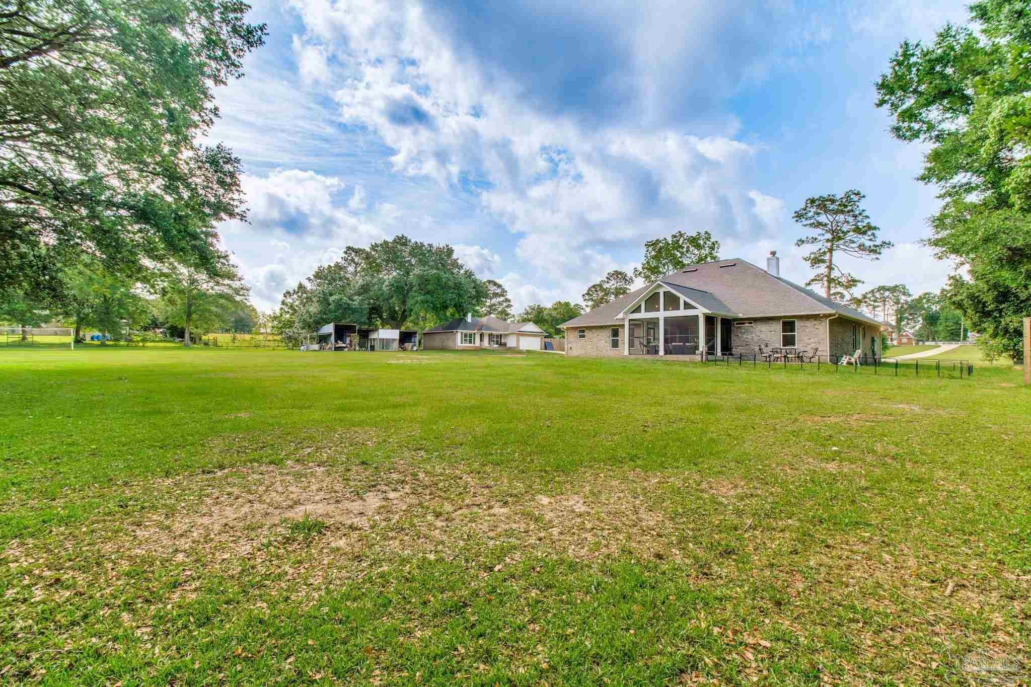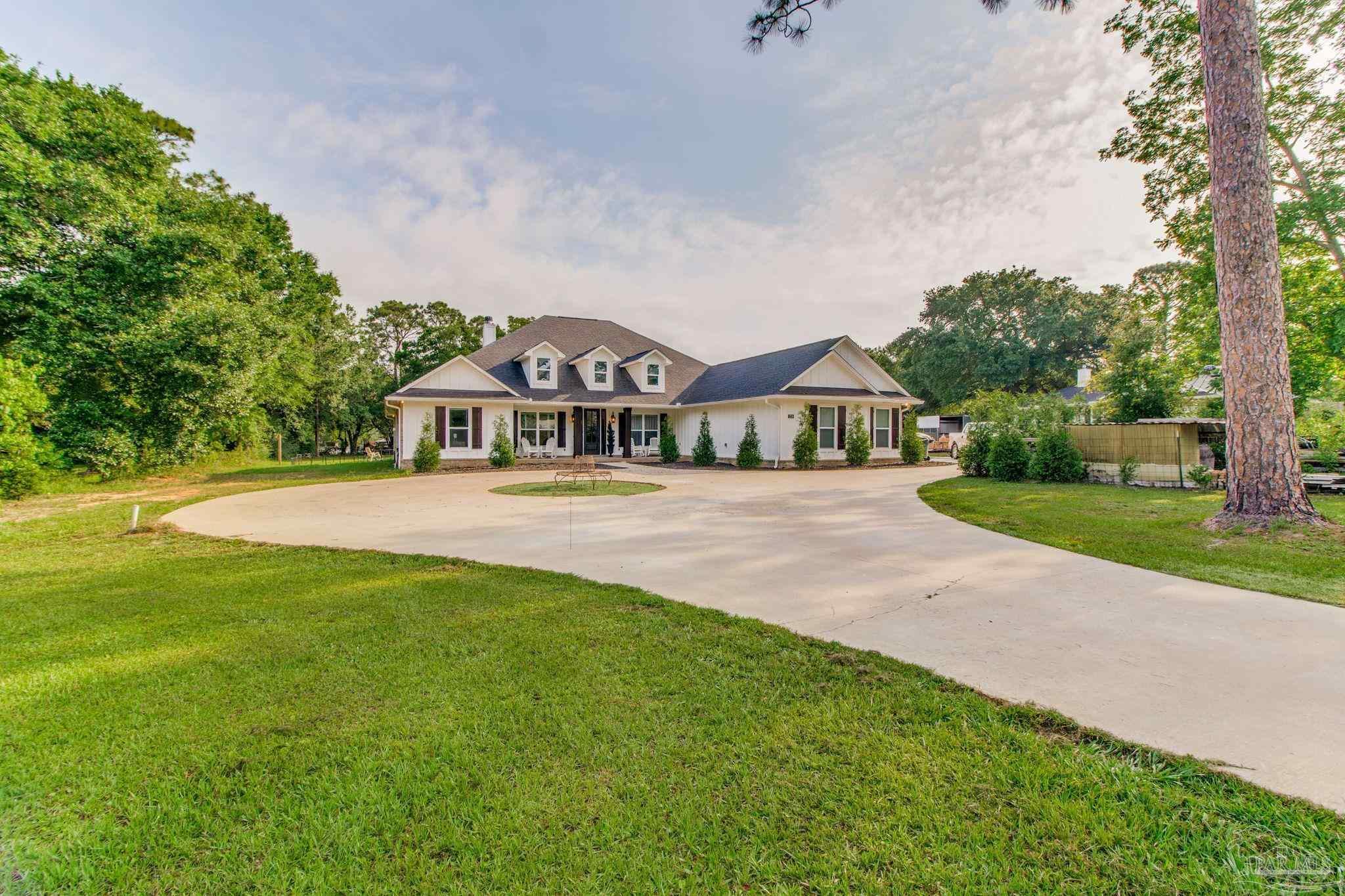 Muti-generational Homestead Estate! This unique property is less than 2 years old, located on 3 acres, and close to everything convenient along the Nine Mile corridor. Features to note include underground utilities, available fiber-optics, no carpet, no HOA, three walk-in closets in primary bedroom and bath, and full guest home which includes an extra 2 car garage! The main house contains 5 bedrooms plus an office, and 3 full bathrooms. The kitchen has two ovens, and the island has double cabinet storage, and is a massive 12.5 feet in length! The walk-in pantry has a custom countertop, appliance shelves, and canning shelves. Three floor outlets add convenience no matter how you arrange the furniture in the great room while facing the TV and wood-burning fireplace. The vaulted ceiling is found both in the main area and the beautiful screen room. Unique features include 3 EV chargers in the three car garage, plumbing and water hook-up for an outdoor kitchen, 220 outlet for a hot tub on slab, 220 outlet for a future pool, and an RV electrical hook-up on the massive concrete parking area. The land features a tree house, 10 fruit trees, 4 blueberry bushes, a 4 bay open shed with three built-in separate chicken coops, and a circle drive with electricity in the center. As if this were not enough, there is a whole other 3 bedroom, 2 bath home that is handicap accessible with a zero entry shower and wide hallways, and screen porch out back, etc. Owner is agent so contact directly via text or contact yoiur preferred agent.