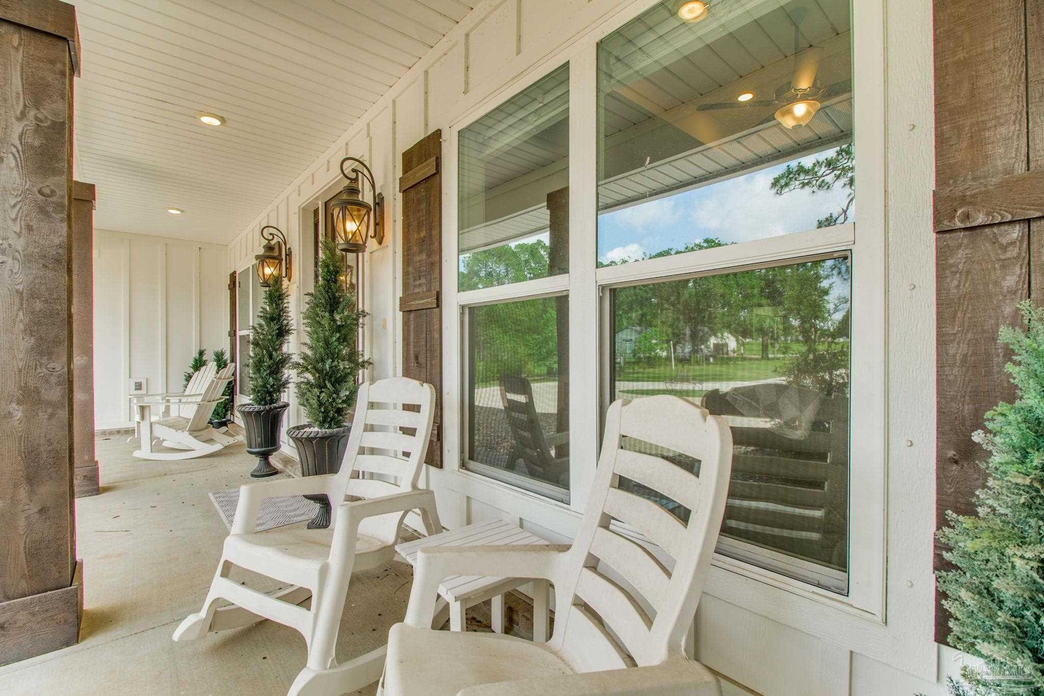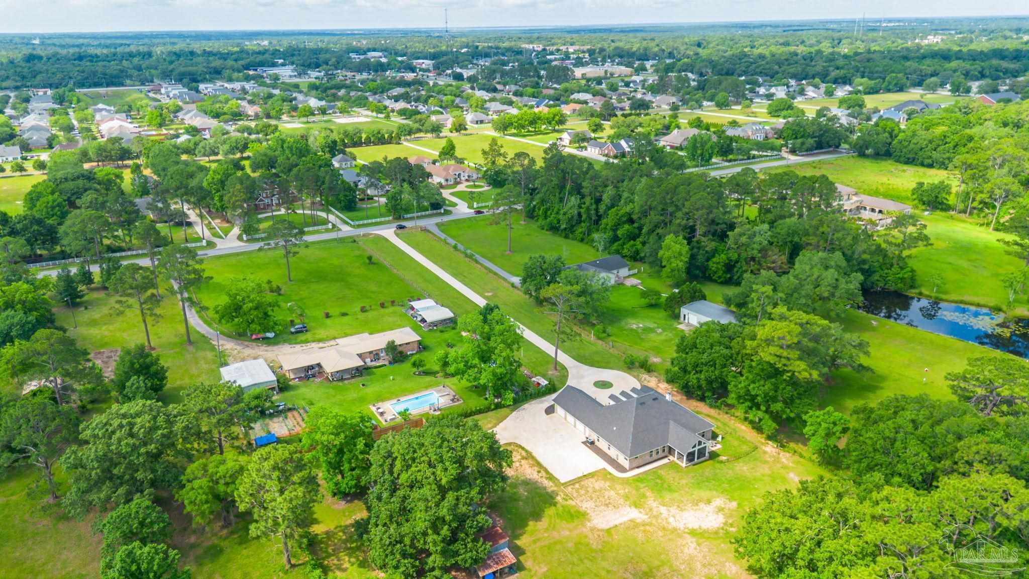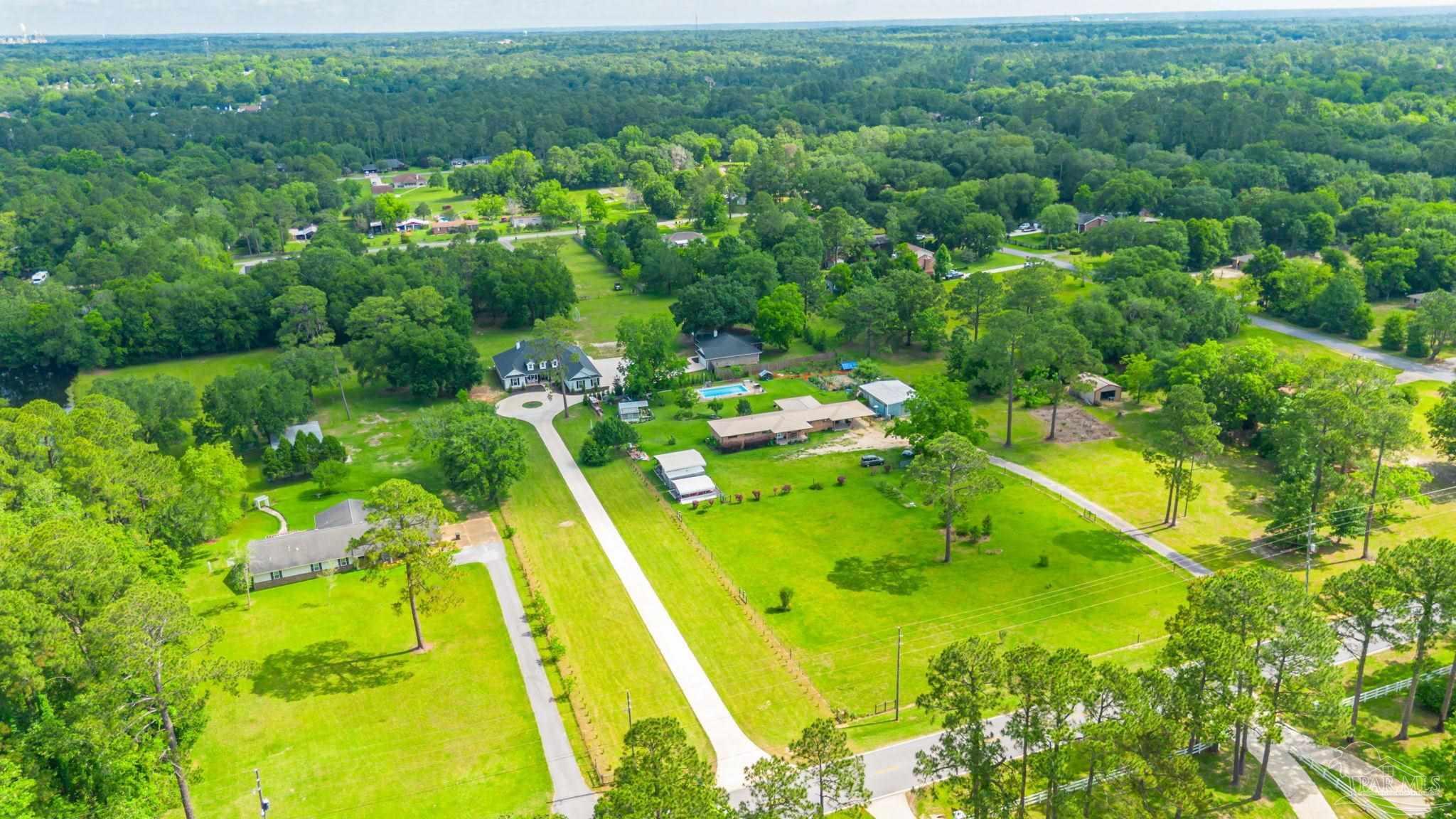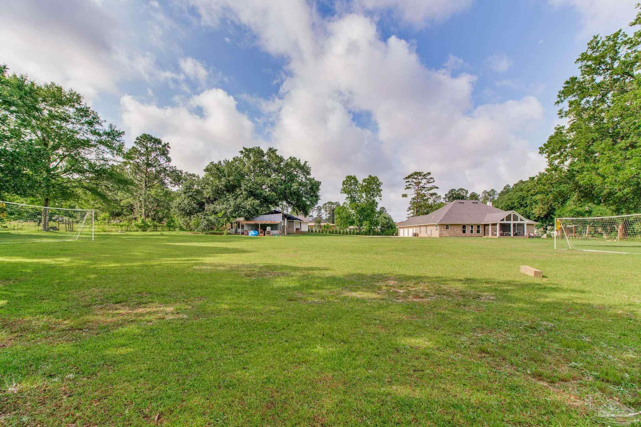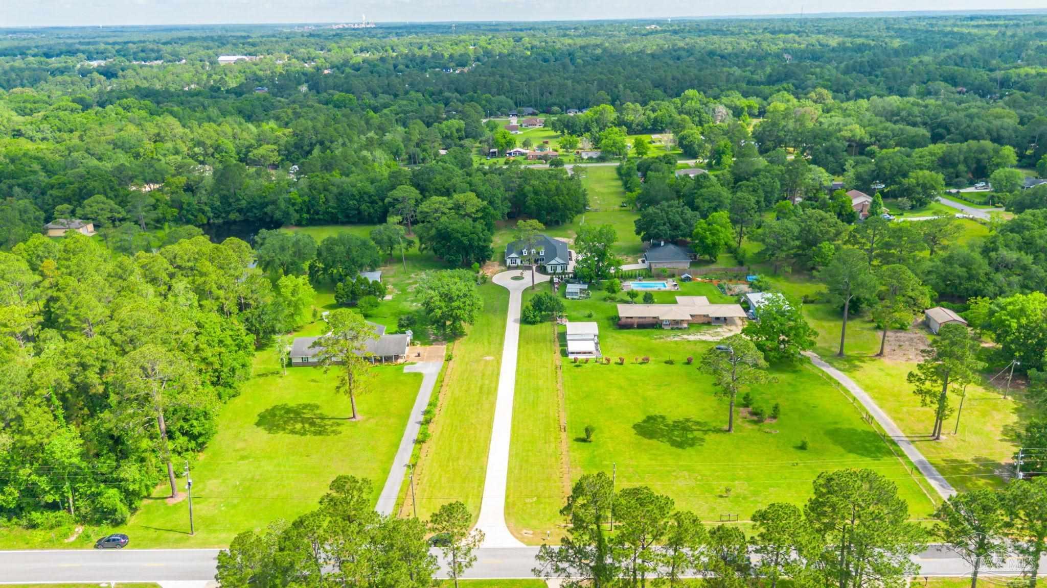 Muti-generational Homestead Estate! This unique property is less than 2 years old, located on 3 acres, and close to everything convenient along the Nine Mile corridor. Features to note include underground utilities, available fiber-optics, no carpet, no HOA, three walk-in closets in primary bedroom and bath, and full guest home which includes an extra 2 car garage! The main house contains 5 bedrooms plus an office, and 3 full bathrooms. The kitchen has two ovens, and the island has double cabinet storage, and is a massive 12.5 feet in length! The walk-in pantry has a custom countertop, appliance shelves, and canning shelves. Three floor outlets add convenience no matter how you arrange the furniture in the great room while facing the TV and wood-burning fireplace. The vaulted ceiling is found both in the main area and the beautiful screen room. Unique features include 3 EV chargers in the three car garage, plumbing and water hook-up for an outdoor kitchen, 220 outlet for a hot tub on slab, 220 outlet for a future pool, and an RV electrical hook-up on the massive concrete parking area. The land features a tree house, 10 fruit trees, 4 blueberry bushes, a 4 bay open shed with three built-in separate chicken coops, and a circle drive with electricity in the center. As if this were not enough, there is a whole other 3 bedroom, 2 bath home that is handicap accessible with a zero entry shower and wide hallways, and screen porch out back, etc. Owner is agent so contact directly via text or contact yoiur preferred agent.