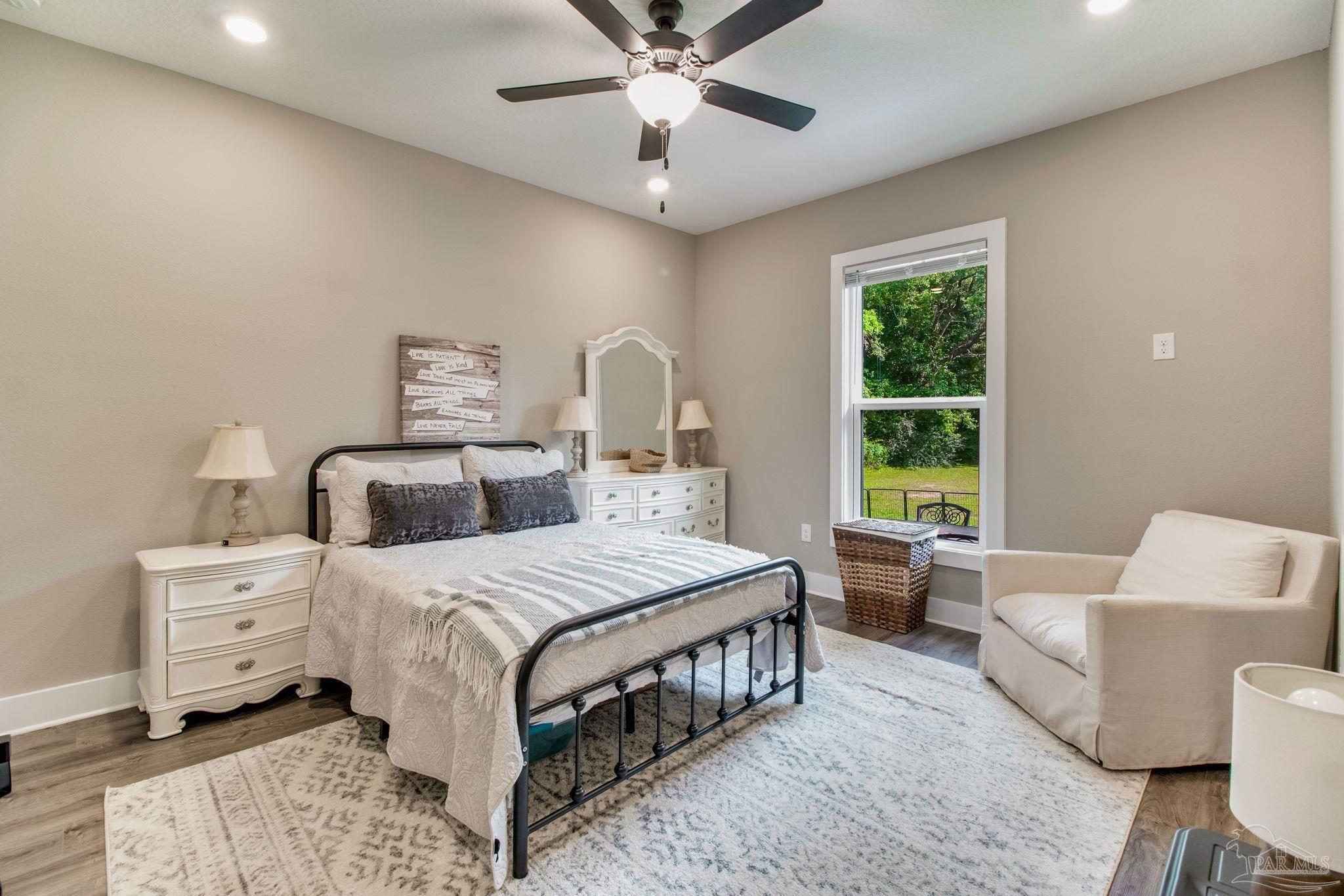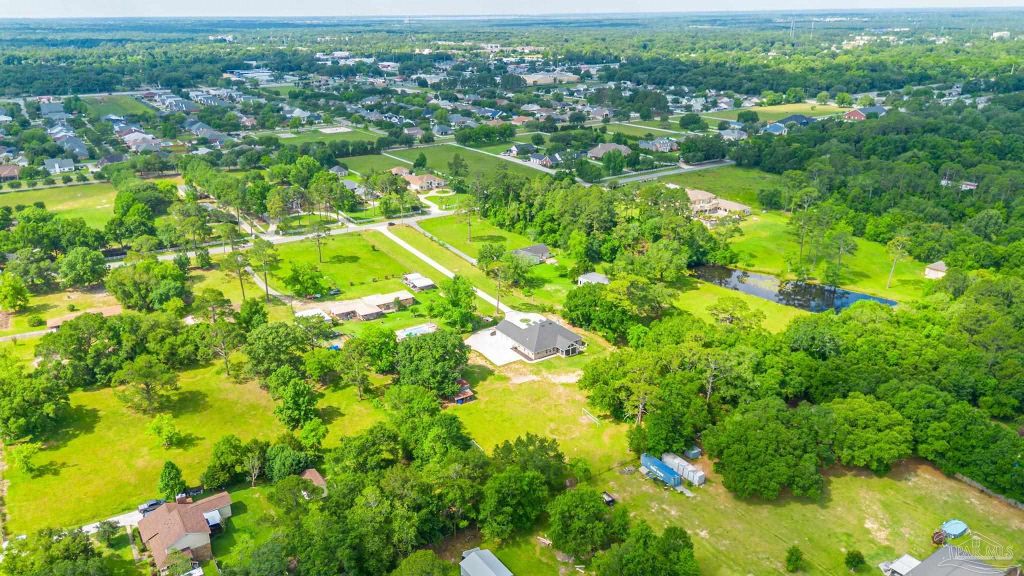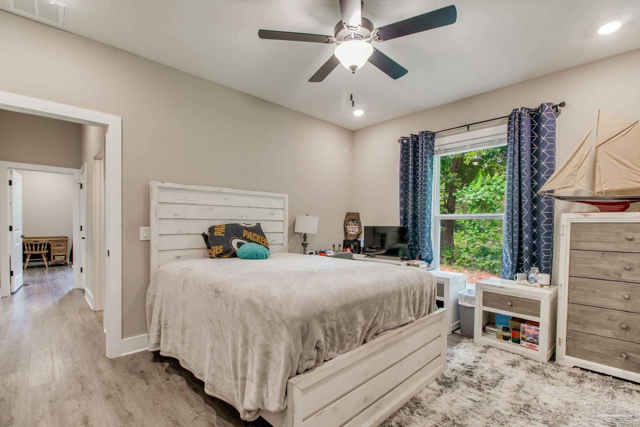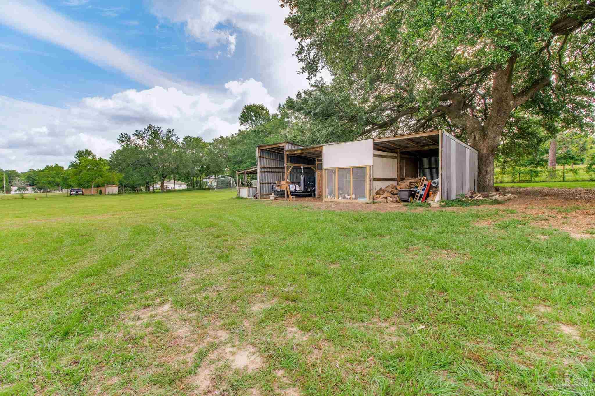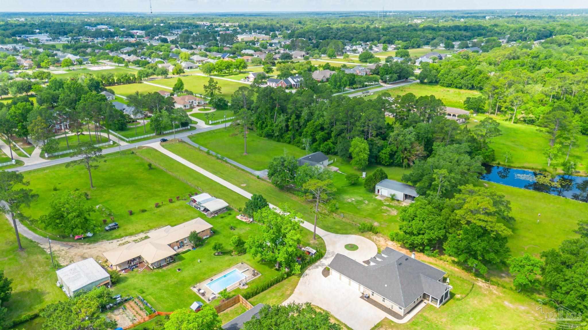 Muti-generational Homestead Estate! This unique property is less than 2 years old, located on 3 acres, and close to everything convenient along the Nine Mile corridor. Features to note include underground utilities, available fiber-optics, no carpet, no HOA, three walk-in closets in primary bedroom and bath, and full guest home which includes an extra 2 car garage! The main house contains 5 bedrooms plus an office, and 3 full bathrooms. The kitchen has two ovens, and the island has double cabinet storage, and is a massive 12.5 feet in length! The walk-in pantry has a custom countertop, appliance shelves, and canning shelves. Three floor outlets add convenience no matter how you arrange the furniture in the great room while facing the TV and wood-burning fireplace. The vaulted ceiling is found both in the main area and the beautiful screen room. Unique features include 3 EV chargers in the three car garage, plumbing and water hook-up for an outdoor kitchen, 220 outlet for a hot tub on slab, 220 outlet for a future pool, and an RV electrical hook-up on the massive concrete parking area. The land features a tree house, 10 fruit trees, 4 blueberry bushes, a 4 bay open shed with three built-in separate chicken coops, and a circle drive with electricity in the center. As if this were not enough, there is a whole other 3 bedroom, 2 bath home that is handicap accessible with a zero entry shower and wide hallways, and screen porch out back, etc. Owner is agent so contact directly via text or contact yoiur preferred agent.