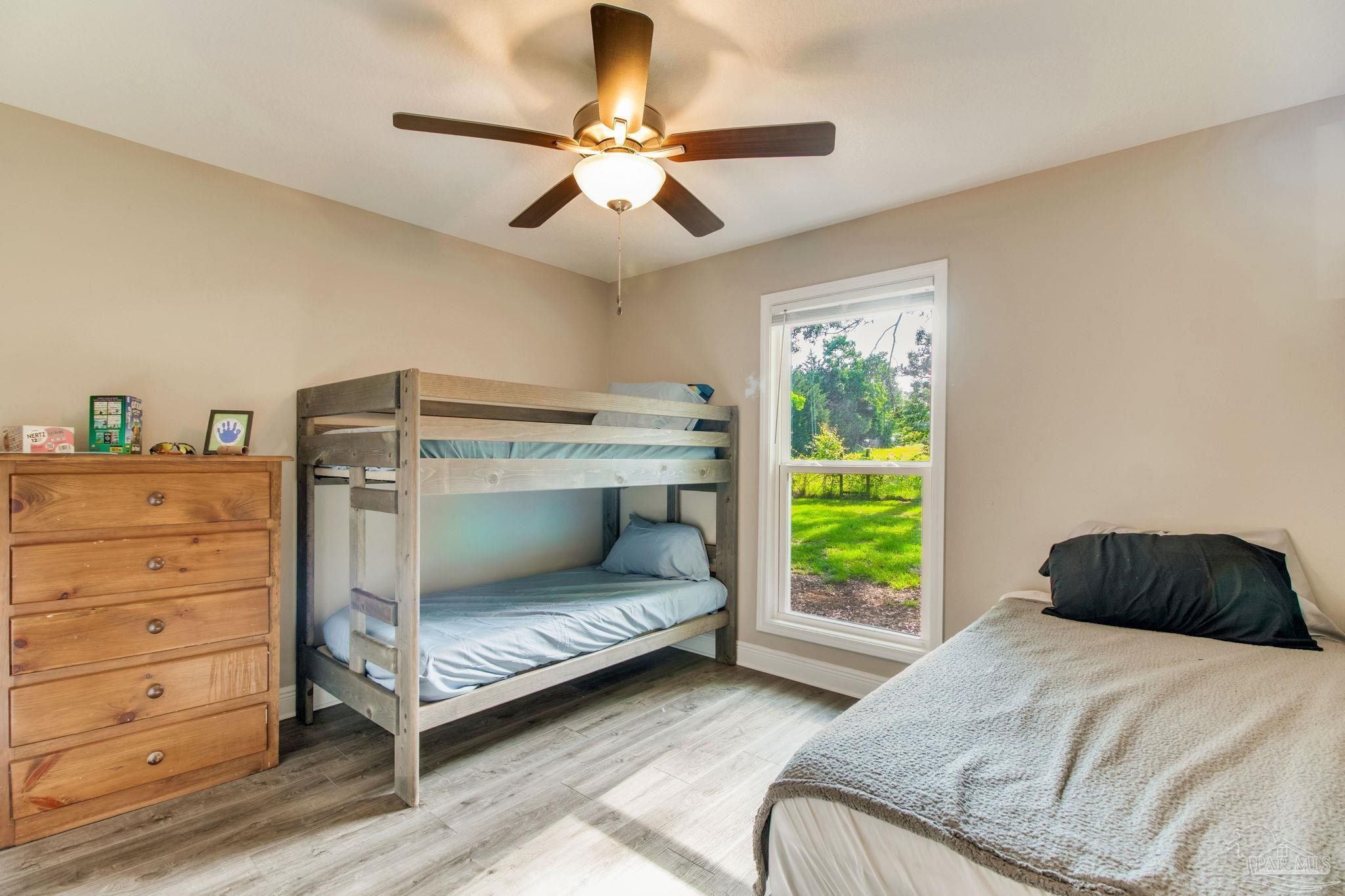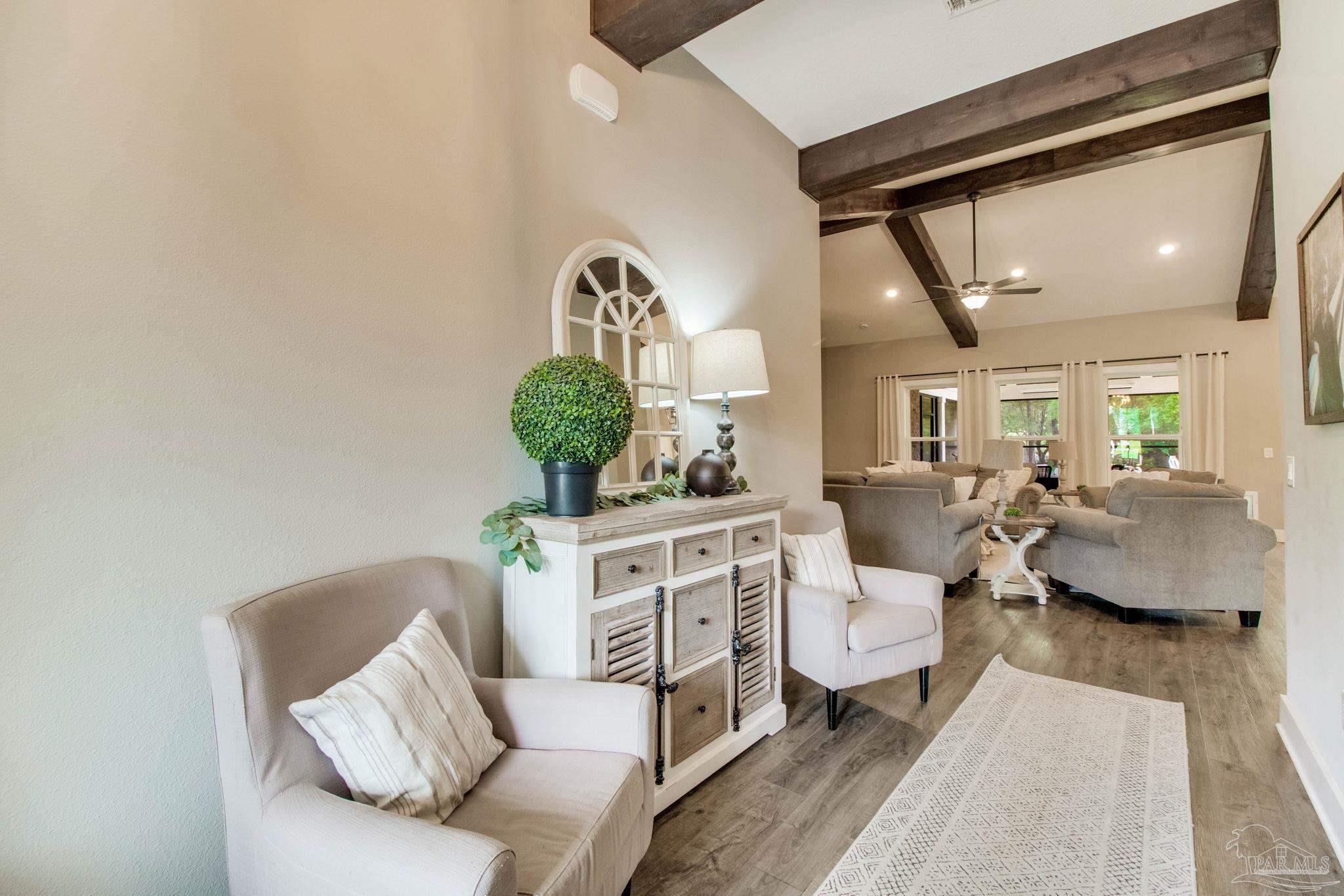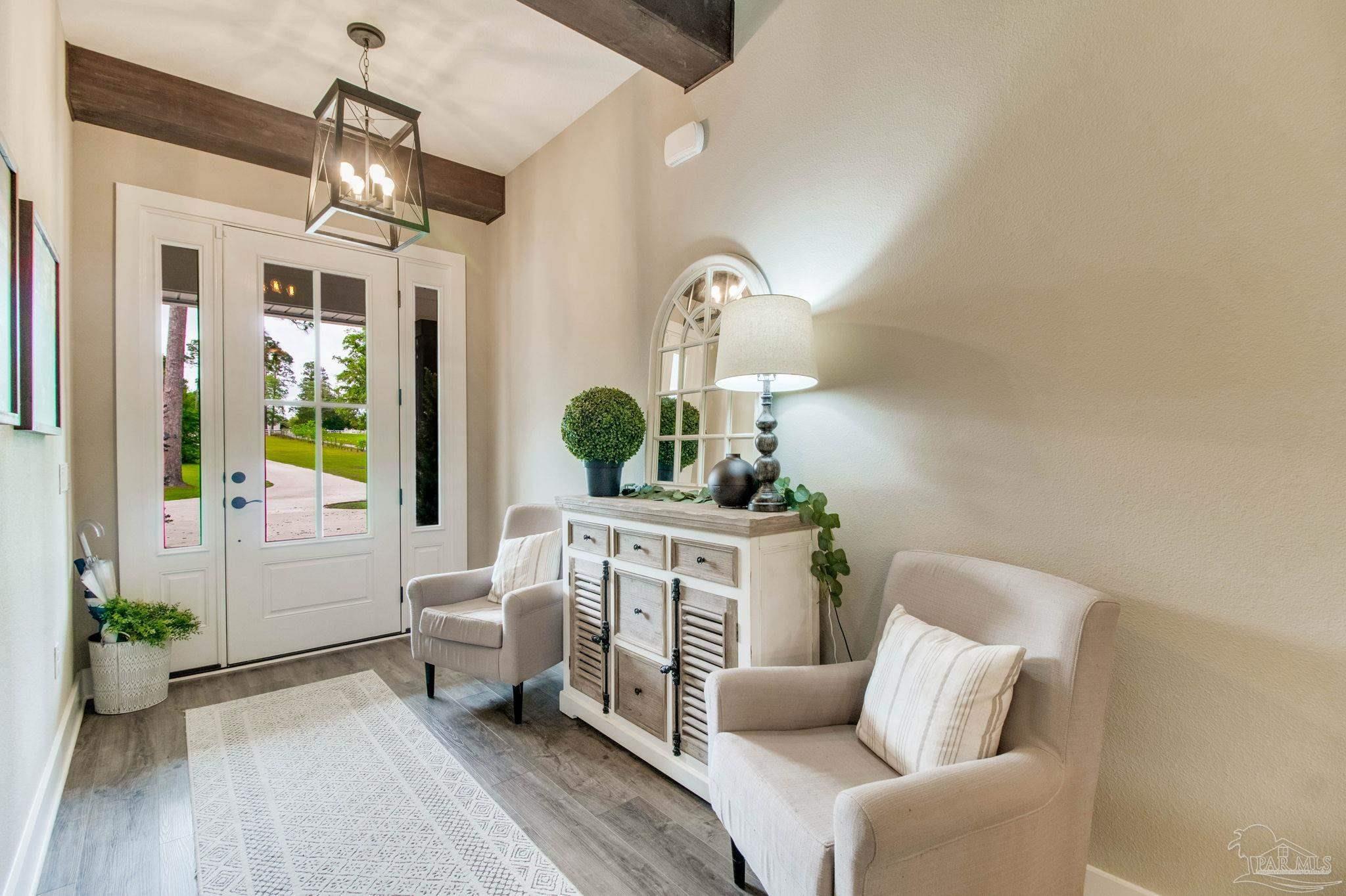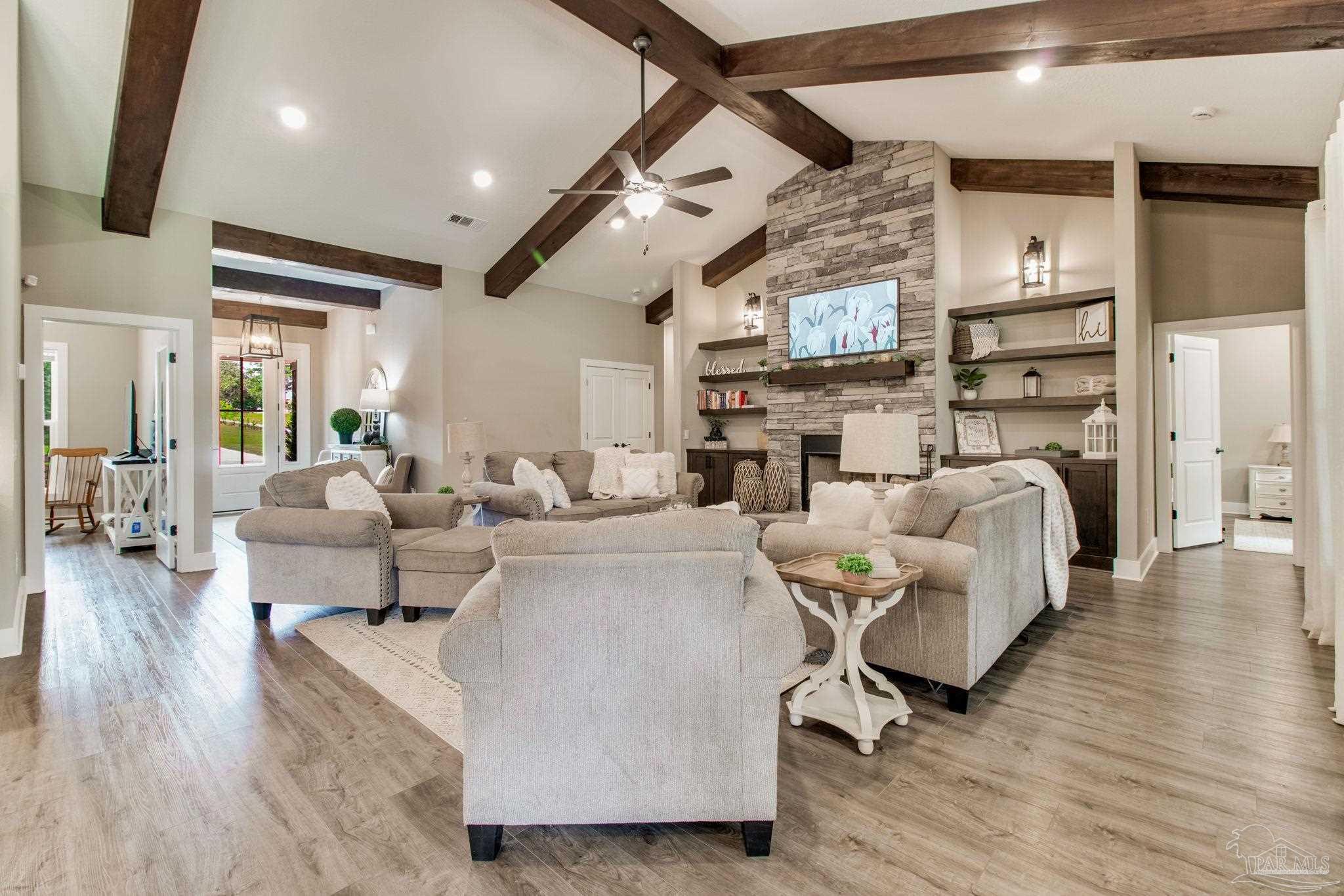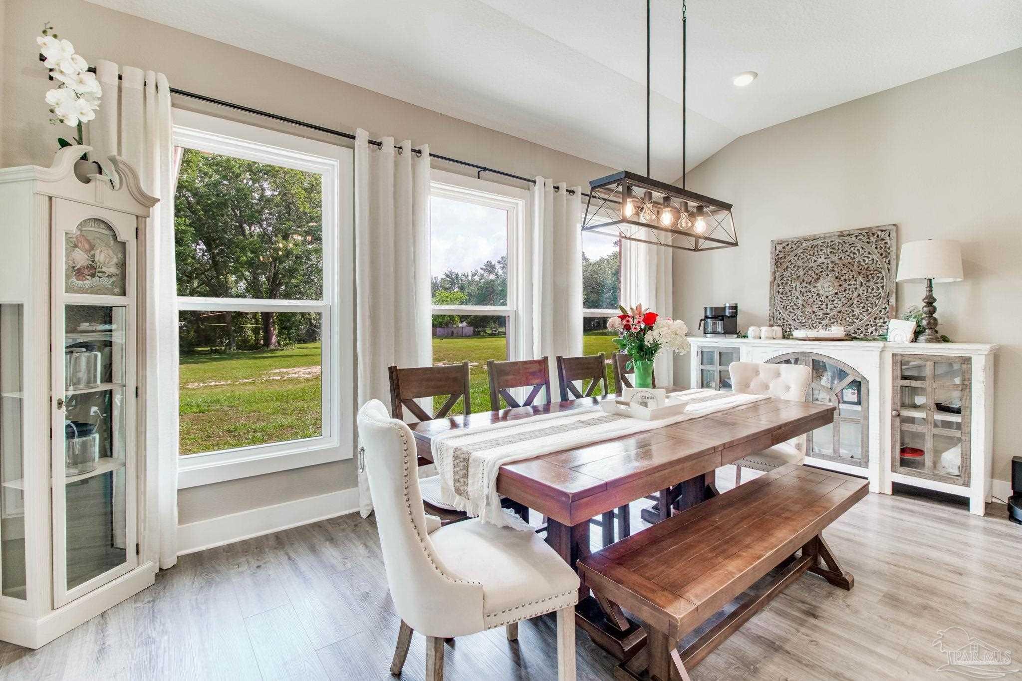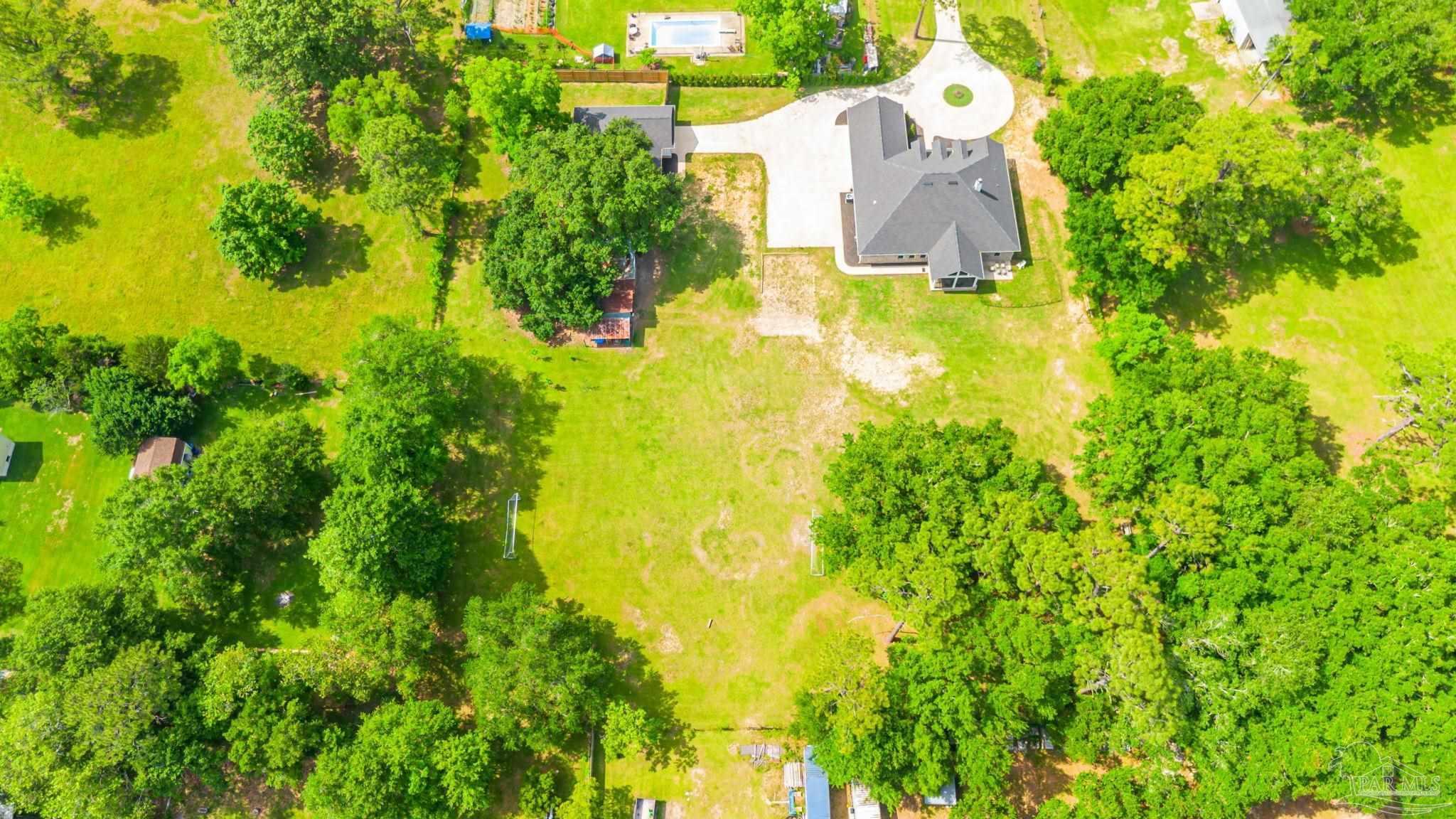 Muti-generational Homestead Estate! This unique property is less than 2 years old, located on 3 acres, and close to everything convenient along the Nine Mile corridor. Features to note include underground utilities, available fiber-optics, no carpet, no HOA, three walk-in closets in primary bedroom and bath, and full guest home which includes an extra 2 car garage! The main house contains 5 bedrooms plus an office, and 3 full bathrooms. The kitchen has two ovens, and the island has double cabinet storage, and is a massive 12.5 feet in length! The walk-in pantry has a custom countertop, appliance shelves, and canning shelves. Three floor outlets add convenience no matter how you arrange the furniture in the great room while facing the TV and wood-burning fireplace. The vaulted ceiling is found both in the main area and the beautiful screen room. Unique features include 3 EV chargers in the three car garage, plumbing and water hook-up for an outdoor kitchen, 220 outlet for a hot tub on slab, 220 outlet for a future pool, and an RV electrical hook-up on the massive concrete parking area. The land features a tree house, 10 fruit trees, 4 blueberry bushes, a 4 bay open shed with three built-in separate chicken coops, and a circle drive with electricity in the center. As if this were not enough, there is a whole other 3 bedroom, 2 bath home that is handicap accessible with a zero entry shower and wide hallways, and screen porch out back, etc. Owner is agent so contact directly via text or contact yoiur preferred agent.