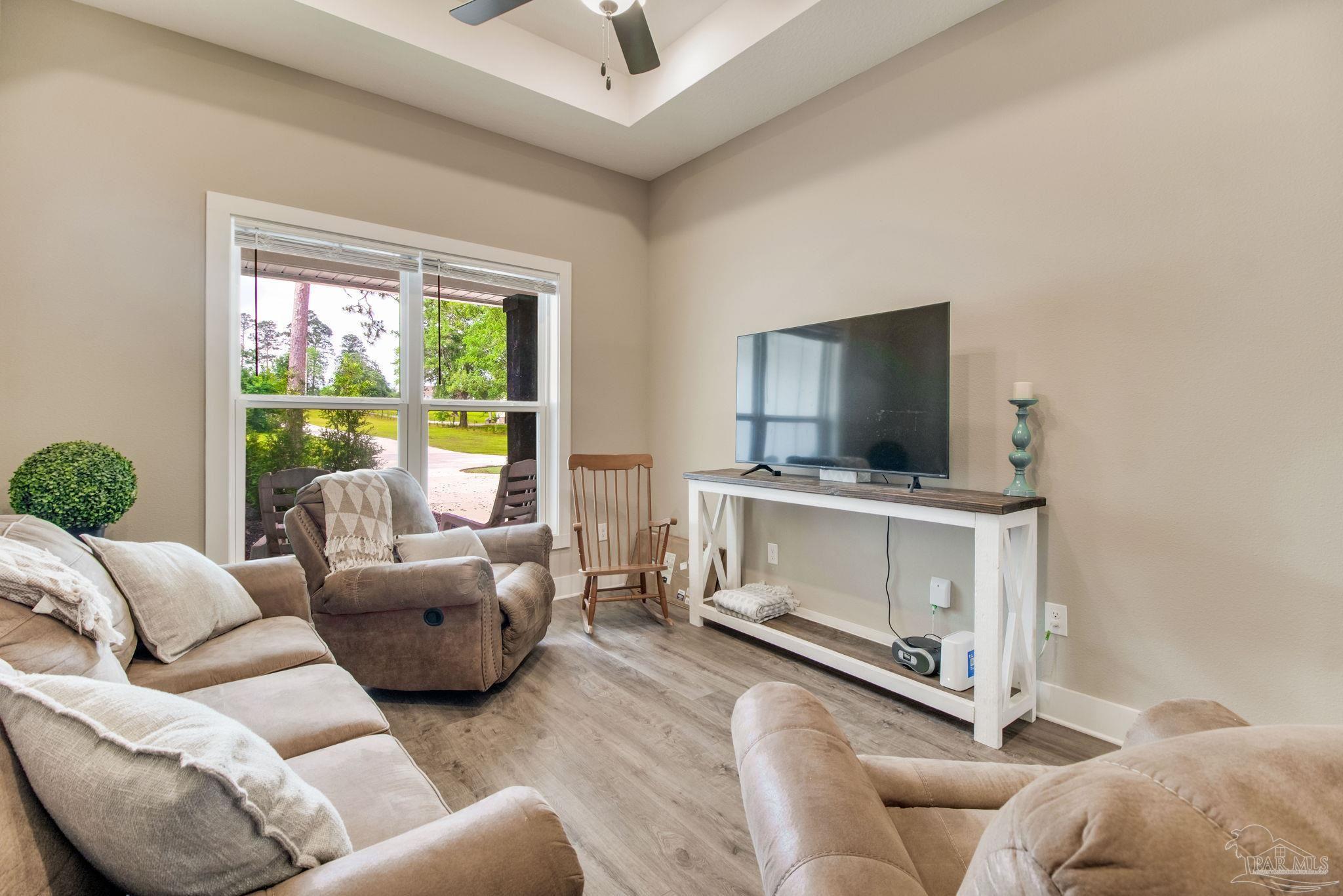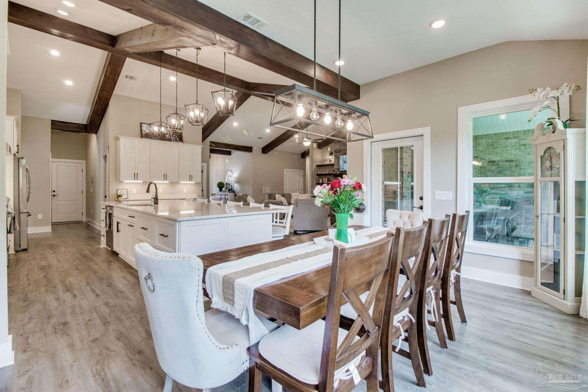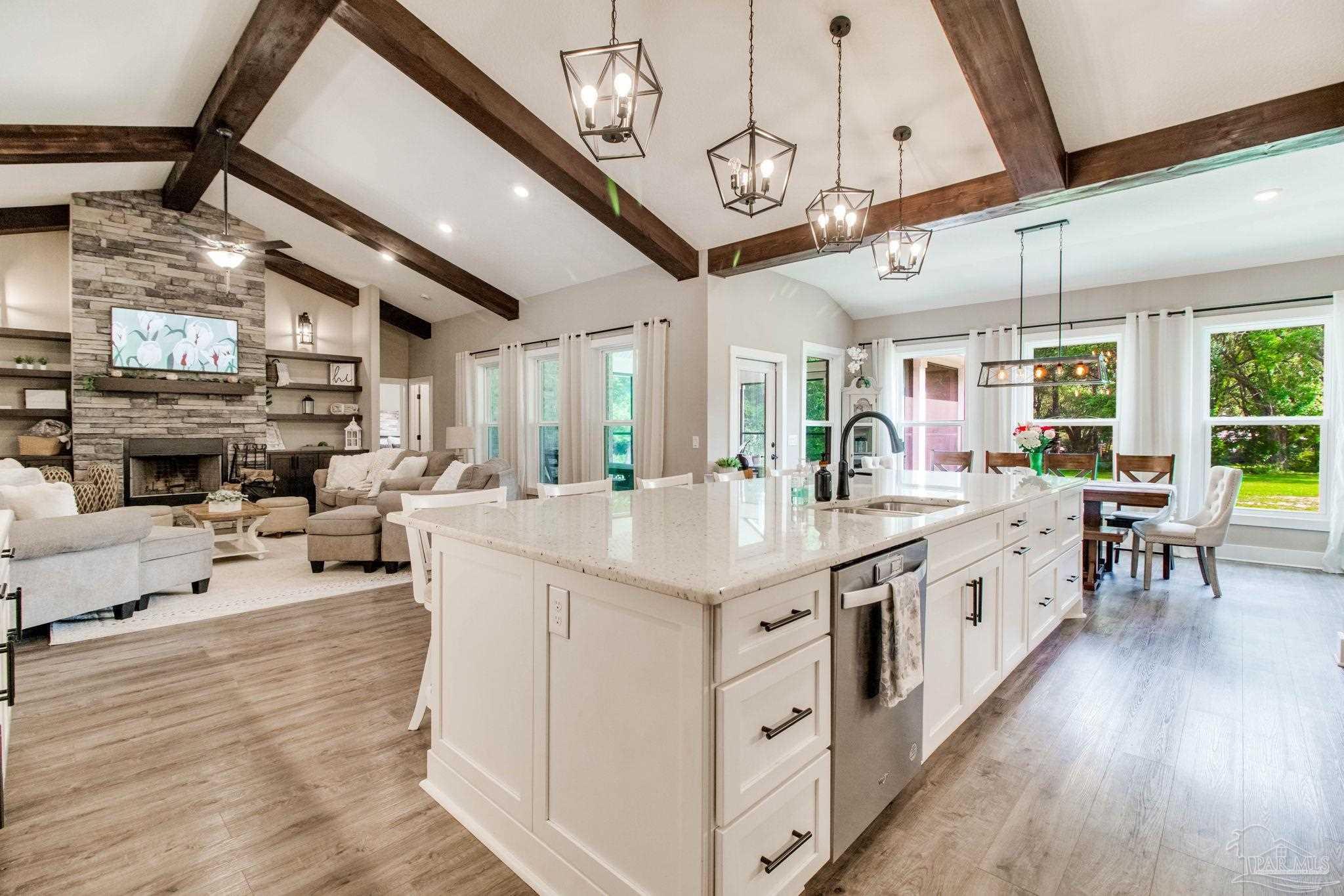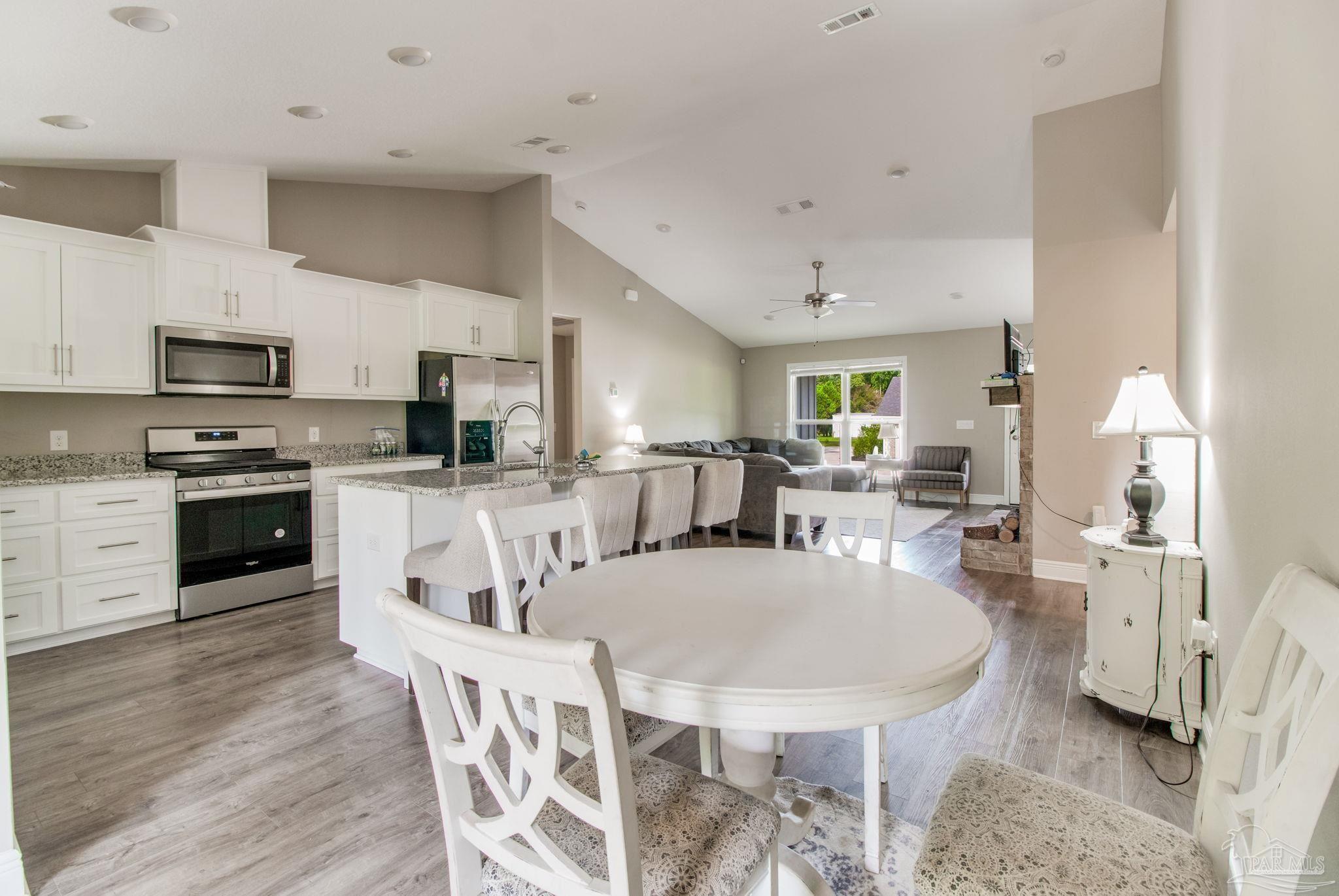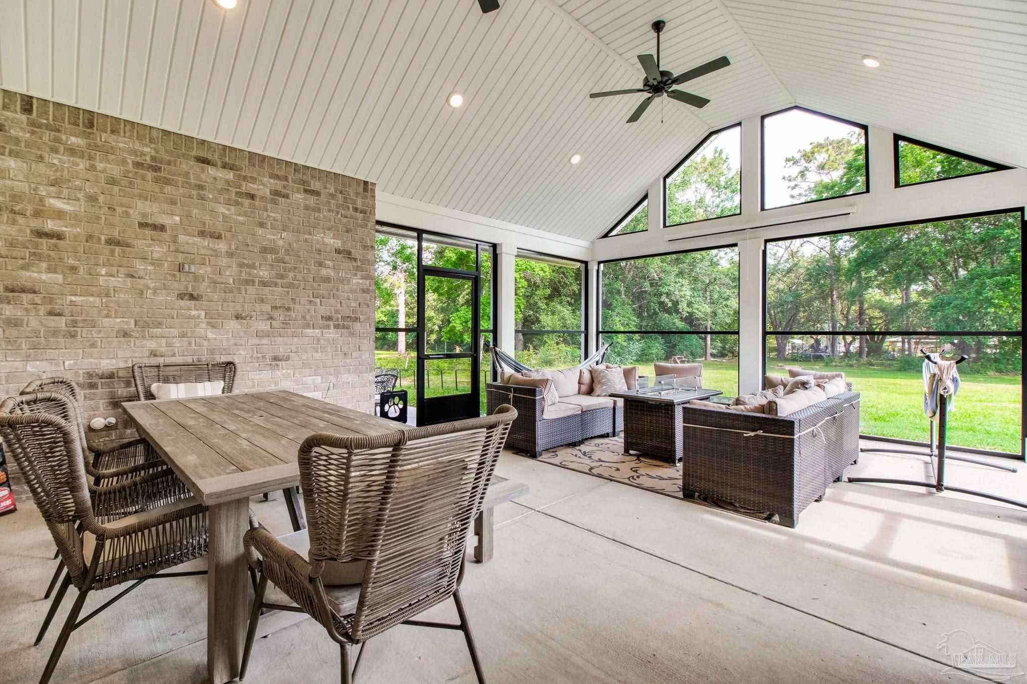 Muti-generational Homestead Estate! This unique property is less than 2 years old, located on 3 acres, and close to everything convenient along the Nine Mile corridor. Features to note include underground utilities, available fiber-optics, no carpet, no HOA, three walk-in closets in primary bedroom and bath, and full guest home which includes an extra 2 car garage! The main house contains 5 bedrooms plus an office, and 3 full bathrooms. The kitchen has two ovens, and the island has double cabinet storage, and is a massive 12.5 feet in length! The walk-in pantry has a custom countertop, appliance shelves, and canning shelves. Three floor outlets add convenience no matter how you arrange the furniture in the great room while facing the TV and wood-burning fireplace. The vaulted ceiling is found both in the main area and the beautiful screen room. Unique features include 3 EV chargers in the three car garage, plumbing and water hook-up for an outdoor kitchen, 220 outlet for a hot tub on slab, 220 outlet for a future pool, and an RV electrical hook-up on the massive concrete parking area. The land features a tree house, 10 fruit trees, 4 blueberry bushes, a 4 bay open shed with three built-in separate chicken coops, and a circle drive with electricity in the center. As if this were not enough, there is a whole other 3 bedroom, 2 bath home that is handicap accessible with a zero entry shower and wide hallways, and screen porch out back, etc. Owner is agent so contact directly via text or contact yoiur preferred agent.