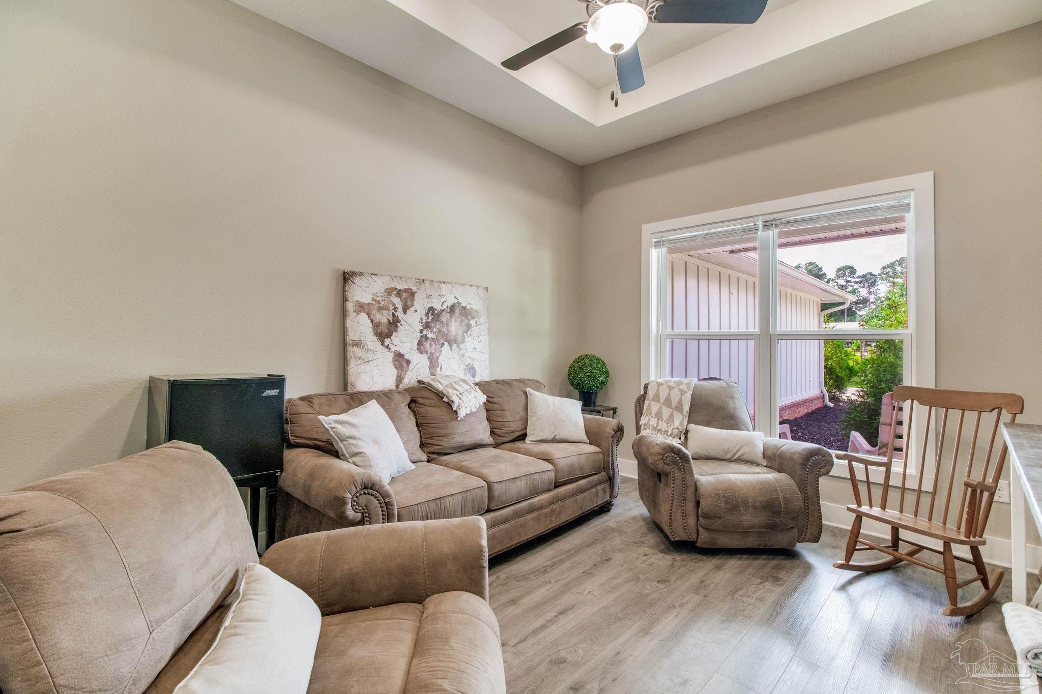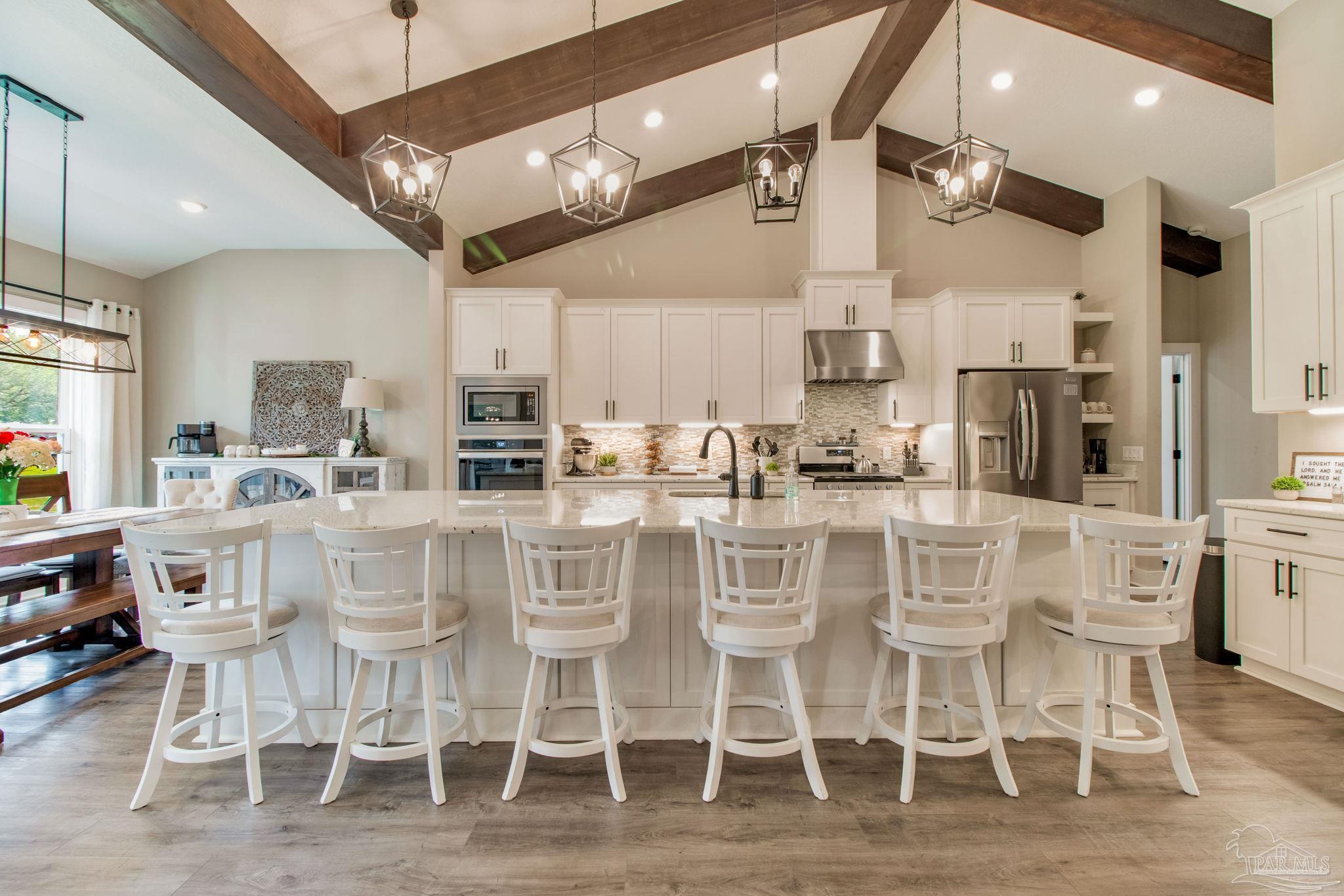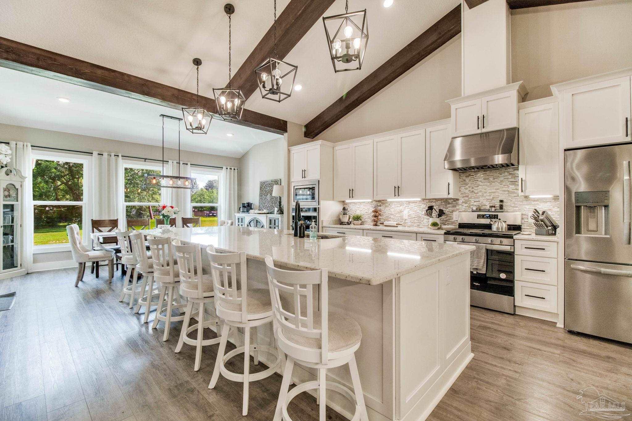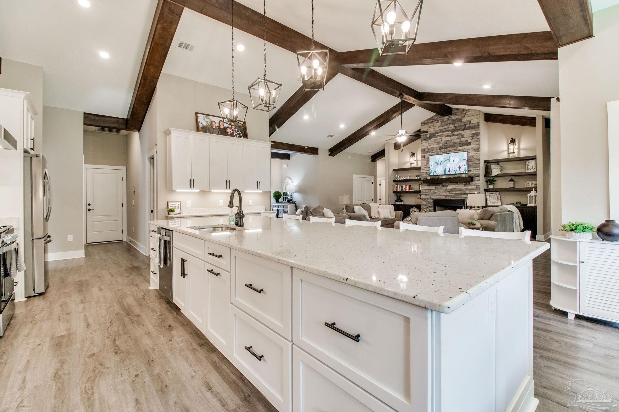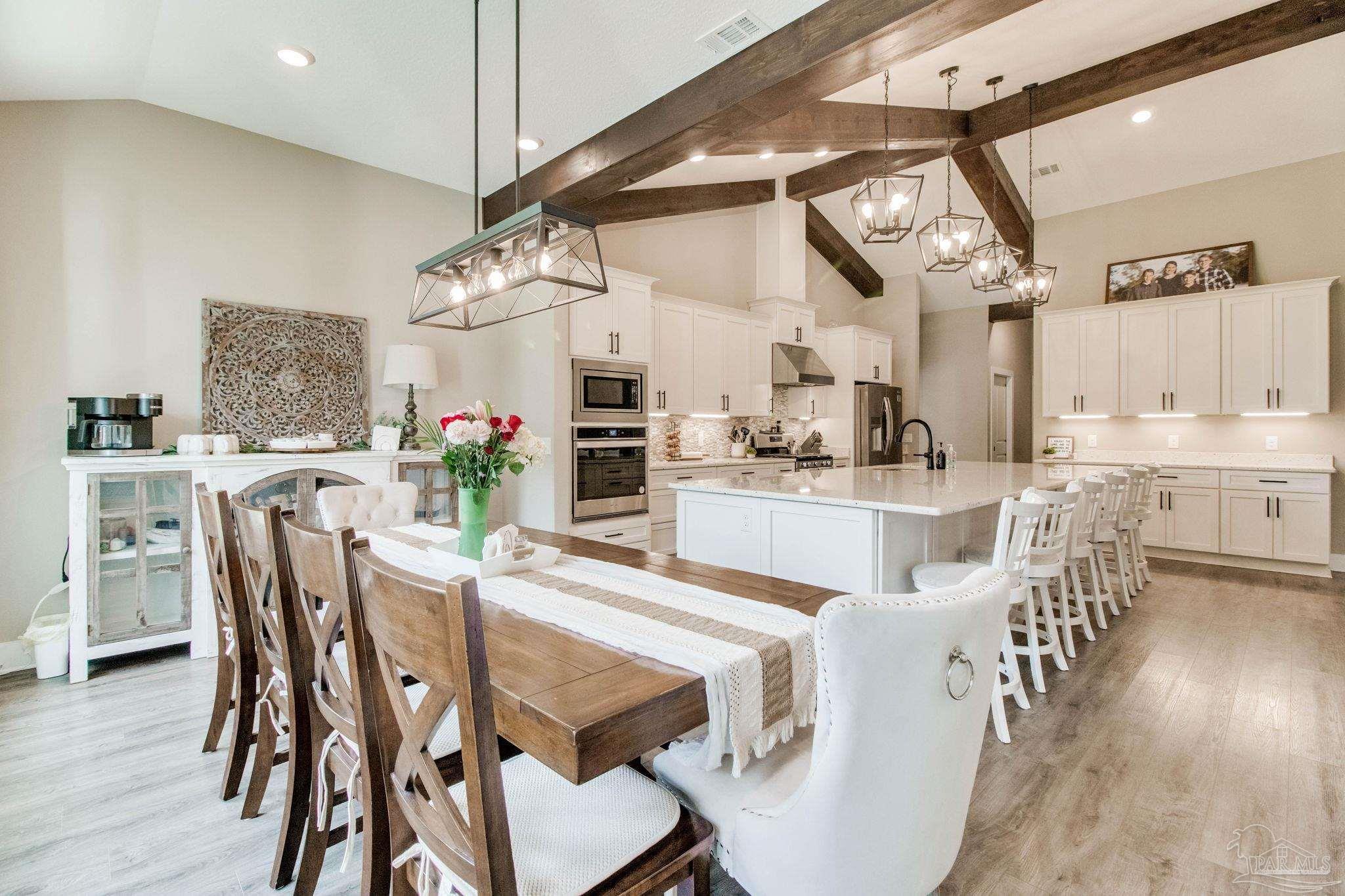 Muti-generational Homestead Estate! This unique property is less than 2 years old, located on 3 acres, and close to everything convenient along the Nine Mile corridor. Features to note include underground utilities, available fiber-optics, no carpet, no HOA, three walk-in closets in primary bedroom and bath, and full guest home which includes an extra 2 car garage! The main house contains 5 bedrooms plus an office, and 3 full bathrooms. The kitchen has two ovens, and the island has double cabinet storage, and is a massive 12.5 feet in length! The walk-in pantry has a custom countertop, appliance shelves, and canning shelves. Three floor outlets add convenience no matter how you arrange the furniture in the great room while facing the TV and wood-burning fireplace. The vaulted ceiling is found both in the main area and the beautiful screen room. Unique features include 3 EV chargers in the three car garage, plumbing and water hook-up for an outdoor kitchen, 220 outlet for a hot tub on slab, 220 outlet for a future pool, and an RV electrical hook-up on the massive concrete parking area. The land features a tree house, 10 fruit trees, 4 blueberry bushes, a 4 bay open shed with three built-in separate chicken coops, and a circle drive with electricity in the center. As if this were not enough, there is a whole other 3 bedroom, 2 bath home that is handicap accessible with a zero entry shower and wide hallways, and screen porch out back, etc. Owner is agent so contact directly via text or contact yoiur preferred agent.