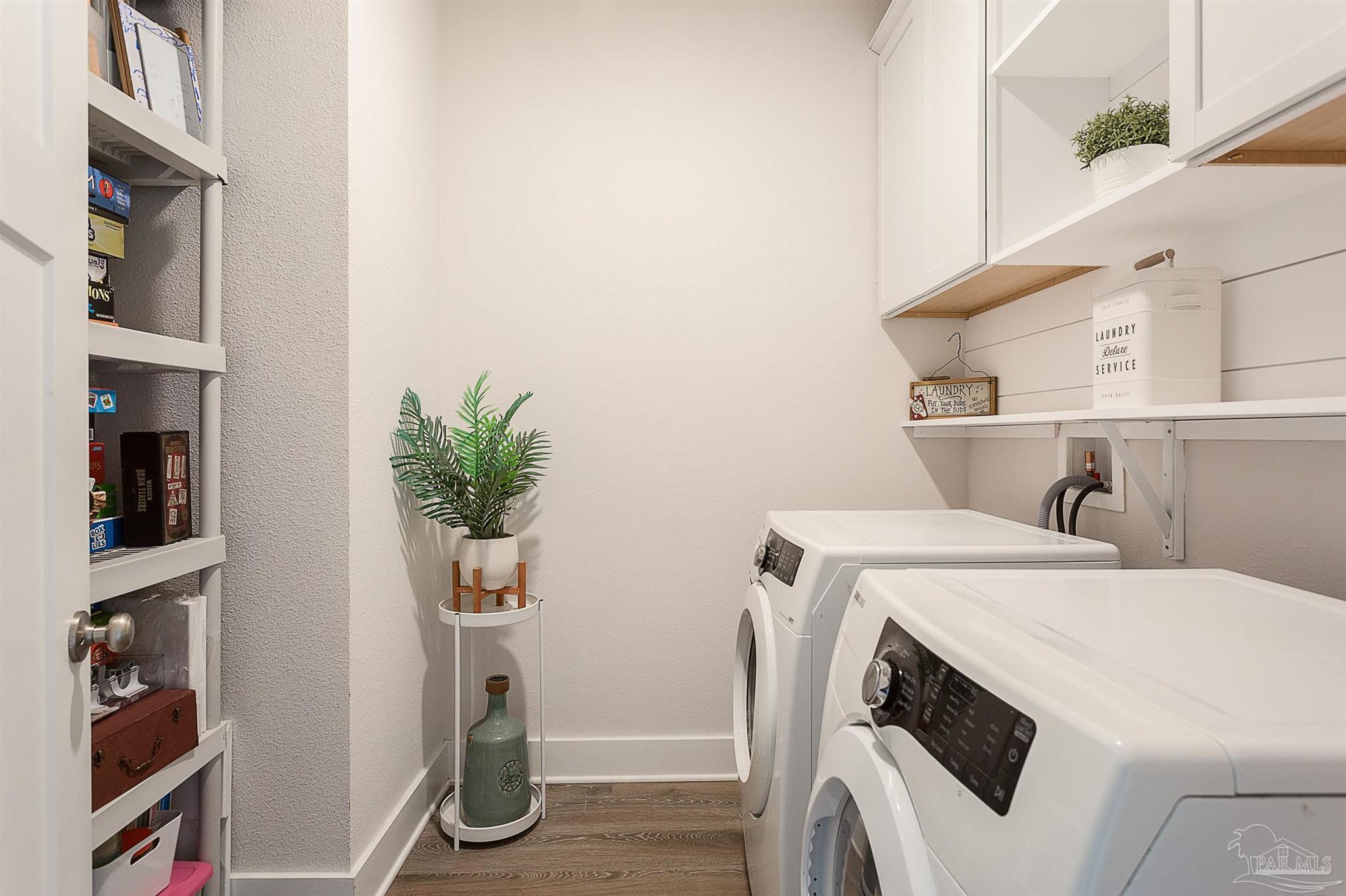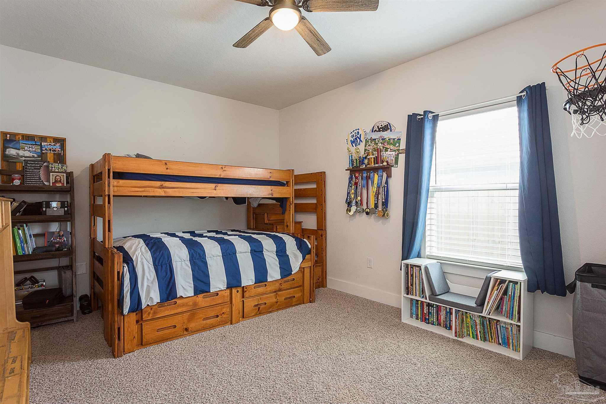 Discover this meticulously upgraded 6-bedroom, 3-bathroom single-story residence in the desirable Sailfish Pointe community. Built in 2021, this home offers over 3,000sqft of living space on a spacious 0.26-acre lot. Situated just minutes from the pristine sands of Pensacola Beach, it combines modern elegance with coastal convenience. Beautifully designed kitchen equipped with granite countertops, a large island, custom tile backsplash, and stainless steel appliances. The open floor plan features high ceilings, recessed lighting, crown molding, and tray ceilings, enhancing the home's airy ambiance. The primary room offers a walk-in closet, double vanity, soaking tub, separate shower, and granite counters. Exterior features include a covered patio-ideal for outdoor dining and entertaining. Fully Fenced Yard: Ensures privacy. Top-Rated Schools-located within the Gulf Breeze school district. Minutes from local shopping centers, dining options, and the public beach. This home seamlessly blends style, comfort, and functionality, making it a perfect choice for those seeking a coastal lifestyle with modern amenities.