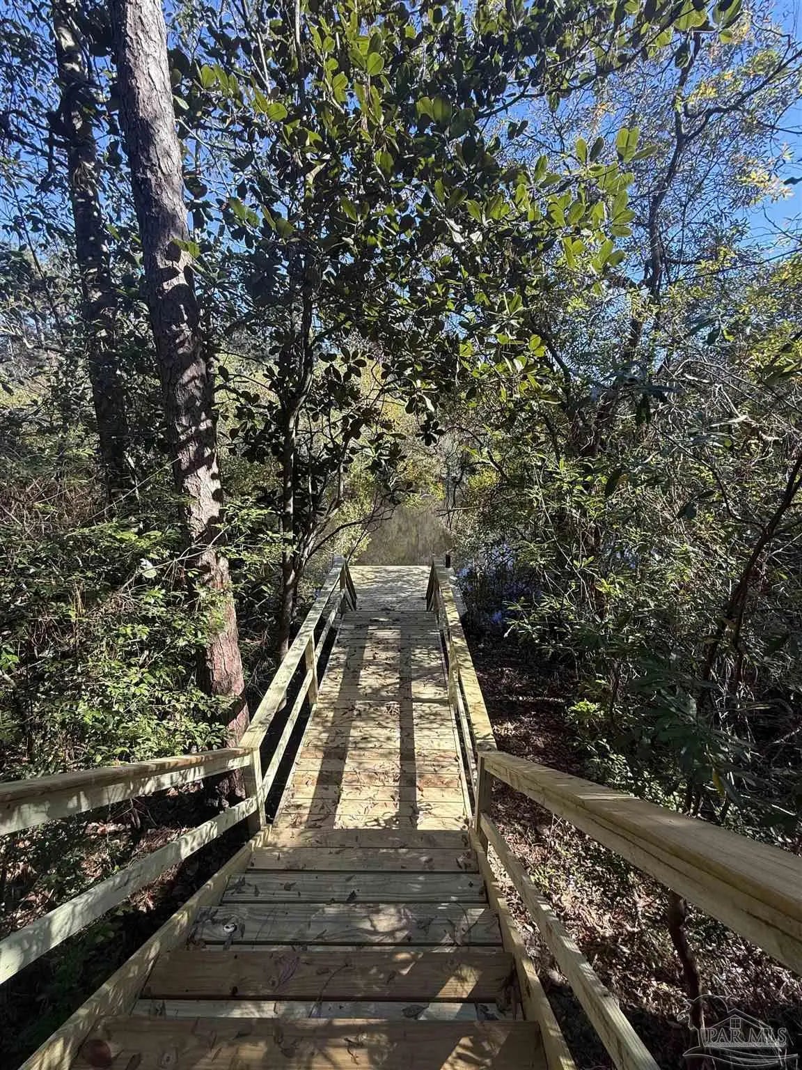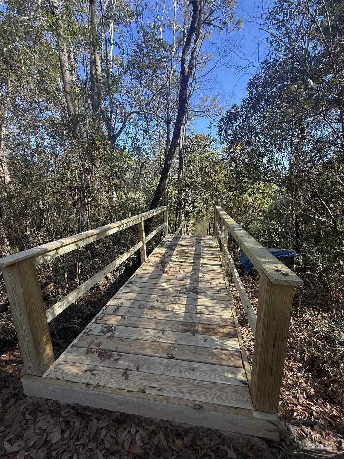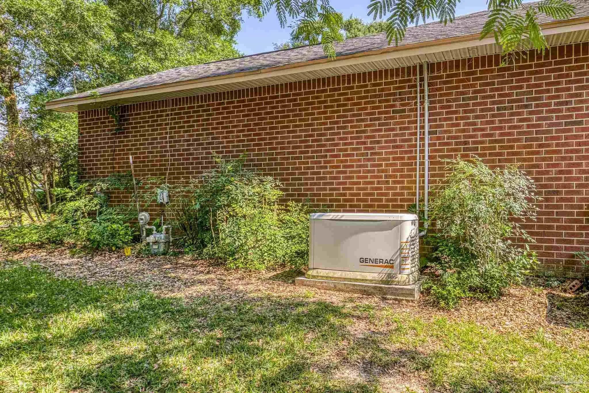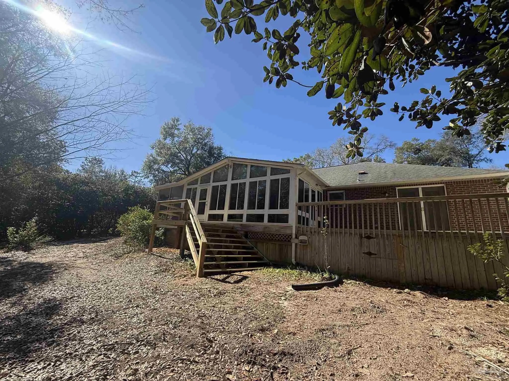 Set on just over an acre of peaceful, tree-lined land, this well-maintained 3-bedroom, 2-bathroom home offers space, privacy, and a functional layout. The split floor plan places the primary suite in its own wing off the kitchen, featuring a large ensuite with double vanities, a standing shower, custom-shelved walk-in closet, and sliding glass doors that open to a wooden deck overlooking the trees—fantastic for bird watching. Two additional bedrooms on the opposite side of the home share a full jack-and-jill bath and offer large closets. The semi-open kitchen includes a cozy breakfast nook with a wet bar and connects to a spacious living area with high ceilings. Double doors lead to a bright sunroom with its own mini-split A/C, providing year-round comfort and backyard views. At the rear of the lot, a manmade pond with a wooden walkway and small deck creates a tranquil spot for nature watching. A sprinkler system pulls from the pond to keep the landscape lush. The home features an attached two-car garage plus a detached garage ideal as a workshop or studio. Additional highlights include a whole-home generator (recently serviced and covered through 2025), a new water heater installed in 2024, septic with lift station, functional kitchen appliances, and freshly deep-cleaned carpets. This property combines comfort, practicality, and serene outdoor living—all in a private, natural setting.