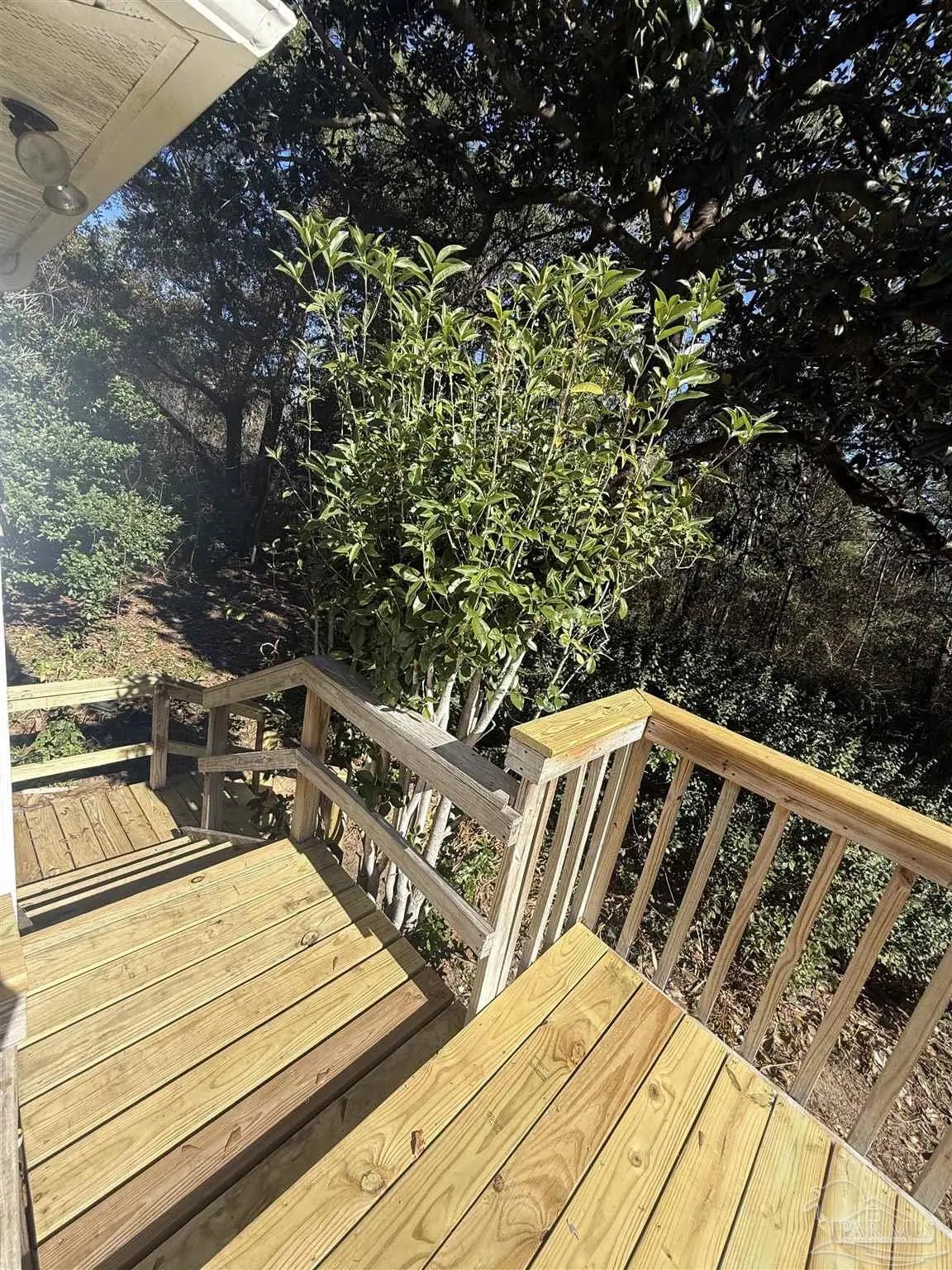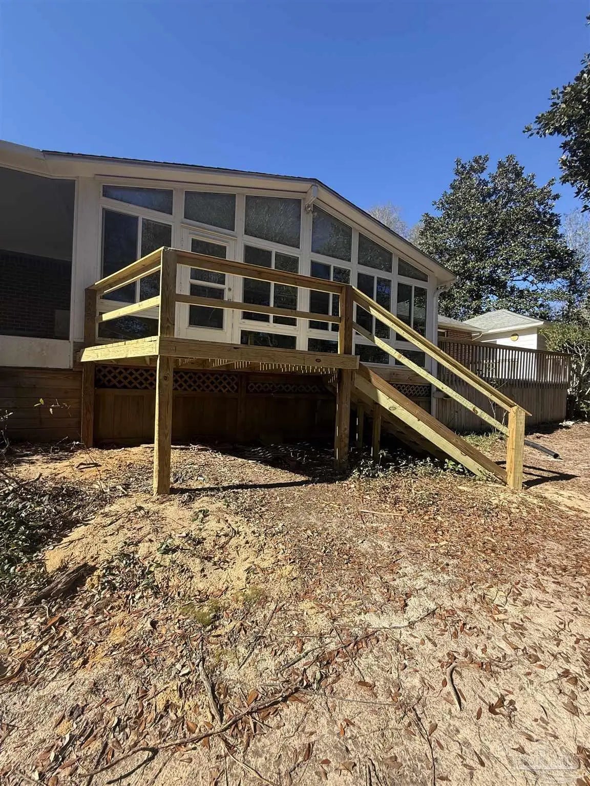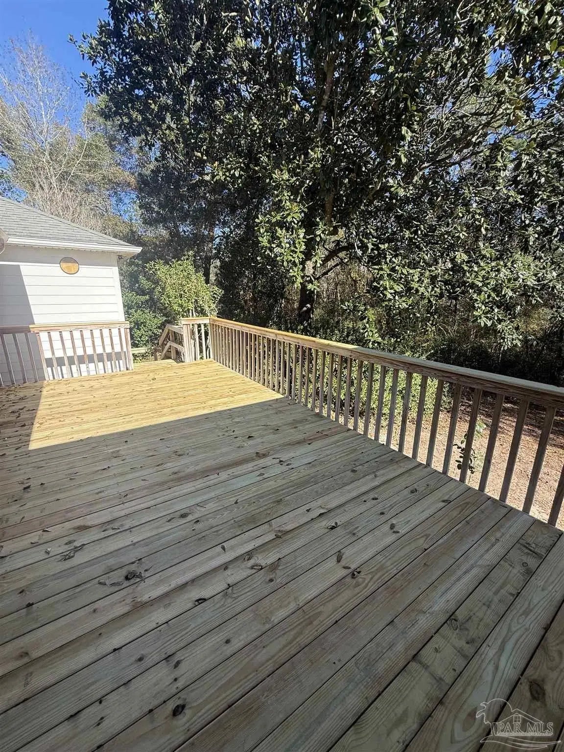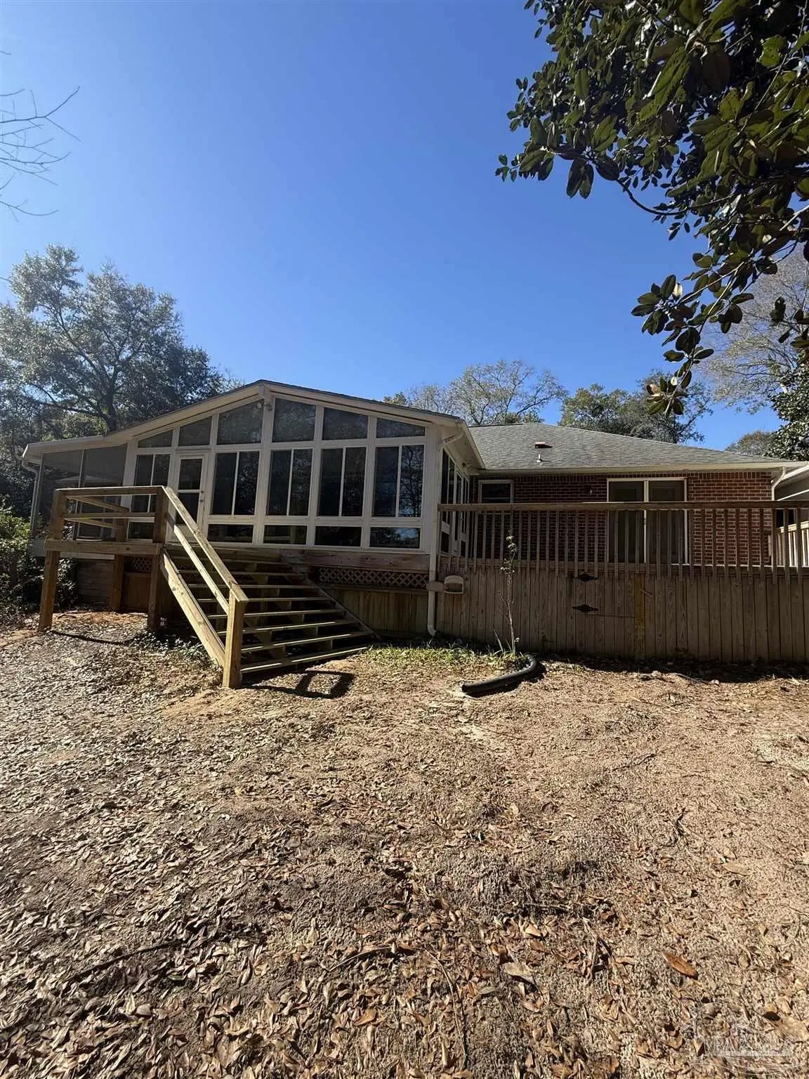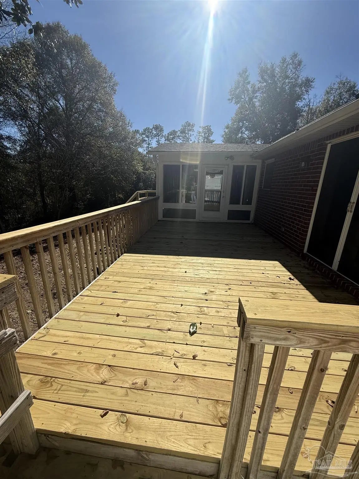 Set on just over an acre of peaceful, tree-lined land, this well-maintained 3-bedroom, 2-bathroom home offers space, privacy, and a functional layout. The split floor plan places the primary suite in its own wing off the kitchen, featuring a large ensuite with double vanities, a standing shower, custom-shelved walk-in closet, and sliding glass doors that open to a wooden deck overlooking the trees—fantastic for bird watching. Two additional bedrooms on the opposite side of the home share a full jack-and-jill bath and offer large closets. The semi-open kitchen includes a cozy breakfast nook with a wet bar and connects to a spacious living area with high ceilings. Double doors lead to a bright sunroom with its own mini-split A/C, providing year-round comfort and backyard views. At the rear of the lot, a manmade pond with a wooden walkway and small deck creates a tranquil spot for nature watching. A sprinkler system pulls from the pond to keep the landscape lush. The home features an attached two-car garage plus a detached garage ideal as a workshop or studio. Additional highlights include a whole-home generator (recently serviced and covered through 2025), a new water heater installed in 2024, septic with lift station, functional kitchen appliances, and freshly deep-cleaned carpets. This property combines comfort, practicality, and serene outdoor living—all in a private, natural setting.