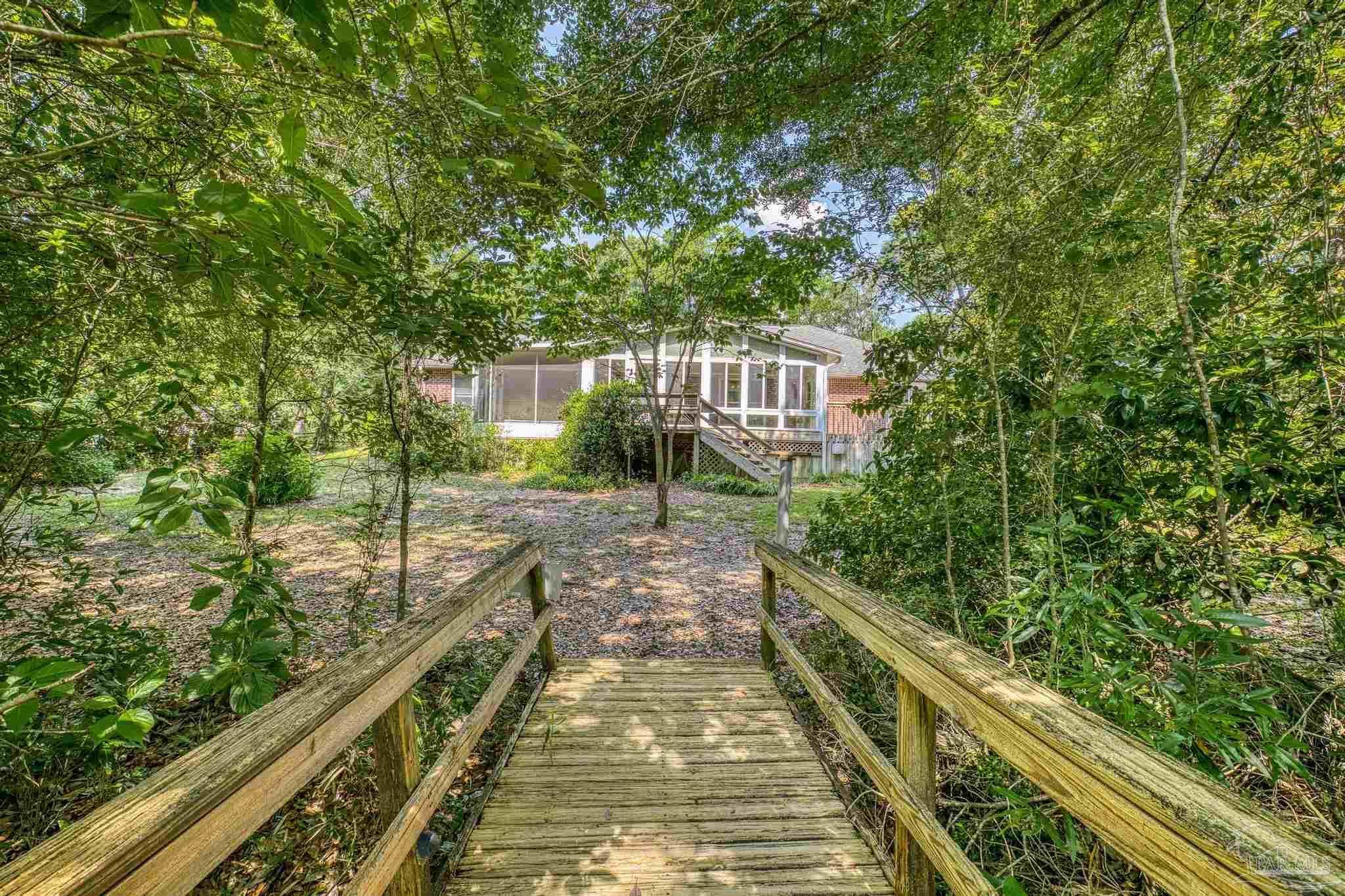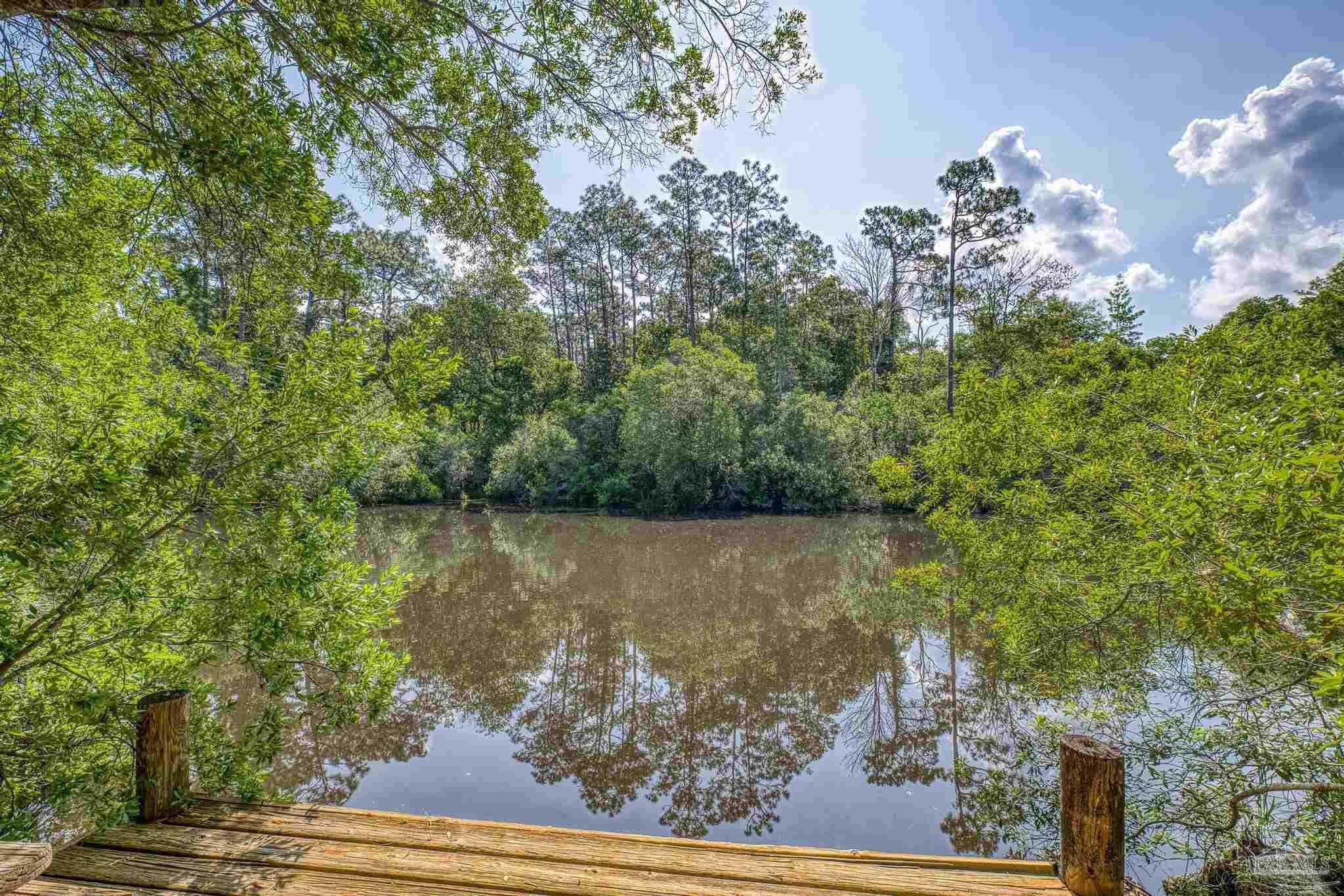 Set on just over an acre of peaceful, tree-lined land, this well-maintained 3-bedroom, 2-bathroom home offers space, privacy, and a functional layout. The split floor plan places the primary suite in its own wing off the kitchen, featuring a large ensuite with double vanities, a standing shower, custom-shelved walk-in closet, and sliding glass doors that open to a wooden deck overlooking the trees—fantastic for bird watching. Two additional bedrooms on the opposite side of the home share a full jack-and-jill bath and offer large closets. The semi-open kitchen includes a cozy breakfast nook with a wet bar and connects to a spacious living area with high ceilings. Double doors lead to a bright sunroom with its own mini-split A/C, providing year-round comfort and backyard views. At the rear of the lot, a manmade pond with a wooden walkway and small deck creates a tranquil spot for nature watching. A sprinkler system pulls from the pond to keep the landscape lush. The home features an attached two-car garage plus a detached garage ideal as a workshop or studio. Additional highlights include a whole-home generator (recently serviced and covered through 2025), a new water heater installed in 2024, septic with lift station, functional kitchen appliances, and freshly deep-cleaned carpets. This property combines comfort, practicality, and serene outdoor living—all in a private, natural setting.