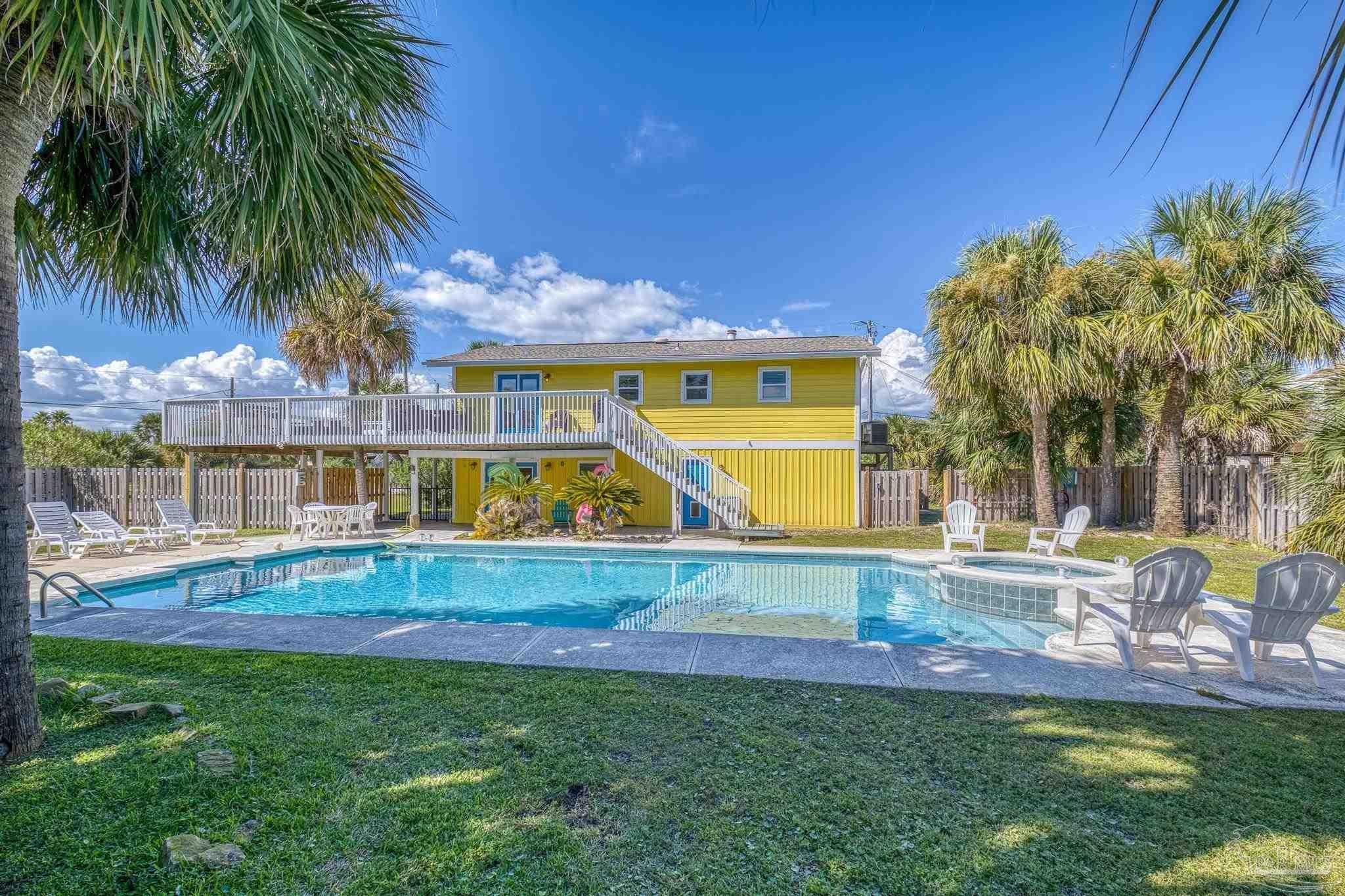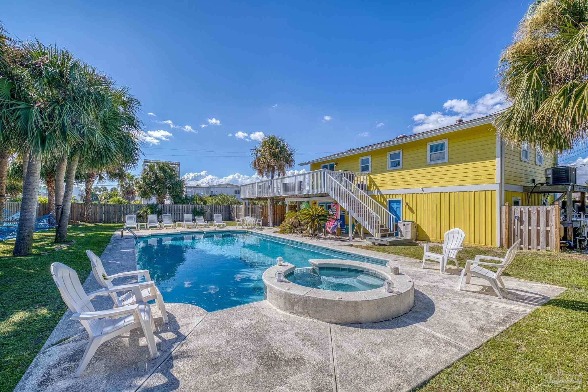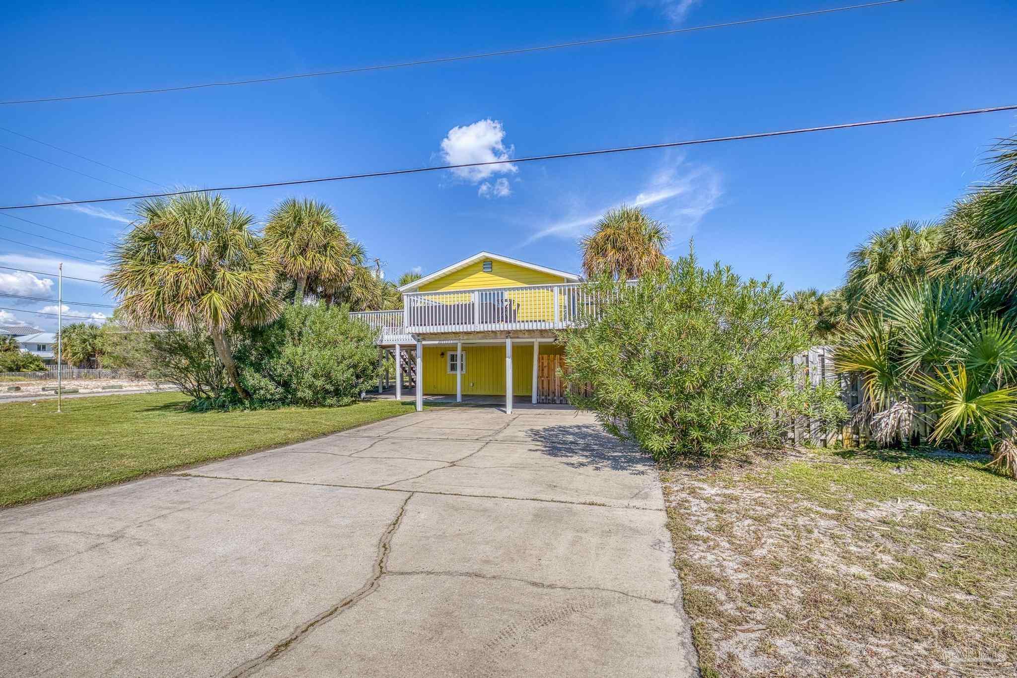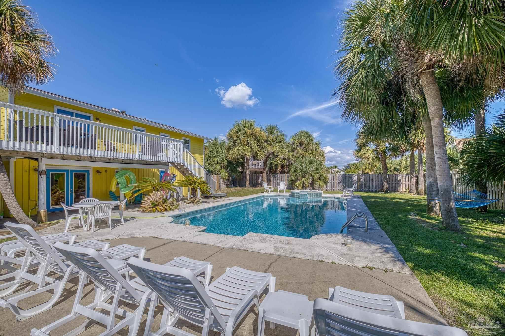 Welcome to Your Slice of Paradise! Get ready to soak up the sun and dive into the beach life in this dreamy two-story coastal retreat! With a sparkling 20 x 40 saltwater heated pool (hello, built-in hot tub!) and a breezy upper deck perfect for sunset cocktails, this home is the ultimate staycation spot—or a fabulous income-producing short-term rental! ?? Upstairs, you’ll find a bright and open living/dining/kitchen combo made for good vibes and great gatherings. Two comfy bedrooms and a beautifully remodeled bathroom offer the perfect blend of beachy charm and comfort. Downstairs (grandfathered in for insurance!) features a spacious master suite with a cozy sitting area and a fun, flexible family room—perfect for movie nights or turning into your own game zone. Just off the pool, there’s a wet bar with plenty of cabinet space and a full-size fridge, ideal for serving up poolside snacks and sunset drinks. And here’s the cherry on top: this beach beauty is being sold fully furnished! Just bring your swimsuit and start living the dream. Major recent upgrades include: • Brand new upstairs and downstairs HVAC • New pool equipment: computer, pump, spa pump, and heater • New electrical panel • New roof (2021) new windows, hurricane shutters, and roof straps through Rebuild NW Florida (2015) Just a short stroll to the sugar-white sands and emerald waters of the Gulf—or head north to the peaceful Intracoastal Waterway. Whether you’re looking for a dreamy full-time home, a vacation getaway, or a turn-key short-term rental, this one has it all. Paradise found—don’t let it slip away!