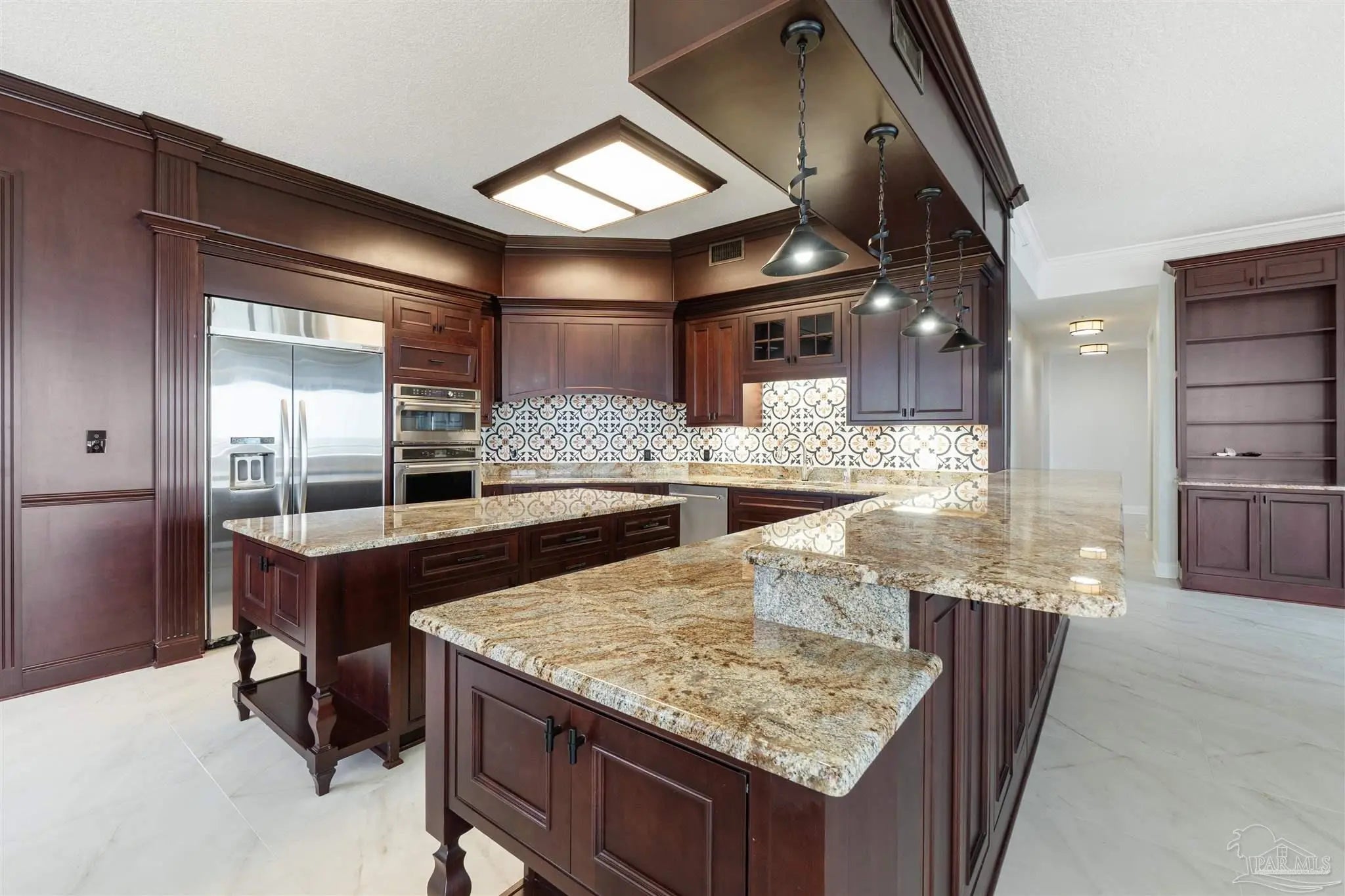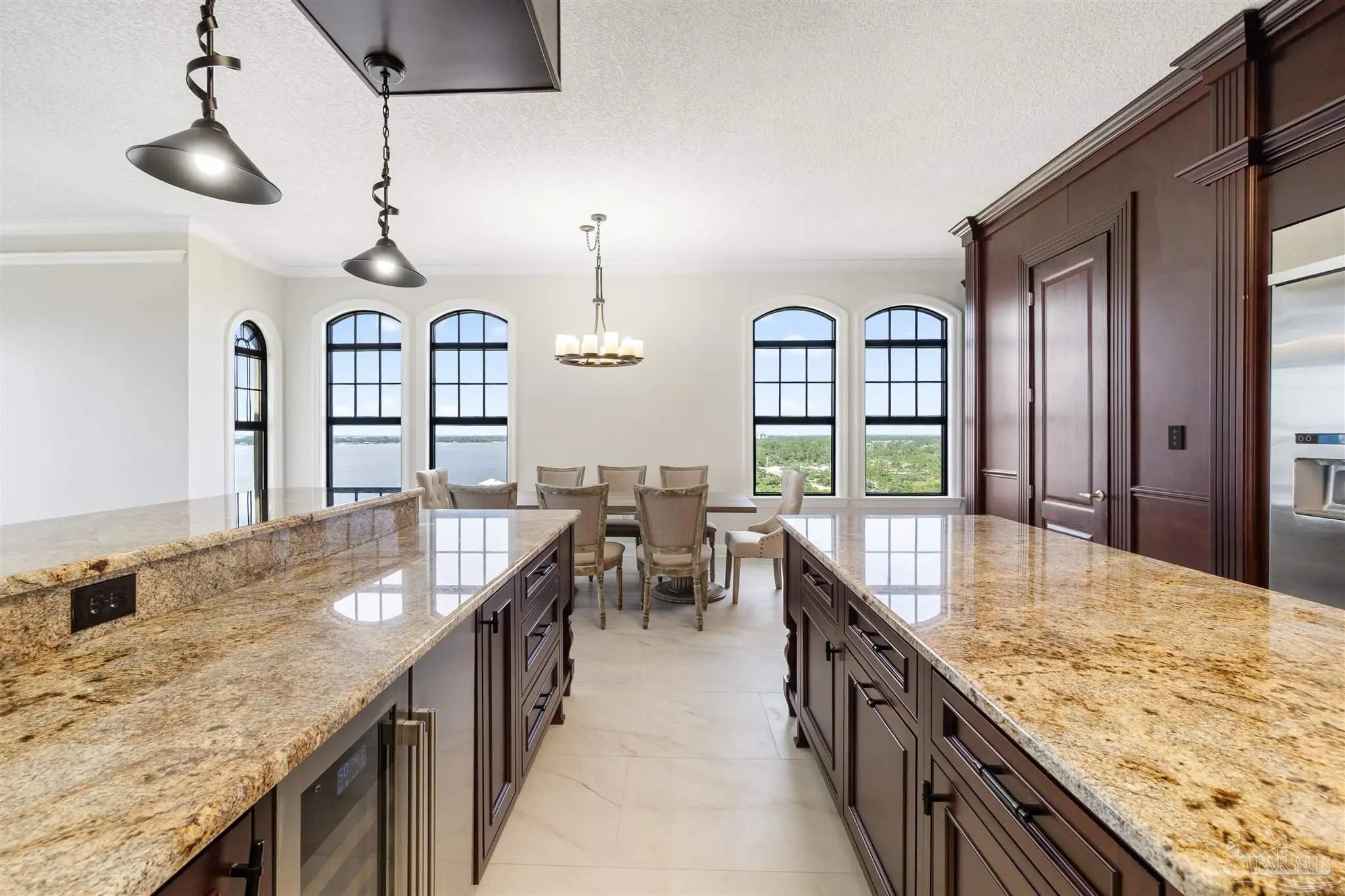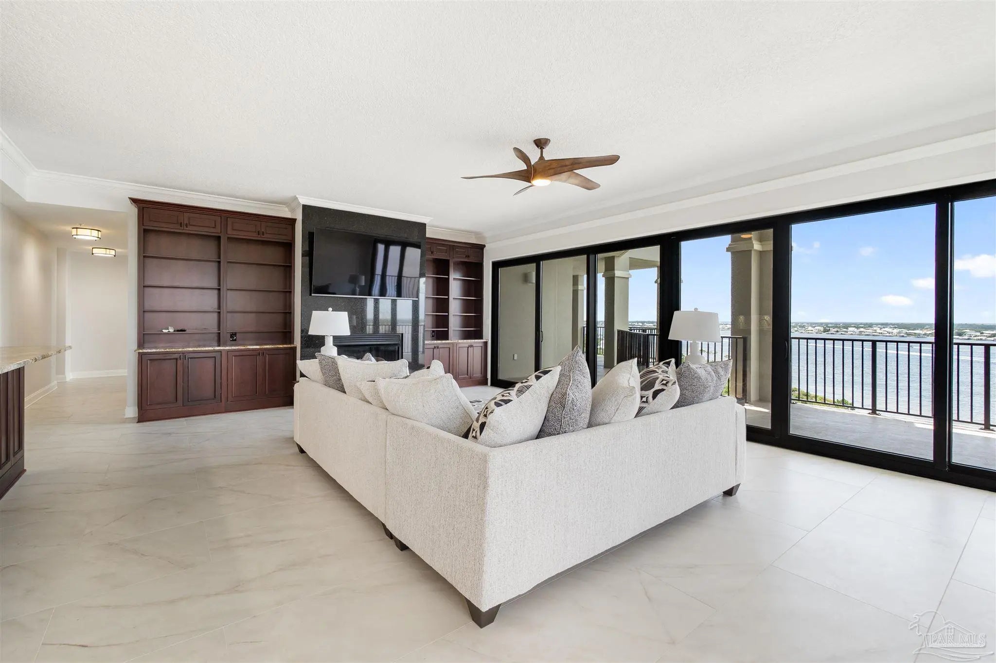 Discover the pinnacle of Perdido Key luxury coastal living in this palatial, partially furnished top-floor penthouse at Florencia. 3,710 sq ft of freshly painted, upgraded luxury and unparalleled convenience—updated lighting, and stunning zero-grout-line stone floors, perfect for elegant, carefree living. The completely custom kitchen is an entertainer's dream, flowing seamlessly into a grand living space with 270-degree views of the Gulf, Old River, and the surrounding waterways. Relax outdoors on the 421 sf veranda that spans the width of the residence to witness countless stunning sunsets all year long. This unique 6-bedroom, 5.5-bath floor plan features a sophisticated wine room with a chiller and custom racks, plus a private office featuring custom raised paneling and built-ins. The primary suite is a true waterfront sanctuary, featuring floor-to-ceiling glass, access to the veranda, a custom-fitted wardrobe and closets, and a luxurious bath with veranda access. A rare and significant value-add, this unit includes two covered parking spaces and a large storage unit, all conveniently located just steps from the elevator—no need to brave the elements. Florencia is a stunningly impressive property with elegant grounds, a sophisticated gated community featuring lush landscaping, a gorgeous Italian Fountain, and a portico entrance. 5-star amenities include indoor & outdoor pools, a fitness center with sauna/steam rooms, tennis courts, and boat docks(slips sold by a third party) on Old River. With deeded beach access and a bike trail at your gate, this turnkey masterpiece offers a lifestyle of unmatched luxury and convenience. Make plans for your private viewing today. Rent restricted to 30-day minimum