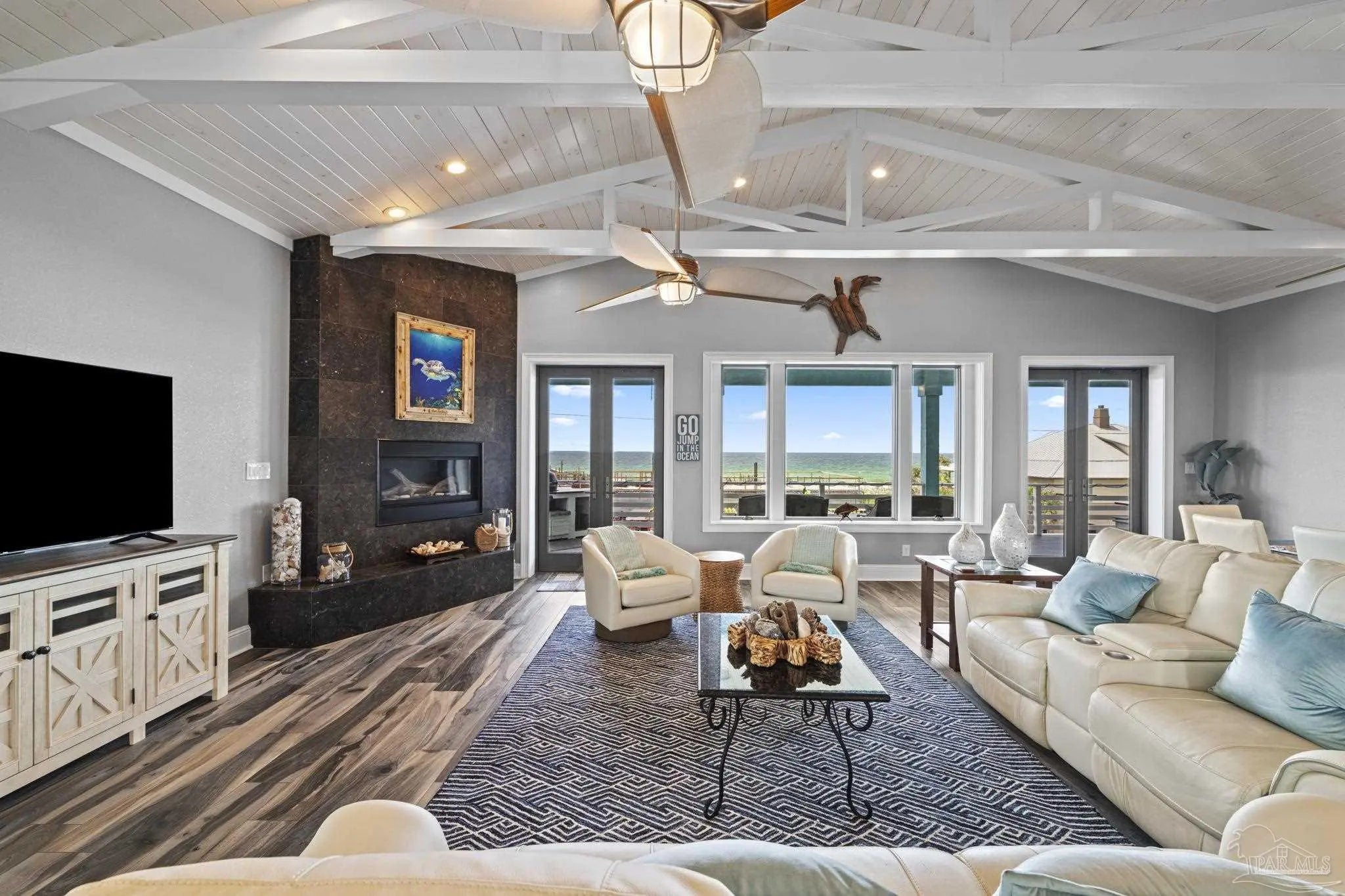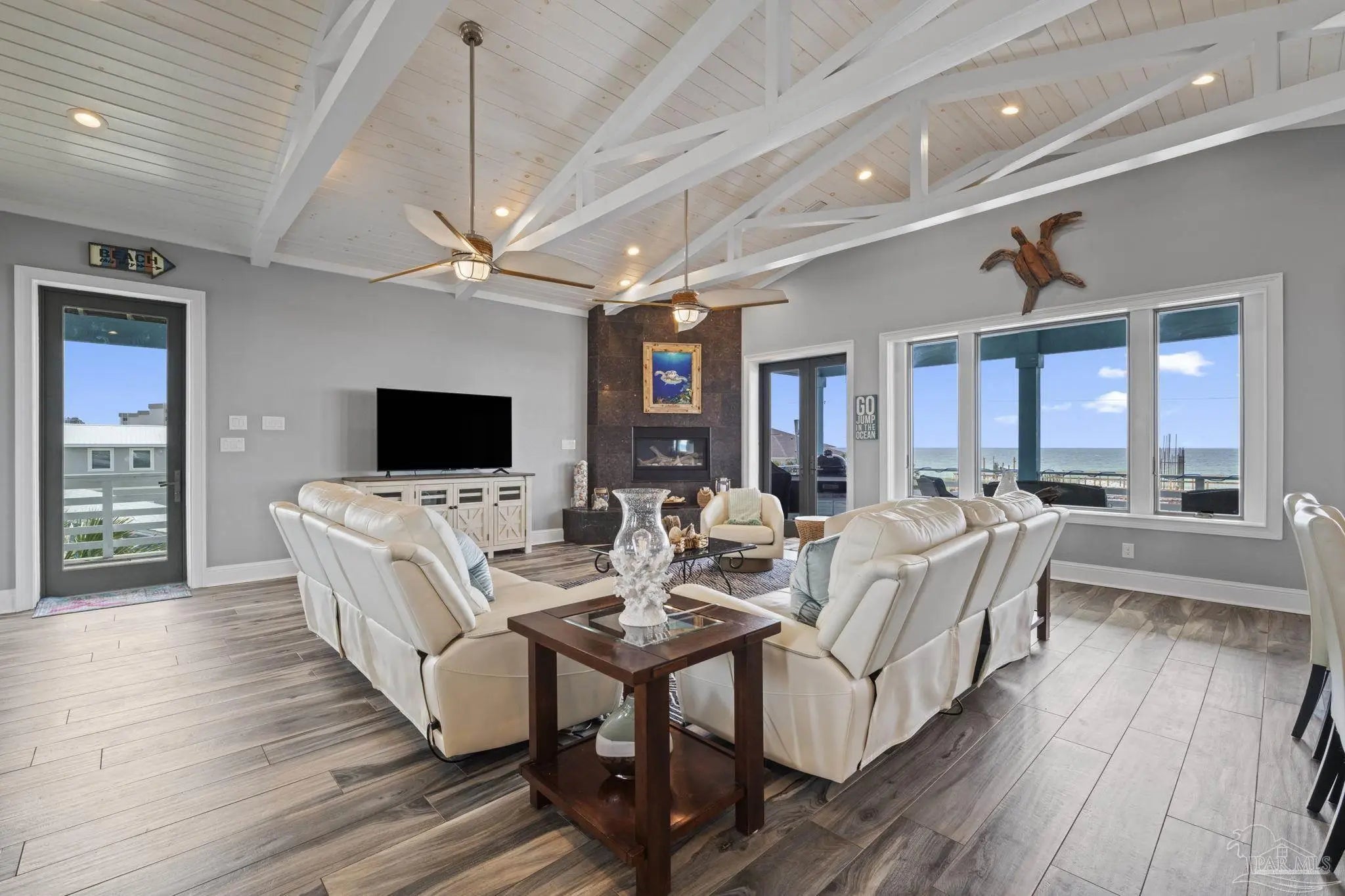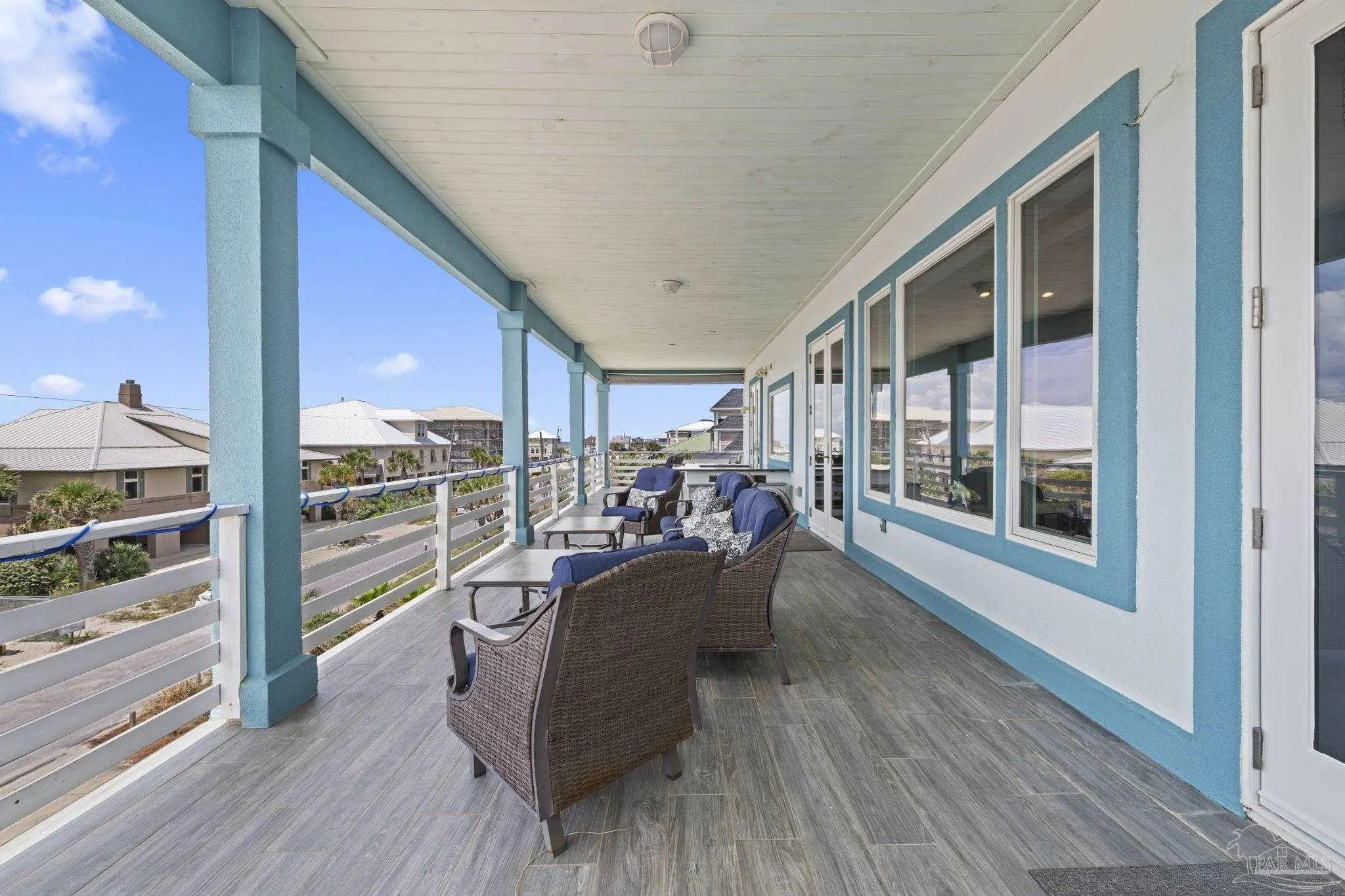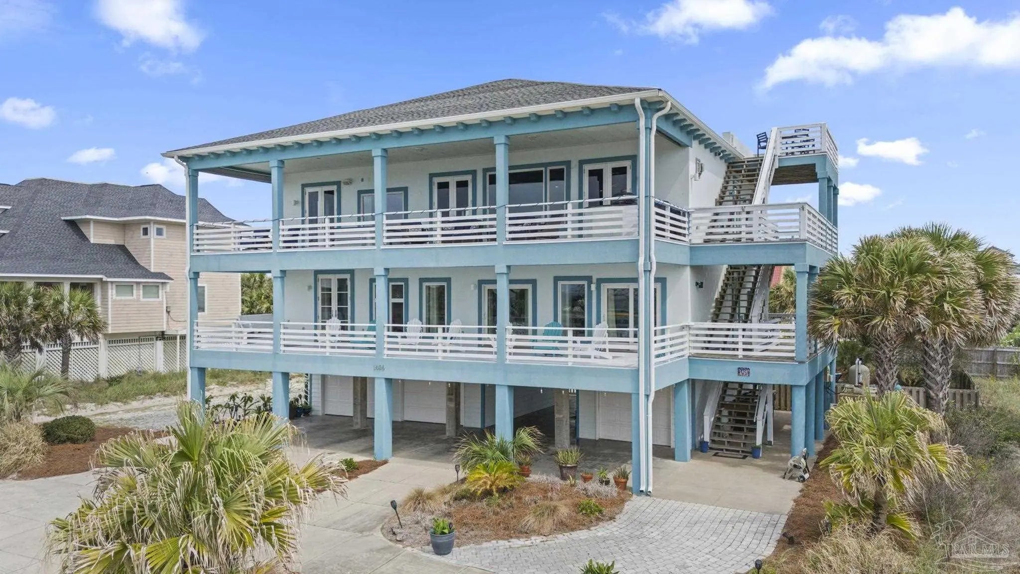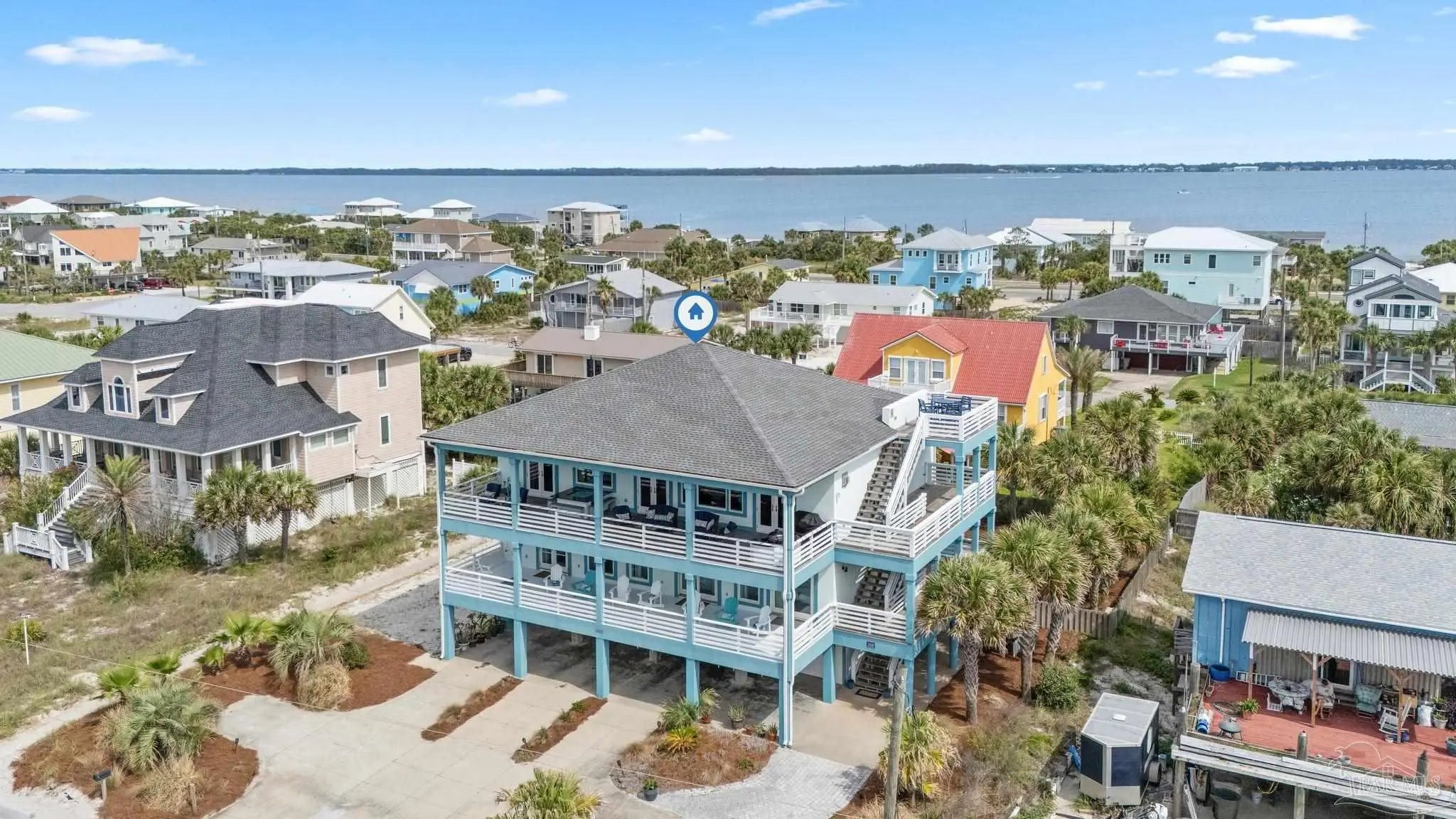 This luxury beach retreat offers breathtaking Gulf views from nearly every room. Located on the top floor, the main living area features soaring tongue-and-groove ceilings, wood-look tile flooring, and expansive windows that flood the space with natural light and frame stunning water vistas. Modern coastal finishes create a clean, sophisticated aesthetic. The chef’s kitchen includes custom cabinetry, mosaic tile backsplash, granite countertops, dual dishwashers, and bar seating with a view. The spacious living room—anchored by a fireplace with granite tile surround—flows onto a covered deck, perfect for alfresco dining or unwinding after a day at the beach. Outdoor spaces include generous balconies that invite relaxation to the sound of the waves, a rooftop deck with panoramic island views, and a hot tub just off the game room deck. The expansive primary suite offers balcony access, a large walk-in closet, and a luxurious en suite bath with double vanities, granite countertops, a Thermasol steam shower, and its own washer/dryer. Four additional en suite bedrooms on the second level provide private, light-filled retreats. A custom bunk area, kitchenette, and two more laundry stations add comfort and flexibility. Constructed with concrete pilings, ICF concrete walls, and ICF concrete floors on the second level, this home offers exceptional strength and energy efficiency. All windows are impact-rated Anderson. The home also features geothermal HVAC, an elevator to all levels, two attics for storage, and garages that accommodate up to five vehicles. A lock-out door can be added at the bottom of the stairs—framed and ready—offering potential for rental income or multigenerational living. At sand level, enjoy a fire pit, grilling area, and a gunite pool with tanning ledge and waterfall. Whether a primary residence, second home, or rental, this property is thoughtfully designed for an exceptional coastal lifestyle.