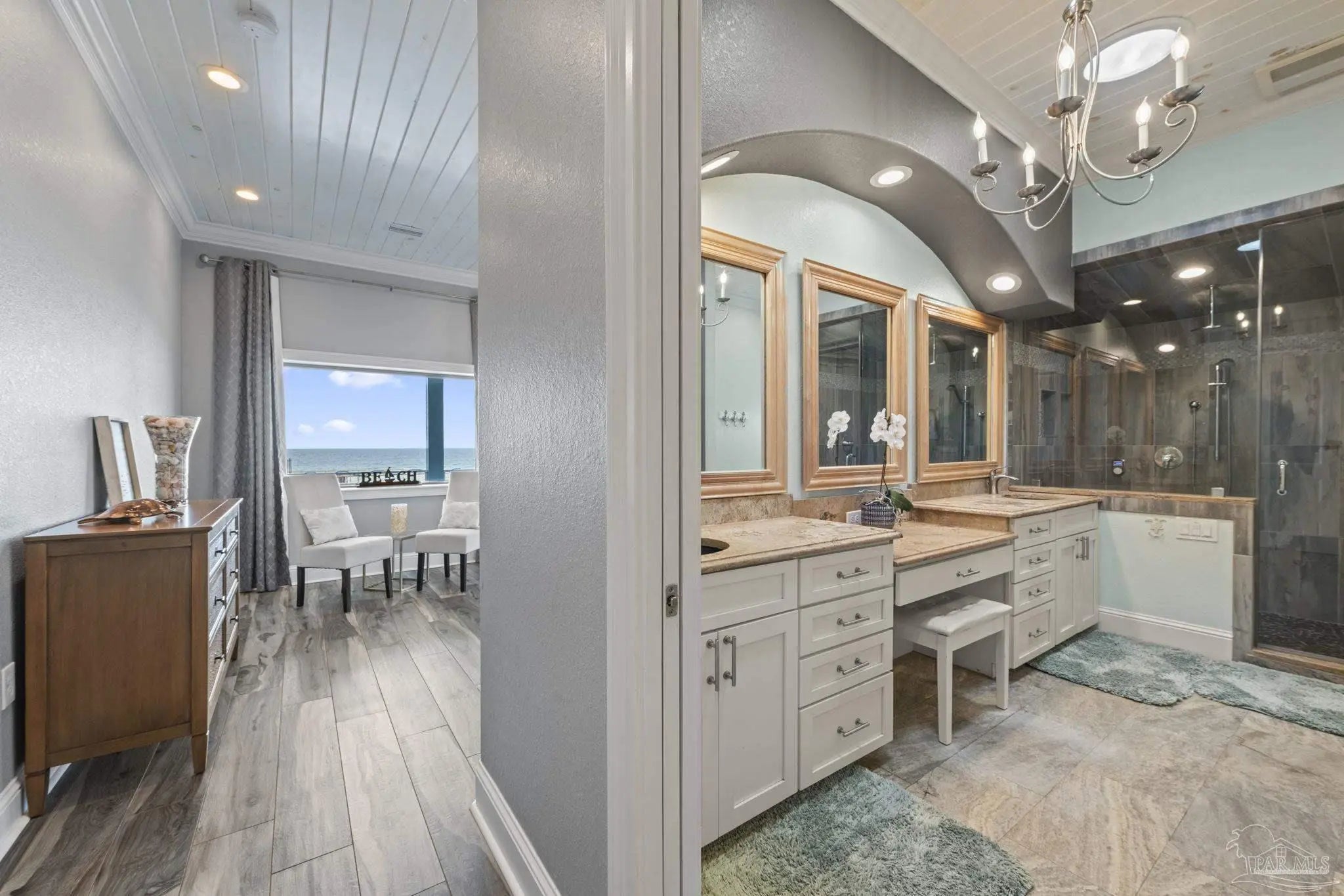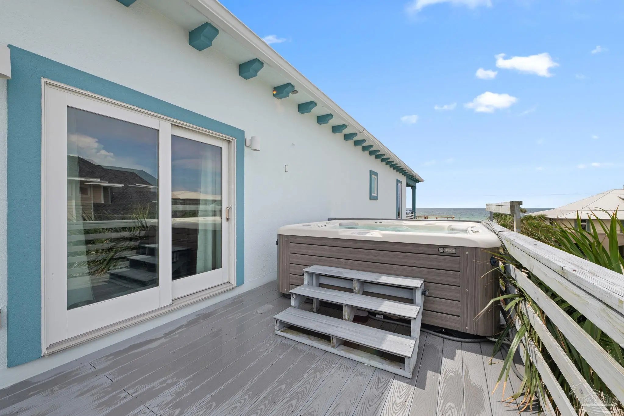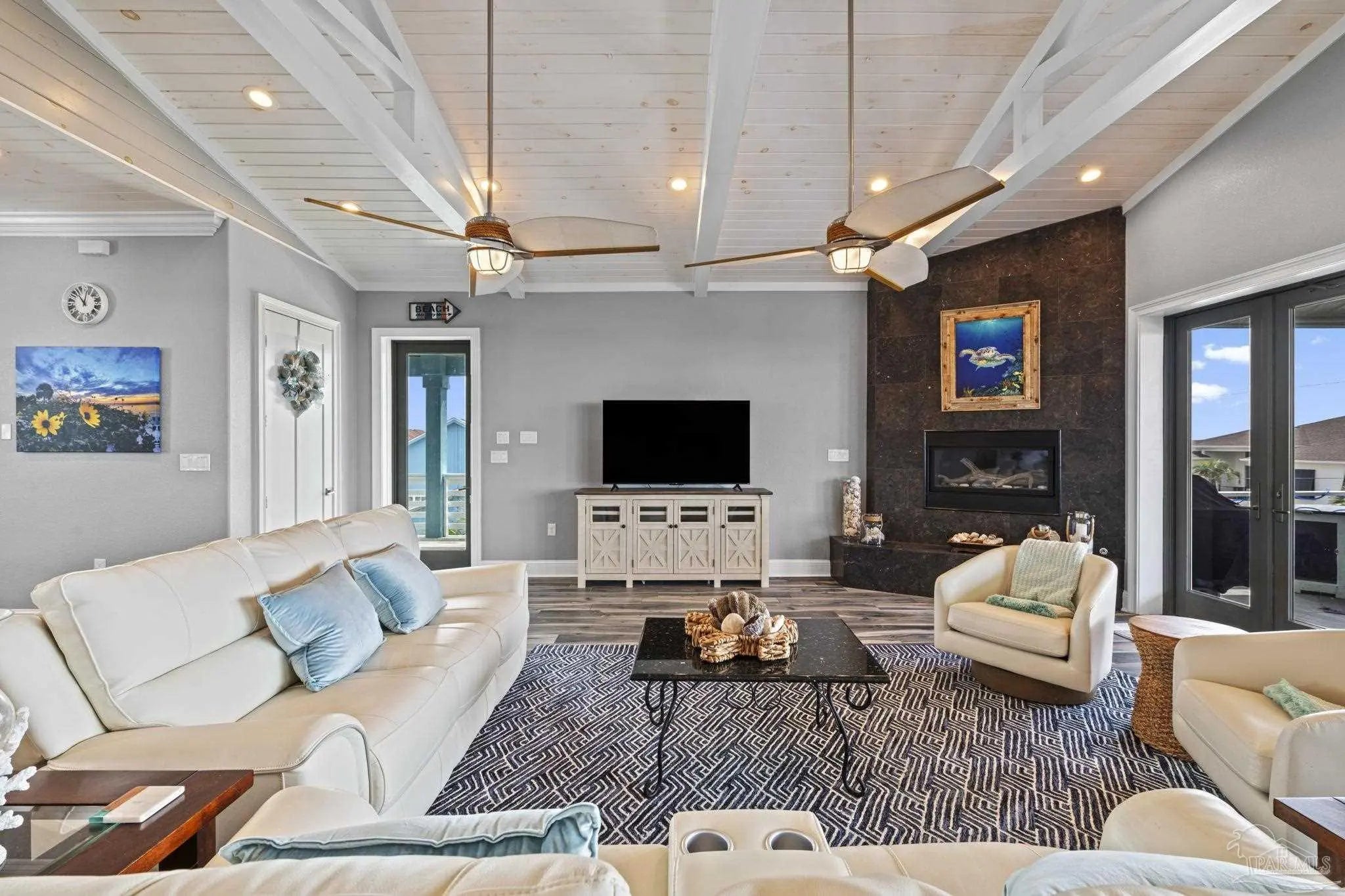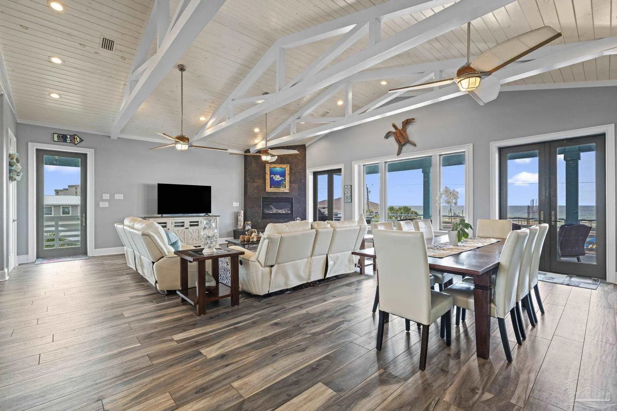 This luxury beach retreat offers breathtaking Gulf views from nearly every room. Located on the top floor, the main living area features soaring tongue-and-groove ceilings, wood-look tile flooring, and expansive windows that flood the space with natural light and frame stunning water vistas. Modern coastal finishes create a clean, sophisticated aesthetic. The chef’s kitchen includes custom cabinetry, mosaic tile backsplash, granite countertops, dual dishwashers, and bar seating with a view. The spacious living room—anchored by a fireplace with granite tile surround—flows onto a covered deck, perfect for alfresco dining or unwinding after a day at the beach. Outdoor spaces include generous balconies that invite relaxation to the sound of the waves, a rooftop deck with panoramic island views, and a hot tub just off the game room deck. The expansive primary suite offers balcony access, a large walk-in closet, and a luxurious en suite bath with double vanities, granite countertops, a Thermasol steam shower, and its own washer/dryer. Four additional en suite bedrooms on the second level provide private, light-filled retreats. A custom bunk area, kitchenette, and two more laundry stations add comfort and flexibility. Constructed with concrete pilings, ICF concrete walls, and ICF concrete floors on the second level, this home offers exceptional strength and energy efficiency. All windows are impact-rated Anderson. The home also features geothermal HVAC, an elevator to all levels, two attics for storage, and garages that accommodate up to five vehicles. A lock-out door can be added at the bottom of the stairs—framed and ready—offering potential for rental income or multigenerational living. At sand level, enjoy a fire pit, grilling area, and a gunite pool with tanning ledge and waterfall. Whether a primary residence, second home, or rental, this property is thoughtfully designed for an exceptional coastal lifestyle.