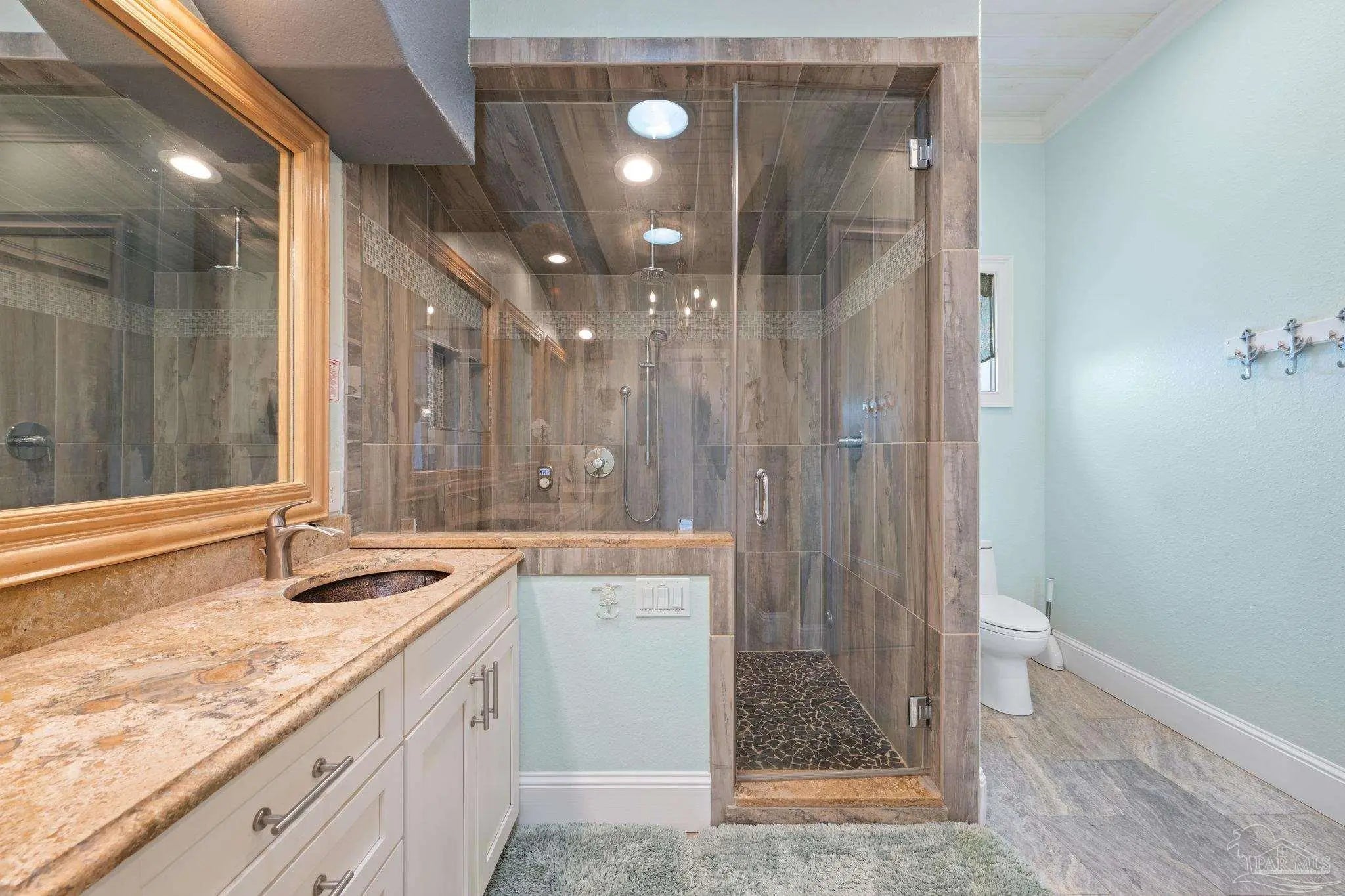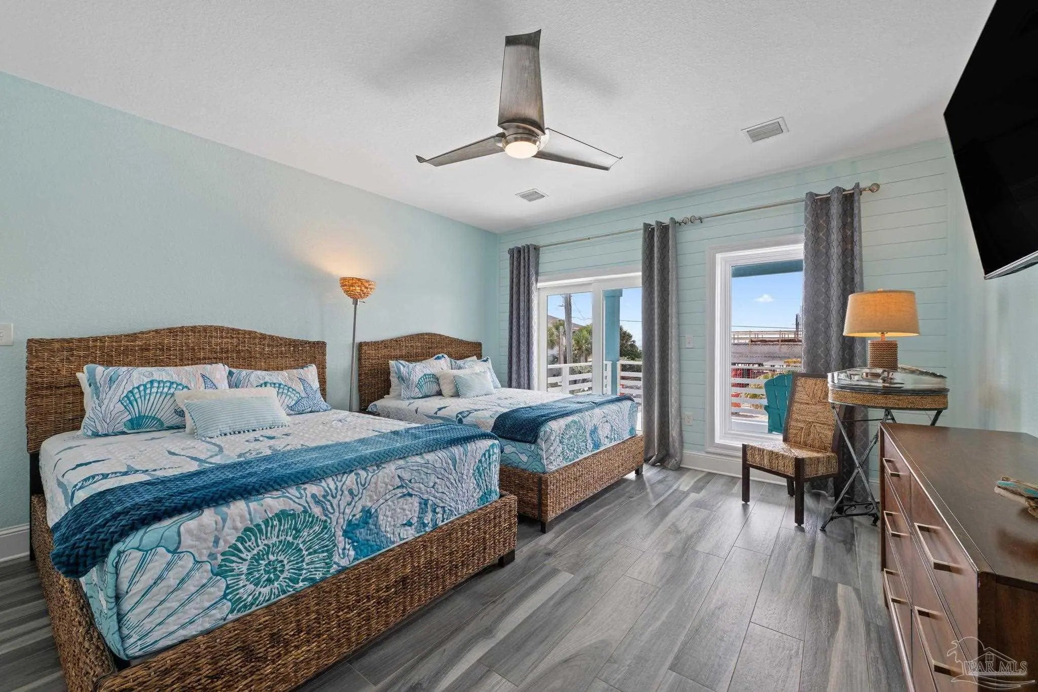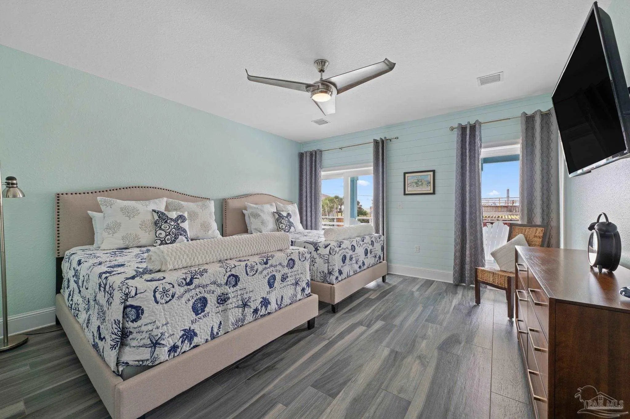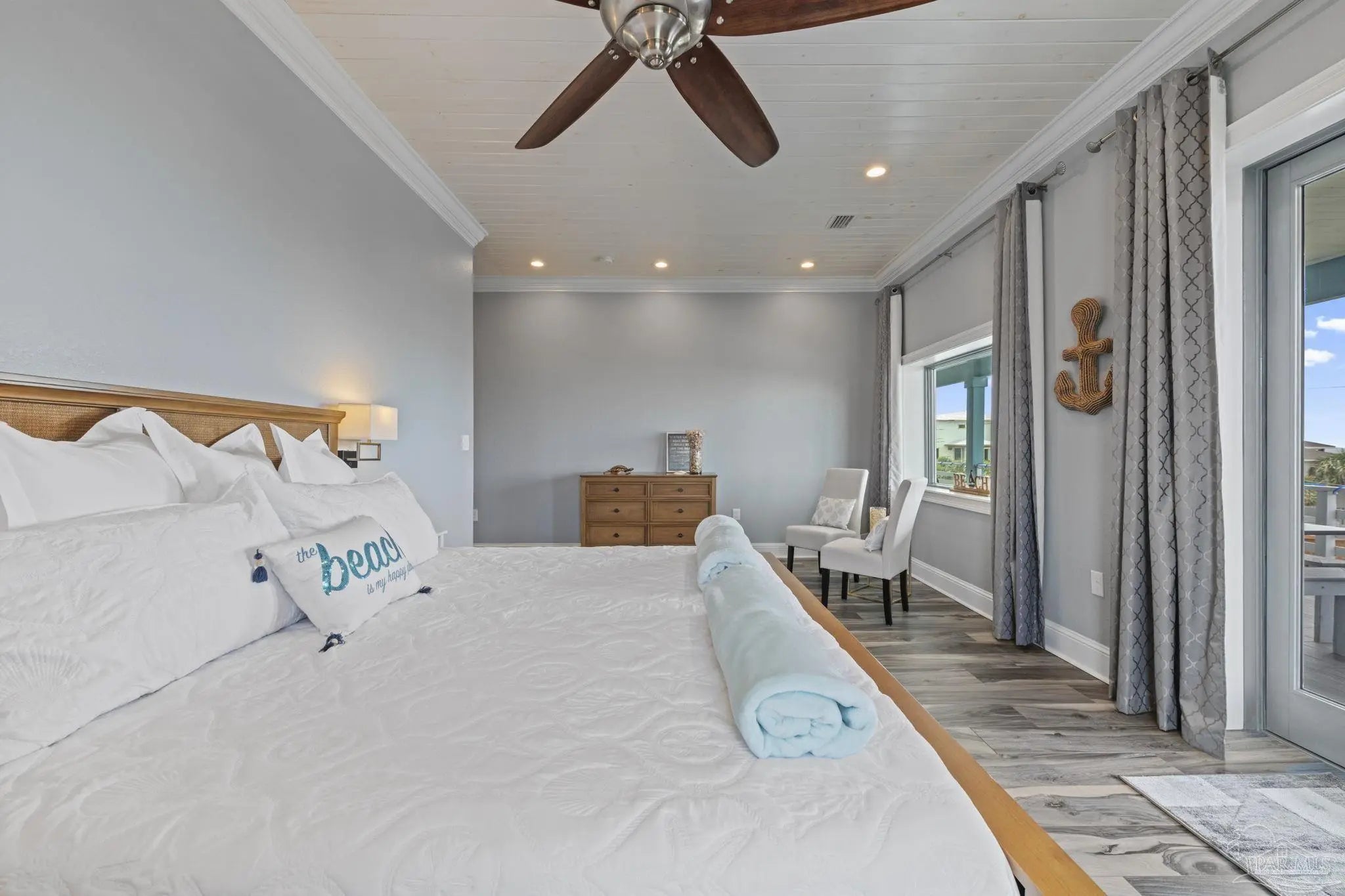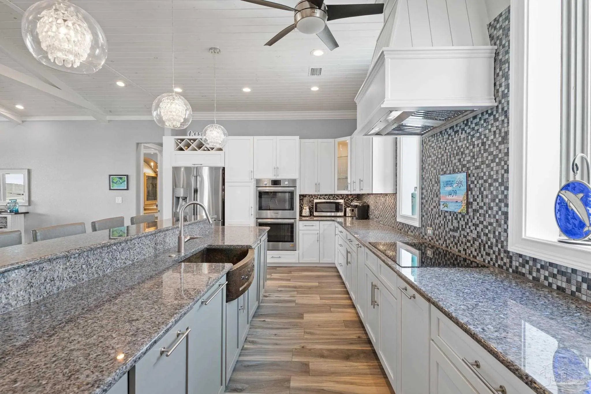 This luxury beach retreat offers breathtaking Gulf views from nearly every room. Located on the top floor, the main living area features soaring tongue-and-groove ceilings, wood-look tile flooring, and expansive windows that flood the space with natural light and frame stunning water vistas. Modern coastal finishes create a clean, sophisticated aesthetic. The chef’s kitchen includes custom cabinetry, mosaic tile backsplash, granite countertops, dual dishwashers, and bar seating with a view. The spacious living room—anchored by a fireplace with granite tile surround—flows onto a covered deck, perfect for alfresco dining or unwinding after a day at the beach. Outdoor spaces include generous balconies that invite relaxation to the sound of the waves, a rooftop deck with panoramic island views, and a hot tub just off the game room deck. The expansive primary suite offers balcony access, a large walk-in closet, and a luxurious en suite bath with double vanities, granite countertops, a Thermasol steam shower, and its own washer/dryer. Four additional en suite bedrooms on the second level provide private, light-filled retreats. A custom bunk area, kitchenette, and two more laundry stations add comfort and flexibility. Constructed with concrete pilings, ICF concrete walls, and ICF concrete floors on the second level, this home offers exceptional strength and energy efficiency. All windows are impact-rated Anderson. The home also features geothermal HVAC, an elevator to all levels, two attics for storage, and garages that accommodate up to five vehicles. A lock-out door can be added at the bottom of the stairs—framed and ready—offering potential for rental income or multigenerational living. At sand level, enjoy a fire pit, grilling area, and a gunite pool with tanning ledge and waterfall. Whether a primary residence, second home, or rental, this property is thoughtfully designed for an exceptional coastal lifestyle.