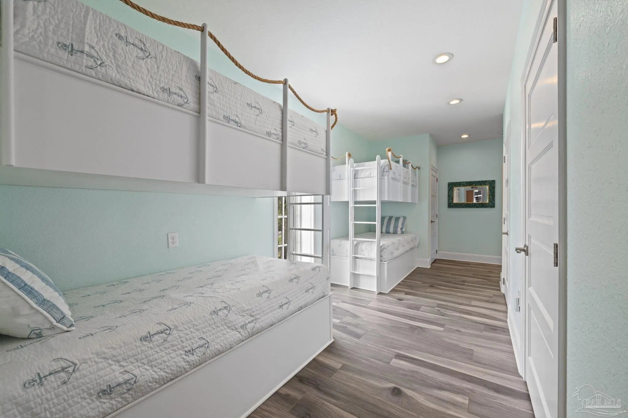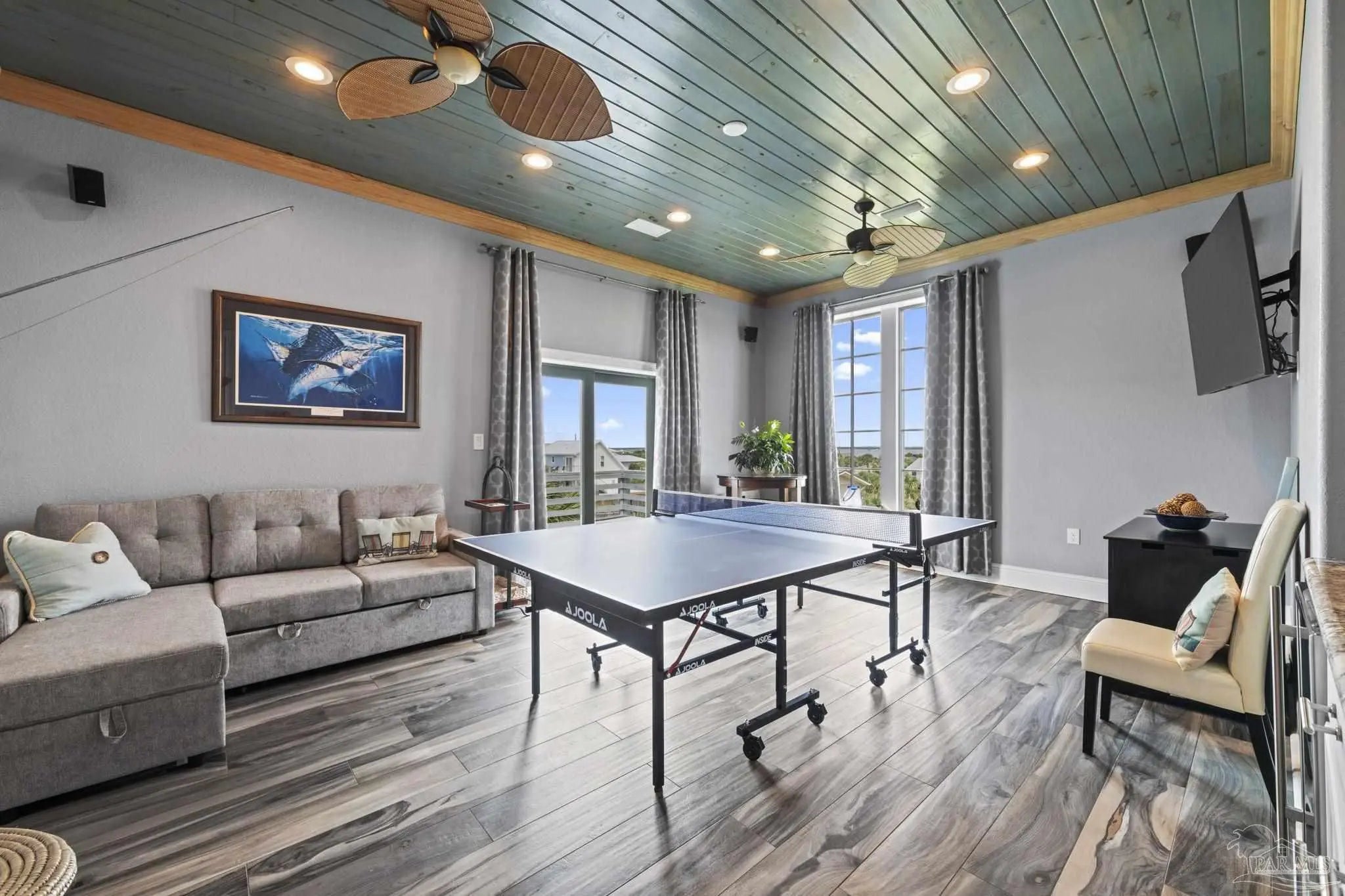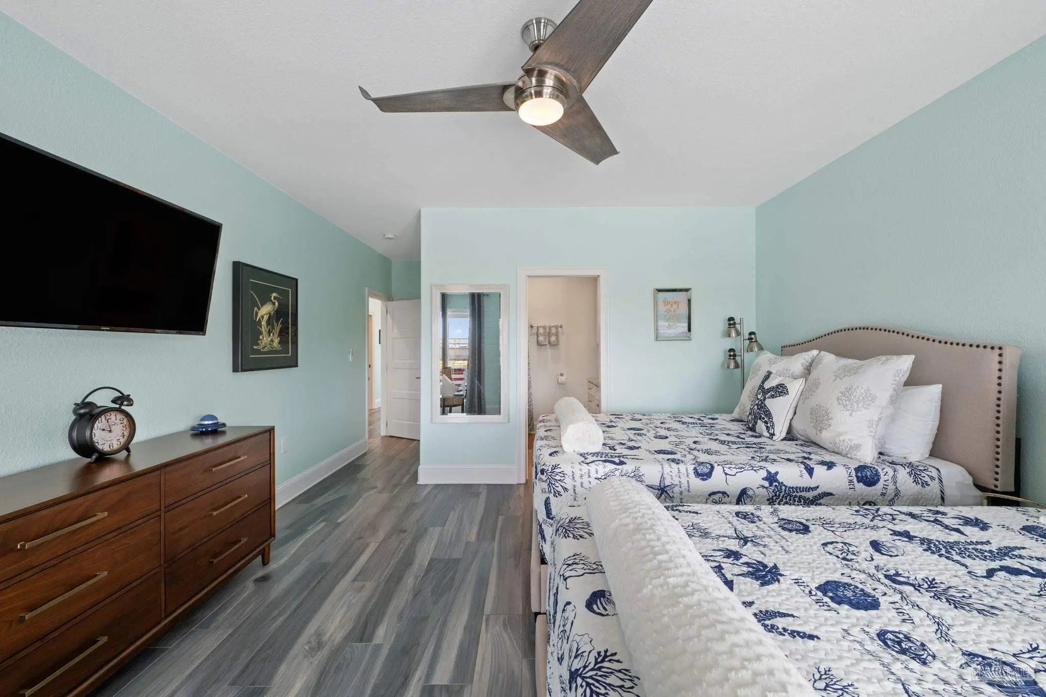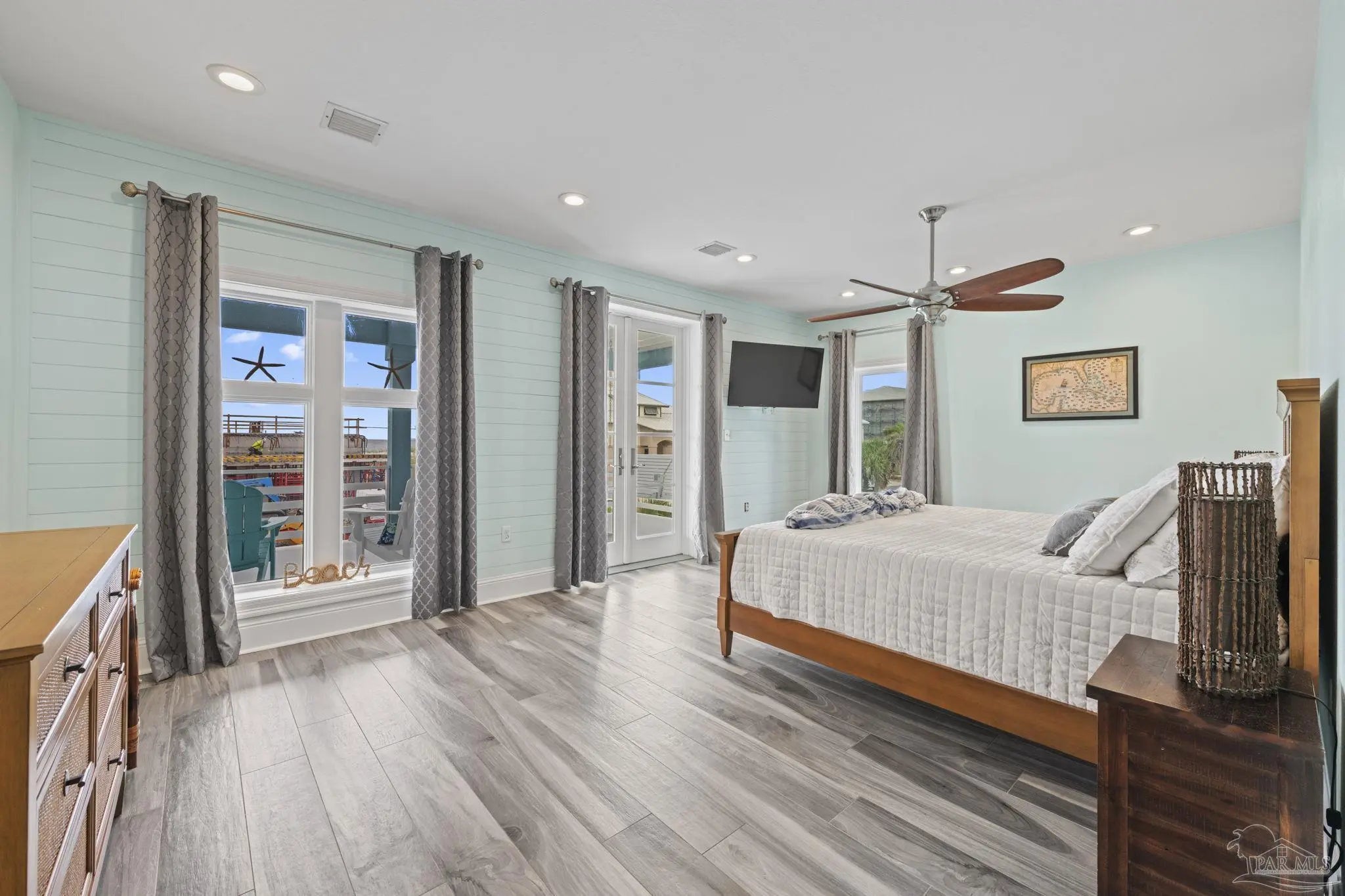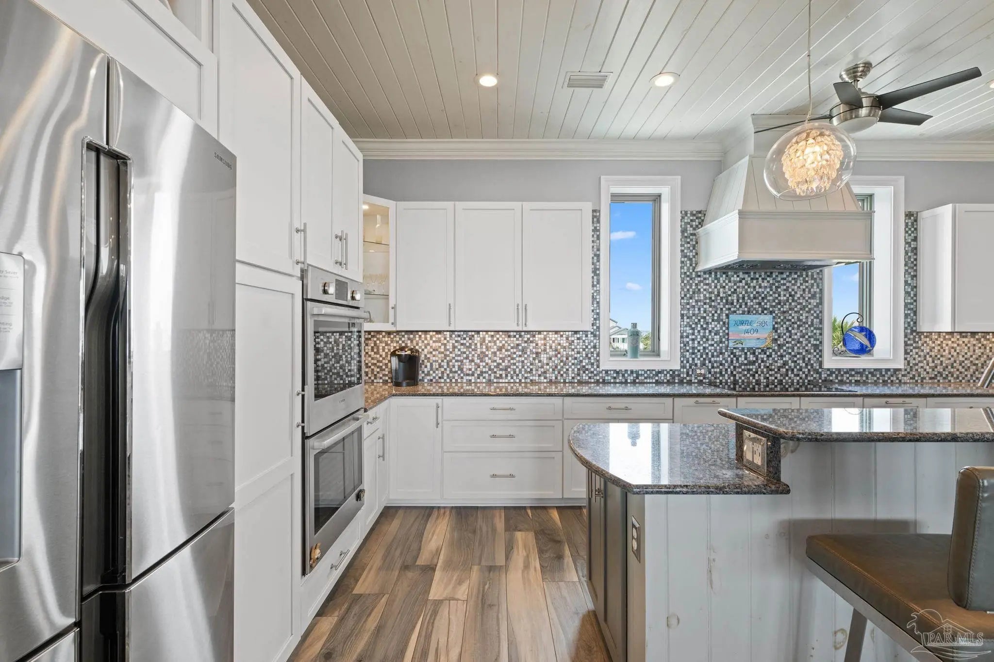 This luxury beach retreat offers breathtaking Gulf views from nearly every room. Located on the top floor, the main living area features soaring tongue-and-groove ceilings, wood-look tile flooring, and expansive windows that flood the space with natural light and frame stunning water vistas. Modern coastal finishes create a clean, sophisticated aesthetic. The chef’s kitchen includes custom cabinetry, mosaic tile backsplash, granite countertops, dual dishwashers, and bar seating with a view. The spacious living room—anchored by a fireplace with granite tile surround—flows onto a covered deck, perfect for alfresco dining or unwinding after a day at the beach. Outdoor spaces include generous balconies that invite relaxation to the sound of the waves, a rooftop deck with panoramic island views, and a hot tub just off the game room deck. The expansive primary suite offers balcony access, a large walk-in closet, and a luxurious en suite bath with double vanities, granite countertops, a Thermasol steam shower, and its own washer/dryer. Four additional en suite bedrooms on the second level provide private, light-filled retreats. A custom bunk area, kitchenette, and two more laundry stations add comfort and flexibility. Constructed with concrete pilings, ICF concrete walls, and ICF concrete floors on the second level, this home offers exceptional strength and energy efficiency. All windows are impact-rated Anderson. The home also features geothermal HVAC, an elevator to all levels, two attics for storage, and garages that accommodate up to five vehicles. A lock-out door can be added at the bottom of the stairs—framed and ready—offering potential for rental income or multigenerational living. At sand level, enjoy a fire pit, grilling area, and a gunite pool with tanning ledge and waterfall. Whether a primary residence, second home, or rental, this property is thoughtfully designed for an exceptional coastal lifestyle.