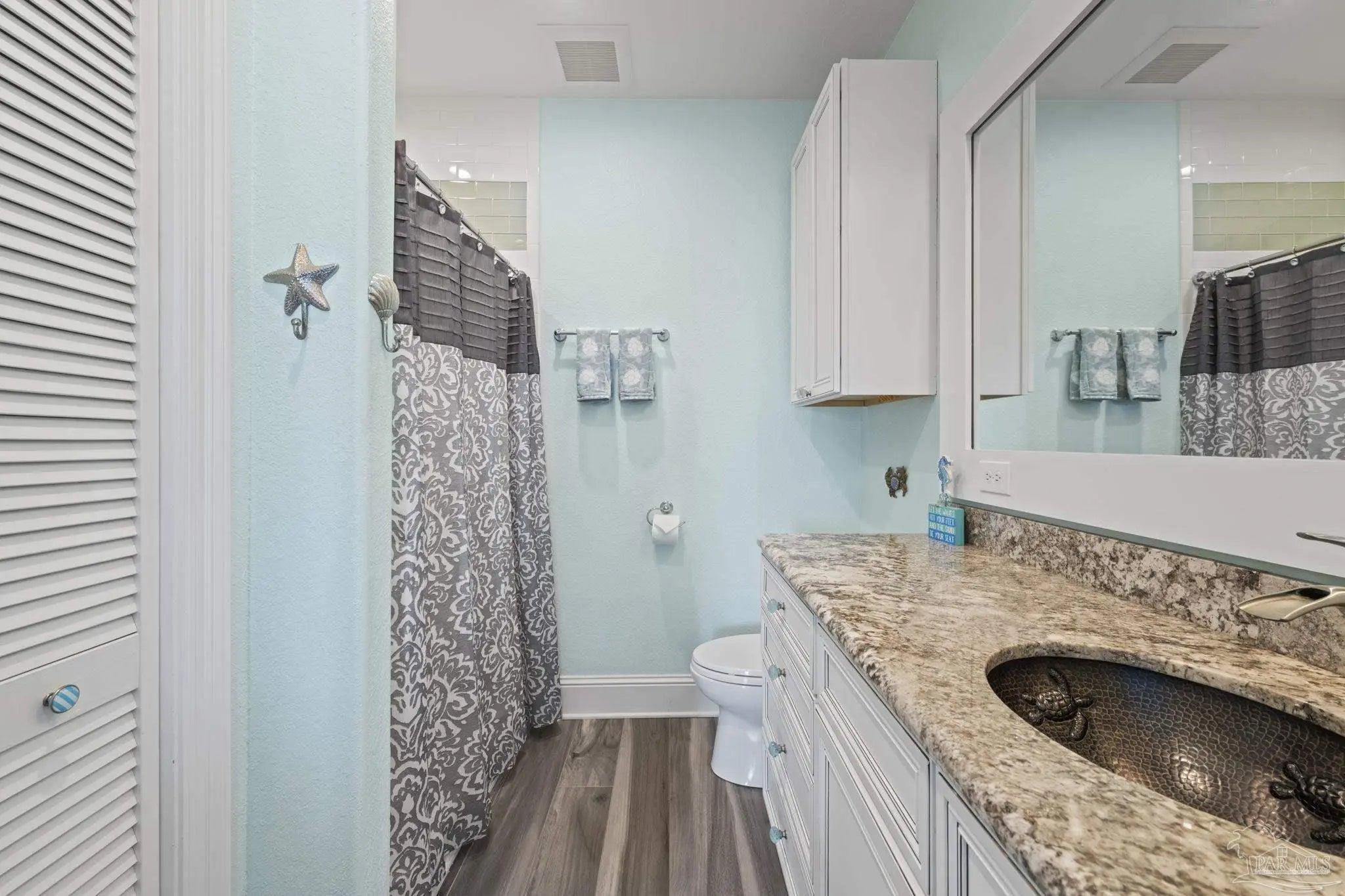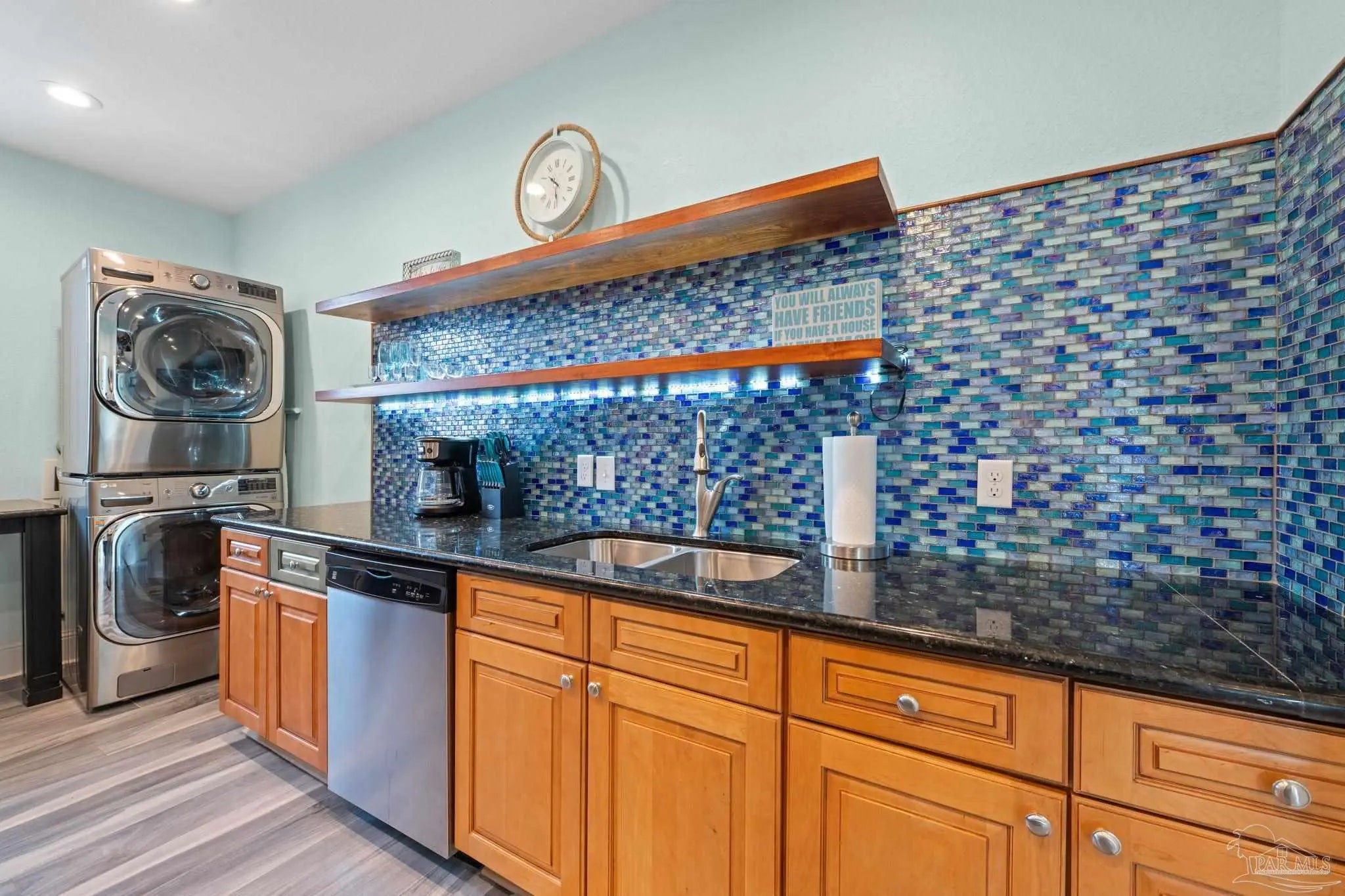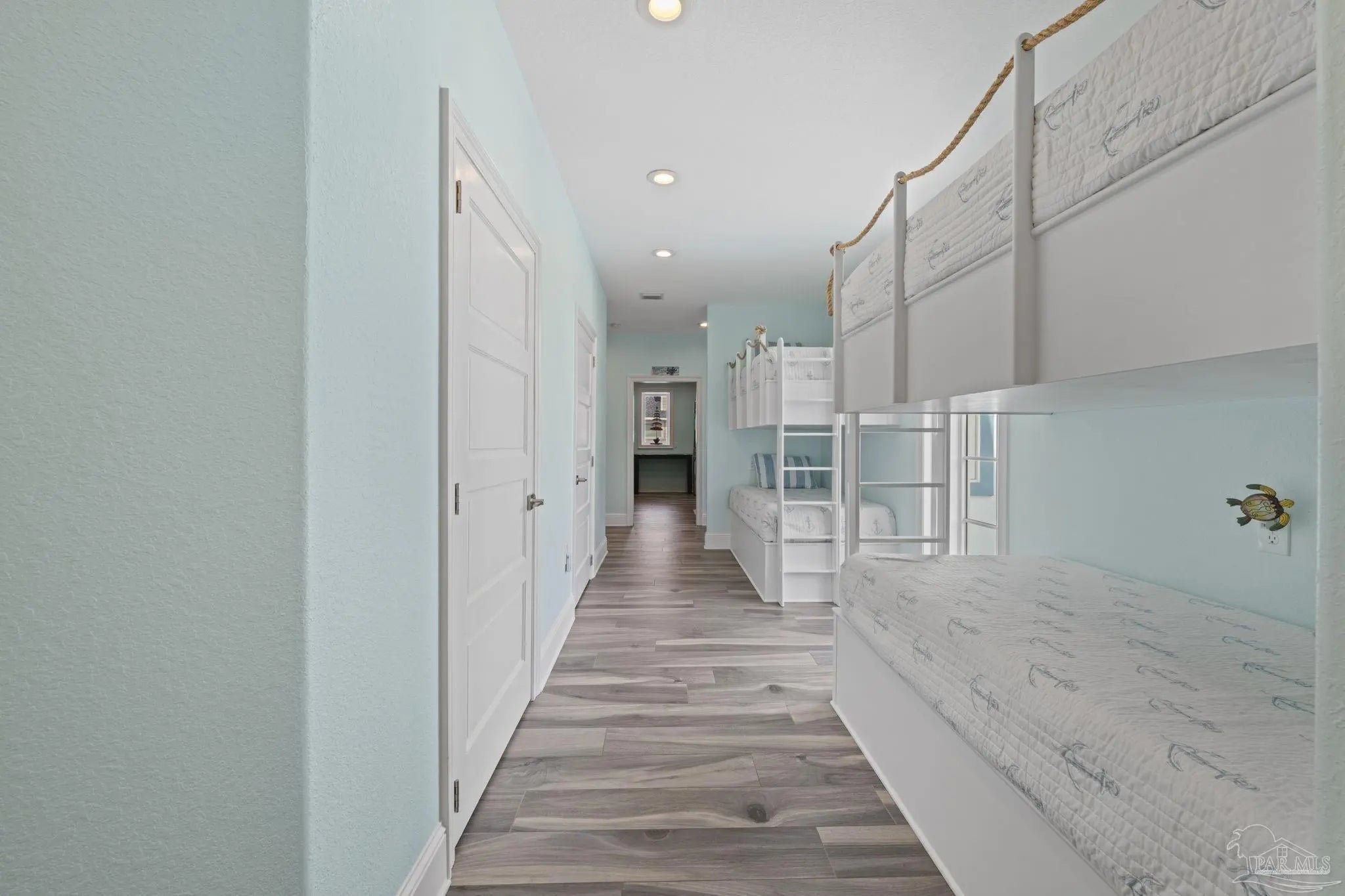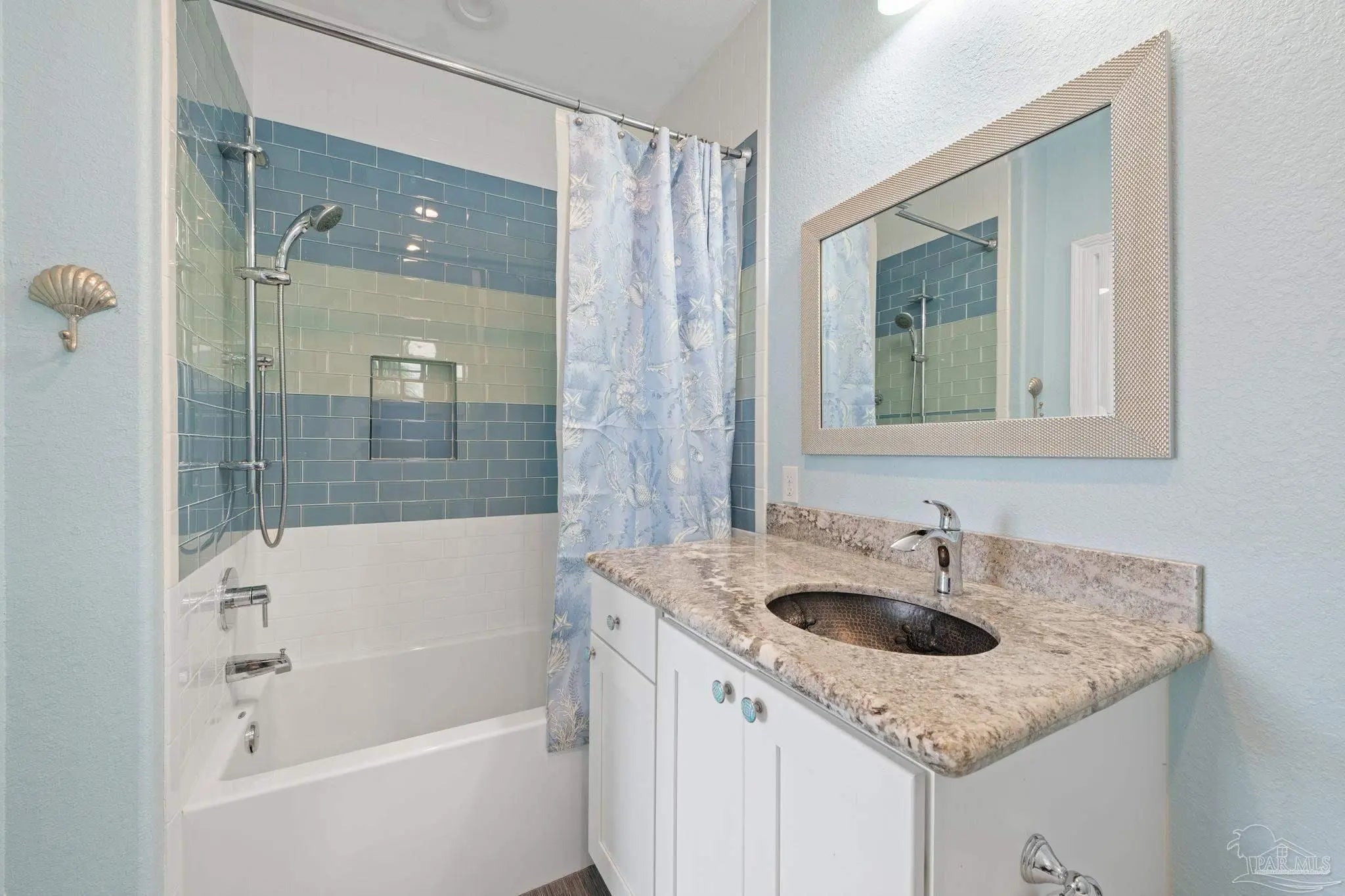 This luxury beach retreat offers breathtaking Gulf views from nearly every room. Located on the top floor, the main living area features soaring tongue-and-groove ceilings, wood-look tile flooring, and expansive windows that flood the space with natural light and frame stunning water vistas. Modern coastal finishes create a clean, sophisticated aesthetic. The chef’s kitchen includes custom cabinetry, mosaic tile backsplash, granite countertops, dual dishwashers, and bar seating with a view. The spacious living room—anchored by a fireplace with granite tile surround—flows onto a covered deck, perfect for alfresco dining or unwinding after a day at the beach. Outdoor spaces include generous balconies that invite relaxation to the sound of the waves, a rooftop deck with panoramic island views, and a hot tub just off the game room deck. The expansive primary suite offers balcony access, a large walk-in closet, and a luxurious en suite bath with double vanities, granite countertops, a Thermasol steam shower, and its own washer/dryer. Four additional en suite bedrooms on the second level provide private, light-filled retreats. A custom bunk area, kitchenette, and two more laundry stations add comfort and flexibility. Constructed with concrete pilings, ICF concrete walls, and ICF concrete floors on the second level, this home offers exceptional strength and energy efficiency. All windows are impact-rated Anderson. The home also features geothermal HVAC, an elevator to all levels, two attics for storage, and garages that accommodate up to five vehicles. A lock-out door can be added at the bottom of the stairs—framed and ready—offering potential for rental income or multigenerational living. At sand level, enjoy a fire pit, grilling area, and a gunite pool with tanning ledge and waterfall. Whether a primary residence, second home, or rental, this property is thoughtfully designed for an exceptional coastal lifestyle.