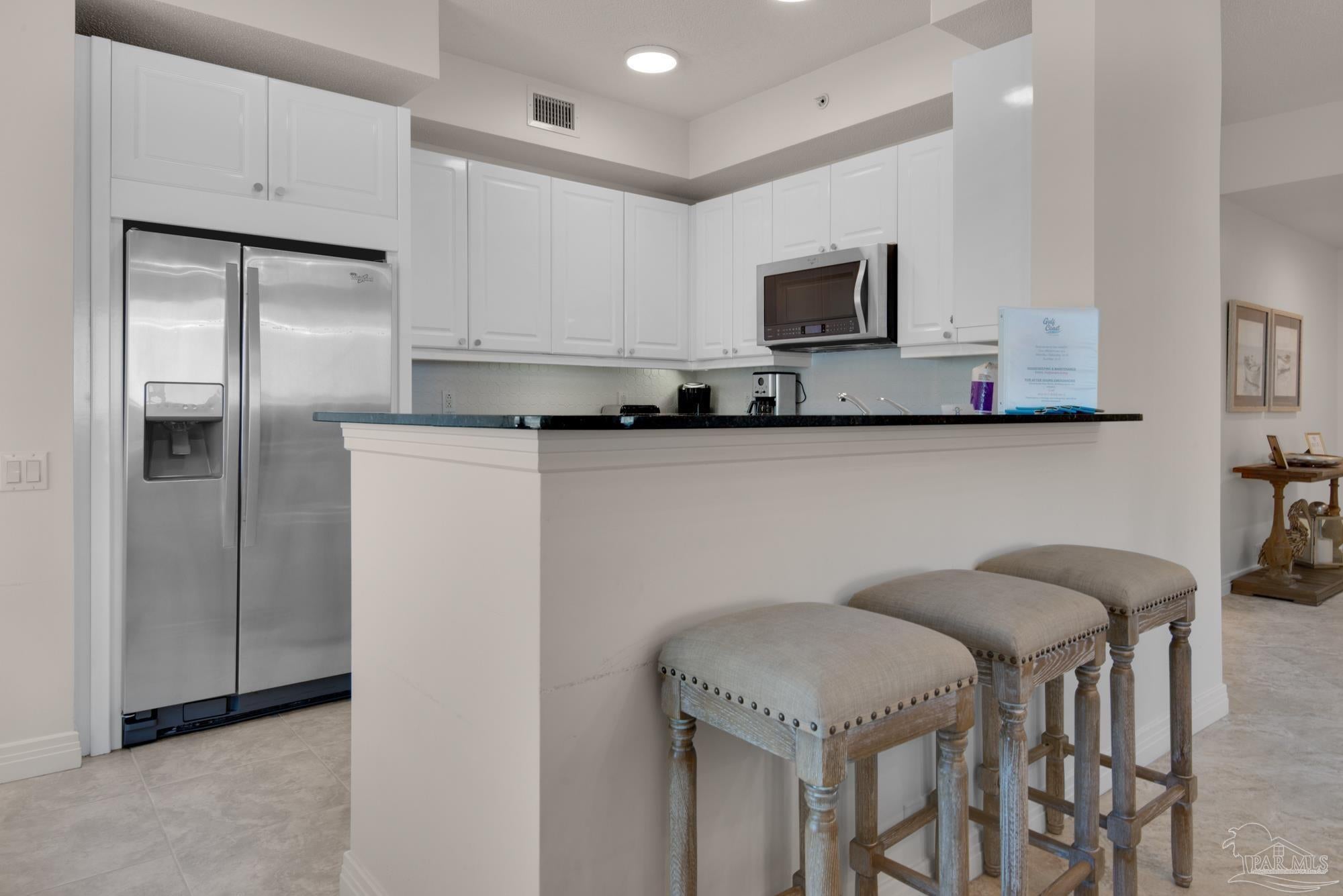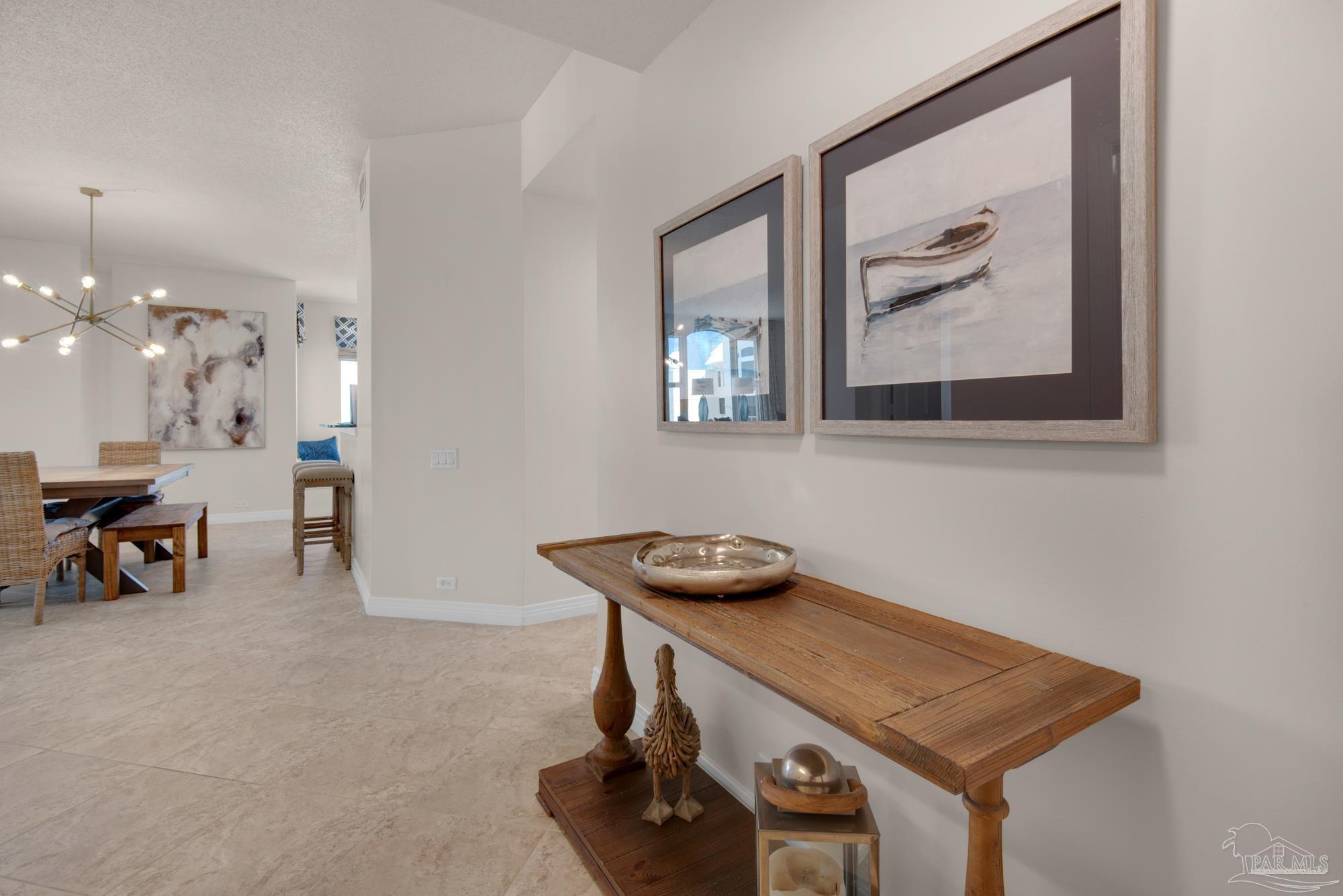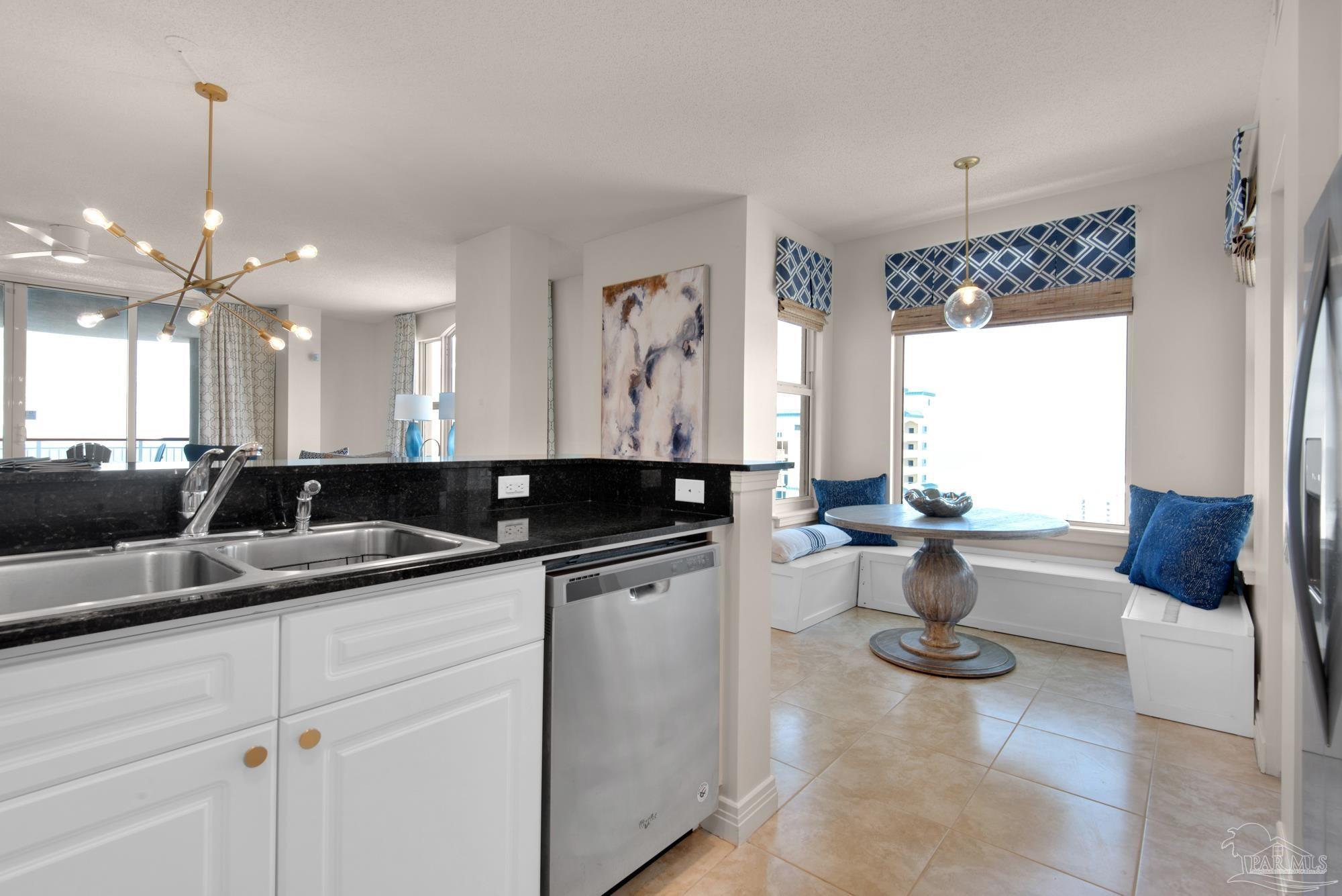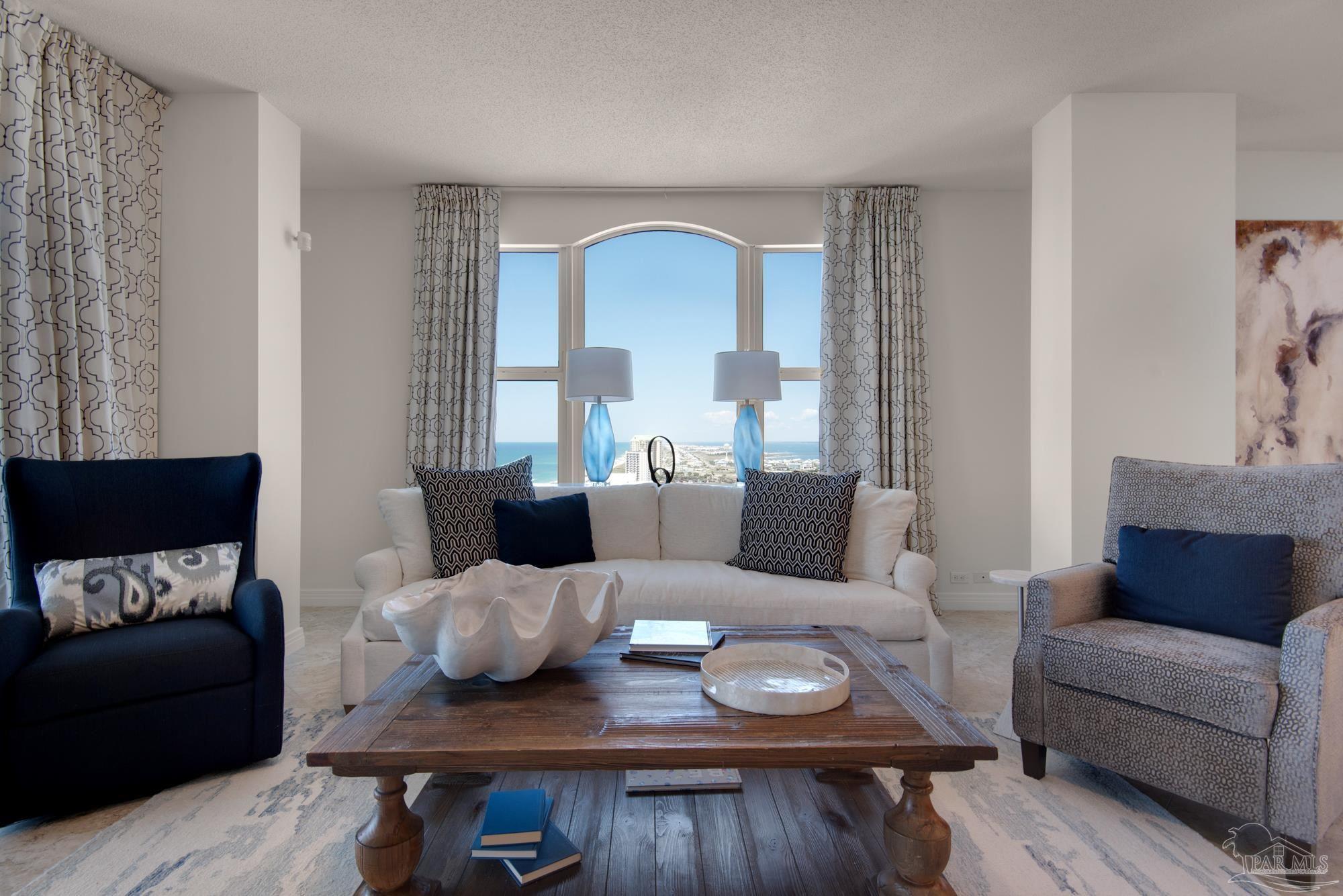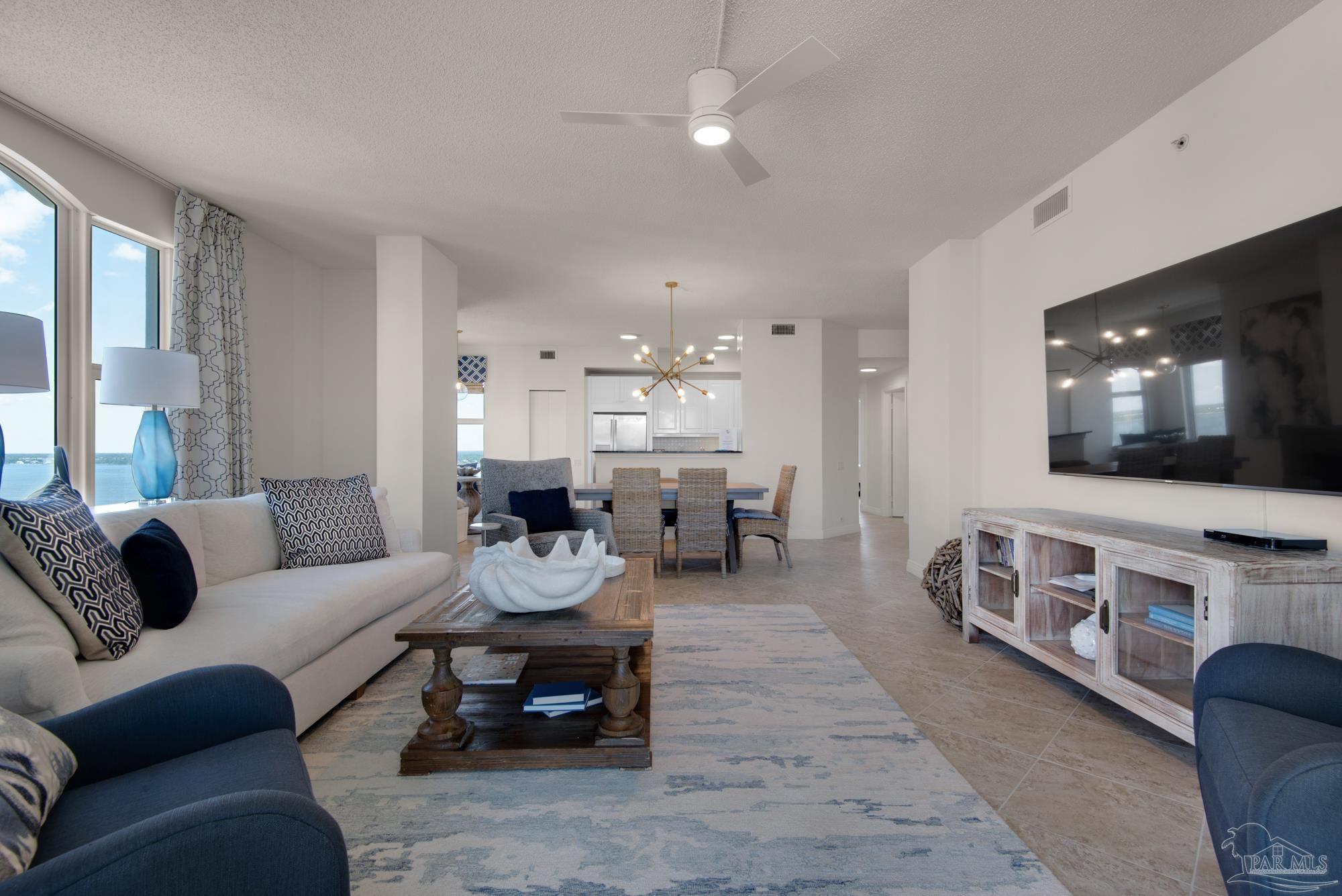 Skyview Penthouse invites you to experience the best in waterfront living on the Gulf. Furnished 3-bedroom, 3-bath West Corner Condo on the 18th floor at Beach Colony West is ideal for primary residence, second home or investment Vacation rental. The wall of windows brings in an abundance of natural light and offers refreshing views of the white sugar sand beach and turquoise waters of the Gulf coastline. Open concept 1950 sq feet has been thoughtfully designed with high 9-ft ceilings, crown molding, neutral color palette and spacious living area that flows directly into the expansive covered waterfront terrace. This updated condo is appointed with beautiful low maintenance tile flooring on the diagonal and updated furniture, lighting fixtures, paint, and décor. The dining area, breakfast bar and breakfast room allow for both casual and formal dining options. The breakfast room has large picture windows giving both western and northern views of the Santa Rosa Sound. The updated kitchen is fully equipped with stainless appliances, granite counter tops, and tall cabinets. The Master ensuite has terrace access, double door entry, large walk-in closet, bath with double vanity, tiled shower and jetted tub. The second guest bedroom features a King bed, private bath with shower and views of the Sound. The third bedroom includes two queen beds and full en-suite bath with additional access from hallway for family and guests. Gated Beach Colony West resort-class amenities include Olympic sized pool, elevated tennis/pickle ball court, a fitness center and gathering room, covered parking & individual storage unit outside each unit. Additional shared storage for kayaks, bikes and stand-up paddle boards. Whether you enjoy fishing from the Gulf coast's longest pier, snorkeling in the reefs, deep sea fishing, or gathering sea shells, this is the place to be! Navarre Beach is only four miles long and one of only ten beaches in the nation protected as a National Seashore.