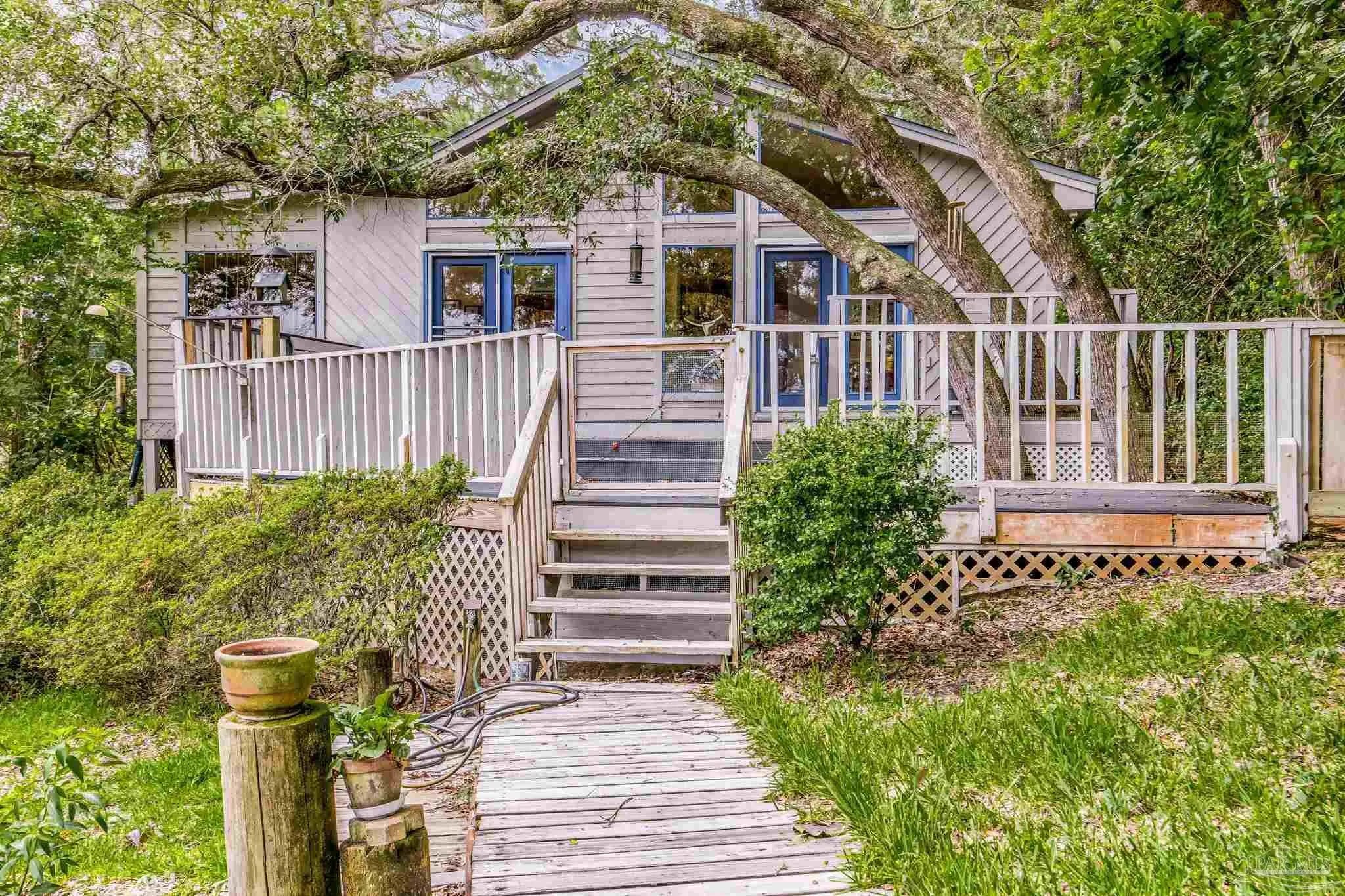 *MOTIVATED SELLER*Nature Lover’s Dream! With over 200 feet overlooking pristine East Bay, this charming, character-filled cottage offers breathtaking views, majestic live oaks, sawgrass, a small creek, and all the incredible wildlife you could ask for! Nestled on the edge of Beaver Pond Marsh along the peaceful, shaded Hickory Shores Blvd, this 3-bedroom, 2-bath home features a desirable split floor plan, cathedral ceilings, and an abundance of large windows that flood the space with natural light and showcase stunning waterfront scenes. The updated kitchen boasts granite countertops, a custom tiled backsplash, and stainless steel appliances. Enjoy meals with a view from the formal dining area or the separate breakfast nook, both overlooking the bay and marsh. The primary suite offers a tiled walk-in shower, a separate make-up vanity, and a spacious walk-in closet. Two additional guest bedrooms are generously sized, with a full guest bath that includes a deep walk-in closet plus a linen closet for extra storage. Step out from the living and dining areas onto a large composite deck—perfect for taking in the views and bay breezes. The private pier is ready for your fishing poles, cast nets, and camera, with dolphin, redfish, mullet, trout, and crabs in abundance. Bird enthusiasts will love watching osprey, pelicans, bald eagles, herons, and the spectacular sunsets. Additional highlights include a one-car carport and a large storage area underneath, ideal for yard tools, bicycles, paddleboards, and kayaks. Major updates include a brand-new roof (June 2025), HVAC (2020), and water heater (2023). Make your appointment to see this jewel today!