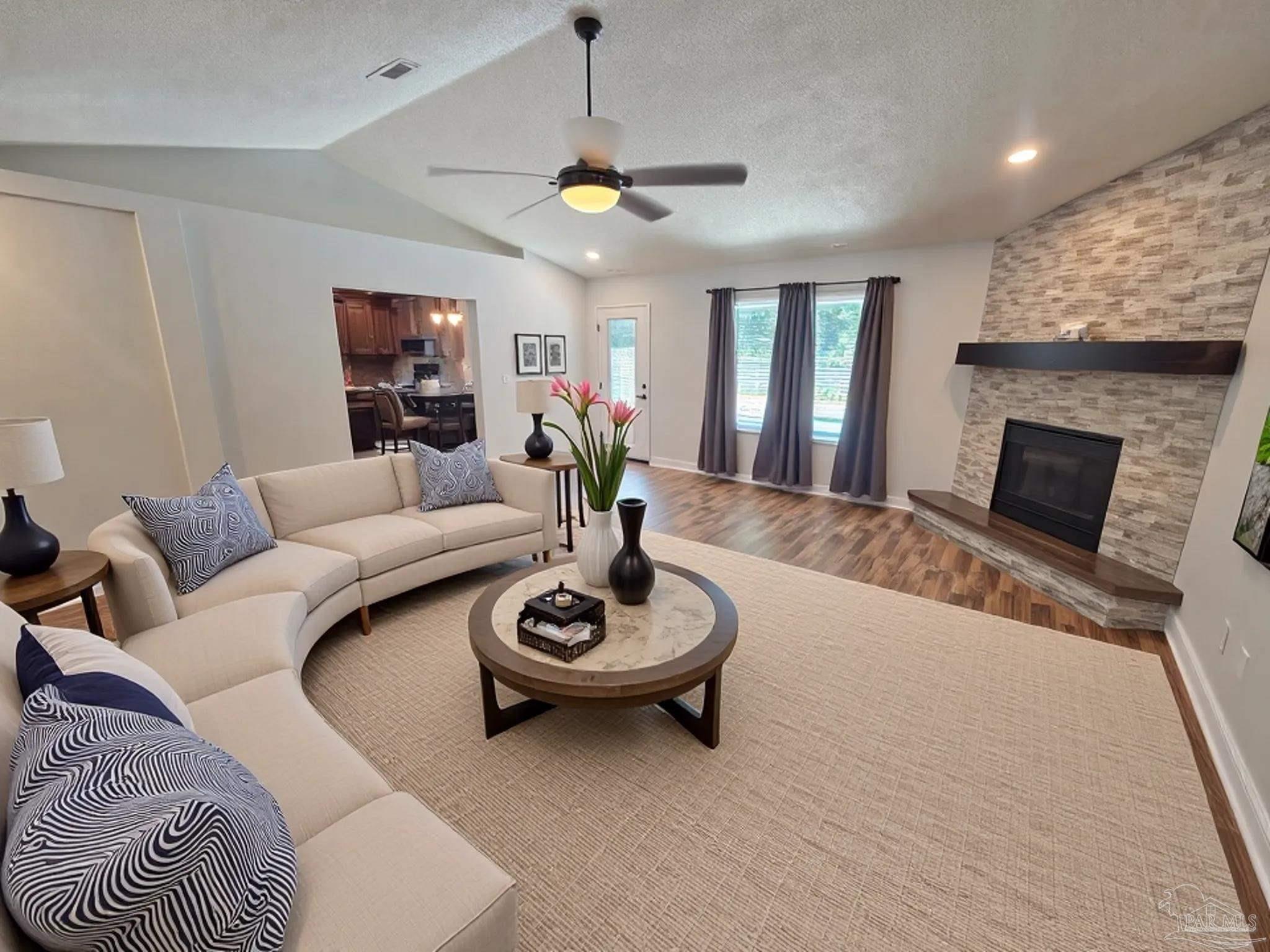 SO many updates and unique luxury touches in this beautiful Cantonment pool home! Do you love to entertain? Oh man, is this the home for you! We've got a massive kitchen with 2 ovens and a gas cooktop! A spacious island, wine rack, wine cooler, a double panty, granite countertops and an abundance of soft close cabinets make this home a cook's dream! Outside is a private backyard pool oasis. Beautiful flowering trees and shrubs surround the sparkling pool with a brand new liner. Plenty of space to relax here too, with the lovely factor that the land behind the house is all designated green space. Back inside we have a gas fireplace with stone surround, a flex space that could be an office/formal dining room/workout room/play room etc, 3 bedrooms, 2 of which have walk in closets, 2 stunning bathrooms - both with stone showers - hall bath has a jetted tub, master bath features an oversize shower with 2 shower heads. There are also solar panels (which will be paid off at closing) making your power bill almost non-existent. Yes, even with a pool! Home also features hurricane shutters, fresh paint in common areas, 2015 roof, 2015 HVAC, tankless hot water heater from last year, windows and doors from 2017, 2 car garage, a 5 year termite prevention plan, and many other wonderful features.