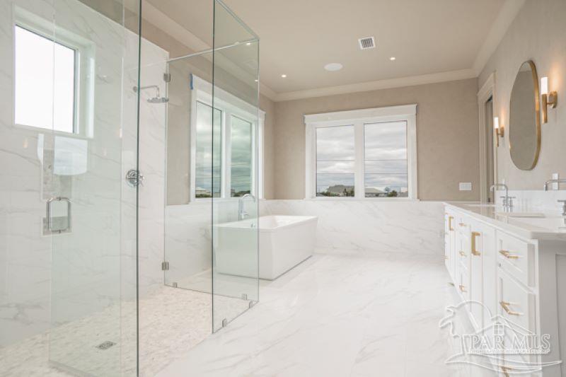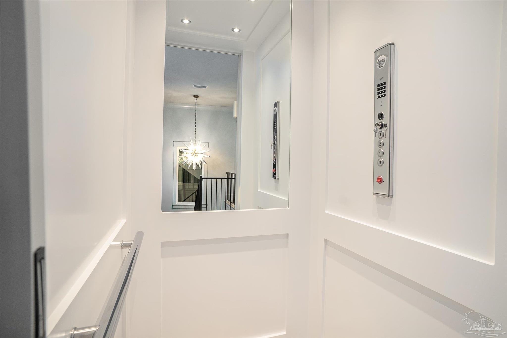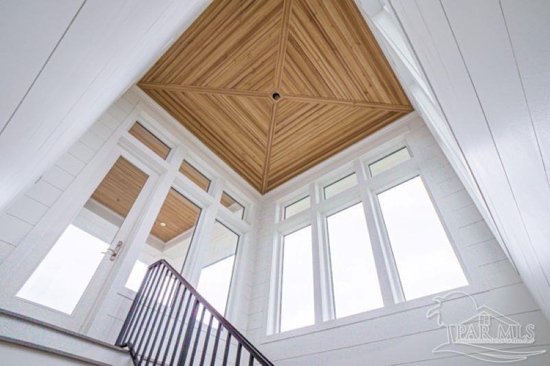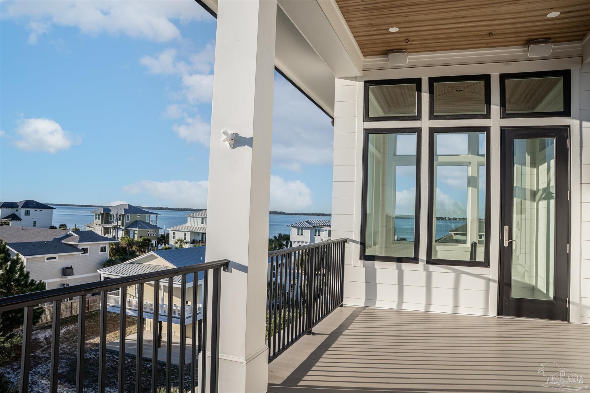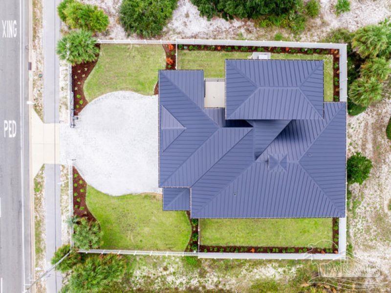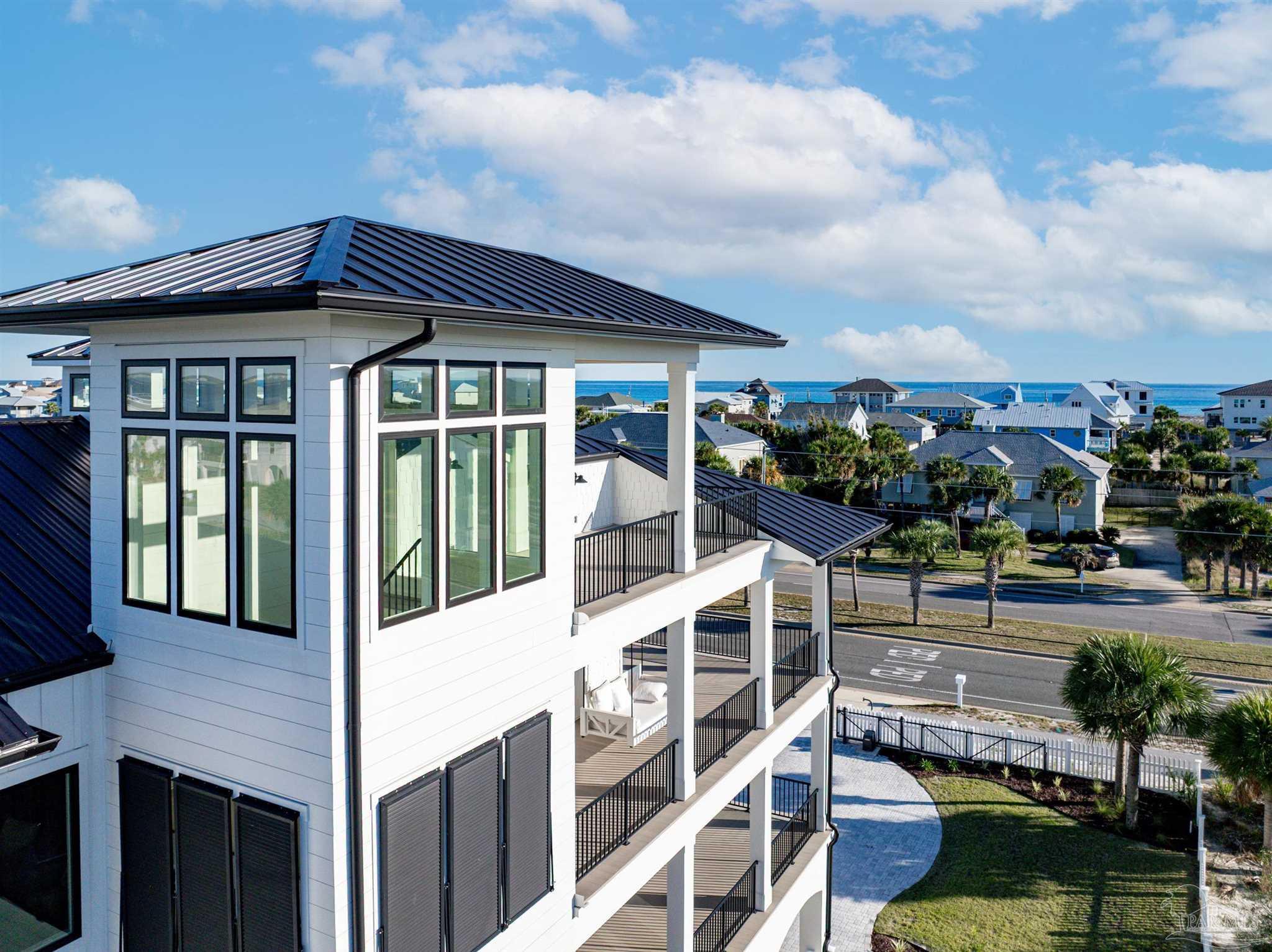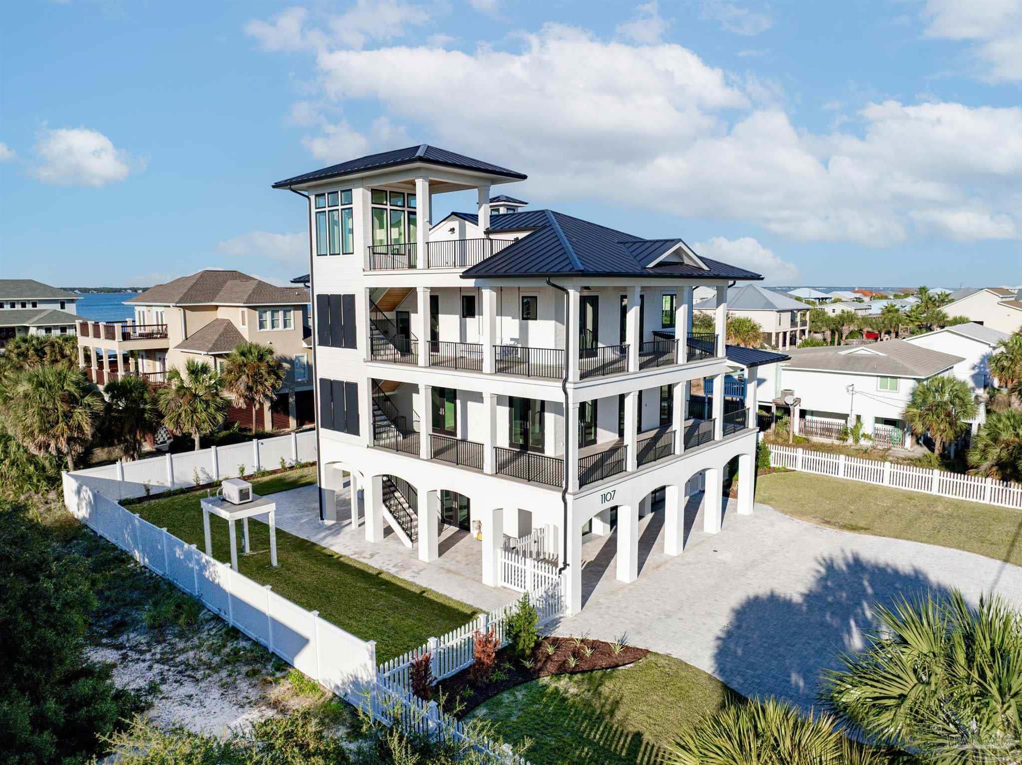 One of the most attractive residences on all of P-beach & believed to be the tallest residential home on the Beach giving views of the Sound & the Gulf. Boasting Elite Caliber finishes plus efficient dollar saving home hardening construction materials installed by craftsmen & perfectly placed on a rare larger estate size .29-acre lot w the entire perimeter enveloped by a heavy-duty custom vinyl fencing system w motorized gate. Parking is a breeze w the unique 50 ft paver parking round about. One of the few home sites that sits adjacent to a 15 ft easement that runs North & South from the sound to the gulf. If you enjoy outdoor living space this beautiful abode has appx 3500 SF of covered outdoor decks w tongue & groove exterior ceiling system at all decks, patios & stairwells. The large ground level covered porch at the rear of the home is well suited for your future outdoor kitchen & flows well with the side yard which can accommodate the attached pool design without a variance. Low maintenance construction & extra attention to detail offer significant insurance, utility & maintenance savings. Enhanced efficiency standards are: larger 14” pilings versus 12” installed to 20’ piling ground depth versus 15’ standard; built 18' above sea level 5' above the base flood elevation; all stainless steel fasteners; structural soffits; go bolt threaded rod anchoring system; spray foam insulation; Senergy encapsulated seal coat exterior polymer system; Aeritis tongue & groove decking; stained & sealed tongue & groove ceilings at all covered porches; 3500sf of covered outdoor living space; 799sf insulated & finished garage; custom gutter system w underground drainage; custom paver walkways; double pane low-e impact Colby Casement windows & Neuma doors w/3 point locking system; white glass aluminum garage doors; aluminum hand rails w/powder coat finish; standing seam metal roof w peel & stick underlayment; large rooftop observation deck & Custom Cab elevator serving all levels.