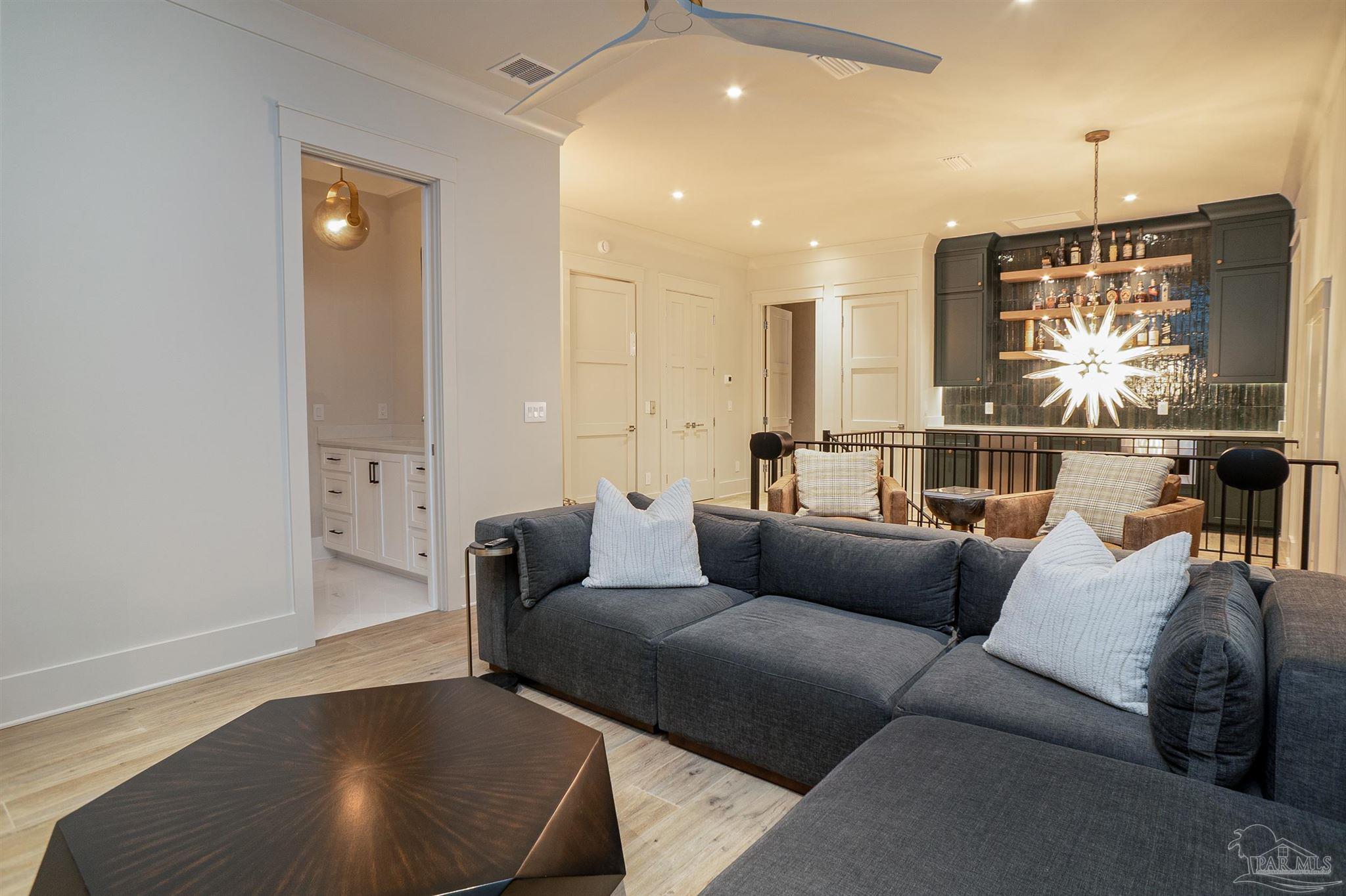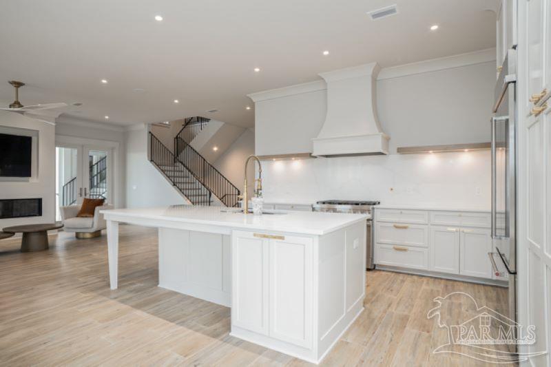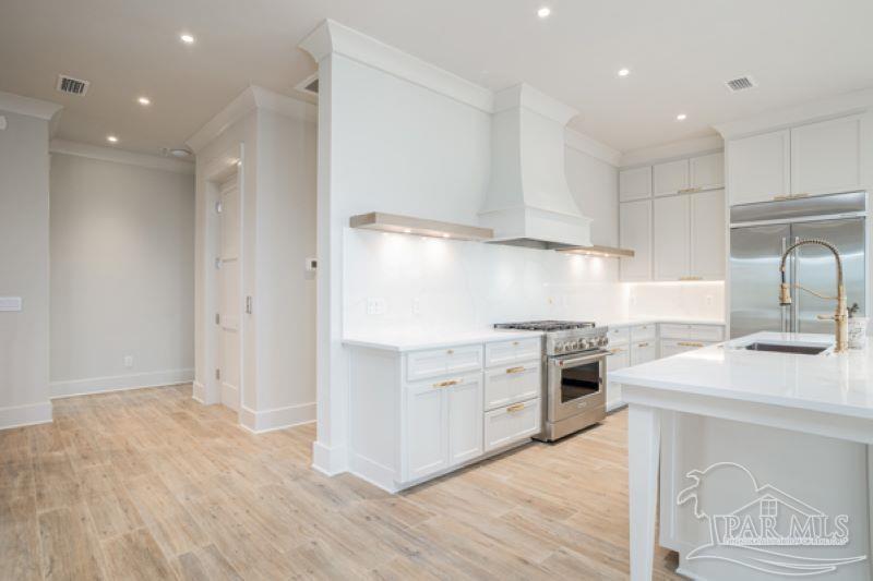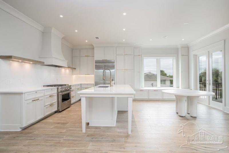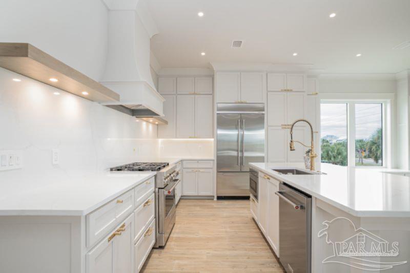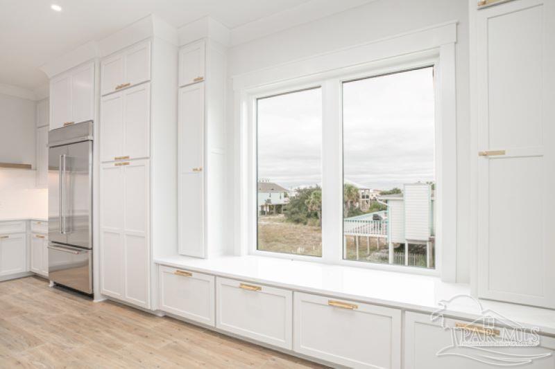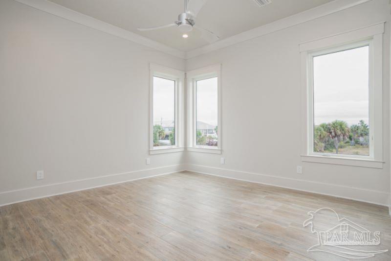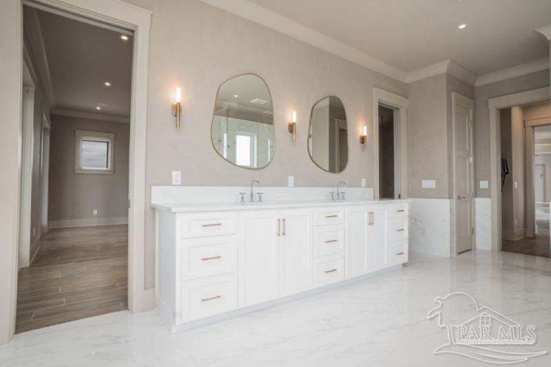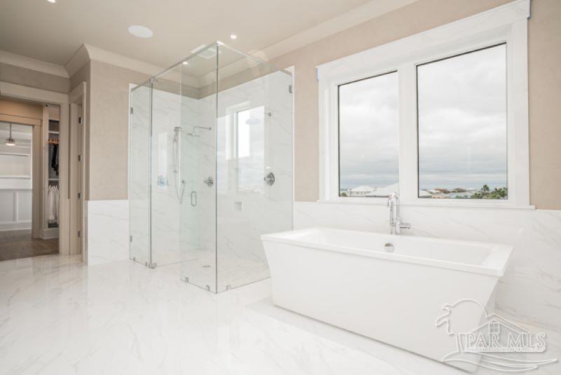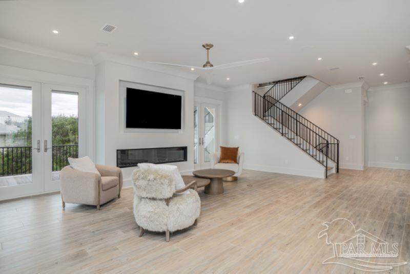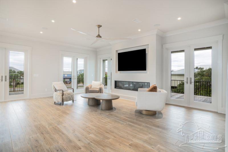 One of the most attractive residences on all of P-beach & believed to be the tallest residential home on the Beach giving views of the Sound & the Gulf. Boasting Elite Caliber finishes plus efficient dollar saving home hardening construction materials installed by craftsmen & perfectly placed on a rare larger estate size .29-acre lot w the entire perimeter enveloped by a heavy-duty custom vinyl fencing system w motorized gate. Parking is a breeze w the unique 50 ft paver parking round about. One of the few home sites that sits adjacent to a 15 ft easement that runs North & South from the sound to the gulf. If you enjoy outdoor living space this beautiful abode has appx 3500 SF of covered outdoor decks w tongue & groove exterior ceiling system at all decks, patios & stairwells. The large ground level covered porch at the rear of the home is well suited for your future outdoor kitchen & flows well with the side yard which can accommodate the attached pool design without a variance. Low maintenance construction & extra attention to detail offer significant insurance, utility & maintenance savings. Enhanced efficiency standards are: larger 14” pilings versus 12” installed to 20’ piling ground depth versus 15’ standard; built 18' above sea level 5' above the base flood elevation; all stainless steel fasteners; structural soffits; go bolt threaded rod anchoring system; spray foam insulation; Senergy encapsulated seal coat exterior polymer system; Aeritis tongue & groove decking; stained & sealed tongue & groove ceilings at all covered porches; 3500sf of covered outdoor living space; 799sf insulated & finished garage; custom gutter system w underground drainage; custom paver walkways; double pane low-e impact Colby Casement windows & Neuma doors w/3 point locking system; white glass aluminum garage doors; aluminum hand rails w/powder coat finish; standing seam metal roof w peel & stick underlayment; large rooftop observation deck & Custom Cab elevator serving all levels.