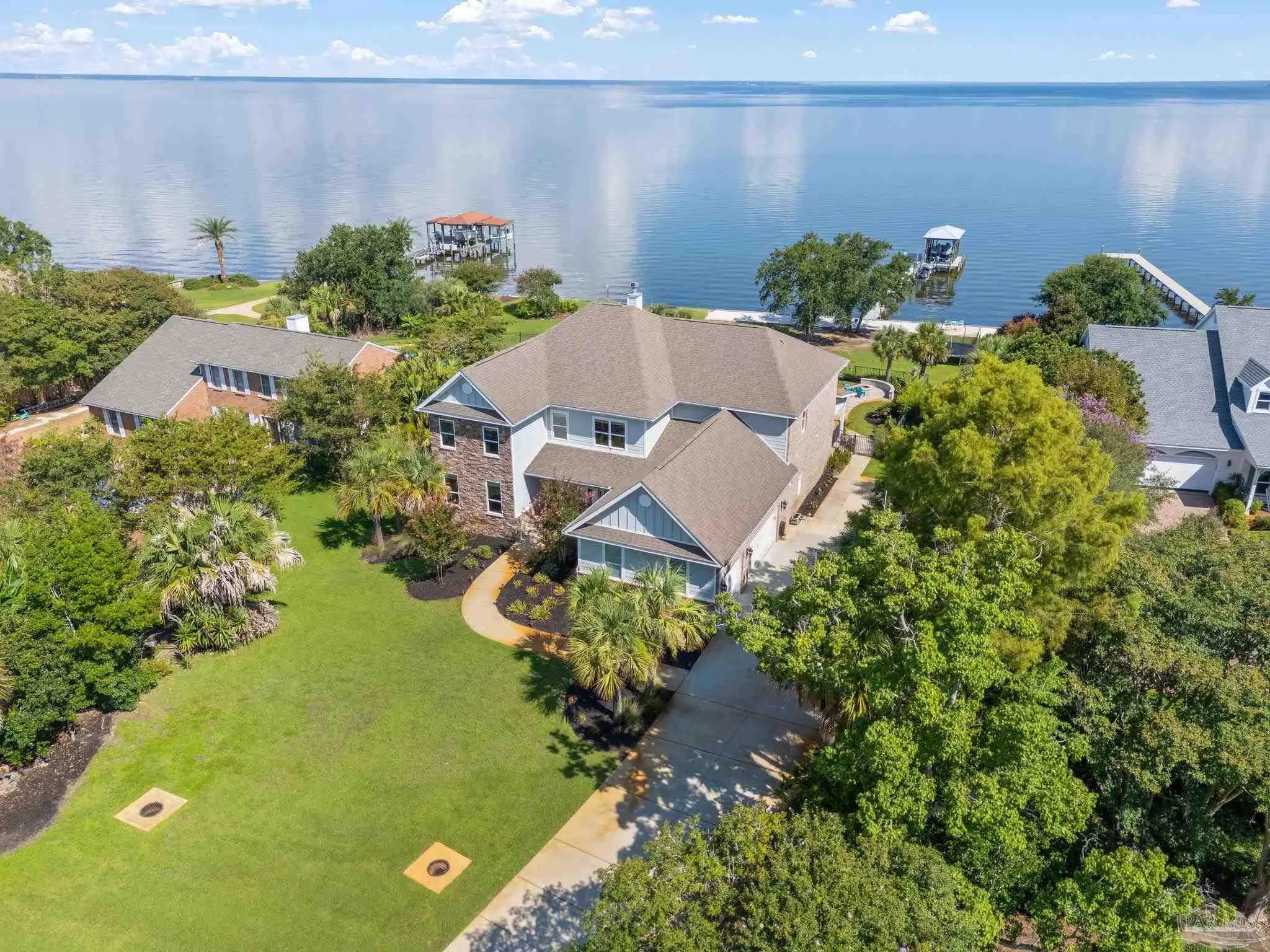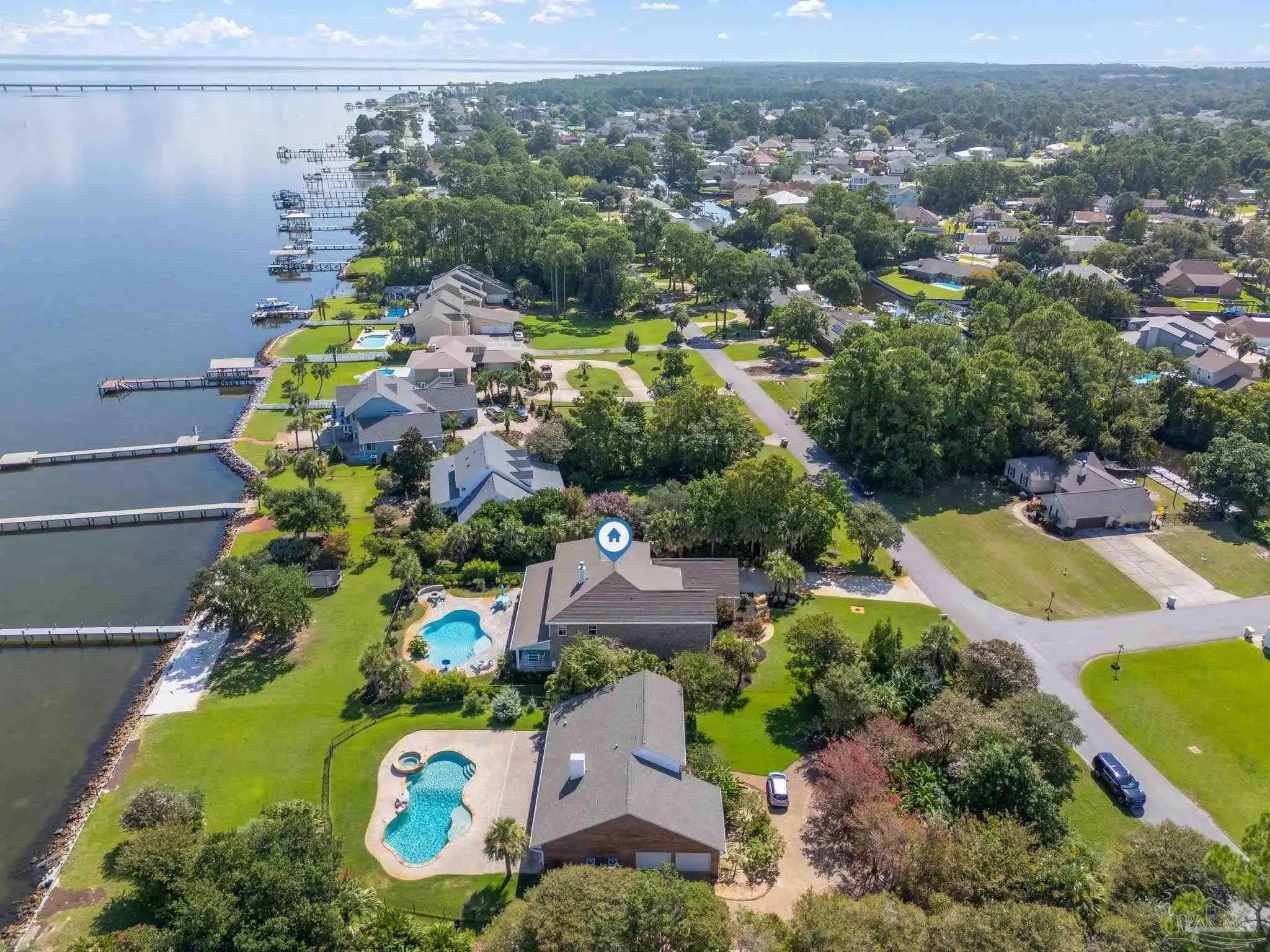 Come experience the luxury of waterfront living in Gulf Breeze just 5 miles from the Pensacola Beach Bridge! This spacious 6 bedroom, 4 bathroom family home is located on Pensacola Bay between Garcon Point Bridge and Naval Live Oaks Nature Preserve. Step outside to where a gas-heated (2022)pool, private beach (2022), and built in fire pit invites year-round entertainment & enjoyment. The expansive flow-through pier includes a boat house, boat lift(2022), two jet ski lifts(2022), and a rock wall, making it a boater’s paradise. You can watch the Blue Angels fly over & dolphins swimming around the bay, right from your pier! This home features a spacious dining room, a casual dining space, updated fixtures and paint throughout, and the most unique coastal vibe. The kitchen boasts a double oven (2024), lots of endless cabinet space, cabinet space under the kitchen island, a gas stove, and a boasts a beautiful water view. The master suite is located on the first floor and has a great water view for relaxation and tranquility. On the second floor, this home has a versatile flex room with custom-built shelving and cabinetry—perfect for a playroom, home office, or media space. This home also has a three car garage with built in shelving for great storage space, a walk-in attic on the second floor for extra storage, and an irrigation well. Situated on a generous lot in a sought-after waterfront community, this home offers ample space for outdoor activities, whether entertaining guests or enjoying a peaceful evening by the water. The neighborhood is ideal for dog walks, bike rides, and golf cart rides, creating the perfect coastal lifestyle. Don’t miss this rare opportunity to own a premier Pensacola Bay property in Gulf Breeze, just minutes from Pensacola Beach!