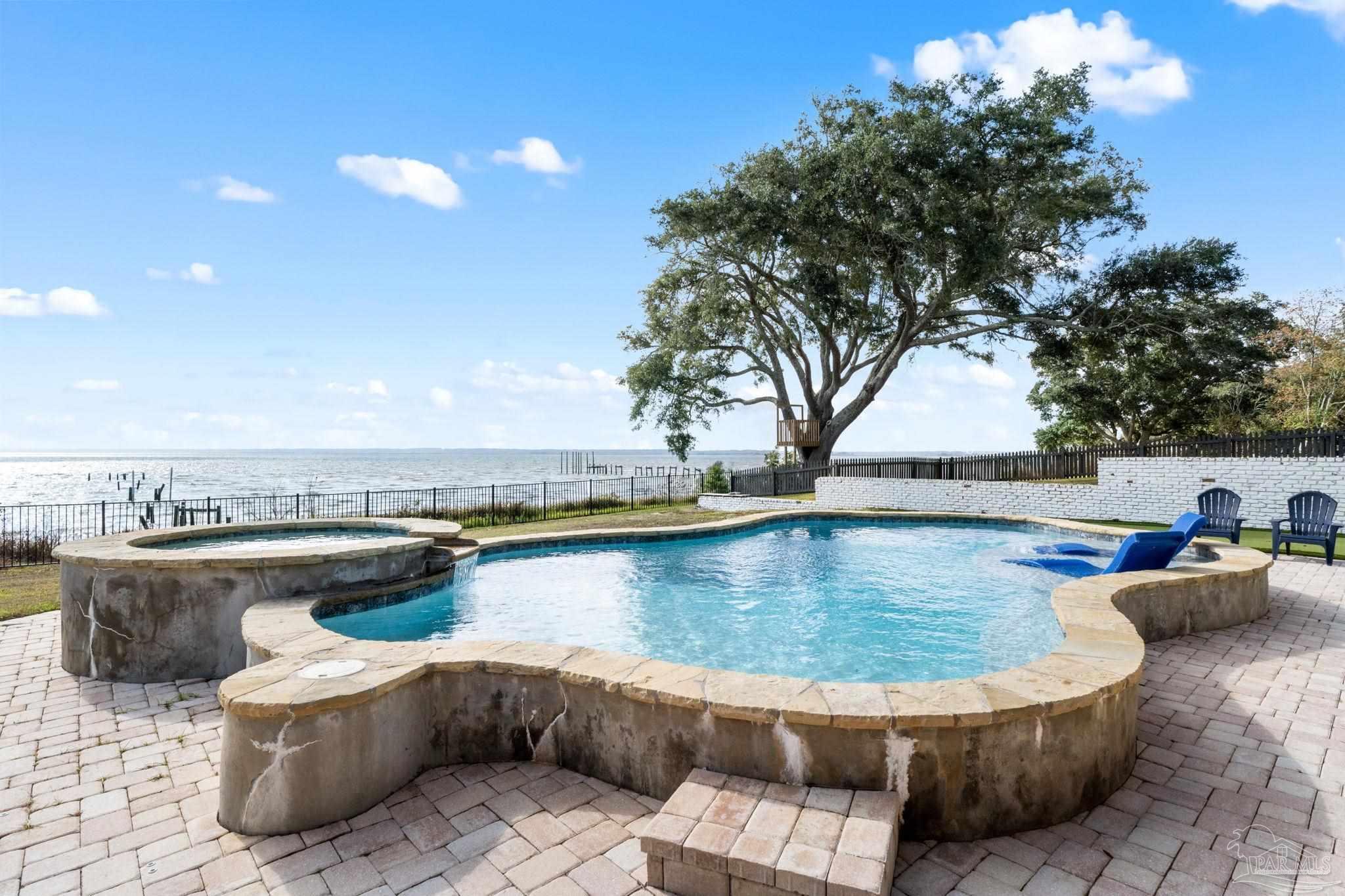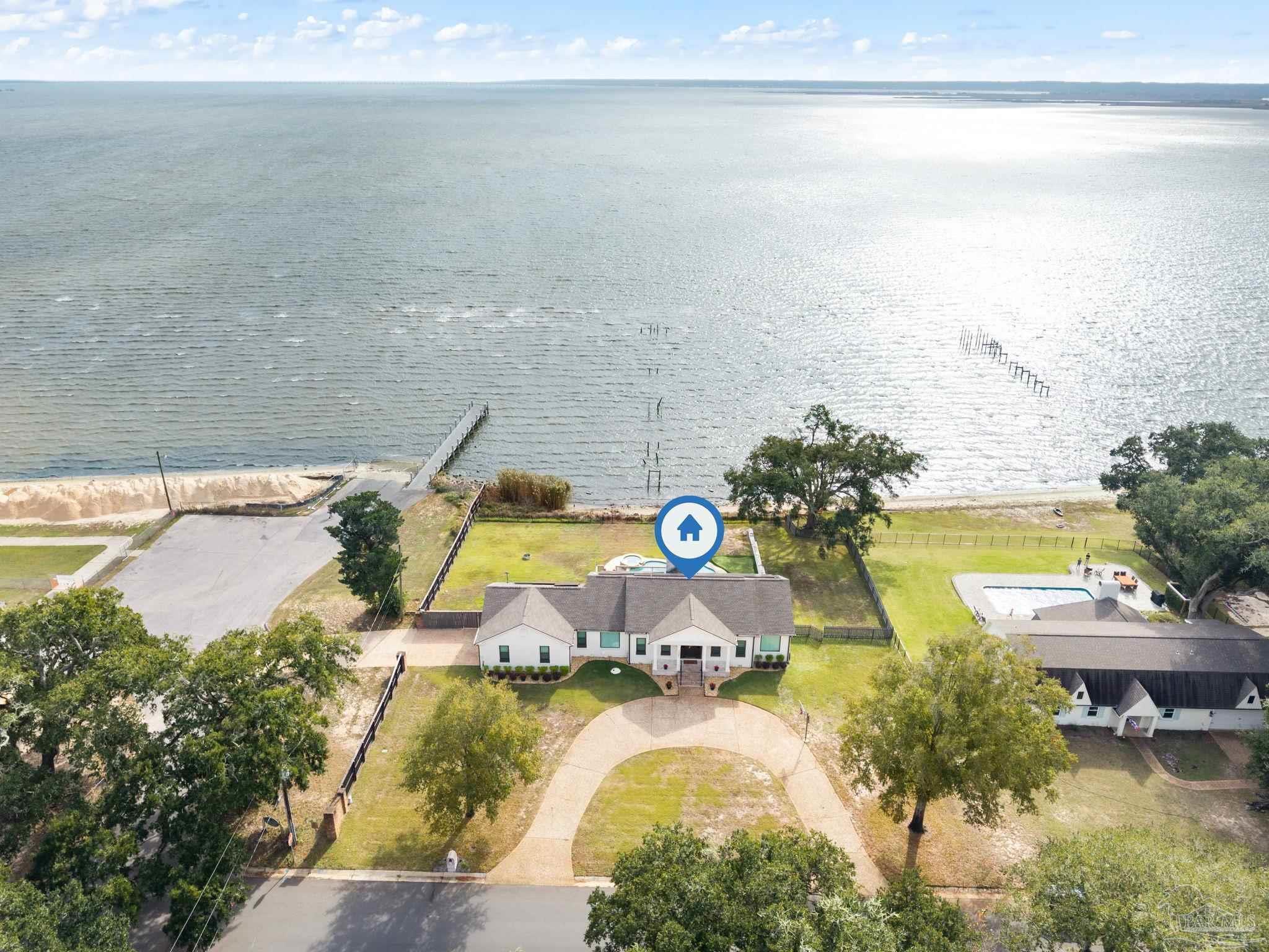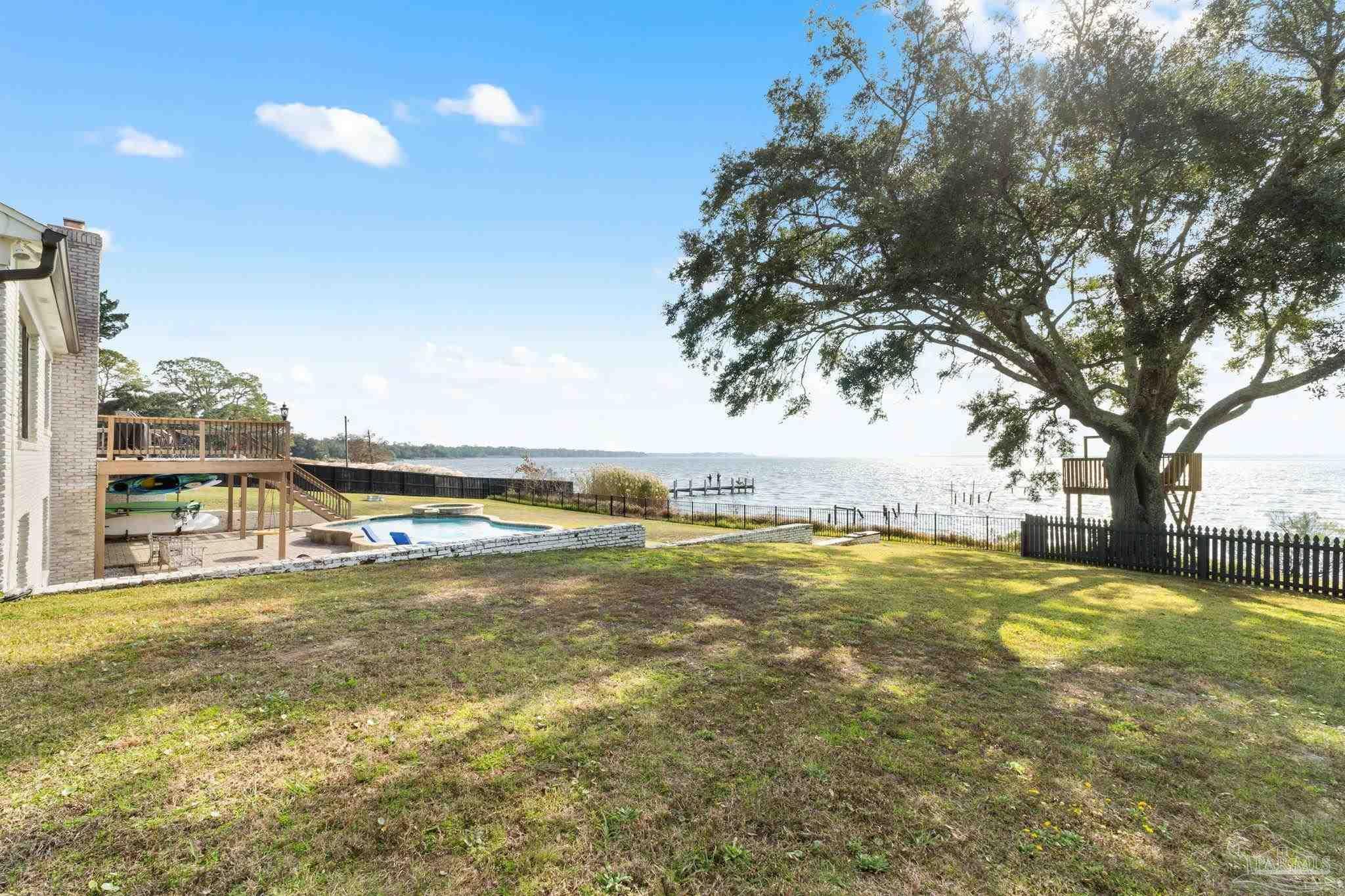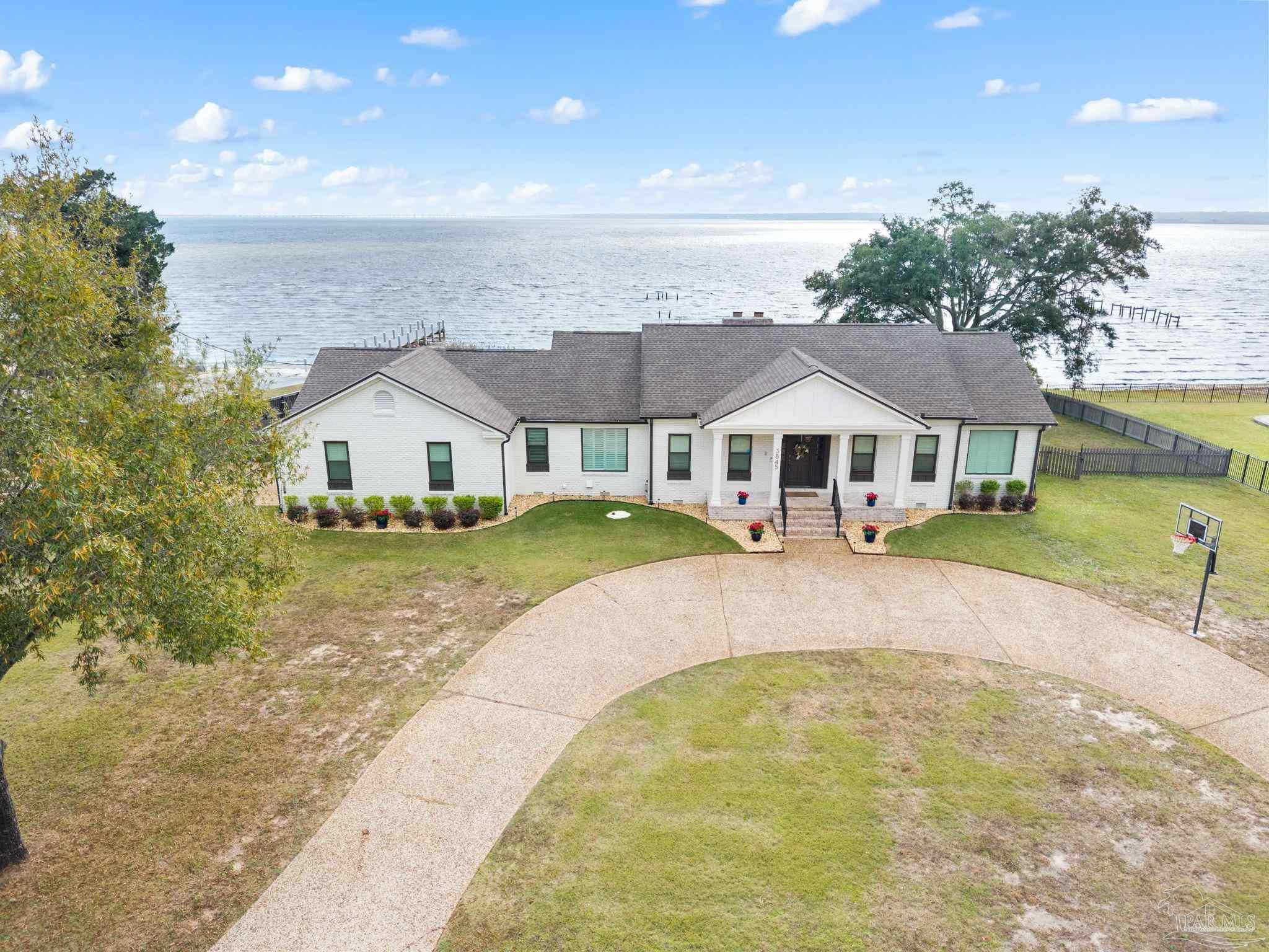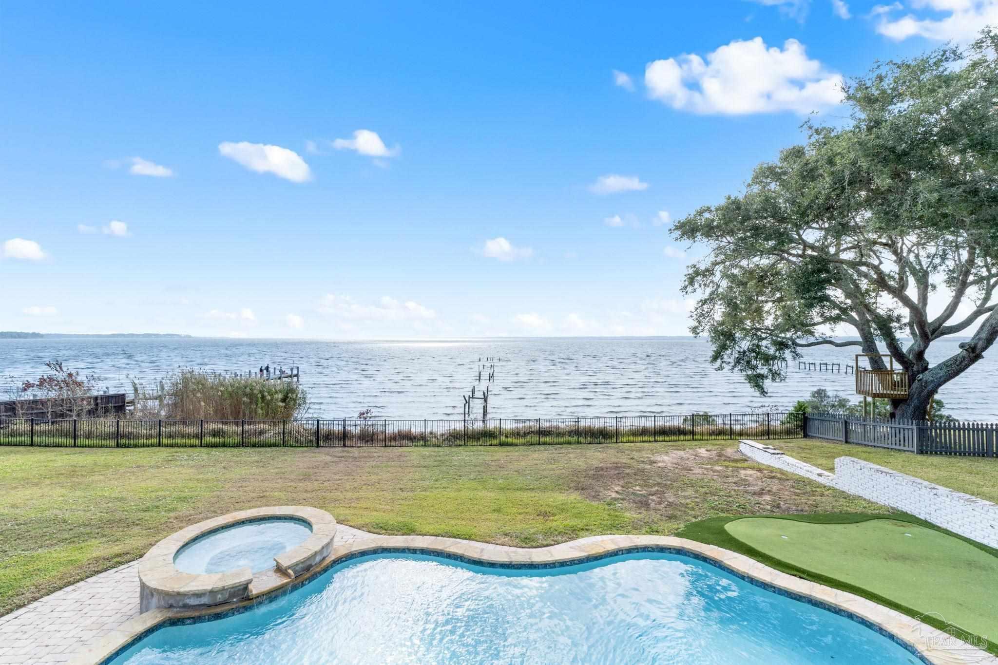 Stunning renovated home on Andrew Jackson Drive, offering 150 feet of waterfront on Escambia Bay. Sitting on nearly an acre, this waterfront paradise features a gunite pool, spa, and a putting green. Enjoy breathtaking sunsets from this 4bedroom, 3bath residence, with water views captured from almost every room. While a portion of the lot is located in a flood zone, the home is not making flood insurance more affordable. New renovation in 2024. Step through the foyer into the spacious main living area on the first level, where panoramic water views greet you. The living room has a wood-burning fireplace and built-in floor-to-ceiling bookcases, ideal for displaying your favorite collections. The bright and airy kitchen and dining space are equipped with abundant cabinets, stone countertops, and a double oven. A large walk-in pantry offers ample storage and bar seating provides casual eating options. The primary suite is a retreat with gorgeous bay vistas, featuring a luxurious bathroom with a double vanity, built-in shelves, a soaking tub, and a large tiled shower. A generous walk-in closet ensures plenty of space for your wardrobe. Additional first-floor amenities include a second bedroom, full bath, laundry room, and direct access to an open deck overlooking the bay. Downstairs, you'll find a spacious family room with a fireplace and built-in cabinetry, perfect for gatherings. This level also includes two more bedrooms with bay and pool views, a full bath, two versatile bonus rooms ideal for offices or guest suites, and additional storage closets. Enjoy outdoor living with a covered patio leading to the sparkling gunite pool, spa, and putting green.The backyard offers an expansive green space for entertaining, along with an observation/platform tree fort for the kids.This unique gem combines luxurious updates, breathtaking views, and outdoor fun—an exceptional waterfront lifestyle waiting to be discovered.