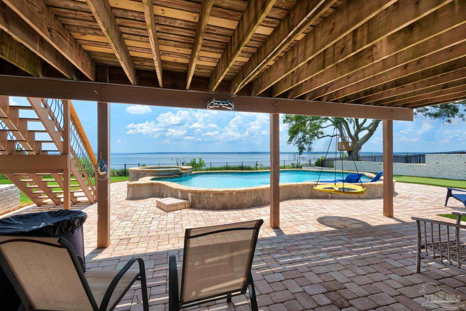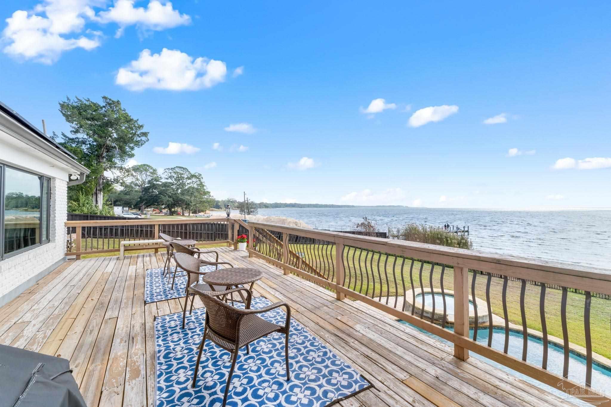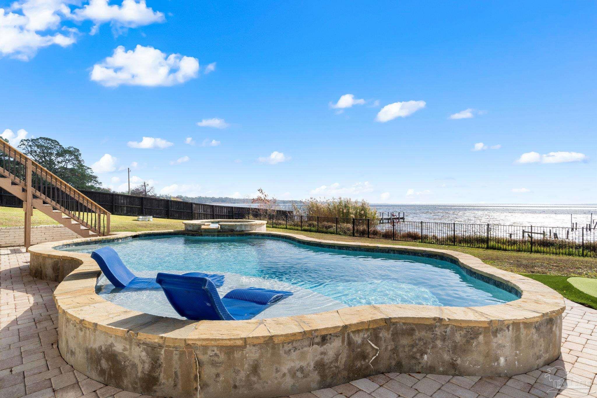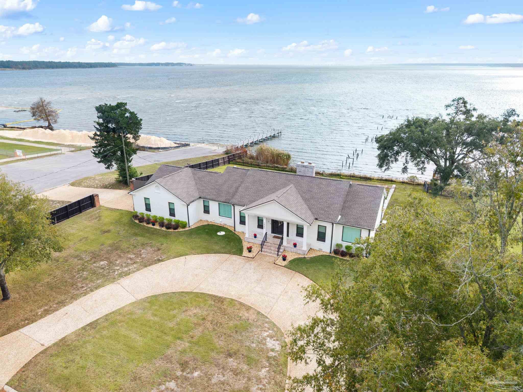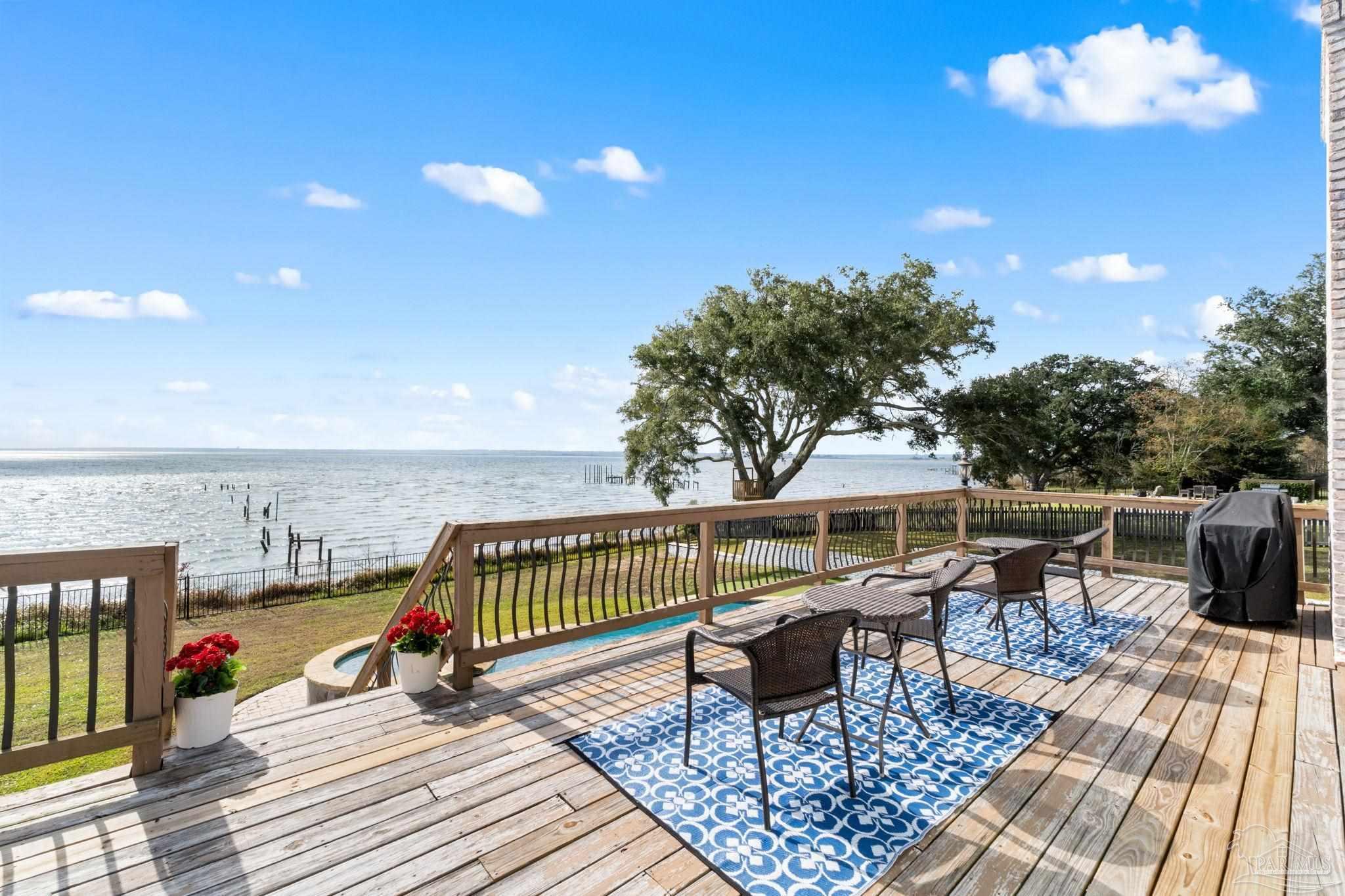 Stunning renovated home on Andrew Jackson Drive, offering 150 feet of waterfront on Escambia Bay. Sitting on nearly an acre, this waterfront paradise features a gunite pool, spa, and a putting green. Enjoy breathtaking sunsets from this 4bedroom, 3bath residence, with water views captured from almost every room. While a portion of the lot is located in a flood zone, the home is not making flood insurance more affordable. New renovation in 2024. Step through the foyer into the spacious main living area on the first level, where panoramic water views greet you. The living room has a wood-burning fireplace and built-in floor-to-ceiling bookcases, ideal for displaying your favorite collections. The bright and airy kitchen and dining space are equipped with abundant cabinets, stone countertops, and a double oven. A large walk-in pantry offers ample storage and bar seating provides casual eating options. The primary suite is a retreat with gorgeous bay vistas, featuring a luxurious bathroom with a double vanity, built-in shelves, a soaking tub, and a large tiled shower. A generous walk-in closet ensures plenty of space for your wardrobe. Additional first-floor amenities include a second bedroom, full bath, laundry room, and direct access to an open deck overlooking the bay. Downstairs, you'll find a spacious family room with a fireplace and built-in cabinetry, perfect for gatherings. This level also includes two more bedrooms with bay and pool views, a full bath, two versatile bonus rooms ideal for offices or guest suites, and additional storage closets. Enjoy outdoor living with a covered patio leading to the sparkling gunite pool, spa, and putting green.The backyard offers an expansive green space for entertaining, along with an observation/platform tree fort for the kids.This unique gem combines luxurious updates, breathtaking views, and outdoor fun—an exceptional waterfront lifestyle waiting to be discovered.