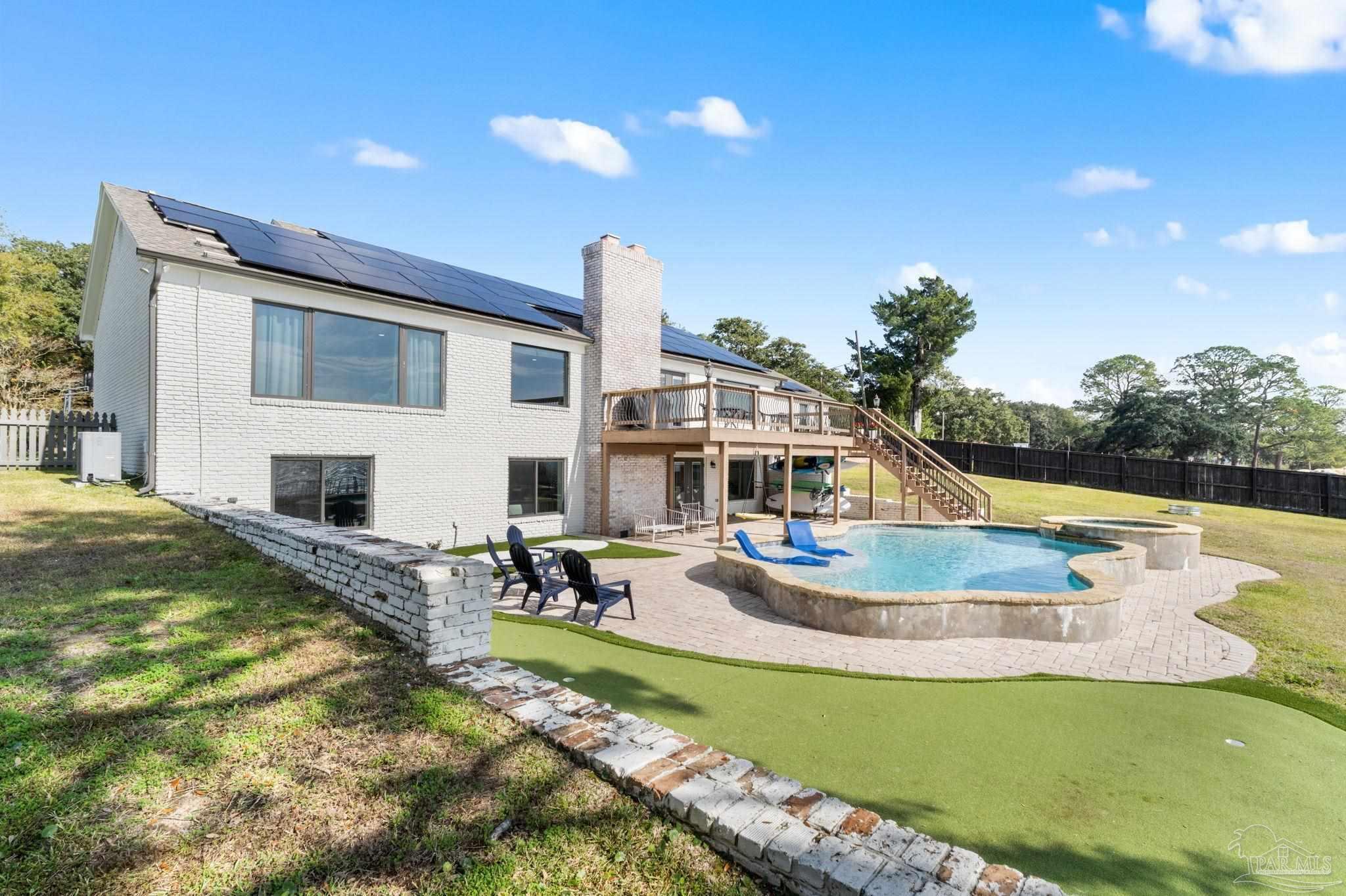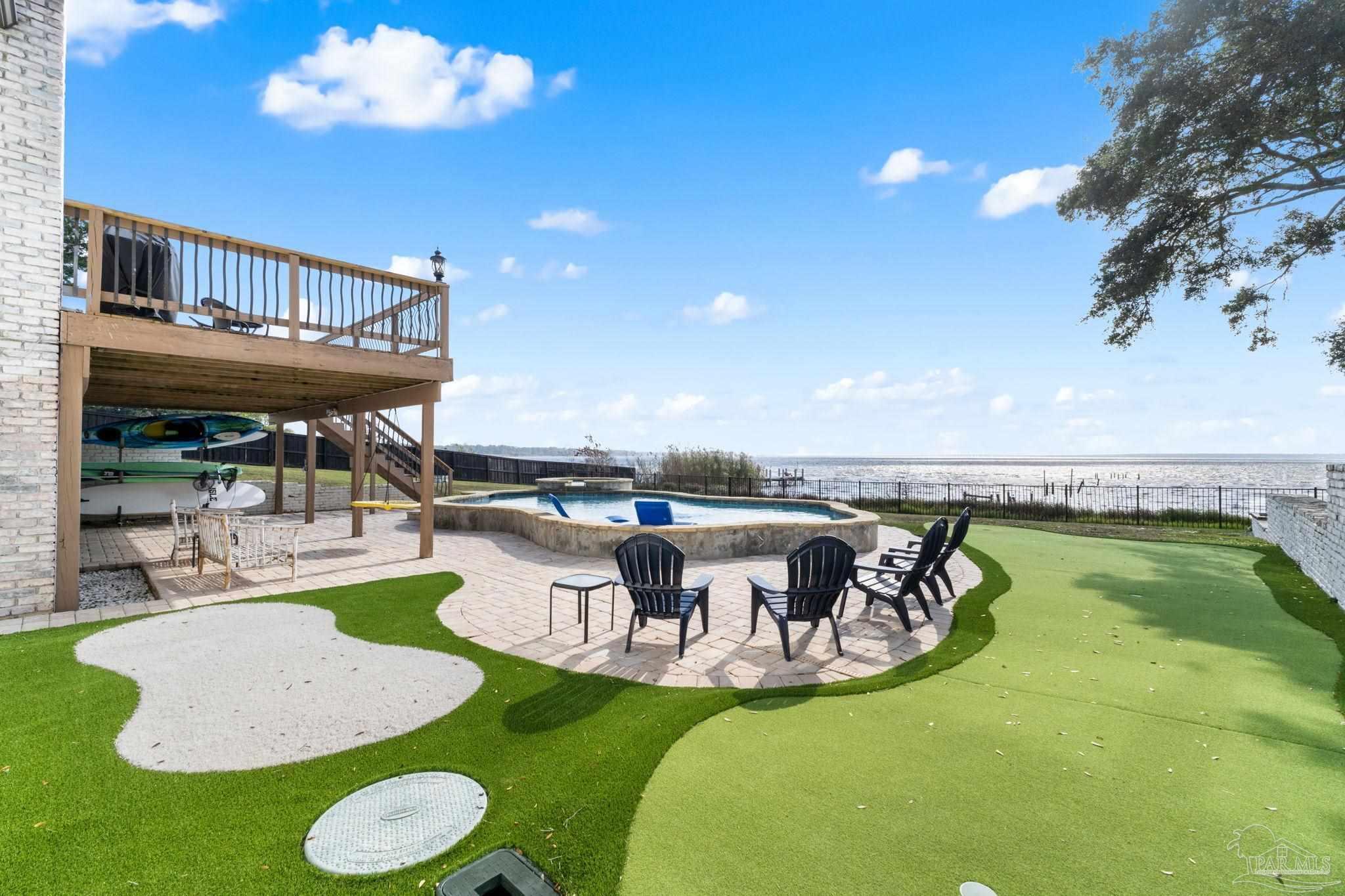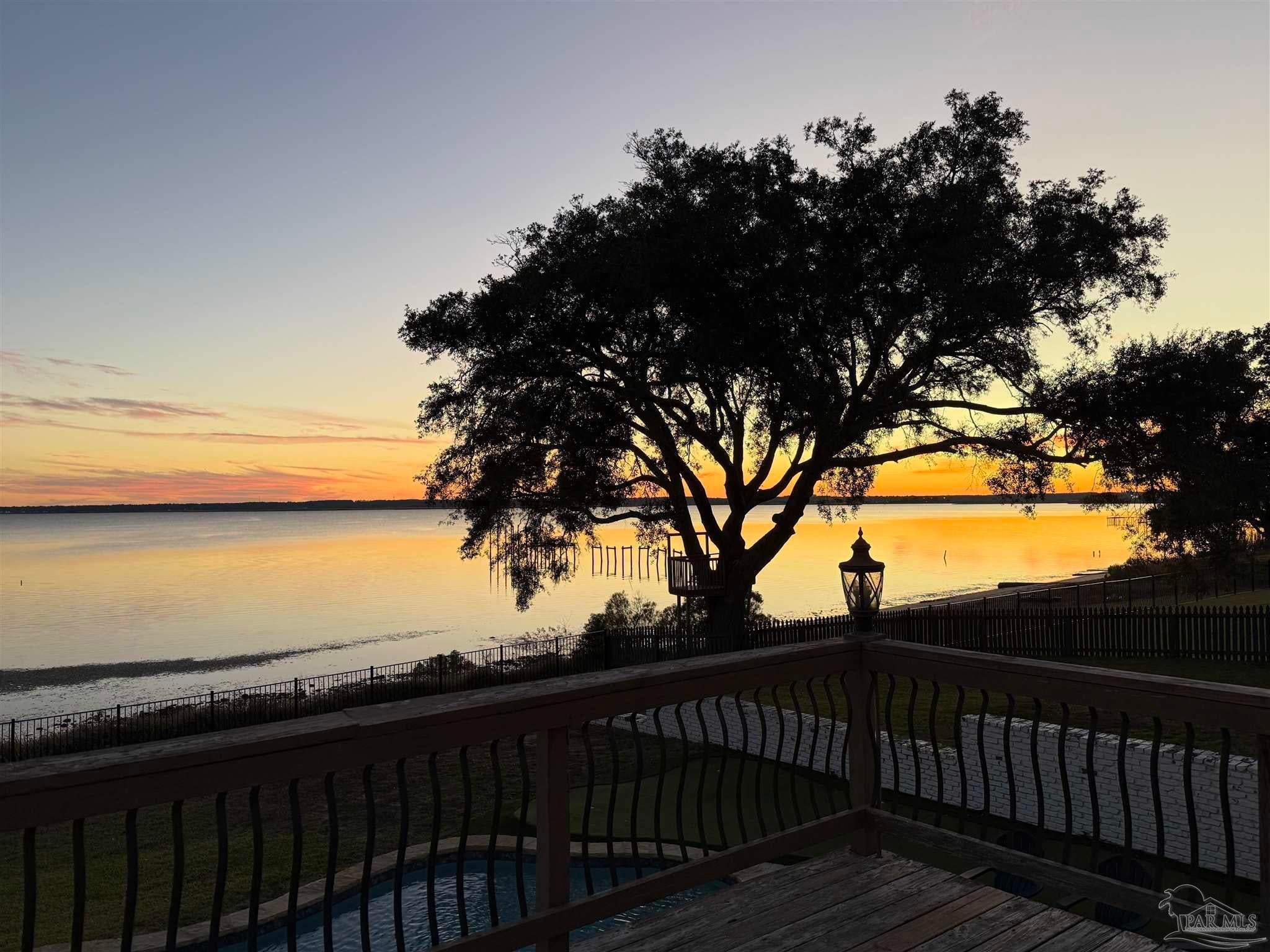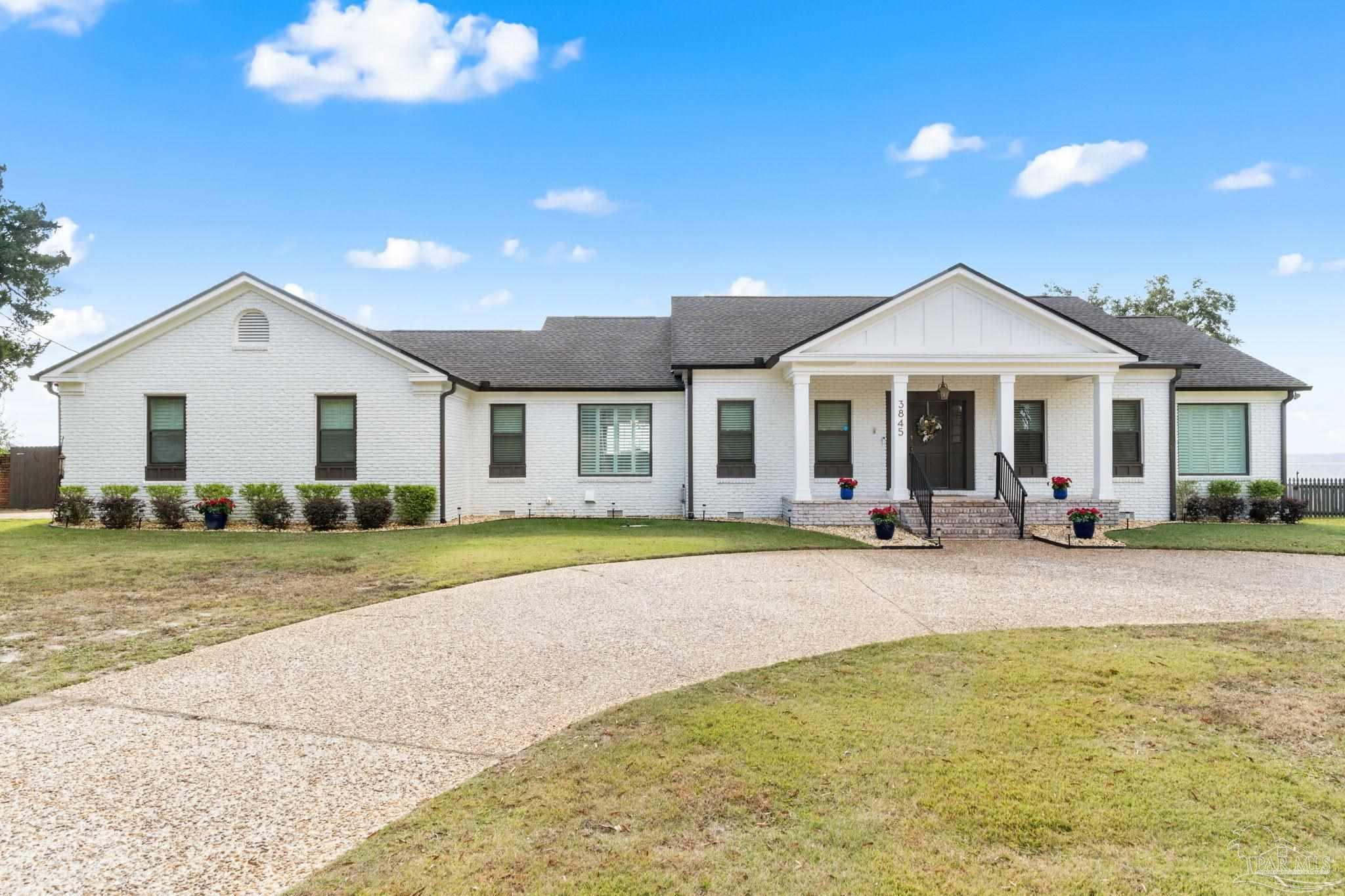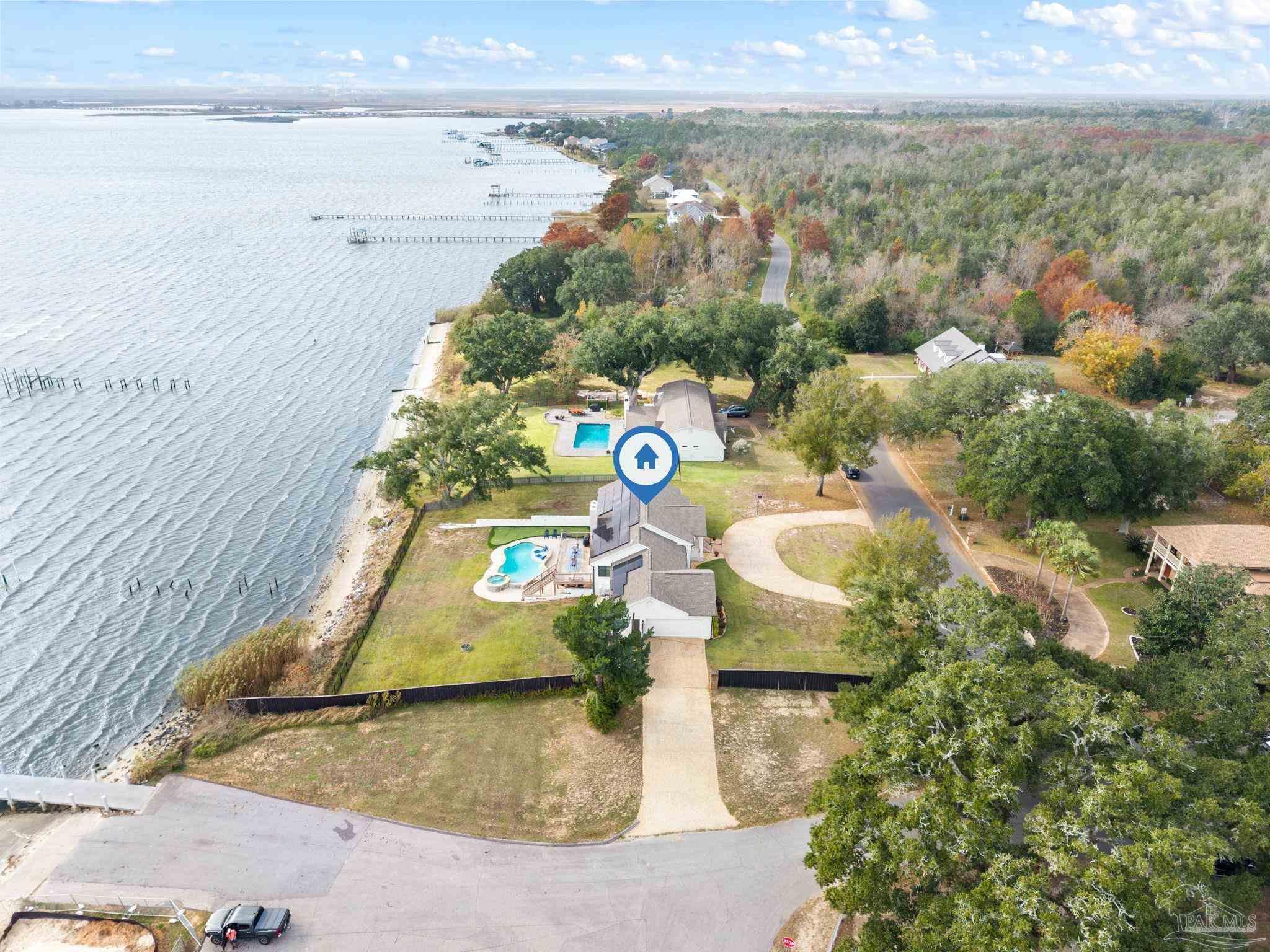 Stunning renovated home on Andrew Jackson Drive, offering 150 feet of waterfront on Escambia Bay. Sitting on nearly an acre, this waterfront paradise features a gunite pool, spa, and a putting green. Enjoy breathtaking sunsets from this 4bedroom, 3bath residence, with water views captured from almost every room. While a portion of the lot is located in a flood zone, the home is not making flood insurance more affordable. New renovation in 2024. Step through the foyer into the spacious main living area on the first level, where panoramic water views greet you. The living room has a wood-burning fireplace and built-in floor-to-ceiling bookcases, ideal for displaying your favorite collections. The bright and airy kitchen and dining space are equipped with abundant cabinets, stone countertops, and a double oven. A large walk-in pantry offers ample storage and bar seating provides casual eating options. The primary suite is a retreat with gorgeous bay vistas, featuring a luxurious bathroom with a double vanity, built-in shelves, a soaking tub, and a large tiled shower. A generous walk-in closet ensures plenty of space for your wardrobe. Additional first-floor amenities include a second bedroom, full bath, laundry room, and direct access to an open deck overlooking the bay. Downstairs, you'll find a spacious family room with a fireplace and built-in cabinetry, perfect for gatherings. This level also includes two more bedrooms with bay and pool views, a full bath, two versatile bonus rooms ideal for offices or guest suites, and additional storage closets. Enjoy outdoor living with a covered patio leading to the sparkling gunite pool, spa, and putting green.The backyard offers an expansive green space for entertaining, along with an observation/platform tree fort for the kids.This unique gem combines luxurious updates, breathtaking views, and outdoor fun—an exceptional waterfront lifestyle waiting to be discovered.