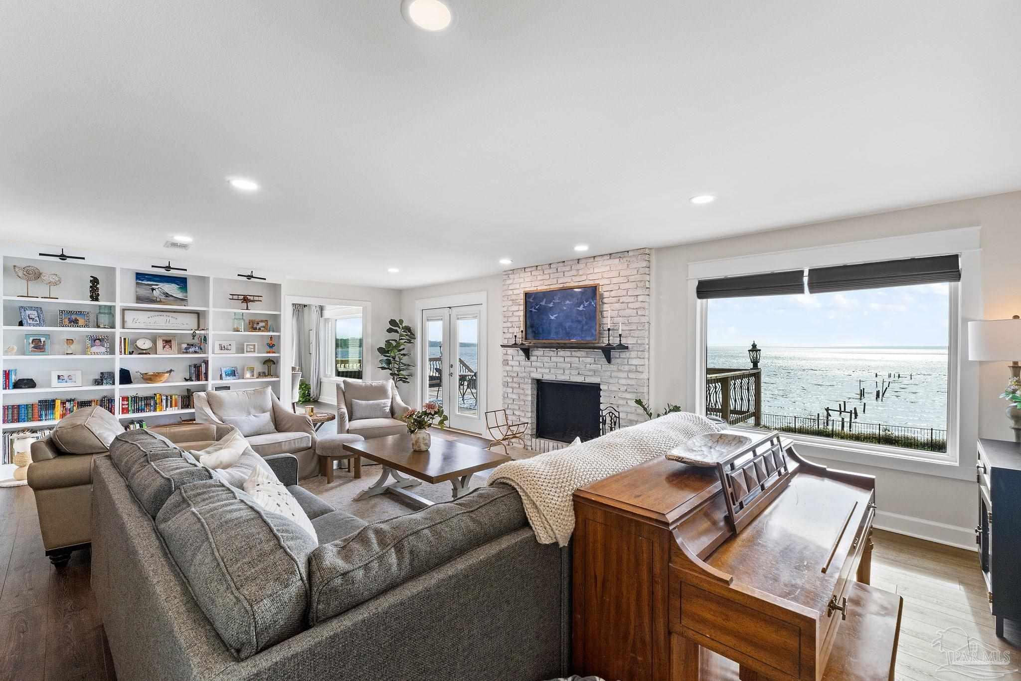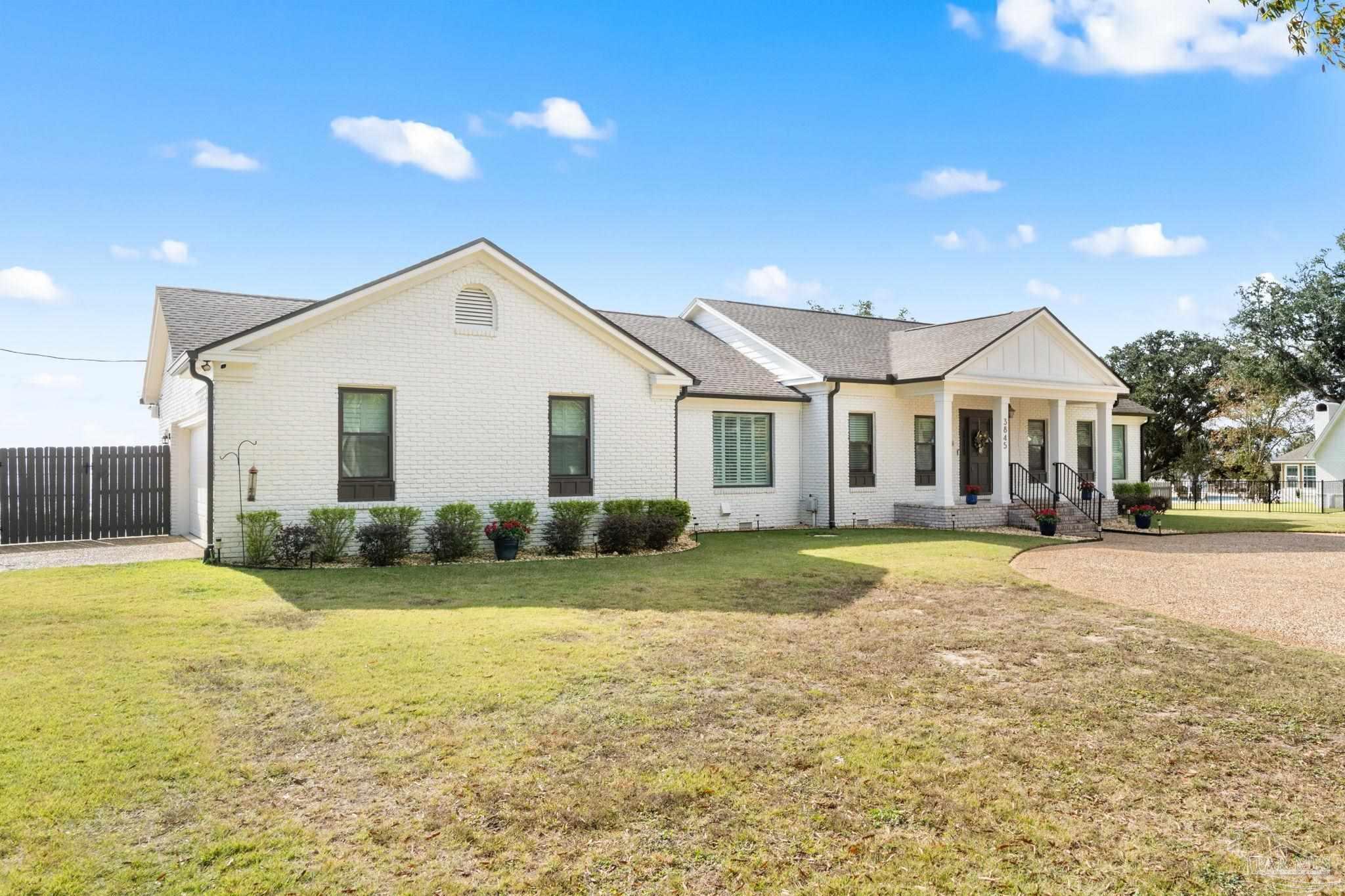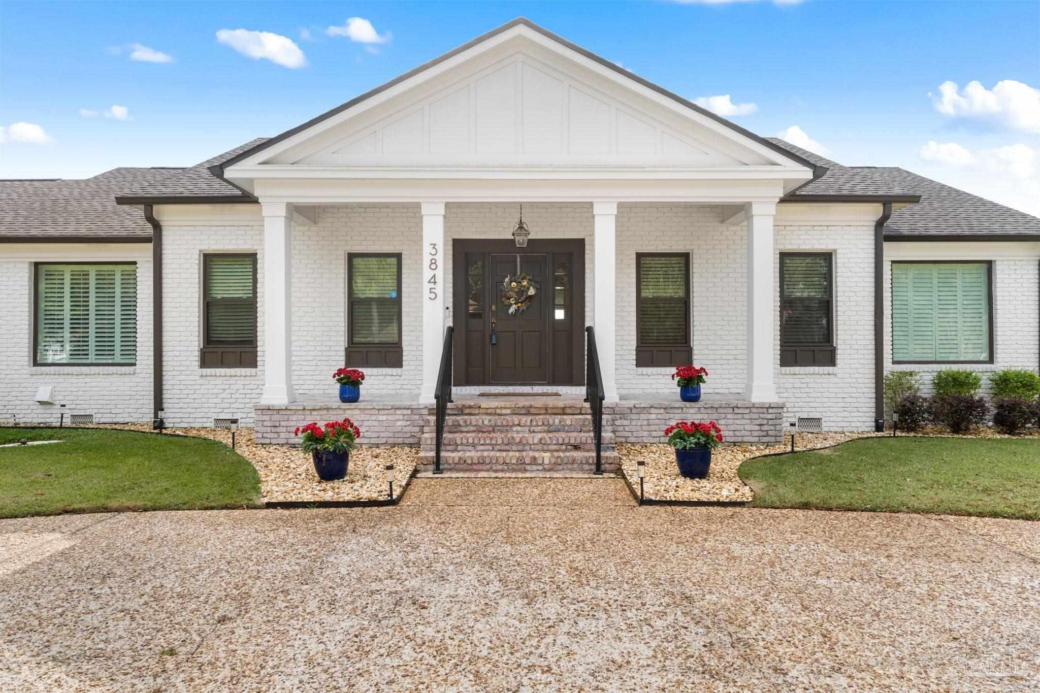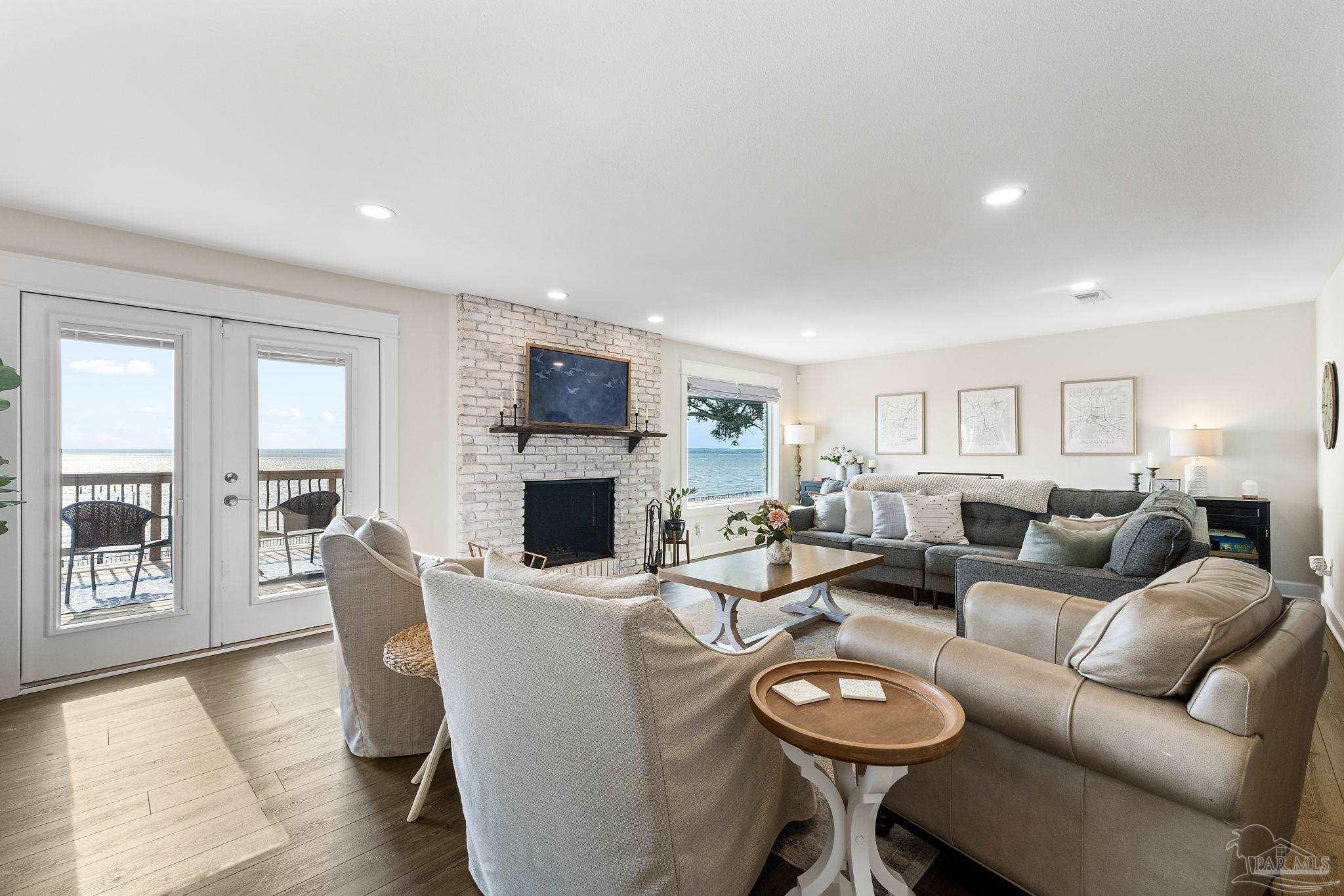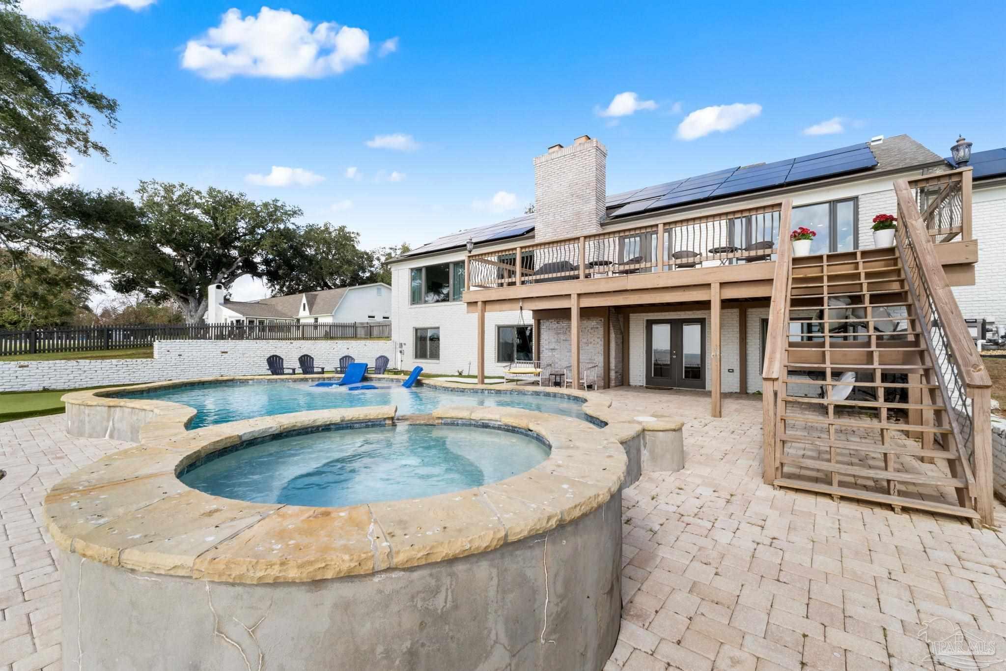 Stunning renovated home on Andrew Jackson Drive, offering 150 feet of waterfront on Escambia Bay. Sitting on nearly an acre, this waterfront paradise features a gunite pool, spa, and a putting green. Enjoy breathtaking sunsets from this 4bedroom, 3bath residence, with water views captured from almost every room. While a portion of the lot is located in a flood zone, the home is not making flood insurance more affordable. New renovation in 2024. Step through the foyer into the spacious main living area on the first level, where panoramic water views greet you. The living room has a wood-burning fireplace and built-in floor-to-ceiling bookcases, ideal for displaying your favorite collections. The bright and airy kitchen and dining space are equipped with abundant cabinets, stone countertops, and a double oven. A large walk-in pantry offers ample storage and bar seating provides casual eating options. The primary suite is a retreat with gorgeous bay vistas, featuring a luxurious bathroom with a double vanity, built-in shelves, a soaking tub, and a large tiled shower. A generous walk-in closet ensures plenty of space for your wardrobe. Additional first-floor amenities include a second bedroom, full bath, laundry room, and direct access to an open deck overlooking the bay. Downstairs, you'll find a spacious family room with a fireplace and built-in cabinetry, perfect for gatherings. This level also includes two more bedrooms with bay and pool views, a full bath, two versatile bonus rooms ideal for offices or guest suites, and additional storage closets. Enjoy outdoor living with a covered patio leading to the sparkling gunite pool, spa, and putting green.The backyard offers an expansive green space for entertaining, along with an observation/platform tree fort for the kids.This unique gem combines luxurious updates, breathtaking views, and outdoor fun—an exceptional waterfront lifestyle waiting to be discovered.