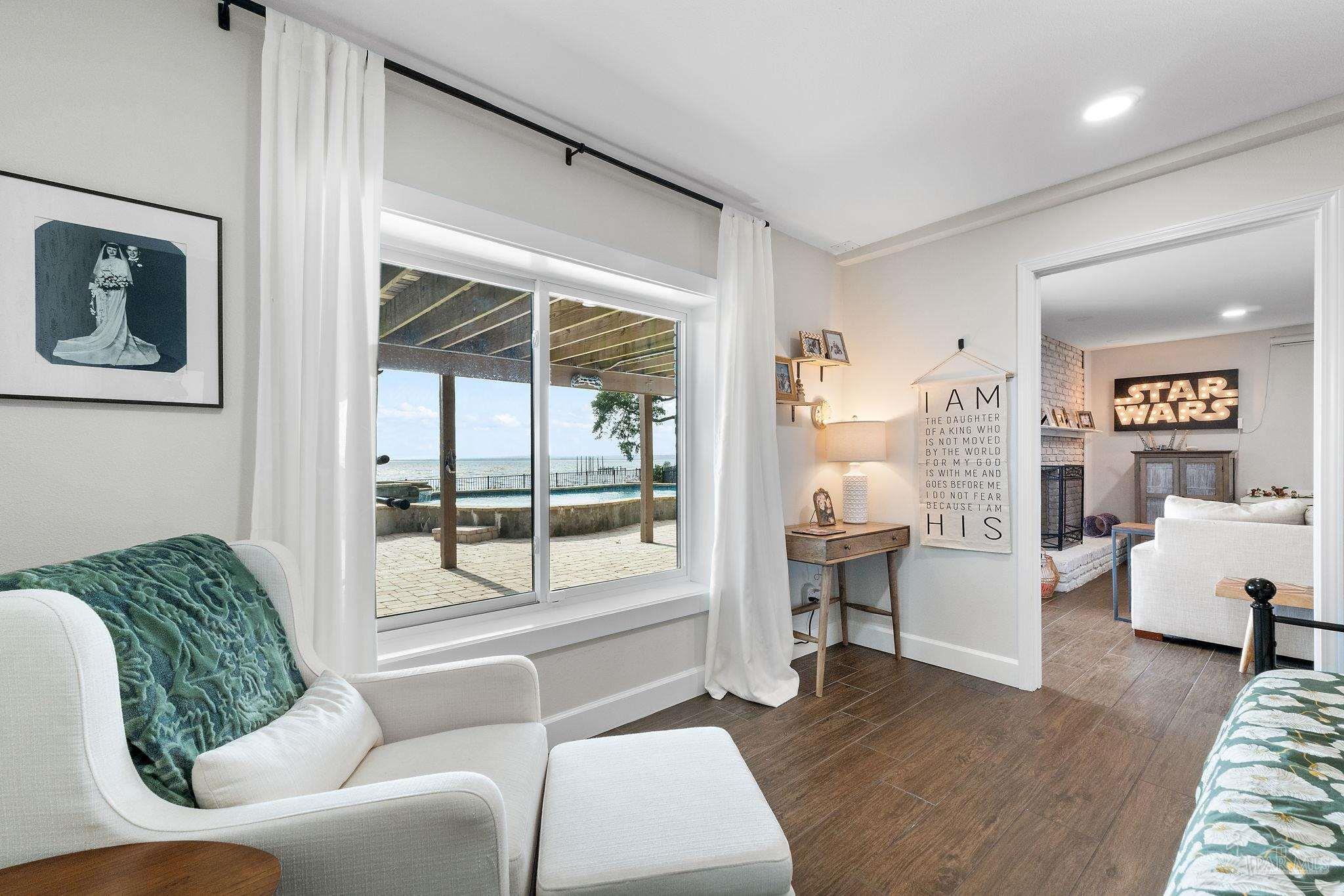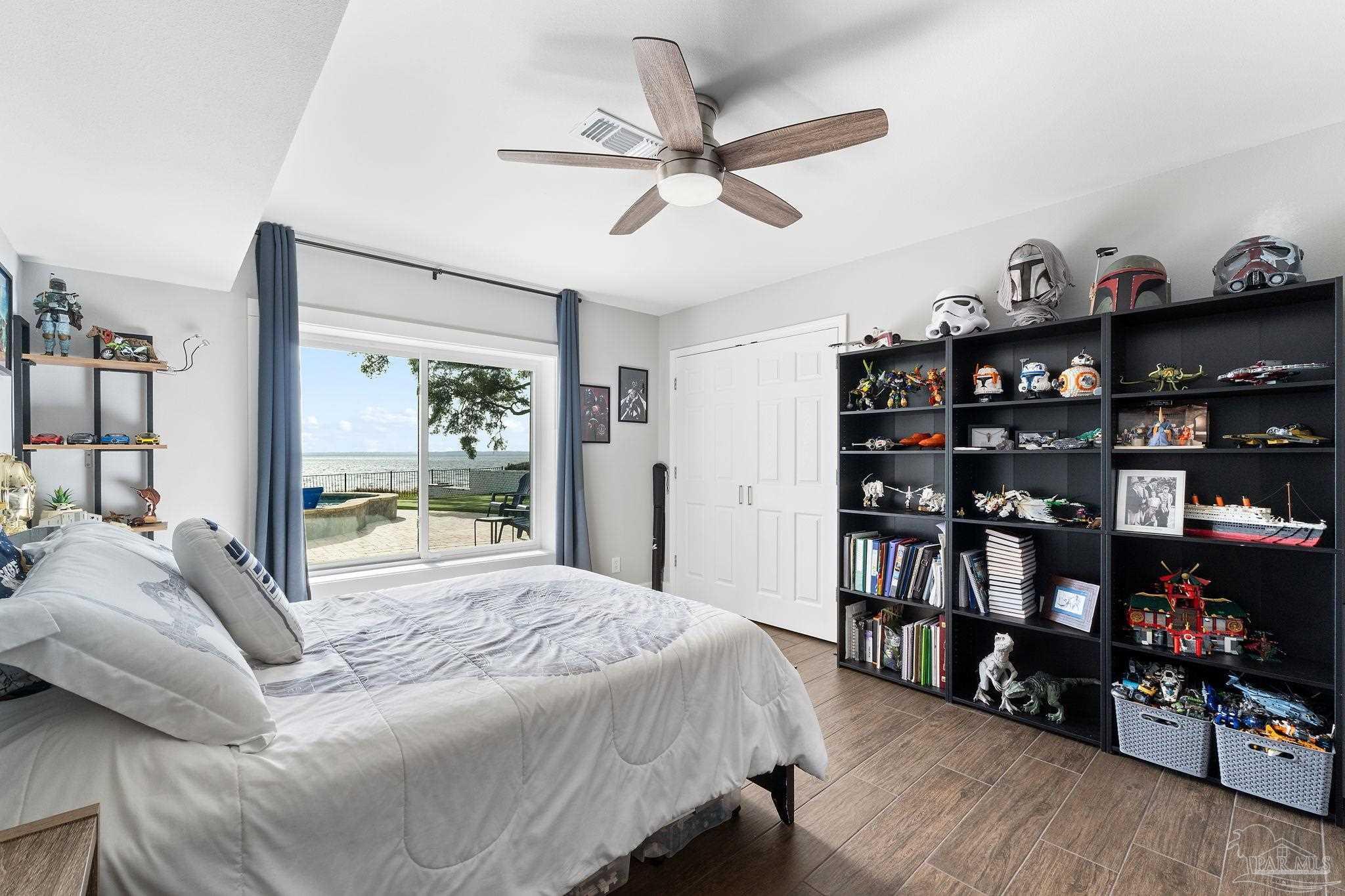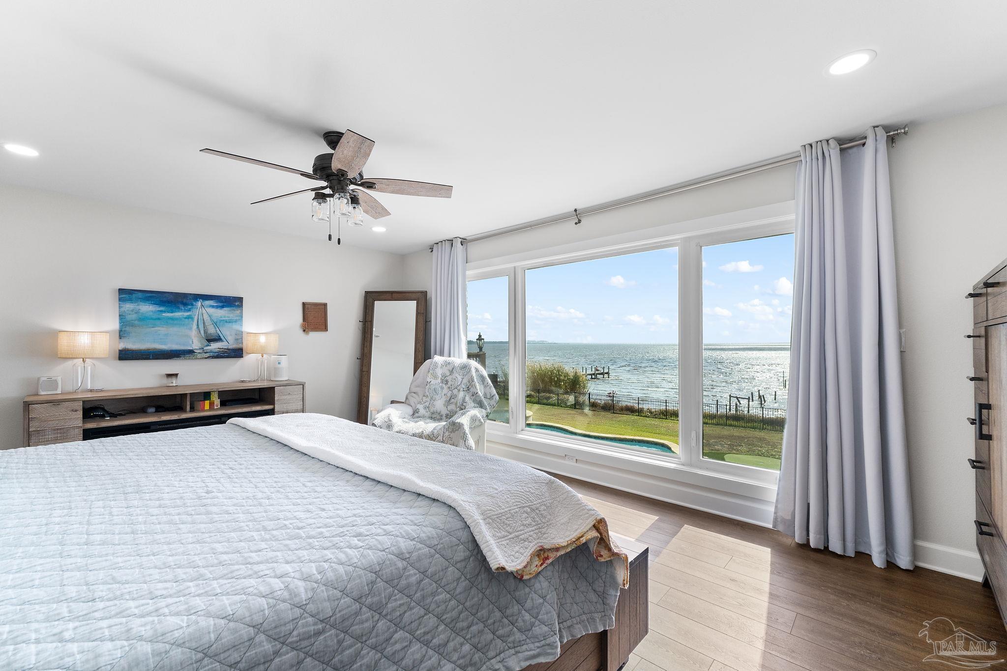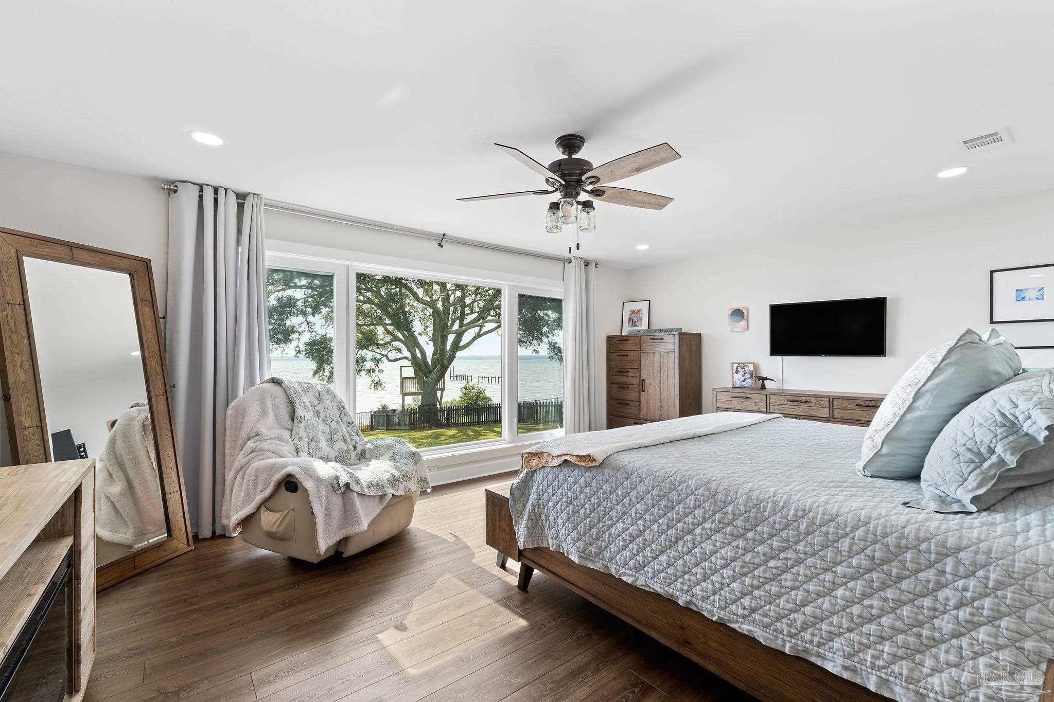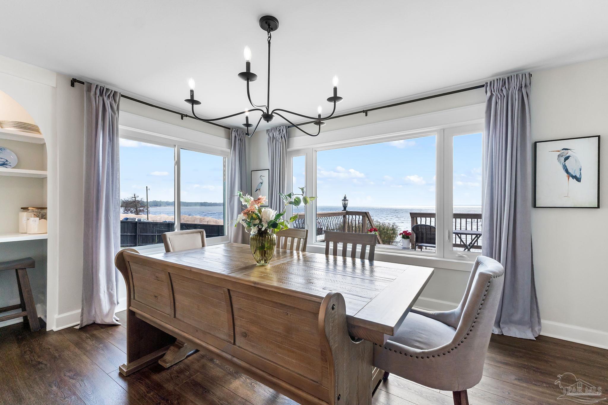 Stunning renovated home on Andrew Jackson Drive, offering 150 feet of waterfront on Escambia Bay. Sitting on nearly an acre, this waterfront paradise features a gunite pool, spa, and a putting green. Enjoy breathtaking sunsets from this 4bedroom, 3bath residence, with water views captured from almost every room. While a portion of the lot is located in a flood zone, the home is not making flood insurance more affordable. New renovation in 2024. Step through the foyer into the spacious main living area on the first level, where panoramic water views greet you. The living room has a wood-burning fireplace and built-in floor-to-ceiling bookcases, ideal for displaying your favorite collections. The bright and airy kitchen and dining space are equipped with abundant cabinets, stone countertops, and a double oven. A large walk-in pantry offers ample storage and bar seating provides casual eating options. The primary suite is a retreat with gorgeous bay vistas, featuring a luxurious bathroom with a double vanity, built-in shelves, a soaking tub, and a large tiled shower. A generous walk-in closet ensures plenty of space for your wardrobe. Additional first-floor amenities include a second bedroom, full bath, laundry room, and direct access to an open deck overlooking the bay. Downstairs, you'll find a spacious family room with a fireplace and built-in cabinetry, perfect for gatherings. This level also includes two more bedrooms with bay and pool views, a full bath, two versatile bonus rooms ideal for offices or guest suites, and additional storage closets. Enjoy outdoor living with a covered patio leading to the sparkling gunite pool, spa, and putting green.The backyard offers an expansive green space for entertaining, along with an observation/platform tree fort for the kids.This unique gem combines luxurious updates, breathtaking views, and outdoor fun—an exceptional waterfront lifestyle waiting to be discovered.