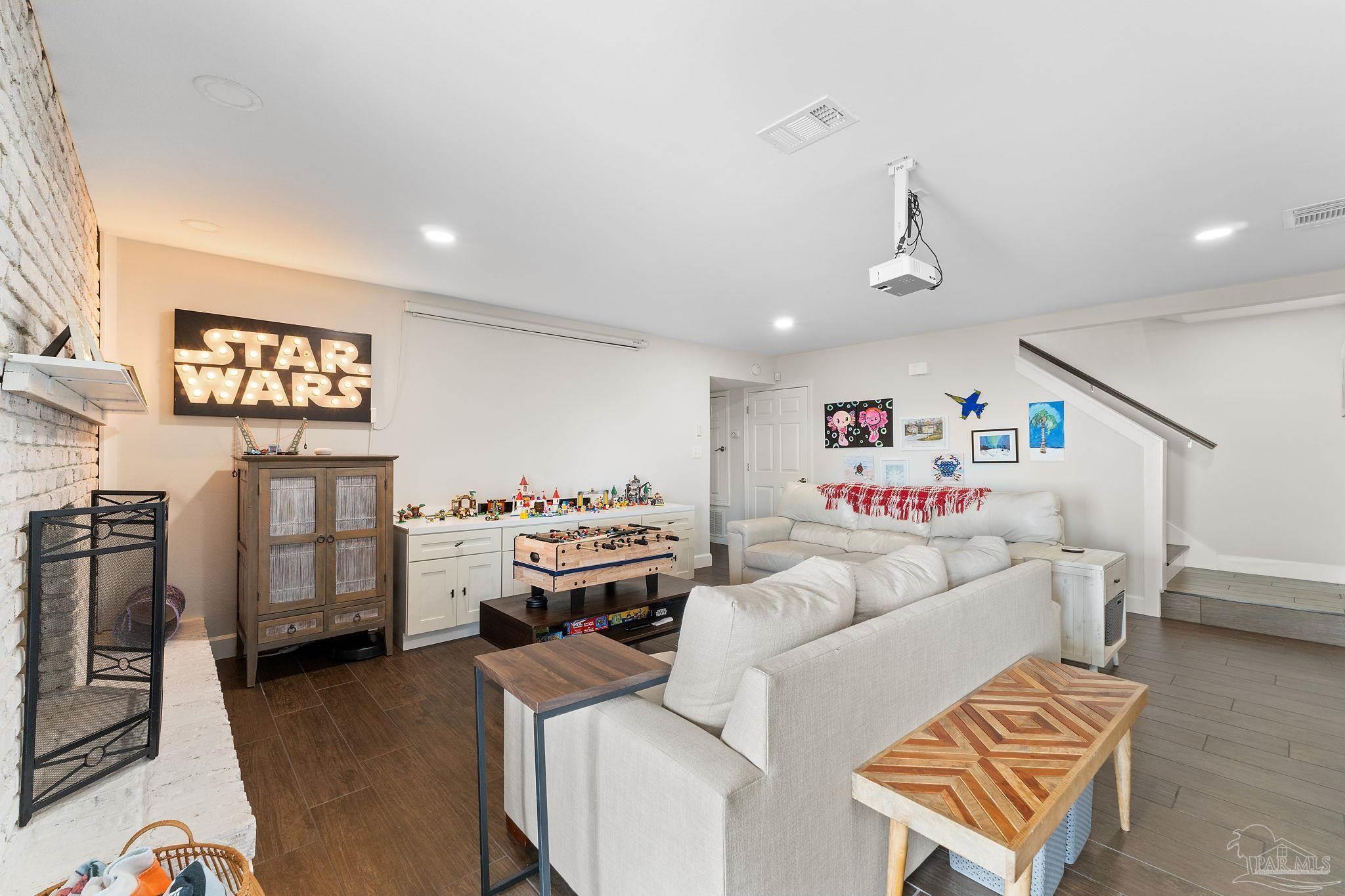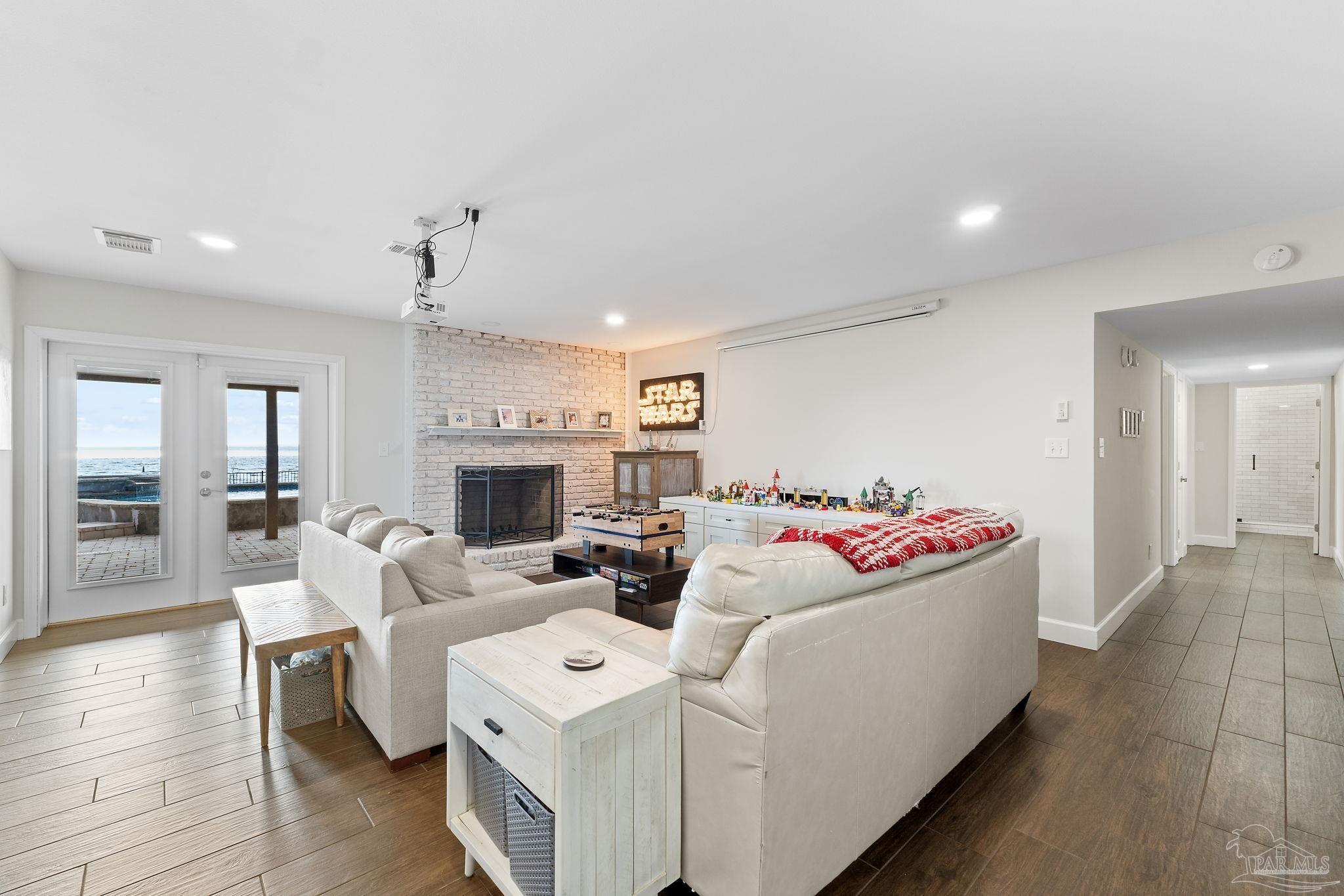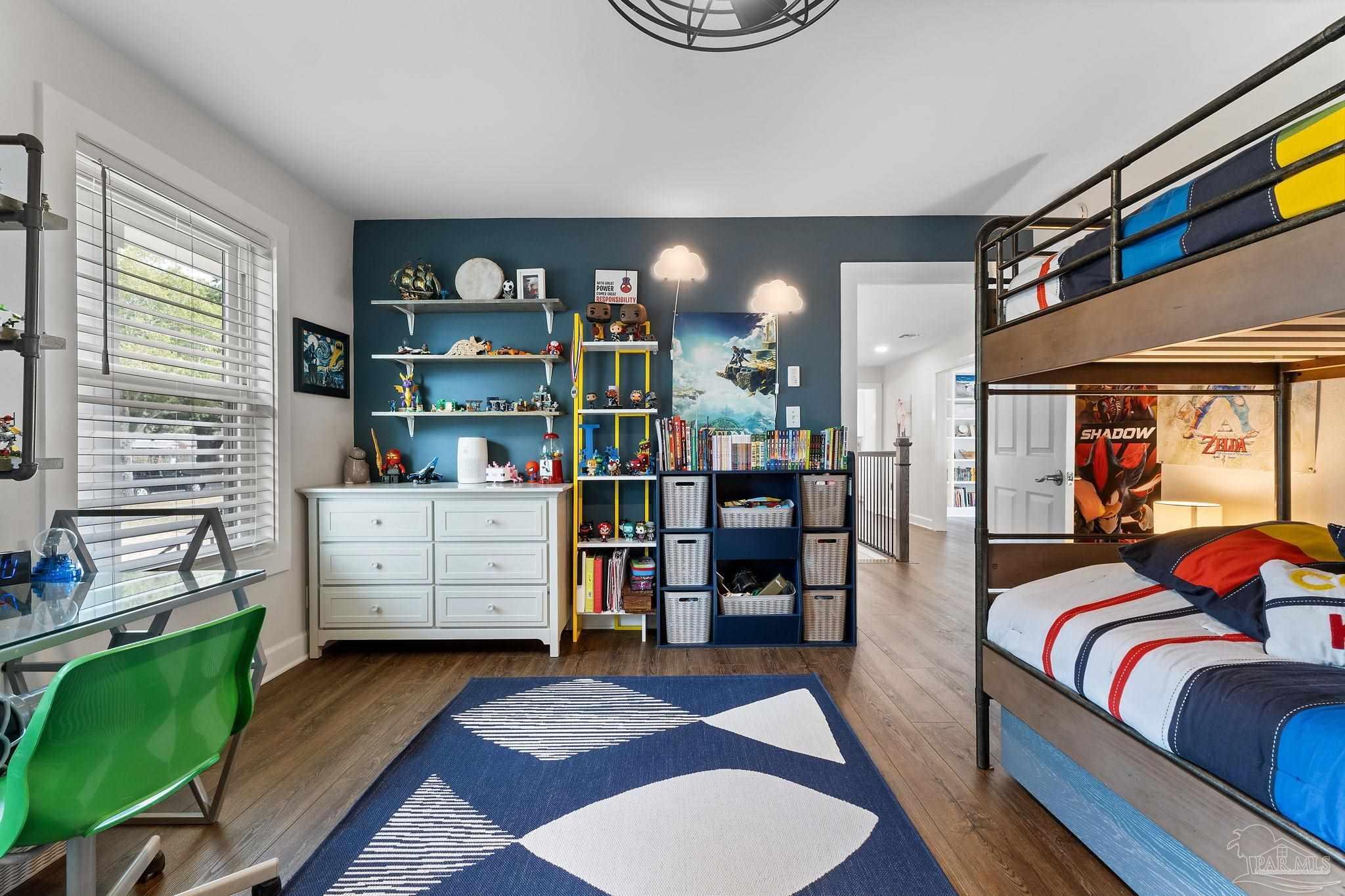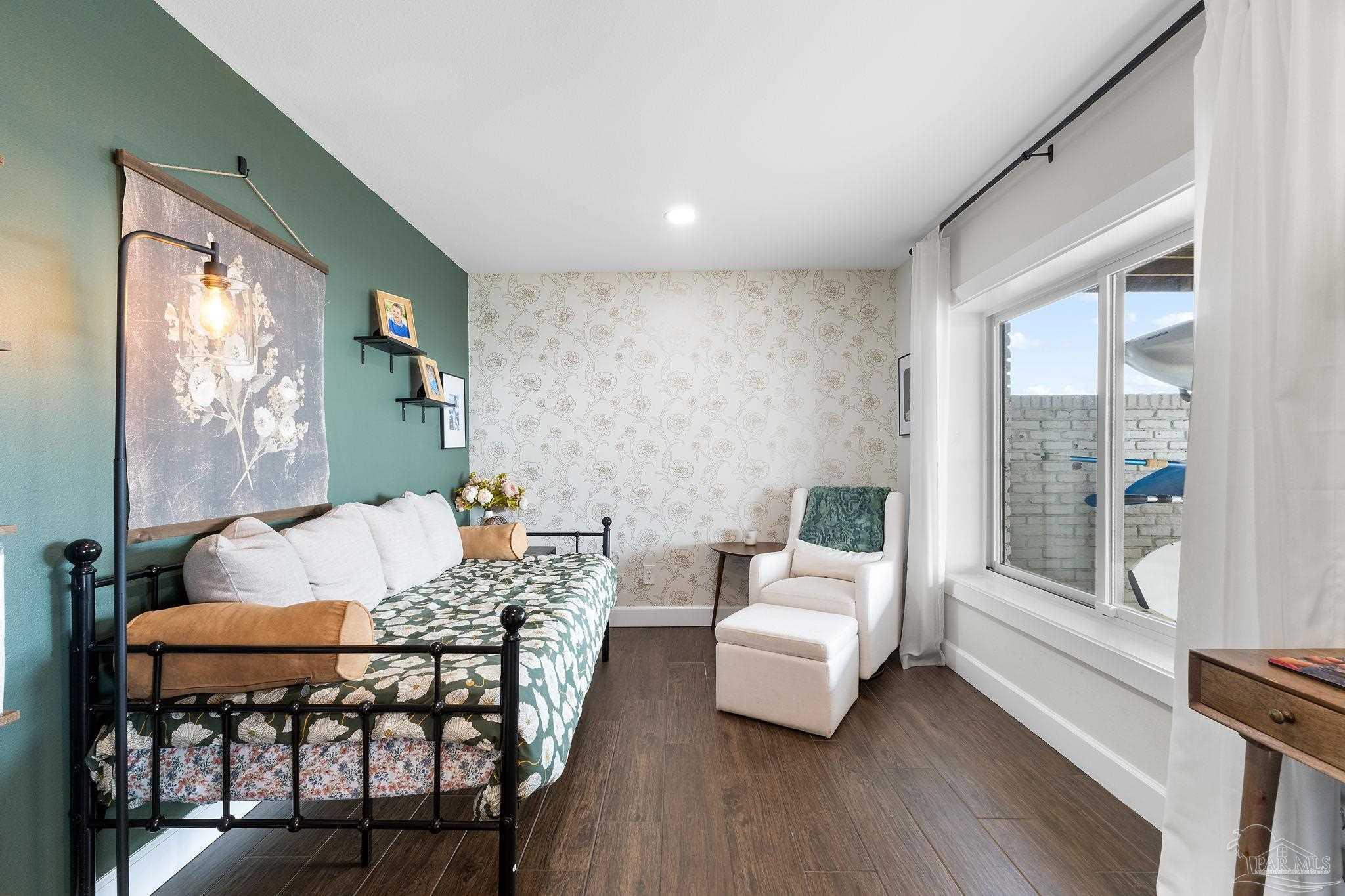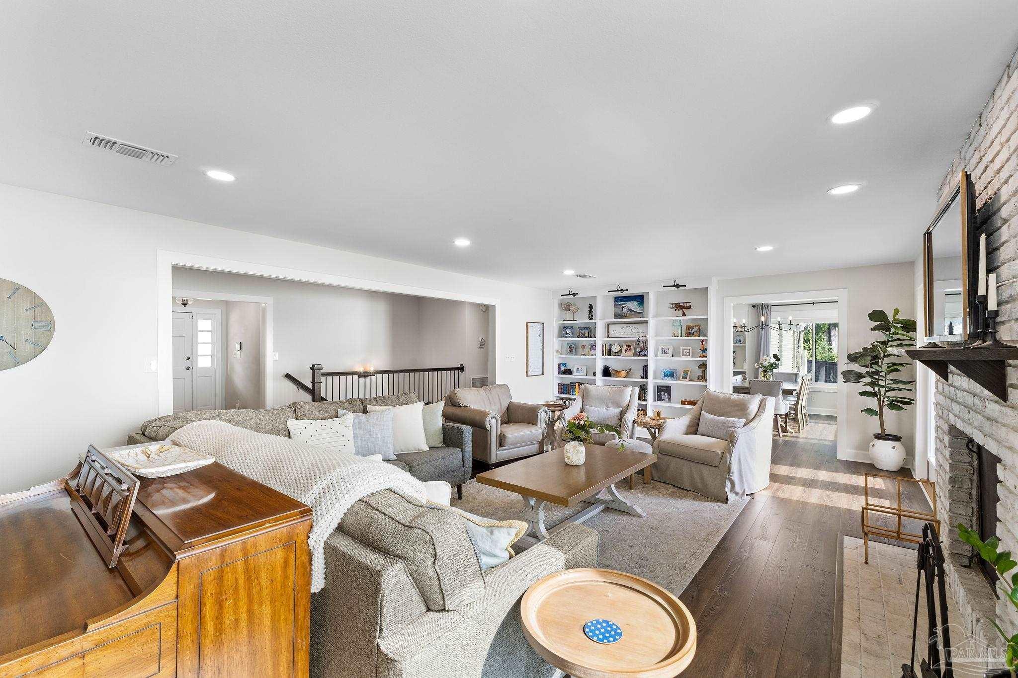 Stunning renovated home on Andrew Jackson Drive, offering 150 feet of waterfront on Escambia Bay. Sitting on nearly an acre, this waterfront paradise features a gunite pool, spa, and a putting green. Enjoy breathtaking sunsets from this 4bedroom, 3bath residence, with water views captured from almost every room. While a portion of the lot is located in a flood zone, the home is not making flood insurance more affordable. New renovation in 2024. Step through the foyer into the spacious main living area on the first level, where panoramic water views greet you. The living room has a wood-burning fireplace and built-in floor-to-ceiling bookcases, ideal for displaying your favorite collections. The bright and airy kitchen and dining space are equipped with abundant cabinets, stone countertops, and a double oven. A large walk-in pantry offers ample storage and bar seating provides casual eating options. The primary suite is a retreat with gorgeous bay vistas, featuring a luxurious bathroom with a double vanity, built-in shelves, a soaking tub, and a large tiled shower. A generous walk-in closet ensures plenty of space for your wardrobe. Additional first-floor amenities include a second bedroom, full bath, laundry room, and direct access to an open deck overlooking the bay. Downstairs, you'll find a spacious family room with a fireplace and built-in cabinetry, perfect for gatherings. This level also includes two more bedrooms with bay and pool views, a full bath, two versatile bonus rooms ideal for offices or guest suites, and additional storage closets. Enjoy outdoor living with a covered patio leading to the sparkling gunite pool, spa, and putting green.The backyard offers an expansive green space for entertaining, along with an observation/platform tree fort for the kids.This unique gem combines luxurious updates, breathtaking views, and outdoor fun—an exceptional waterfront lifestyle waiting to be discovered.