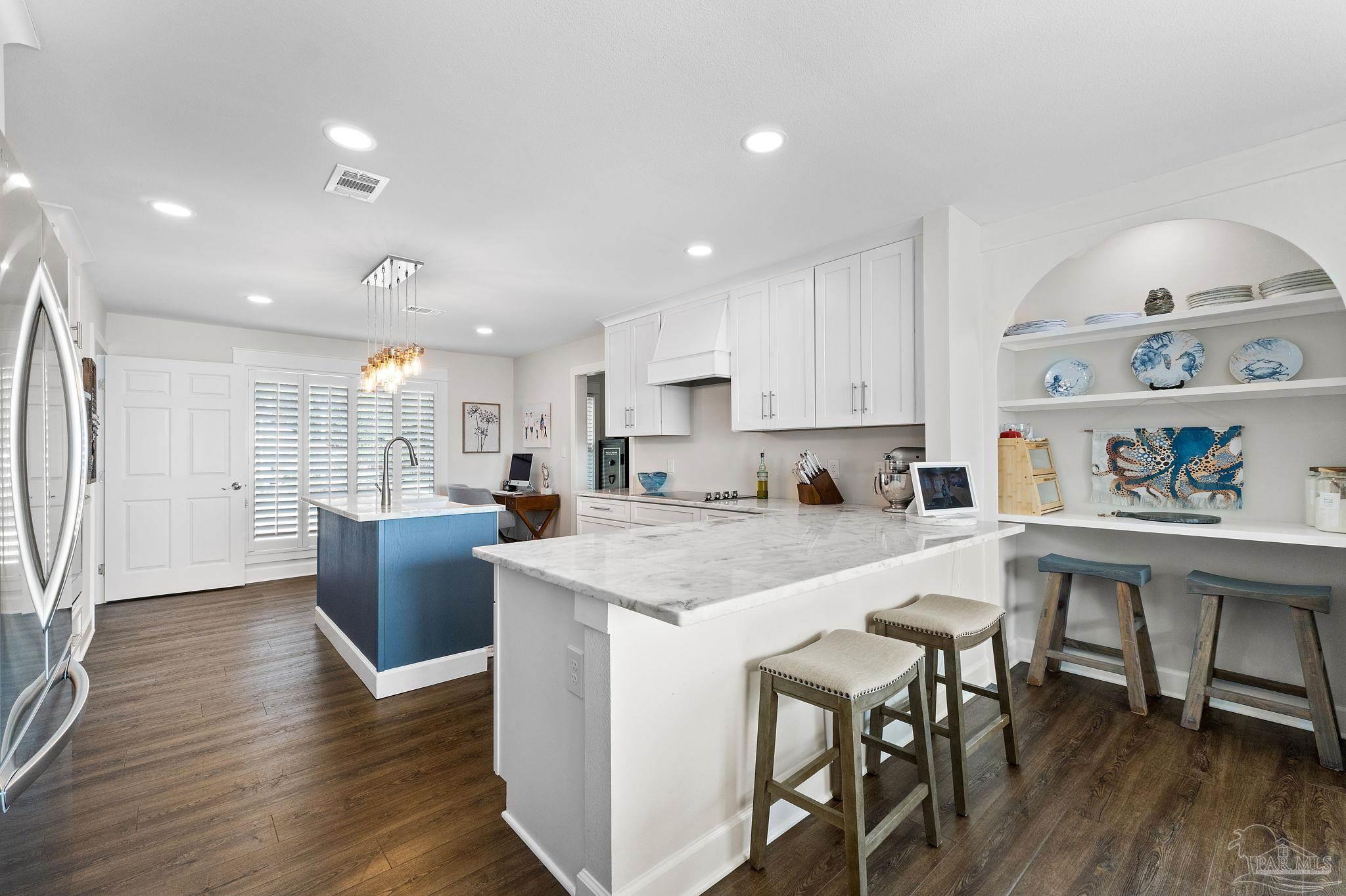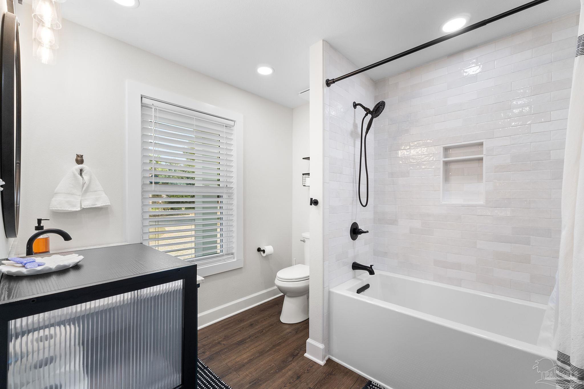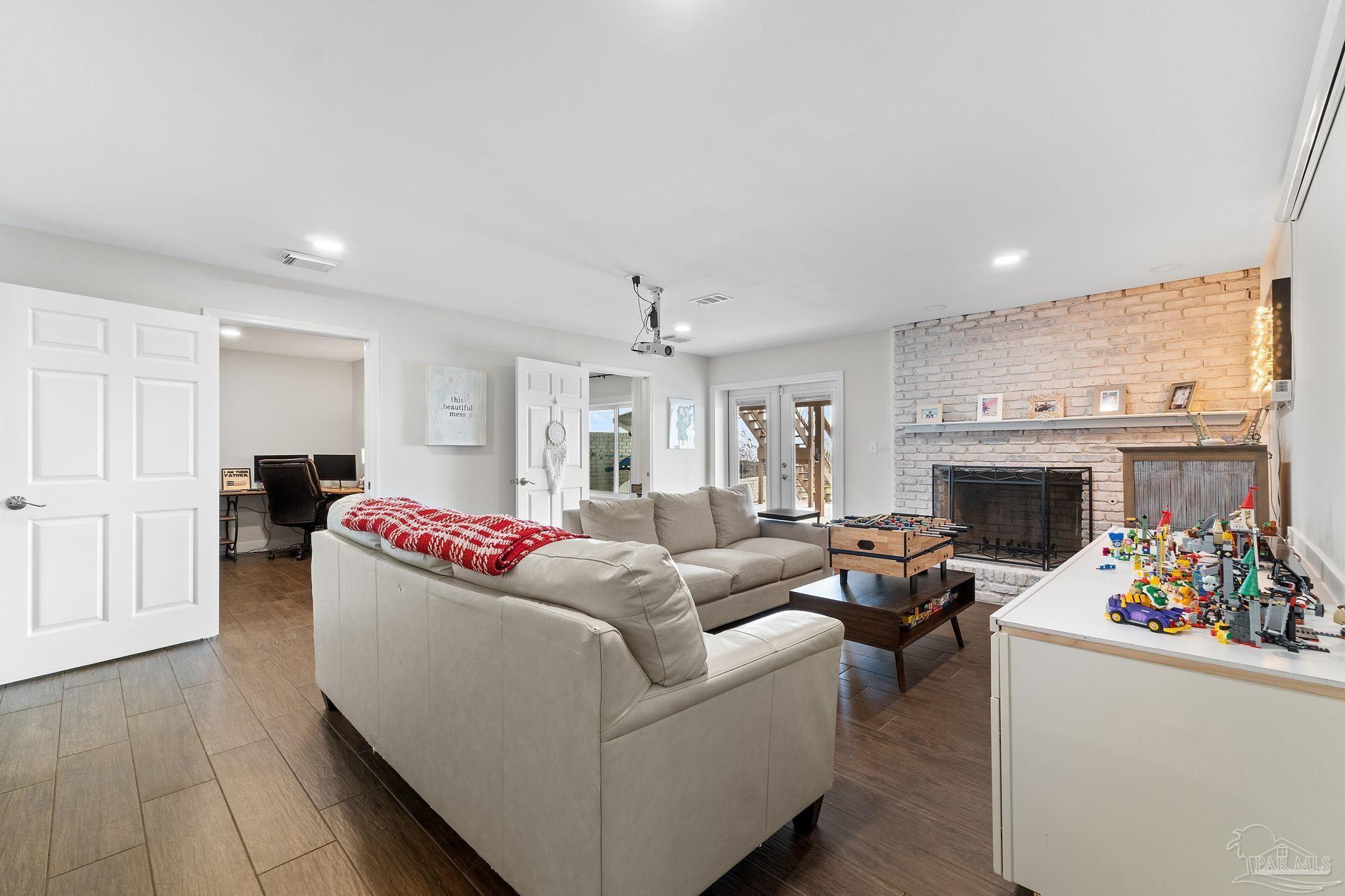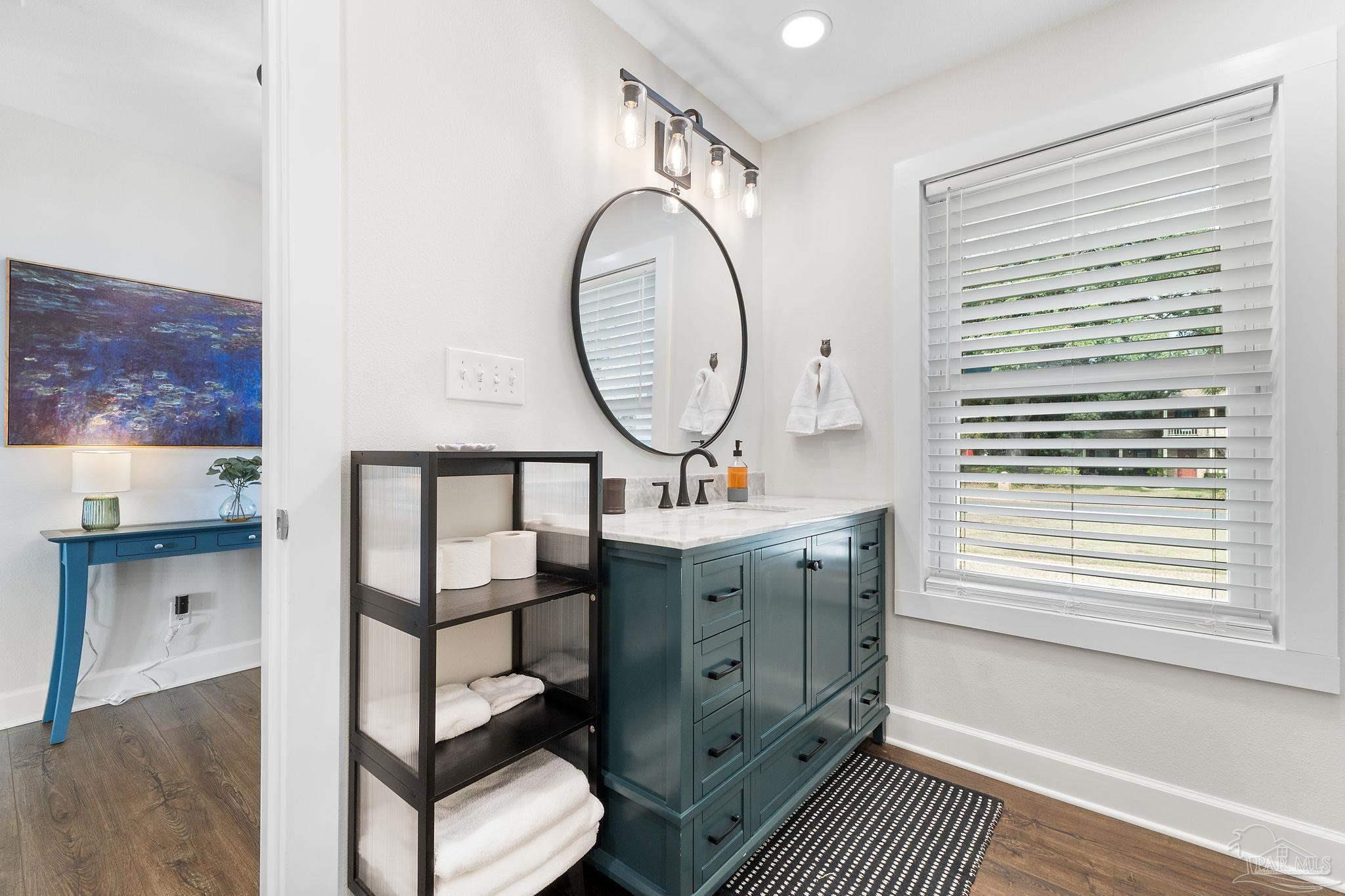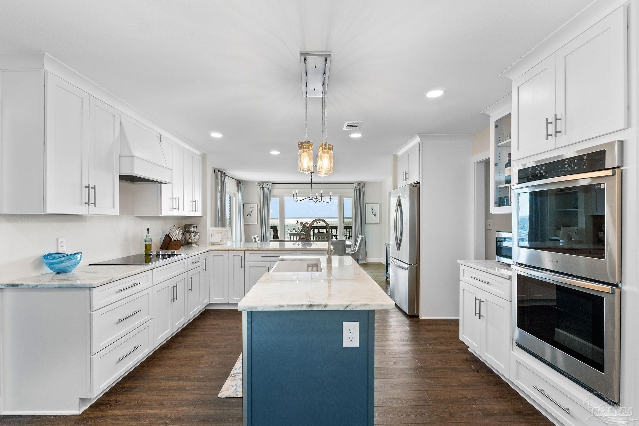 Stunning renovated home on Andrew Jackson Drive, offering 150 feet of waterfront on Escambia Bay. Sitting on nearly an acre, this waterfront paradise features a gunite pool, spa, and a putting green. Enjoy breathtaking sunsets from this 4bedroom, 3bath residence, with water views captured from almost every room. While a portion of the lot is located in a flood zone, the home is not making flood insurance more affordable. New renovation in 2024. Step through the foyer into the spacious main living area on the first level, where panoramic water views greet you. The living room has a wood-burning fireplace and built-in floor-to-ceiling bookcases, ideal for displaying your favorite collections. The bright and airy kitchen and dining space are equipped with abundant cabinets, stone countertops, and a double oven. A large walk-in pantry offers ample storage and bar seating provides casual eating options. The primary suite is a retreat with gorgeous bay vistas, featuring a luxurious bathroom with a double vanity, built-in shelves, a soaking tub, and a large tiled shower. A generous walk-in closet ensures plenty of space for your wardrobe. Additional first-floor amenities include a second bedroom, full bath, laundry room, and direct access to an open deck overlooking the bay. Downstairs, you'll find a spacious family room with a fireplace and built-in cabinetry, perfect for gatherings. This level also includes two more bedrooms with bay and pool views, a full bath, two versatile bonus rooms ideal for offices or guest suites, and additional storage closets. Enjoy outdoor living with a covered patio leading to the sparkling gunite pool, spa, and putting green.The backyard offers an expansive green space for entertaining, along with an observation/platform tree fort for the kids.This unique gem combines luxurious updates, breathtaking views, and outdoor fun—an exceptional waterfront lifestyle waiting to be discovered.