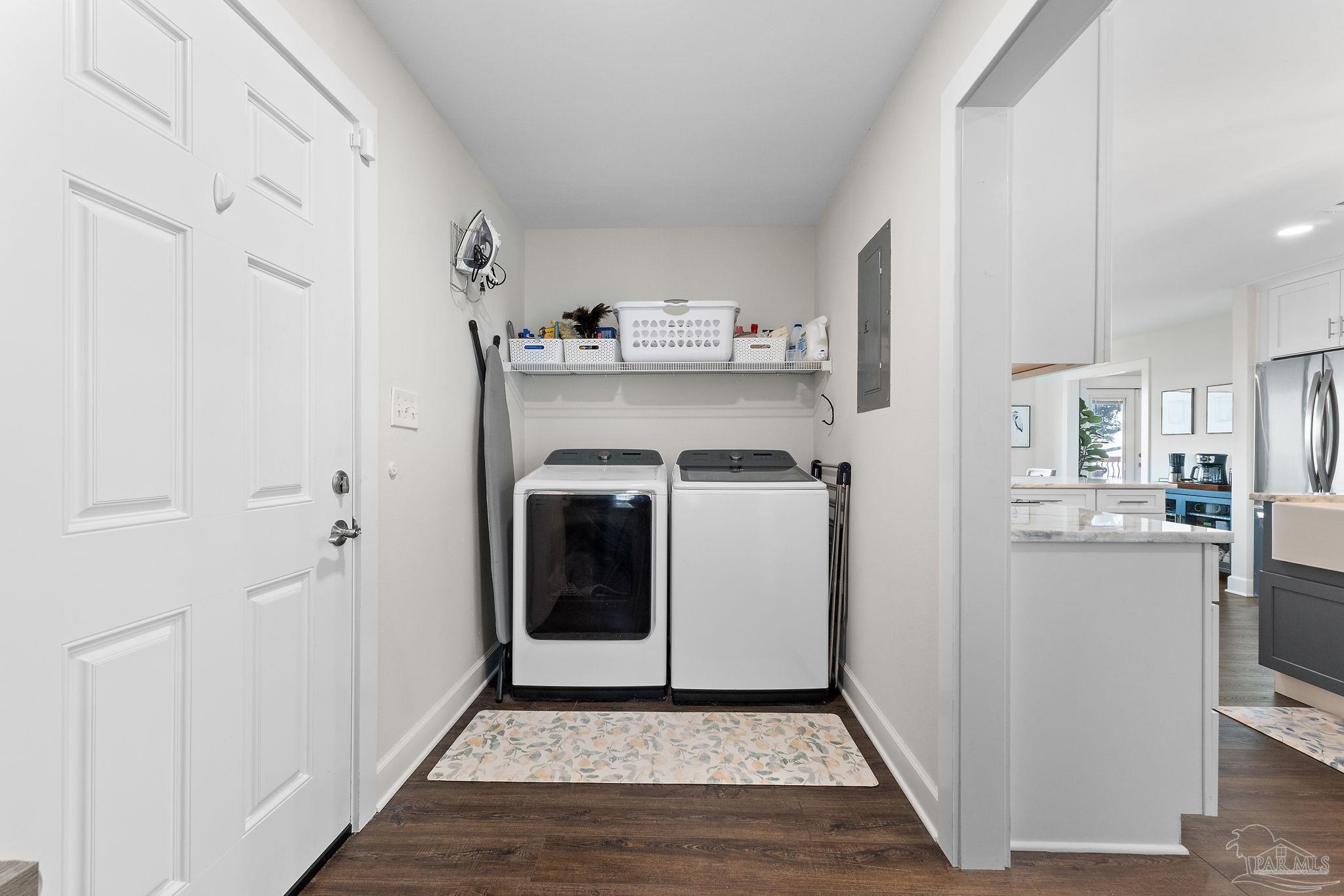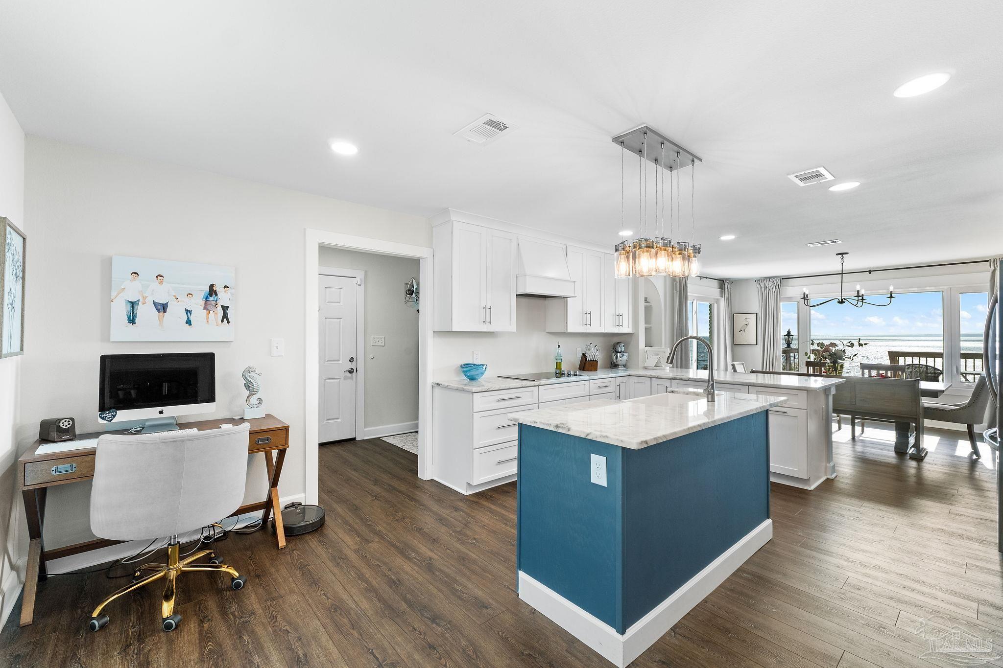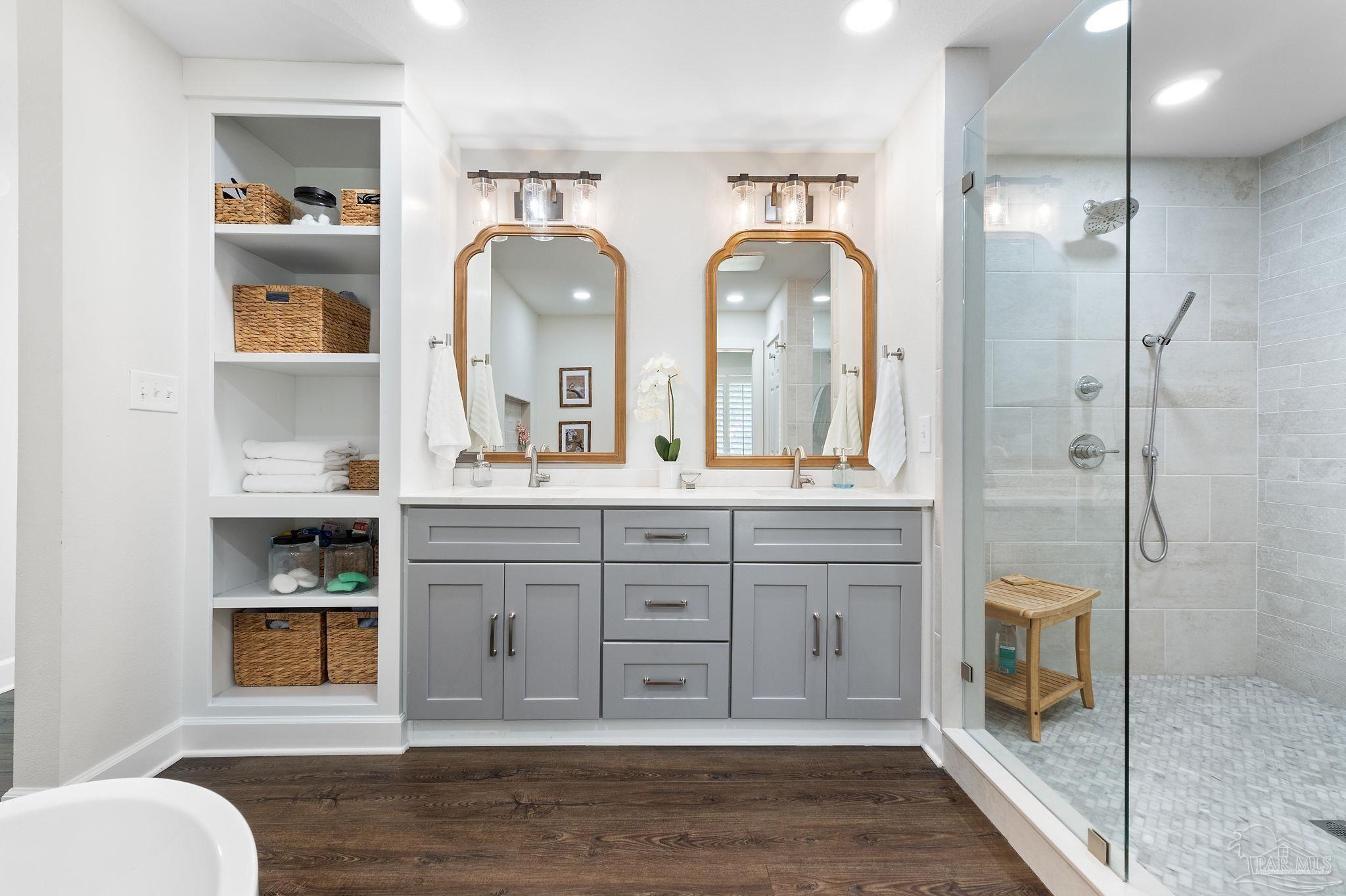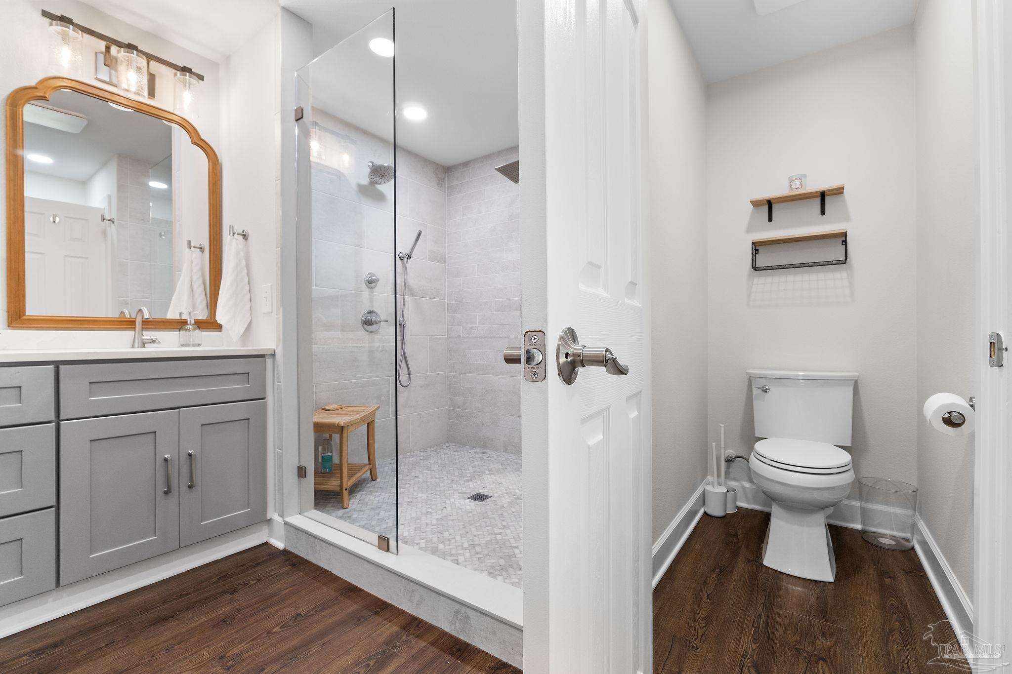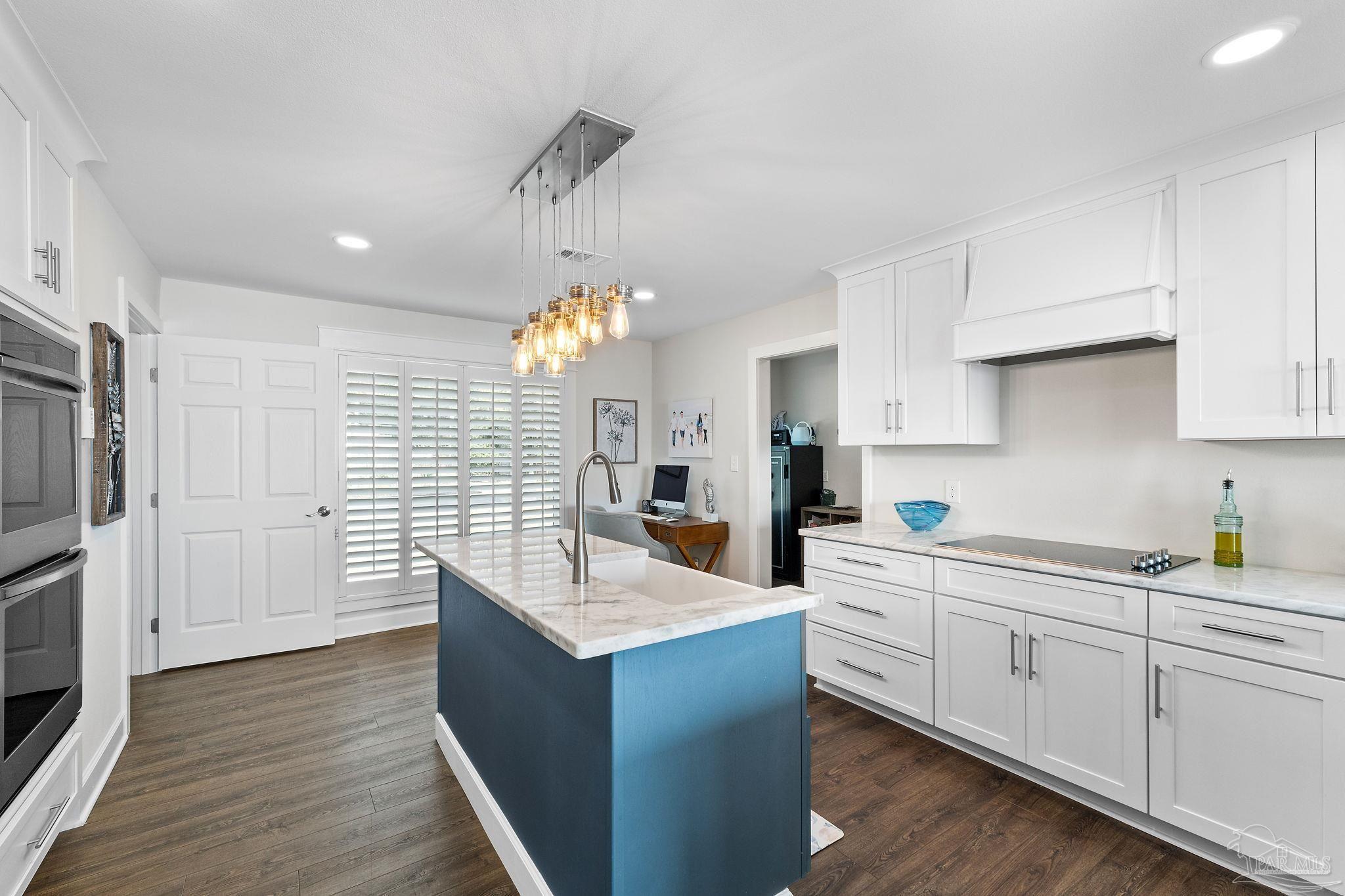 Stunning renovated home on Andrew Jackson Drive, offering 150 feet of waterfront on Escambia Bay. Sitting on nearly an acre, this waterfront paradise features a gunite pool, spa, and a putting green. Enjoy breathtaking sunsets from this 4bedroom, 3bath residence, with water views captured from almost every room. While a portion of the lot is located in a flood zone, the home is not making flood insurance more affordable. New renovation in 2024. Step through the foyer into the spacious main living area on the first level, where panoramic water views greet you. The living room has a wood-burning fireplace and built-in floor-to-ceiling bookcases, ideal for displaying your favorite collections. The bright and airy kitchen and dining space are equipped with abundant cabinets, stone countertops, and a double oven. A large walk-in pantry offers ample storage and bar seating provides casual eating options. The primary suite is a retreat with gorgeous bay vistas, featuring a luxurious bathroom with a double vanity, built-in shelves, a soaking tub, and a large tiled shower. A generous walk-in closet ensures plenty of space for your wardrobe. Additional first-floor amenities include a second bedroom, full bath, laundry room, and direct access to an open deck overlooking the bay. Downstairs, you'll find a spacious family room with a fireplace and built-in cabinetry, perfect for gatherings. This level also includes two more bedrooms with bay and pool views, a full bath, two versatile bonus rooms ideal for offices or guest suites, and additional storage closets. Enjoy outdoor living with a covered patio leading to the sparkling gunite pool, spa, and putting green.The backyard offers an expansive green space for entertaining, along with an observation/platform tree fort for the kids.This unique gem combines luxurious updates, breathtaking views, and outdoor fun—an exceptional waterfront lifestyle waiting to be discovered.