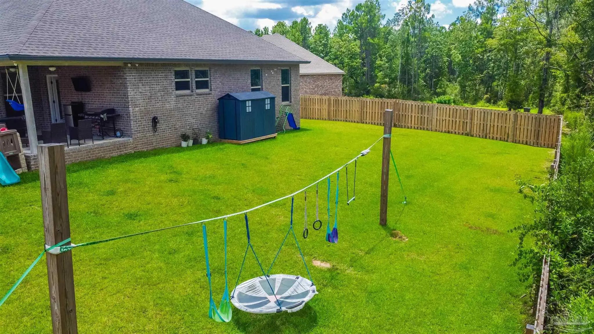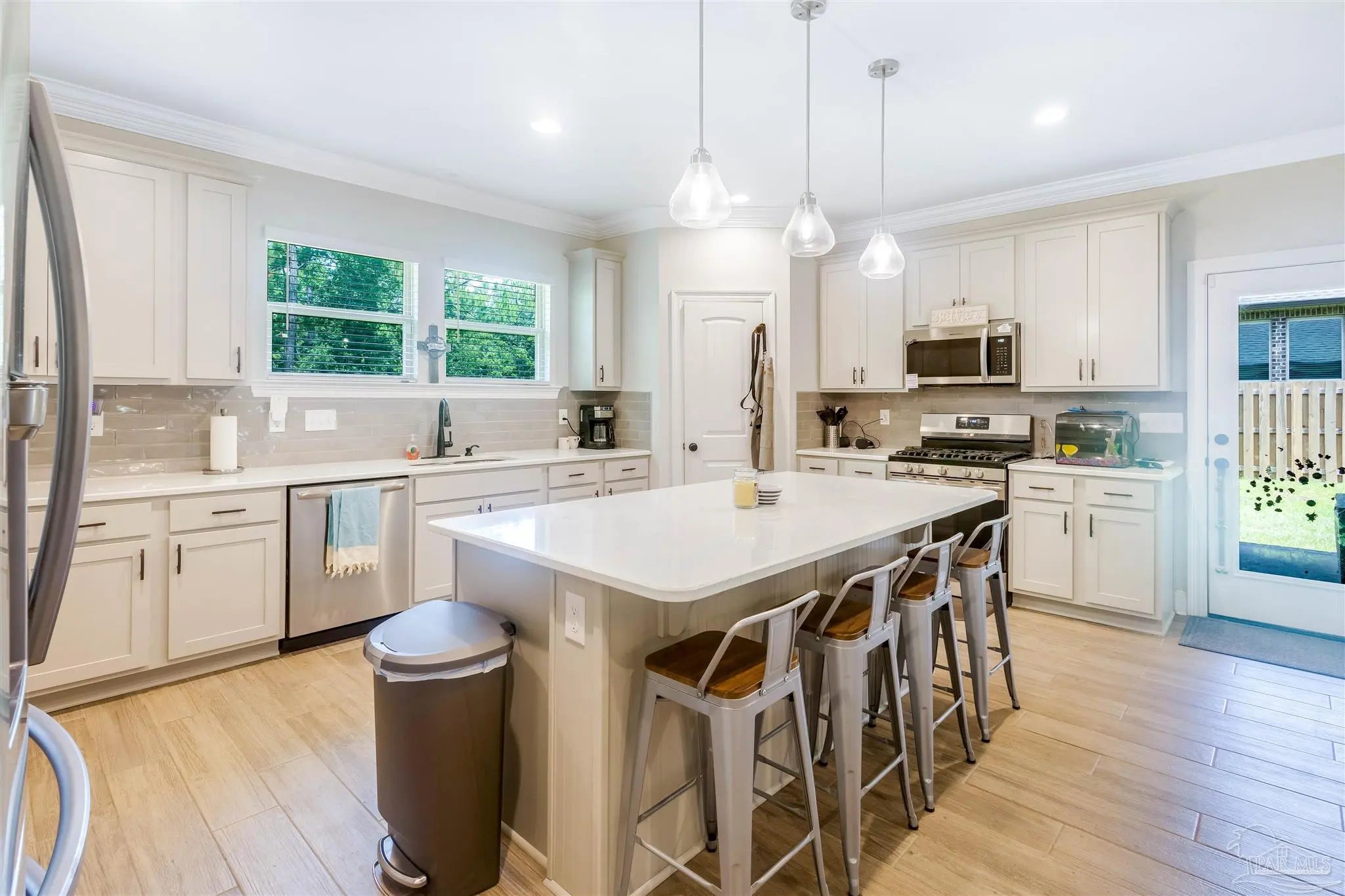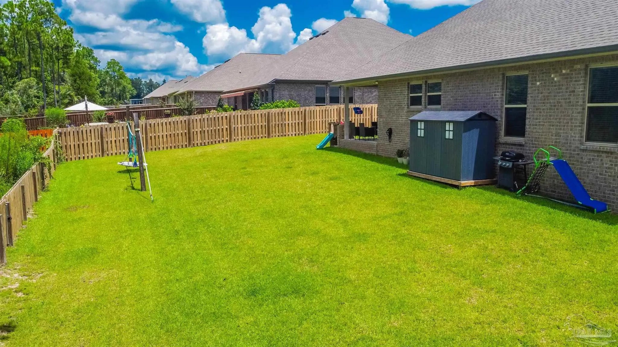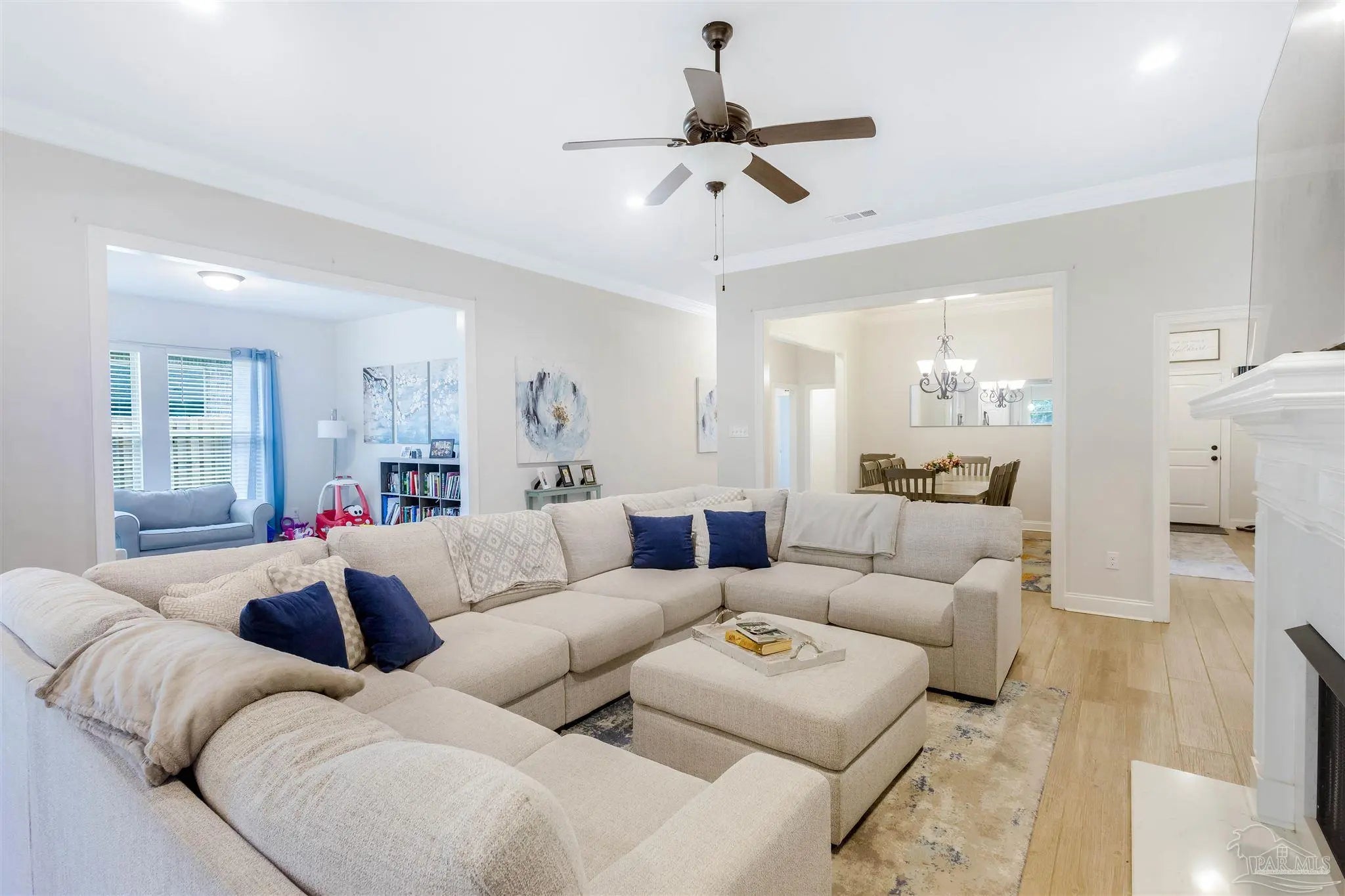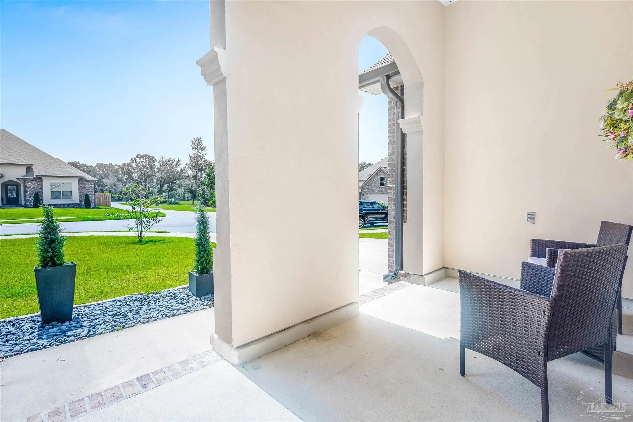 BACK ON THE MARKET! Come see this beautiful home in a gated community in Cantonment! Located in the Iron Rock neighborhood, this 2,719 square foot, 5 bedroom/3 bath home showcases an outdoor space with a large covered patio with built-in fans and a privacy fenced backyard. The property also extends past the fence line and has been cleared. The interior features an open floor plan with high ceilings, a sitting area that could be used as an office/study, a spacious living area with a gas fireplace, and a formal dining space. The eat-in kitchen opens up to the living area and includes stainless steel appliances as well as a gas stove, a large island with a breakfast bar, walk-in pantry and quartz countertops. The main bedroom suite, located off the kitchen, features a walk-in closet, double vanity, garden tub and separate shower. The community’s amenities are within walking distance from the property and include a large swimming pool, a covered outdoor clubhouse with bathhouse facilities, basketball court with pickleball, nature trails, and more. The property is located within 4.5 miles of I-10, within 6 miles of the Navy Federal Credit Union campus, and within 17 miles of Downtown Pensacola. Don’t miss this opportunity and schedule your showing today!