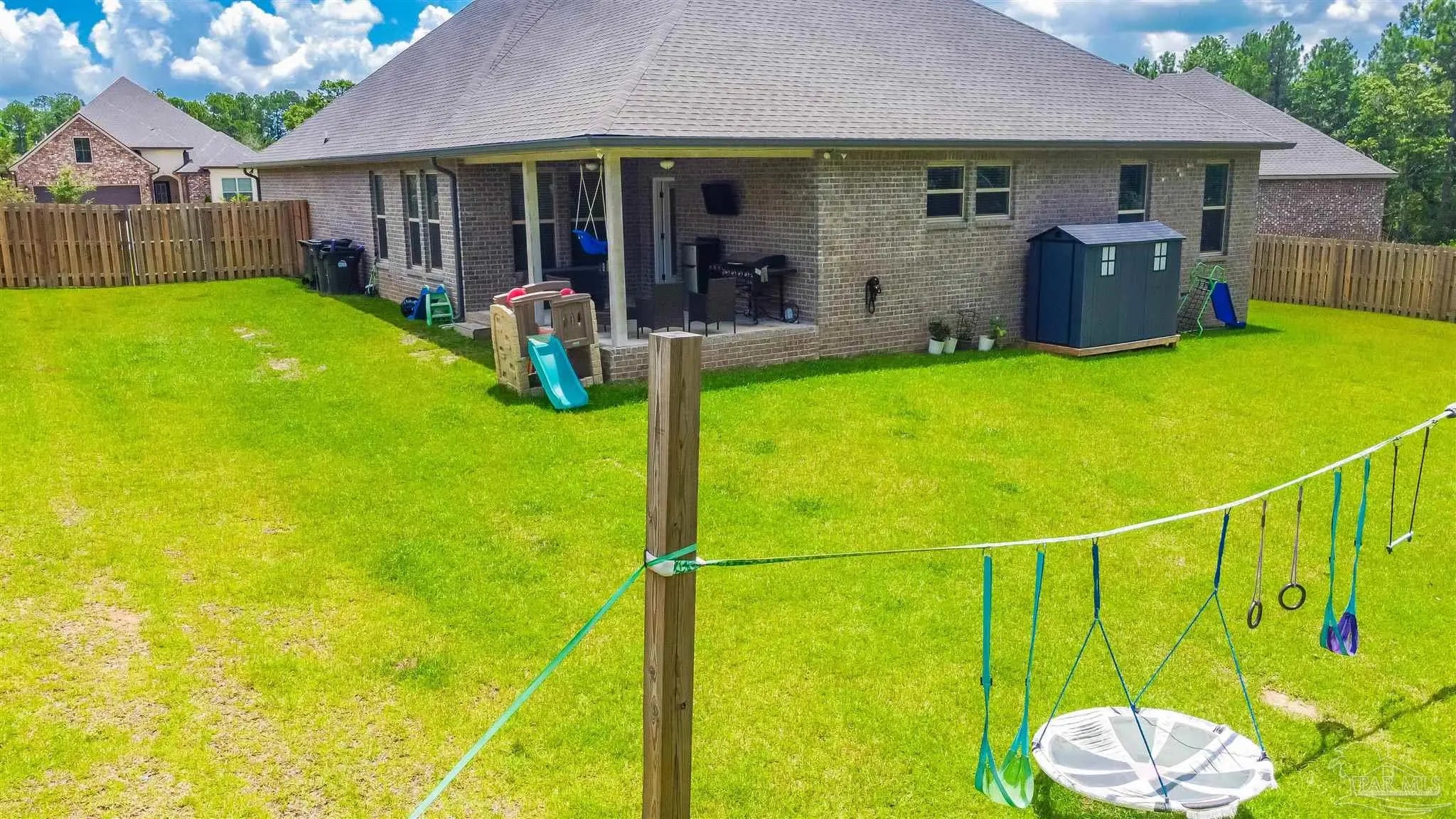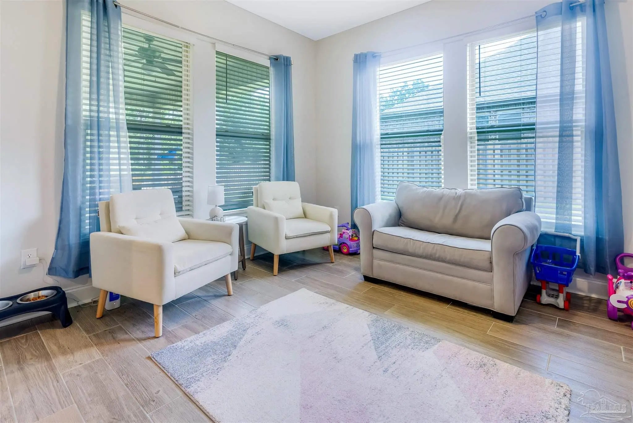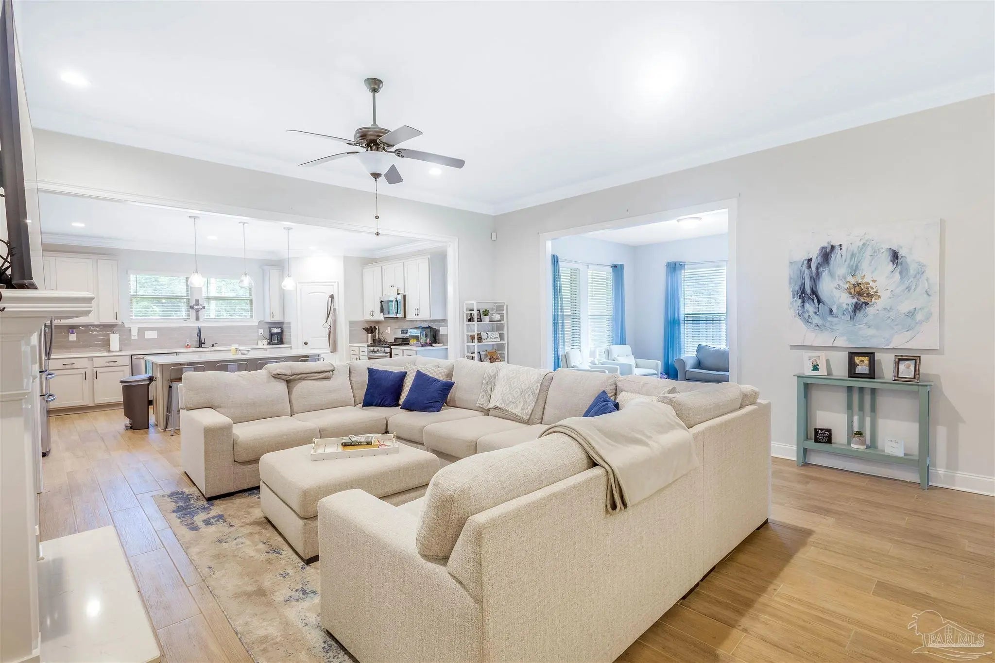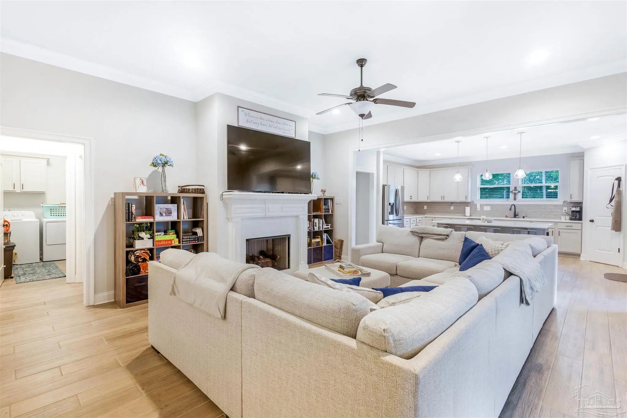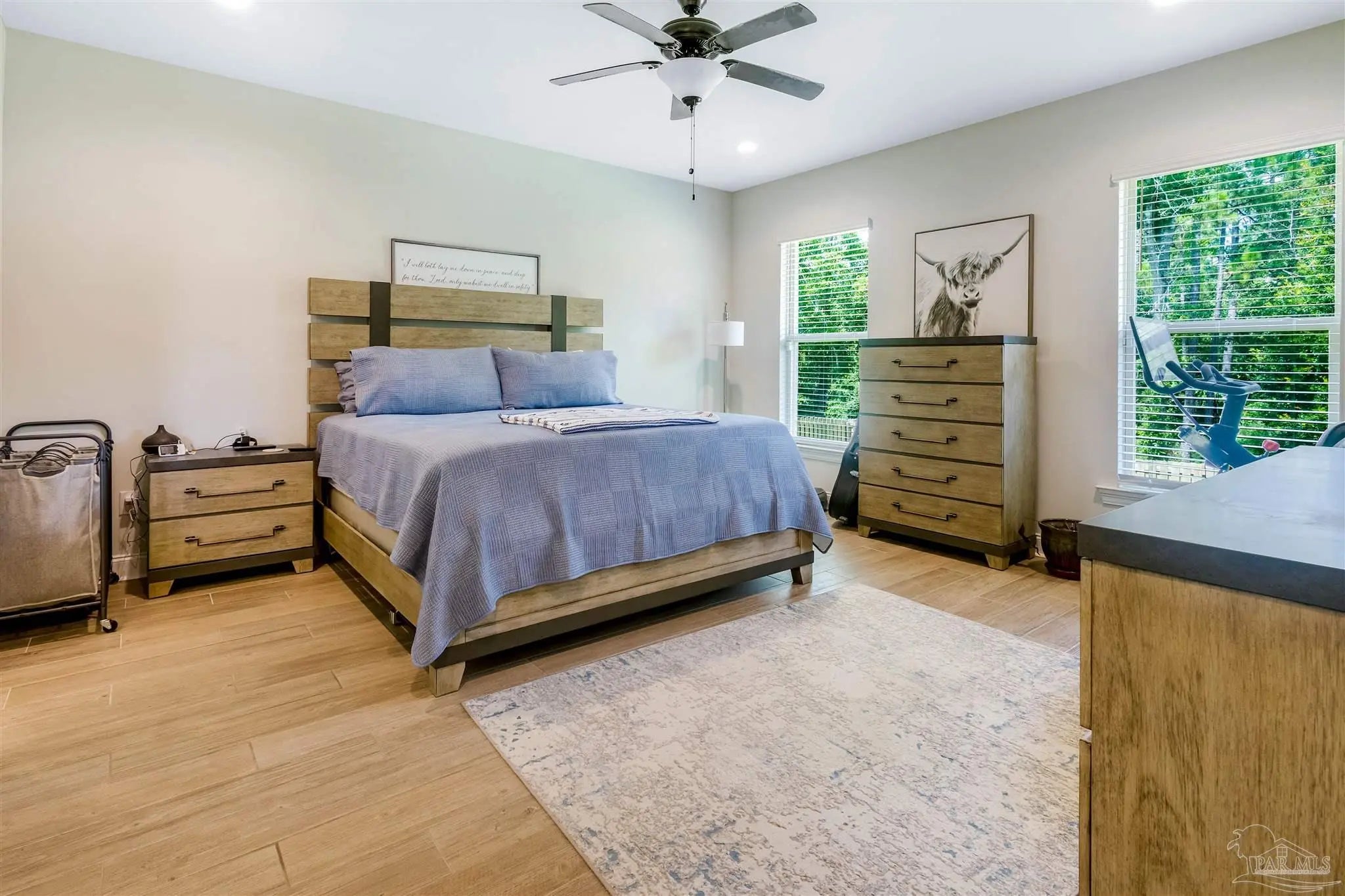 BACK ON THE MARKET! Come see this beautiful home in a gated community in Cantonment! Located in the Iron Rock neighborhood, this 2,719 square foot, 5 bedroom/3 bath home showcases an outdoor space with a large covered patio with built-in fans and a privacy fenced backyard. The property also extends past the fence line and has been cleared. The interior features an open floor plan with high ceilings, a sitting area that could be used as an office/study, a spacious living area with a gas fireplace, and a formal dining space. The eat-in kitchen opens up to the living area and includes stainless steel appliances as well as a gas stove, a large island with a breakfast bar, walk-in pantry and quartz countertops. The main bedroom suite, located off the kitchen, features a walk-in closet, double vanity, garden tub and separate shower. The community’s amenities are within walking distance from the property and include a large swimming pool, a covered outdoor clubhouse with bathhouse facilities, basketball court with pickleball, nature trails, and more. The property is located within 4.5 miles of I-10, within 6 miles of the Navy Federal Credit Union campus, and within 17 miles of Downtown Pensacola. Don’t miss this opportunity and schedule your showing today!