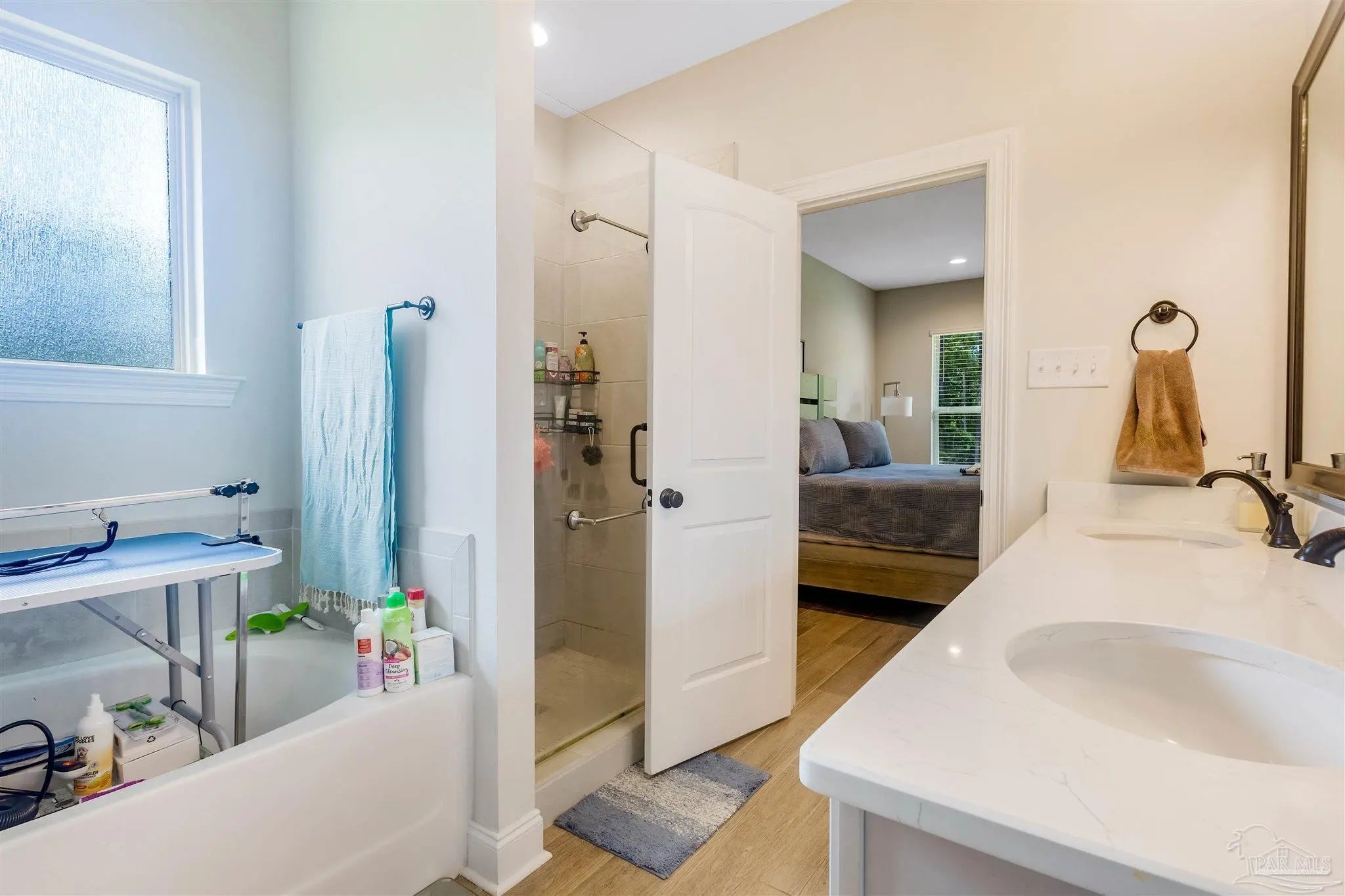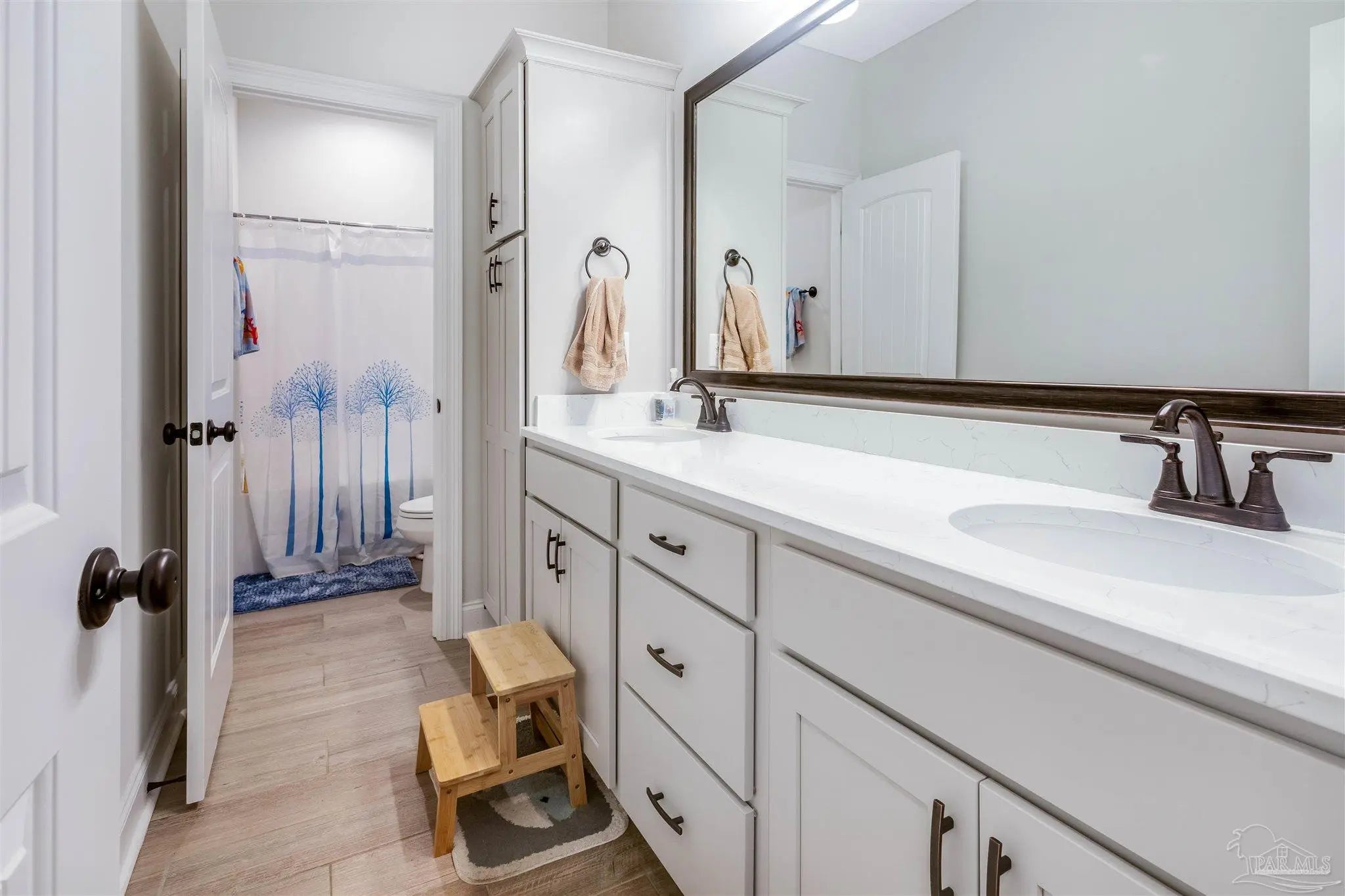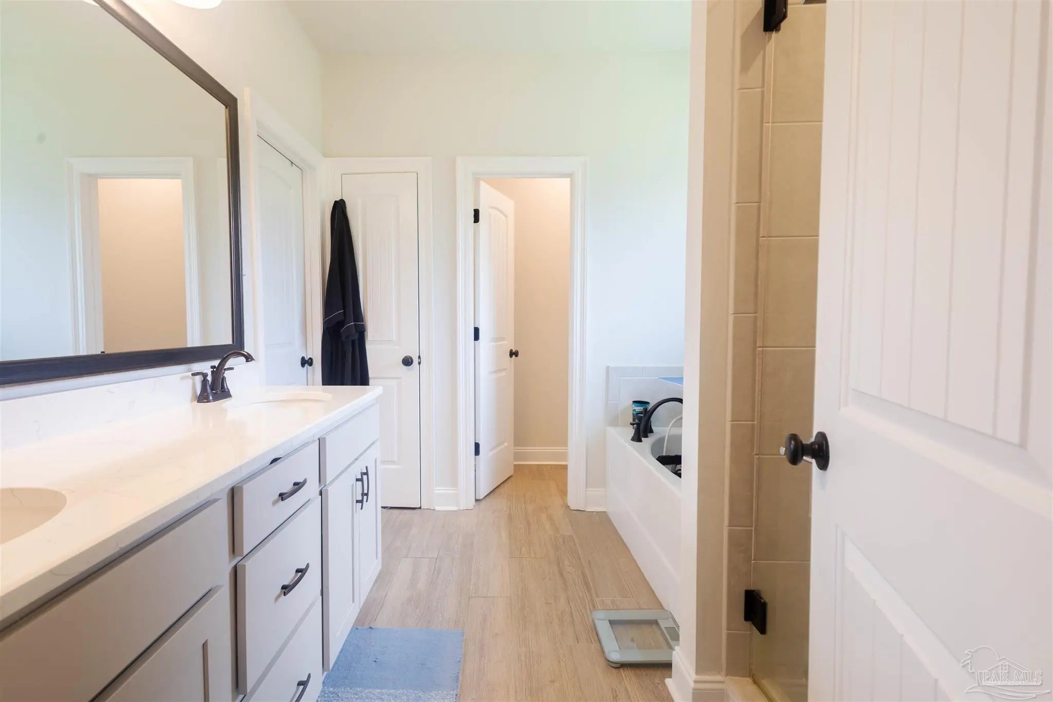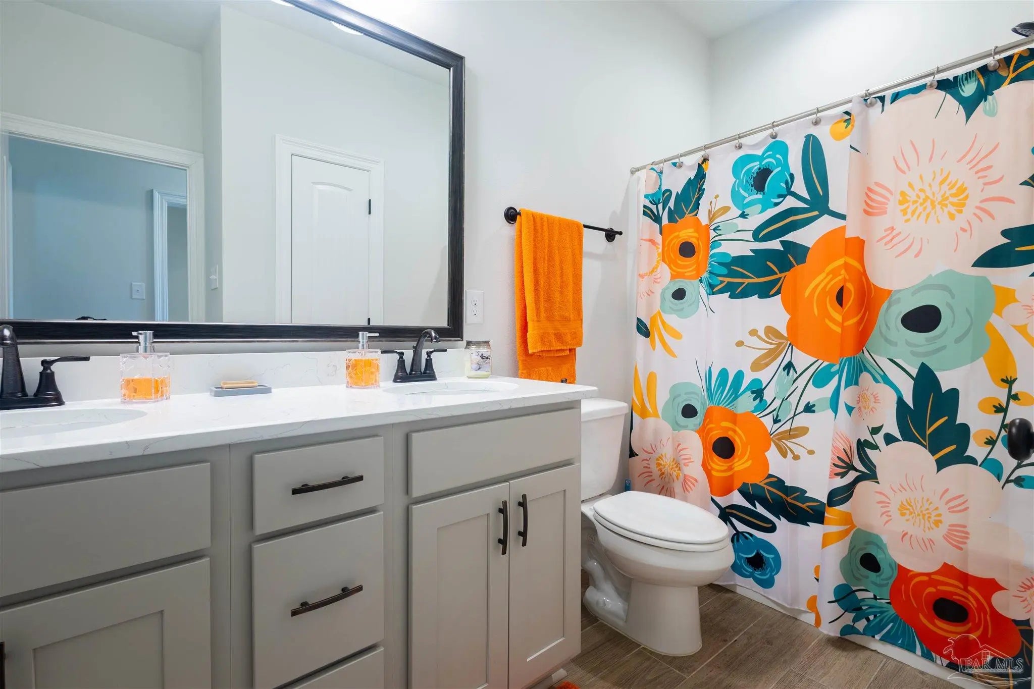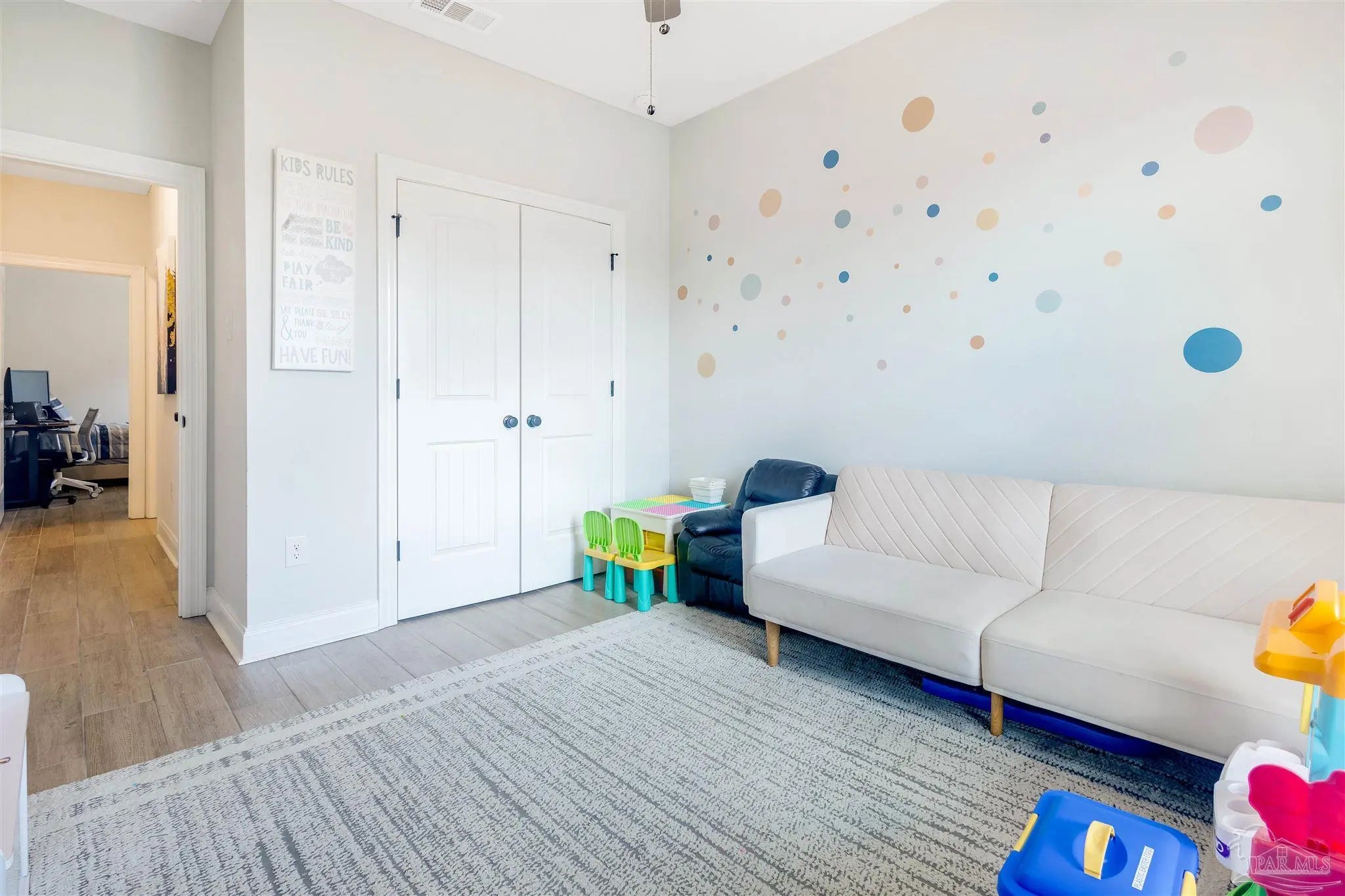 BACK ON THE MARKET! Come see this beautiful home in a gated community in Cantonment! Located in the Iron Rock neighborhood, this 2,719 square foot, 5 bedroom/3 bath home showcases an outdoor space with a large covered patio with built-in fans and a privacy fenced backyard. The property also extends past the fence line and has been cleared. The interior features an open floor plan with high ceilings, a sitting area that could be used as an office/study, a spacious living area with a gas fireplace, and a formal dining space. The eat-in kitchen opens up to the living area and includes stainless steel appliances as well as a gas stove, a large island with a breakfast bar, walk-in pantry and quartz countertops. The main bedroom suite, located off the kitchen, features a walk-in closet, double vanity, garden tub and separate shower. The community’s amenities are within walking distance from the property and include a large swimming pool, a covered outdoor clubhouse with bathhouse facilities, basketball court with pickleball, nature trails, and more. The property is located within 4.5 miles of I-10, within 6 miles of the Navy Federal Credit Union campus, and within 17 miles of Downtown Pensacola. Don’t miss this opportunity and schedule your showing today!