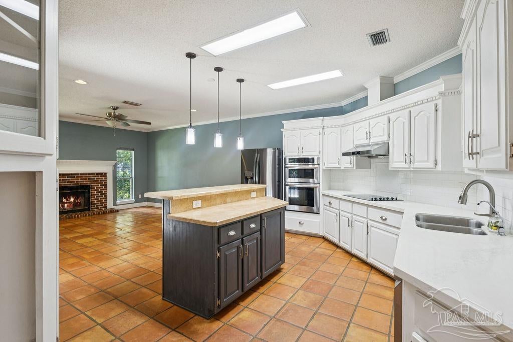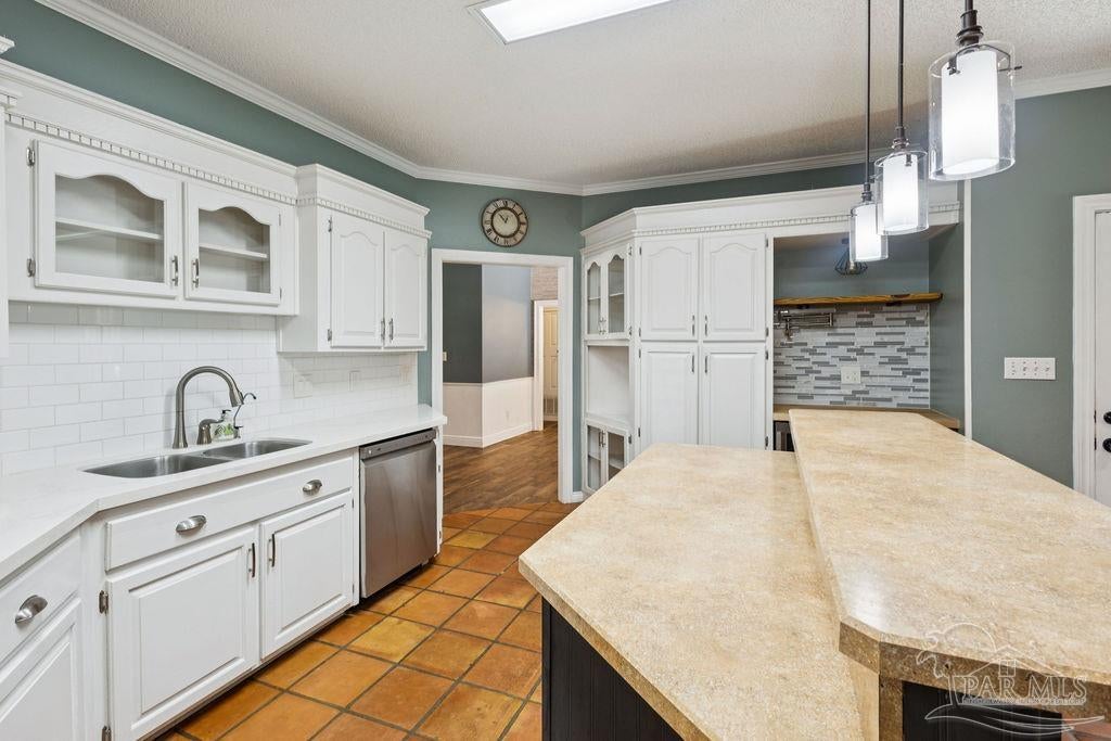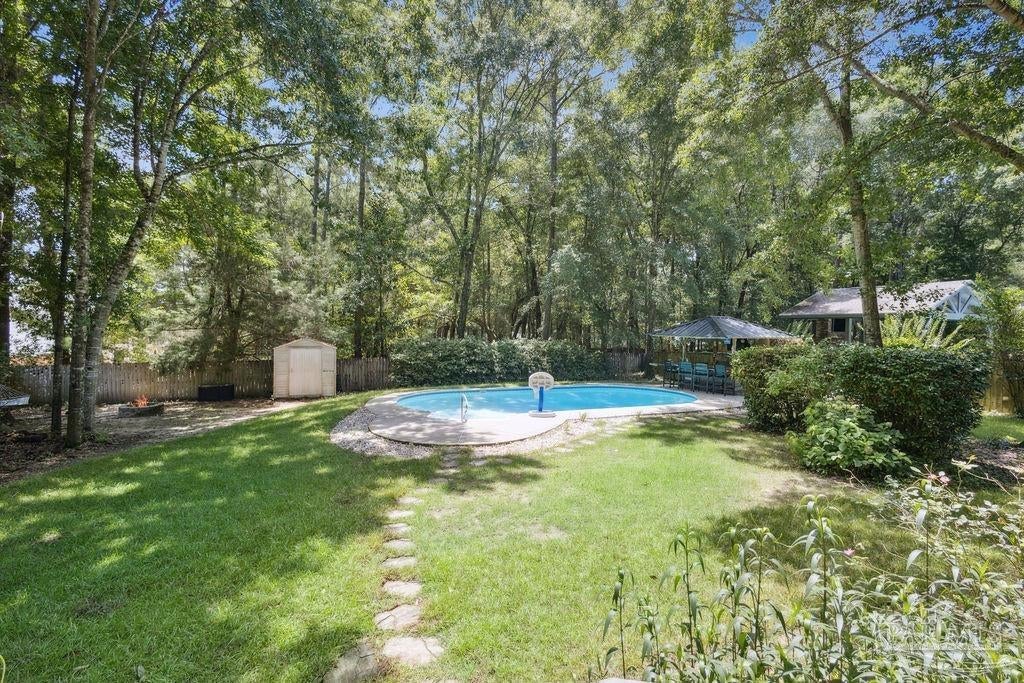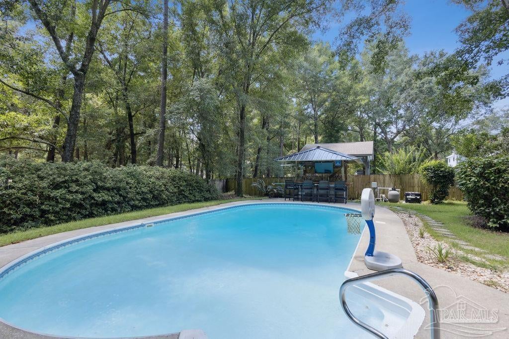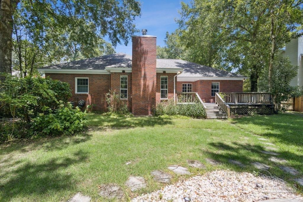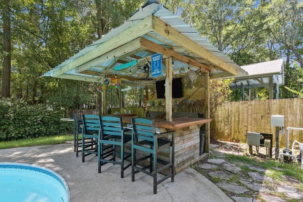 Charming Pool Home in Woodbine Springs Plantation with Unique Custom Features Beautifully updated 3BR/2BA home on nearly half an acre in sought-after Woodbine Springs Plantation—known for its tranquil setting, community playgrounds, and 55-acre private lake. This home offers character and comfort with authentic Mexican tile in the foyer and family room, wood-look tile throughout, vaulted ceiling in living room, and two wood-burning fireplaces (both inspected and recapped). The kitchen was fully renovated in 2019 with new appliances, painted cabinetry, tiled backsplash, and a beverage fridge. A custom coffee bar features a water spigot and built-in pet bowl station. The primary suite includes a private office and a fully updated bath with Italian blue marble counters, marble walk-in shower, and a Bain Ultra tub with 42 jets, chromatherapy, and aromatherapy. Two additional bedrooms and a full bath with updated cabinetry and subway tile are located on the opposite side of the home. Enjoy outdoor living with a fenced backyard, tiki bar (power, mini fridge, and new metal roof), deck, fire pit, and an in-ground pool with salt system (salt cell new April 2025, liner approx. 5 years old) and new Polaris that will convey. A charming antique Egyptian door leads to the laundry room with a 2023 washer/dryer that conveys Additional Features: • Roof (2019) • HVAC (2015, professionally maintained) • Water Heater (2022/2023) • Gutters • Fully Fenced
