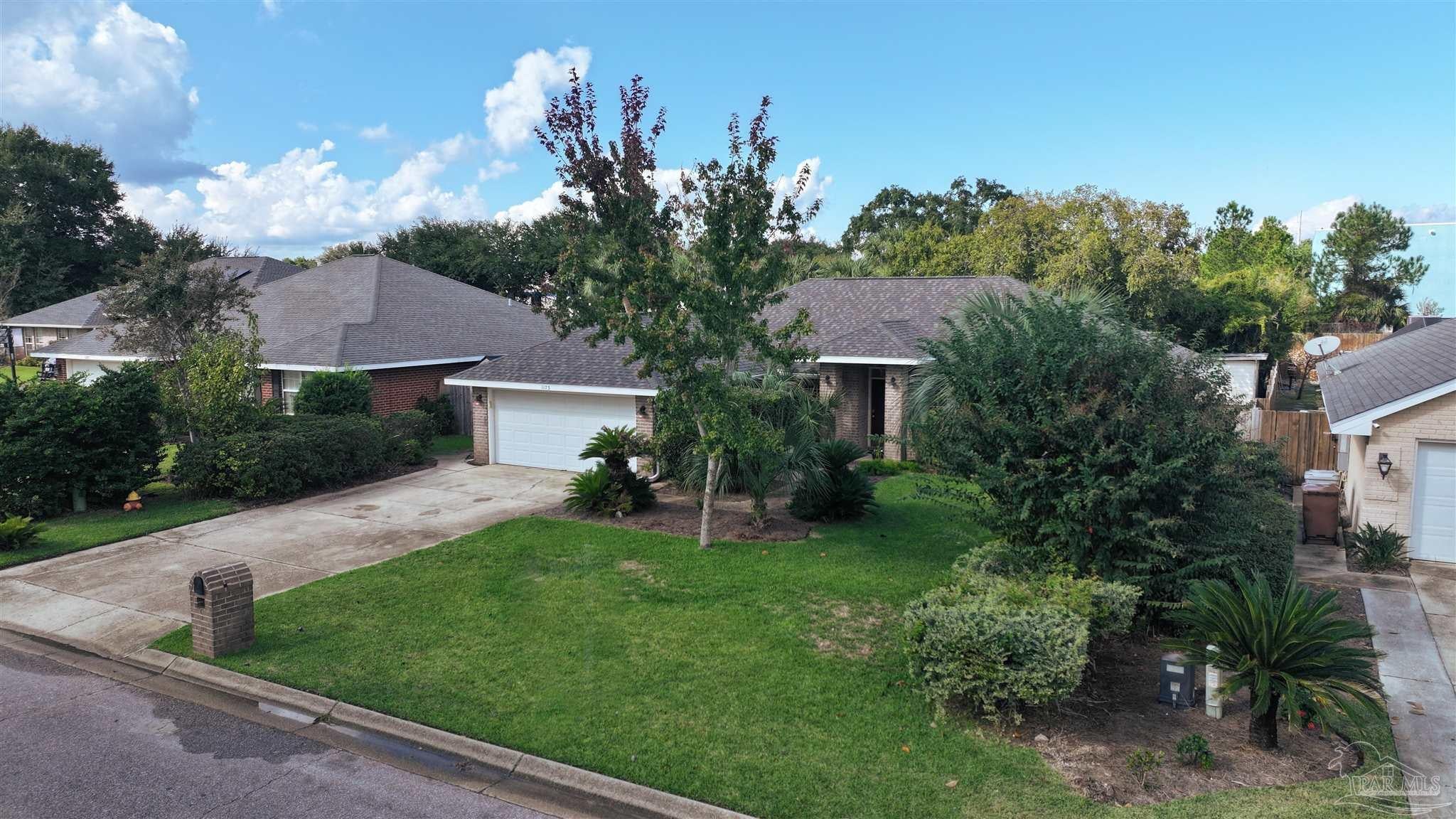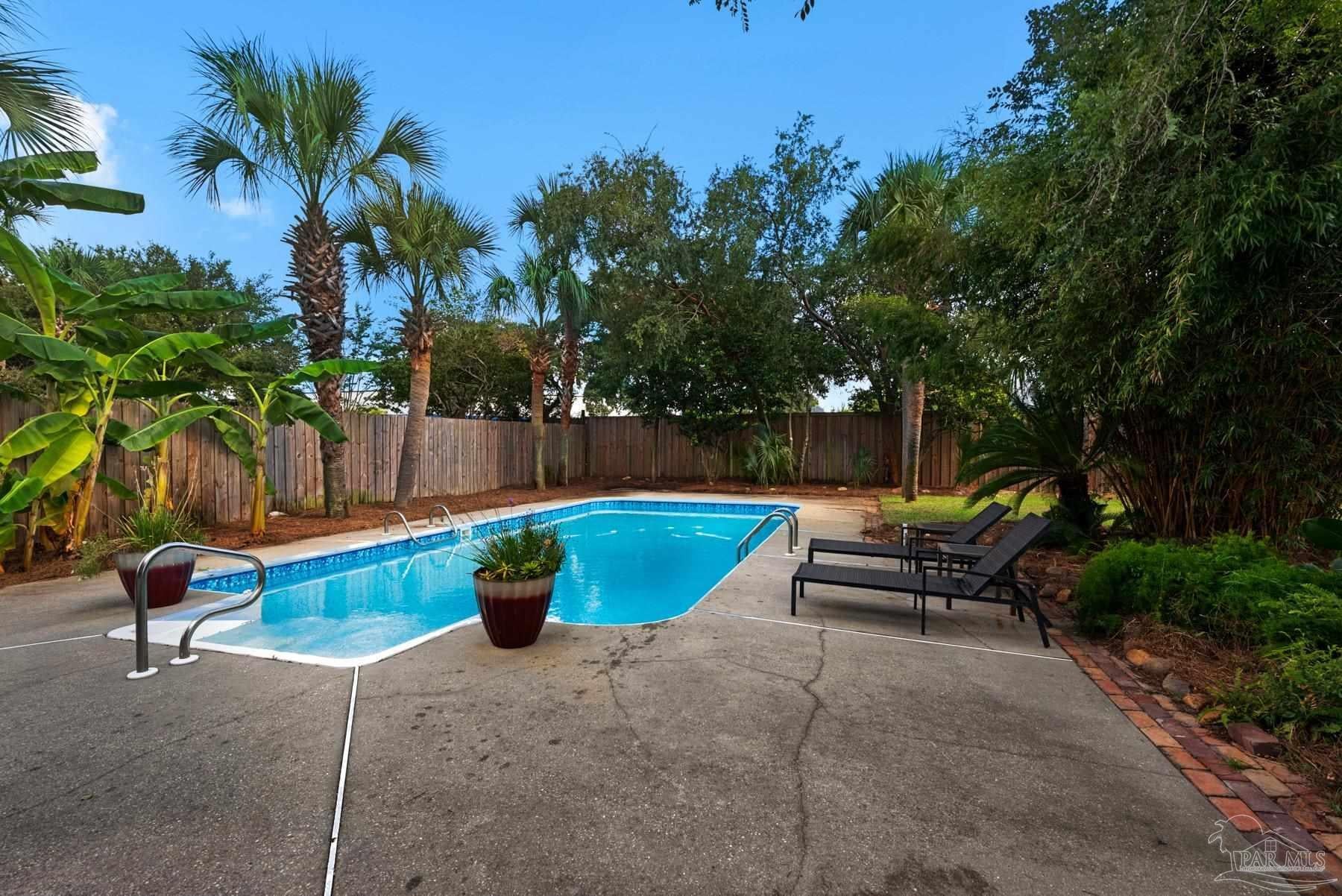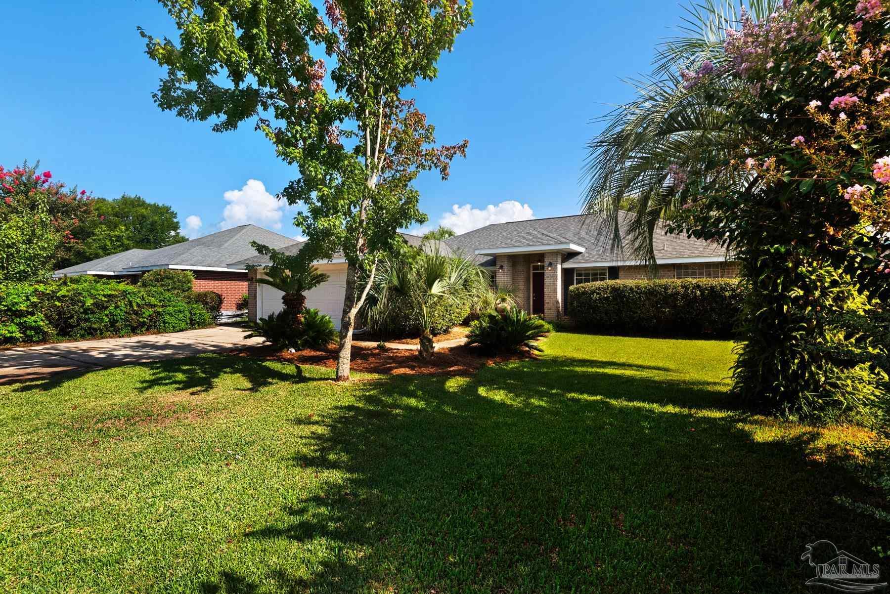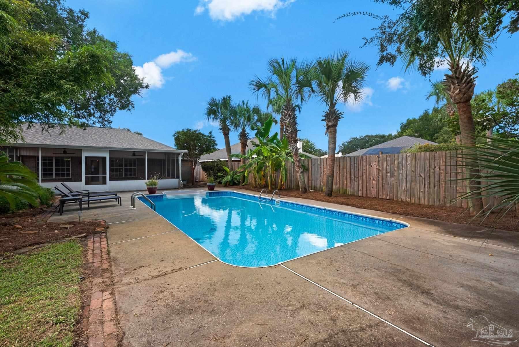PRICED WELL BELOW VALUE TO ALLOW FOR UPDATES! Live the dream in highly sought-after Crane Cove! This beautifully maintained 3-bedroom, 2-bath contemporary brick home features a sparkling pool surrounded by lush tropical landscaping and vibrant greenery — your own private paradise perfect for year-round entertaining and enjoyment. This kind of idyllic outdoor oasis would take years to recreate. Relax in the comfort of the expansive 448 sq ft screened patio, ideal for poolside lounging or dining al fresco! Inside, the split floor plan offers privacy and plenty of open space, with a spacious primary suite, featuring crown molding, two walk-in closets, dual vanities, a garden tub, separate shower and water closet. Natural light fills the great room, highlighted by a vaulted ceiling and a cozy corner fireplace. The kitchen and breakfast nook overlook the pool and patio, creating a peaceful and inviting atmosphere. The kitchen includes an electric range, microwave, and dishwasher. A convenient hop-up breakfast bar adds seating and functionality. Freshly painted formal dining and front bonus room that offer versatile space, perfect for a home office or extra lounge area. Hardwood and tile flooring throughout provide timeless style and easy upkeep. Key updates- new architectural roof in 2023, new pool liner in 2024, seasonal pool cover / leaf net in 2024, and pool pump motor and Polaris were replaced in 2024.In addition, Govee Permanent Outdoor (programmable) Lights were installed just in time for Holiday Season. Large double-car garage, extra parking, sprinkler system, well, and a storage/gardening shed. Crane Cove offers underground utilities, street lighting and traffic light access for ease of entry. Located in the top-rated Gulf Breeze school district and just 10 minutes from Pensacola Beach and 5 minutes from Gulf Breeze Hospital and the Andrews Institute, this location blends comfort, convenience, and coastal living. Don't miss this piece of paradise in Gulf Breeze!