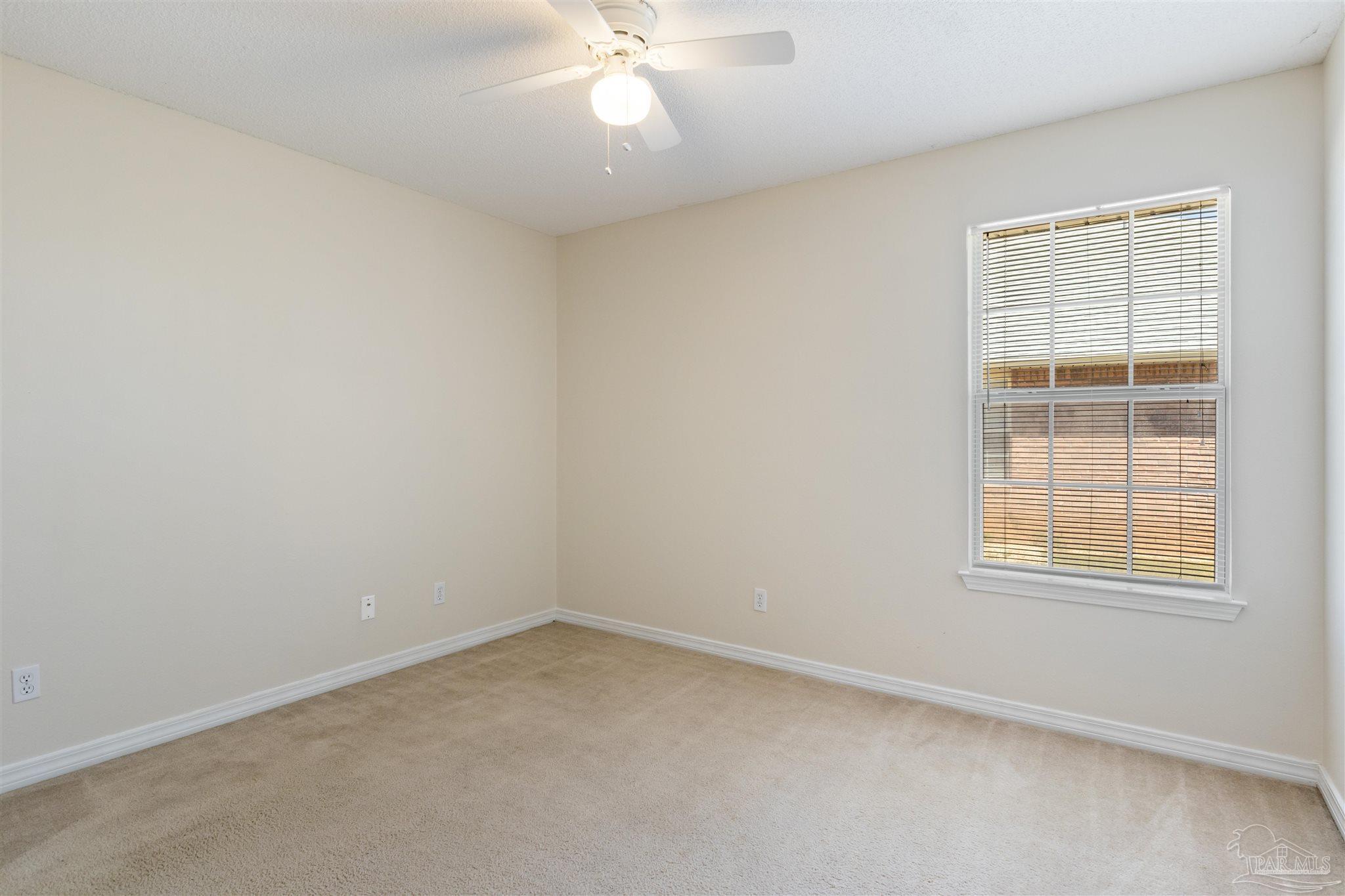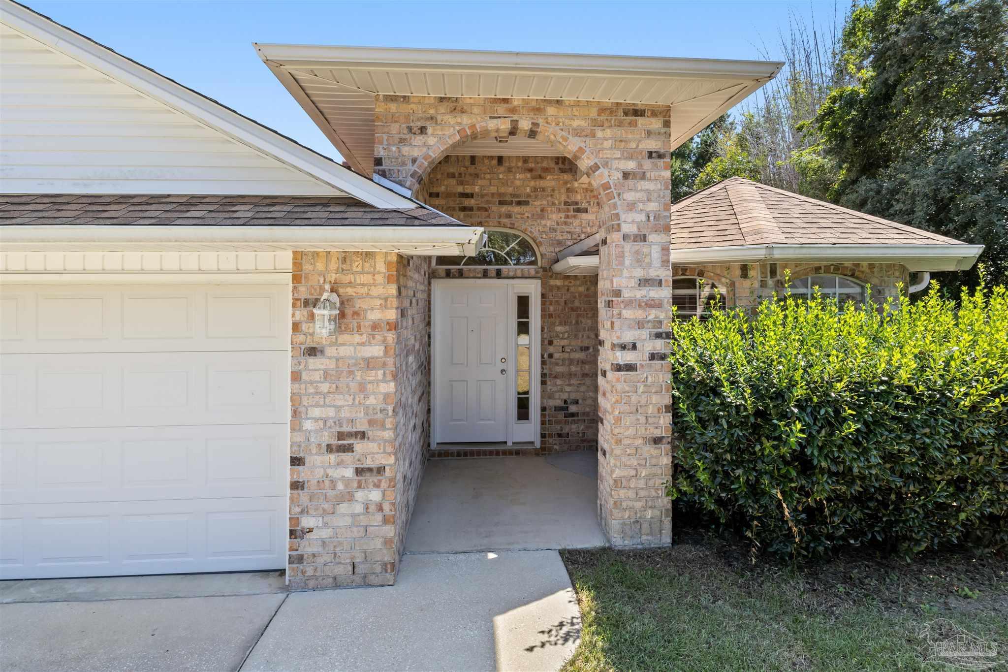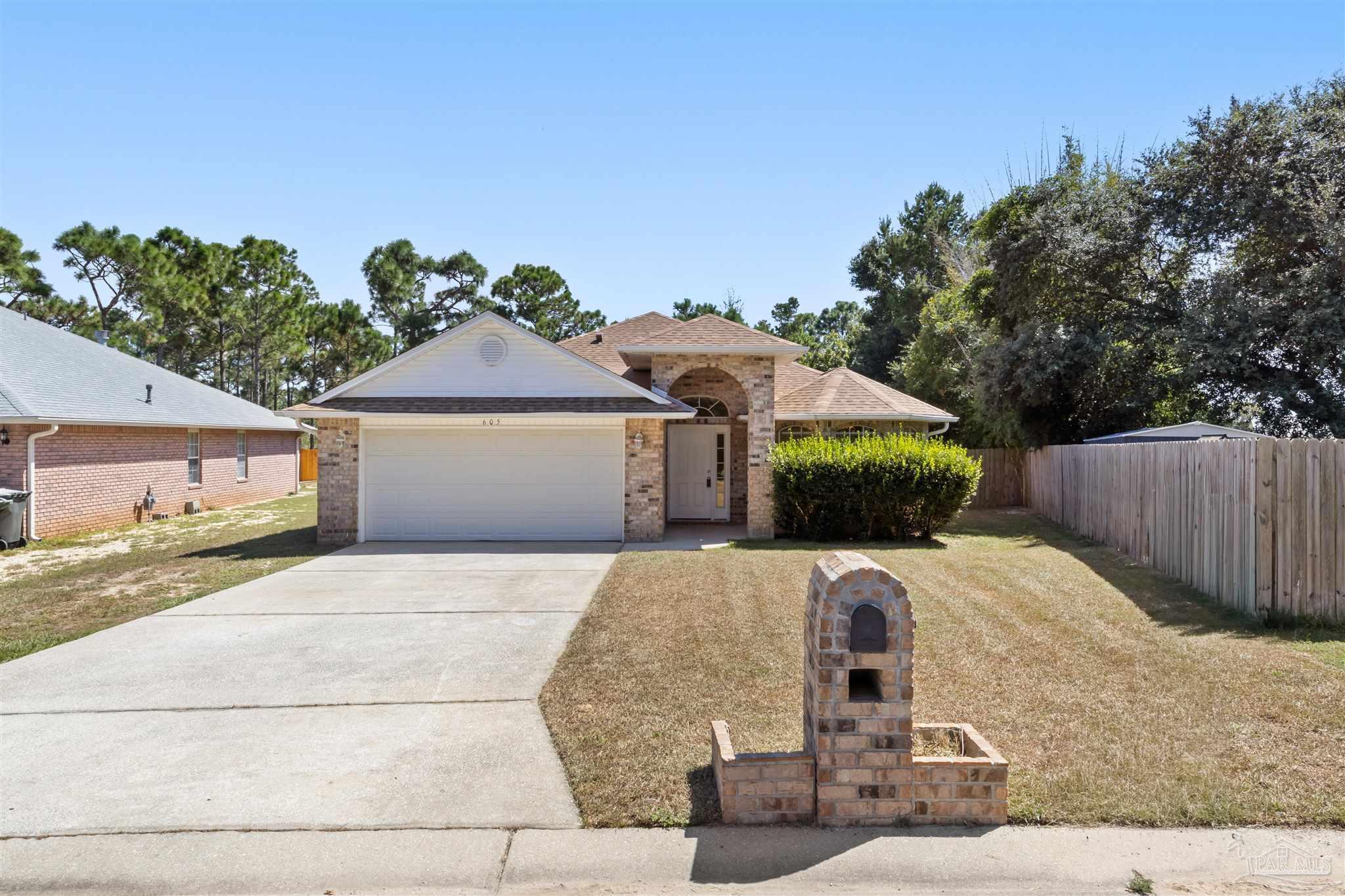 This contemporary 4-bedroom, 2-bathroom home in the Estates at Emerald Shores has been refreshed with brand-new luxury vinyl plank (LVP) flooring in the living areas and primary bedroom! Conveniently located in southwest Pensacola, just minutes from the back gate of NAS, this spacious home offers over 1,900 square feet of comfortable living space. Step inside to a bright, open living room featuring vaulted ceilings, plant ledges, and sliding glass doors that open to a covered back porch perfect for relaxing or entertaining. The updated kitchen provides ample cabinet and counter space, an electric stove, refrigerator, and dishwasher, plus a cozy breakfast nook. A separate formal dining room offers additional space for gatherings. The primary suite boasts new LVP flooring, a ceiling fan, and an ensuite bathroom with a double vanity, garden tub, separate shower, and a large walk-in closet. Three additional bedrooms with generous closets share a full hall bathroom. Enjoy the fully fenced backyard that extends beyond the back fence, offering even more outdoor space than meets the eye. A 2-car garage and no HOA dues make this move-in-ready home an excellent find in a well-established neighborhood.