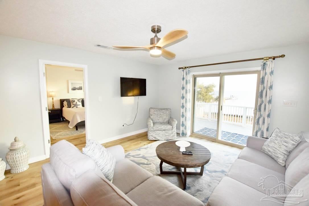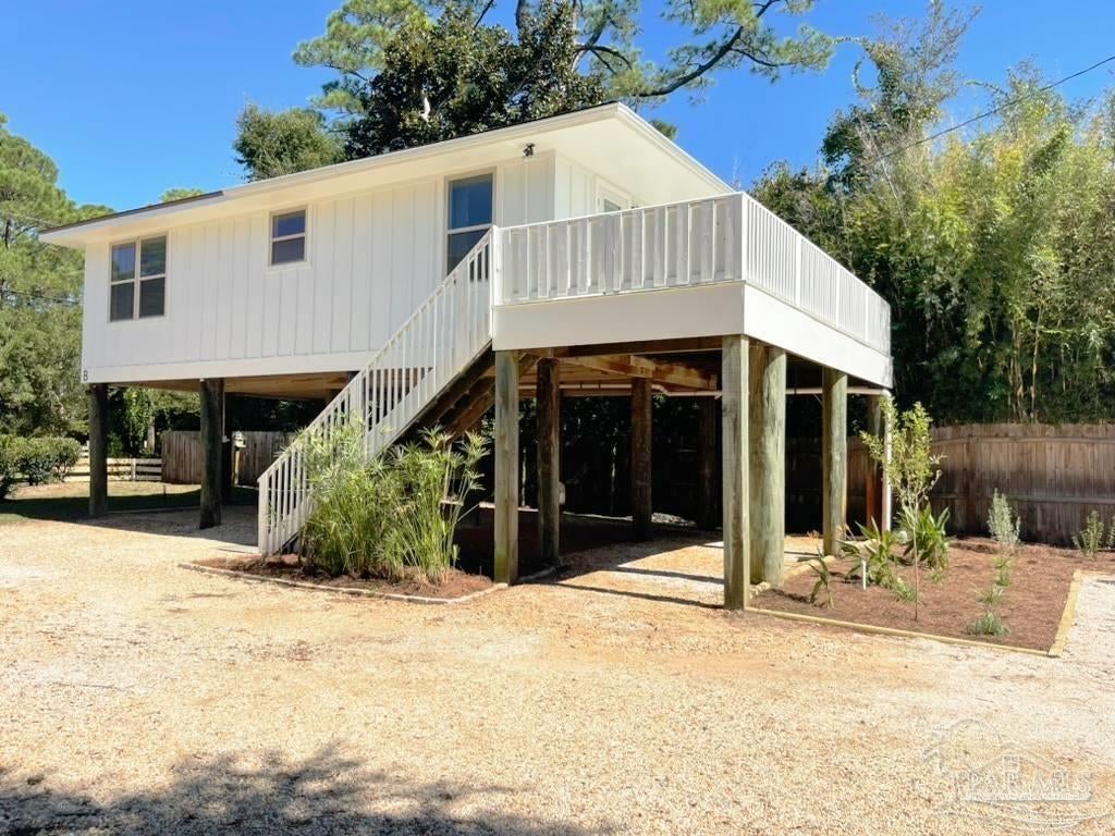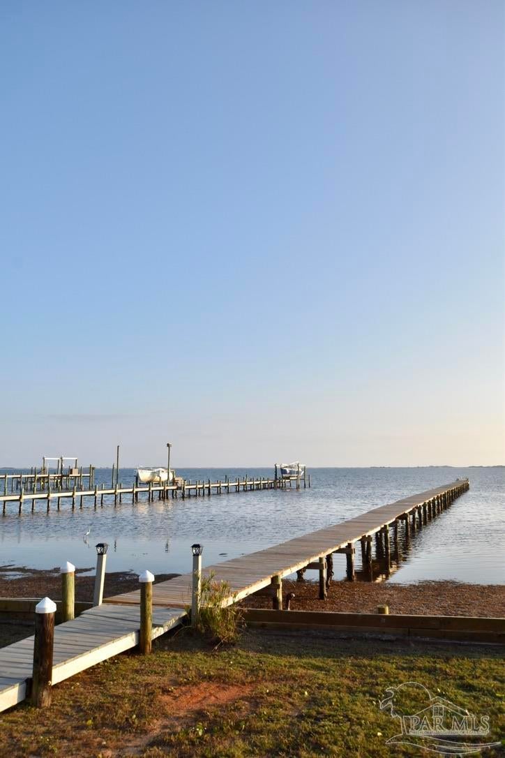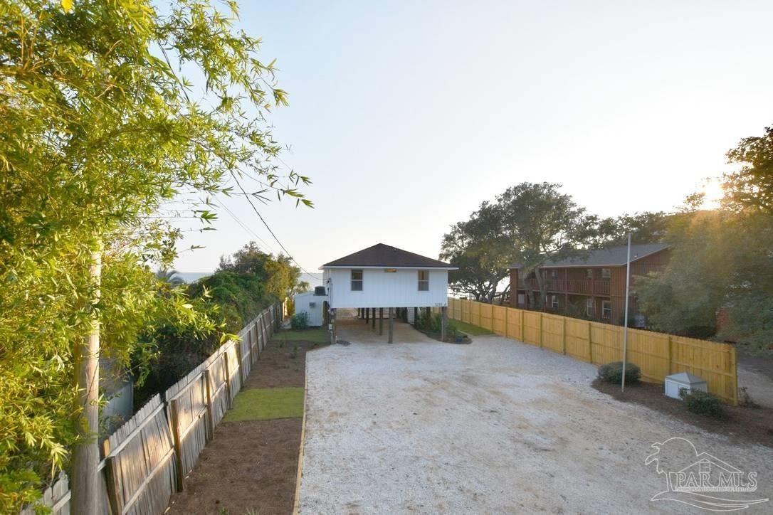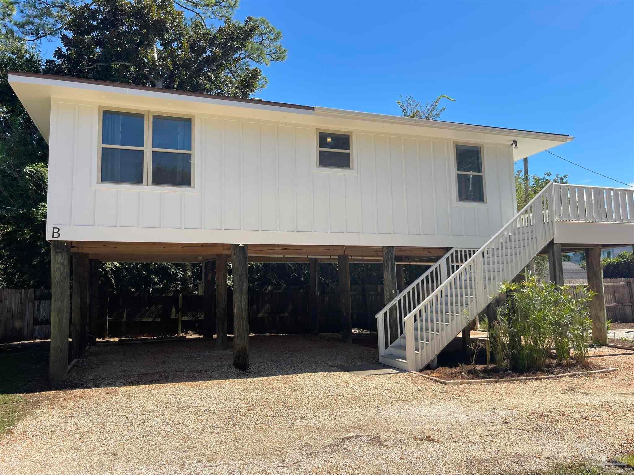 Owners have given this amazing property the attention its been waiting for. Price adjustment and major improvements! Fall in love with this turn-key coastal retreat, completely remodeled inside and out. New exterior paint, updated landscaping, fruit trees, a new fence and dock, and a whole new vibe. This property is made up of two completely independent houses on one lot. The 3 bedroom 2 bath main house is light and bright. It features an open concept kitchen/dining/living design, huge pantry, and a utility room off the kitchen. There are two guest bedrooms that share a second bath, and a primary suite with a dressing room, large bathroom, and big windows to soak up the water views. The 1 bed/1 bath secondary house is completely independent with its own utilities. It has an amazing, large, open concept kitchen/living room and a bedroom with attached bath and laundry. This house has it's own covered parking and a deck. This is the perfect situation for multi-generational living or rent out one unit and live in the other. Both homes built in 2008 have impact windows and doors, are high and dry on pilings, and have abundant space below for entertaining and covered parking, as well as a large workshop. Whether you’re an investor looking for an income producing short term rental opportunity, or you’re searching for your primary home, don't miss this fantastic property. Catch red fish, speckled trout, crabs and beautiful sunsets from the dock. Located just steps from the Woodlawn Beach Boat Ramp, and equally distant from Navarre Beach and Pensacola Beach. Zoned for top rated schools. Upgraded from septic to city sewer (2025).